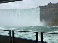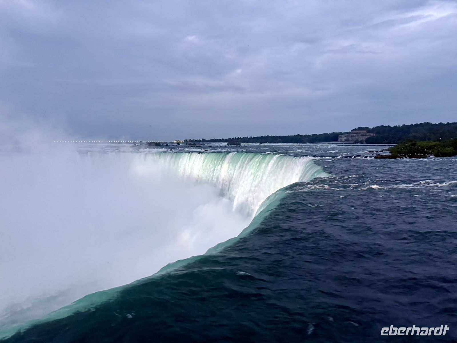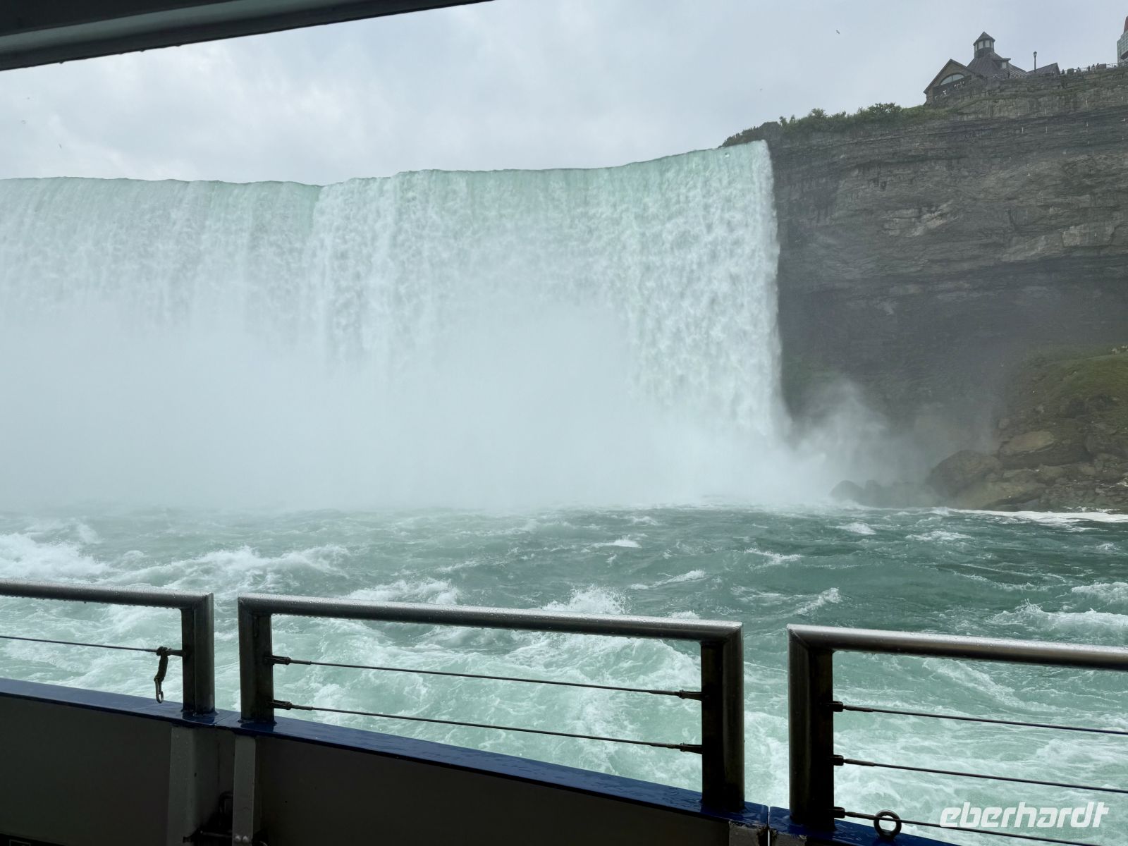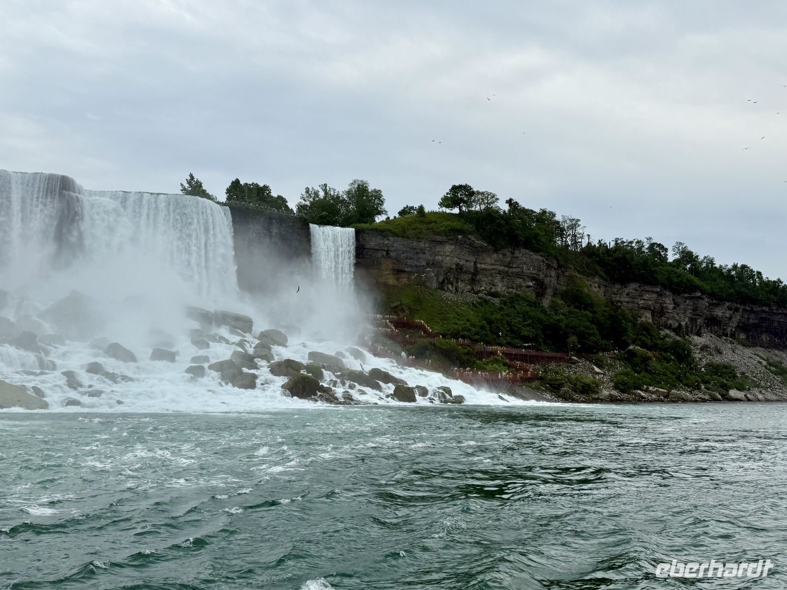 Nach unserer Ankunft an den Niagarafällen begaben wir uns direkt zum Bootsanleger, um das Naturspektakel aus nächster Nähe zu erleben. An Bord eines der berühmten Ausflugsboote fuhren wir ganz nah an die tosenden Wassermassen heran – ein atemberaubendes Erlebnis! Die Niagarafälle bestehen aus drei Teilen: den Horseshoe Falls (auf kanadischer Seite), den American Falls und den kleineren Bridal Veil Falls (beide auf US-amerikanischer Seite). Der gewaltige Wasserstrom, der hier über die Kante stürzt, erzeugt eine Gischt, die uns angenehm erfrischte – eine willkommene Abkühlung an diesem Tag. Es war für uns alle sehr beeindruckend, diese Naturgewalt aus nächster Nähe zu erleben.