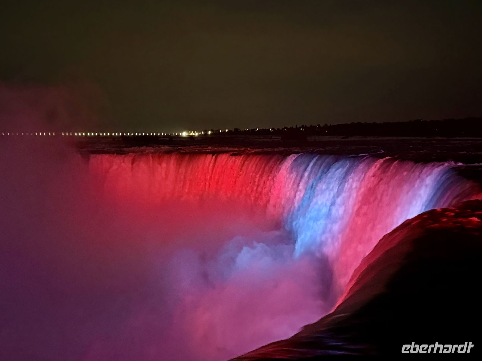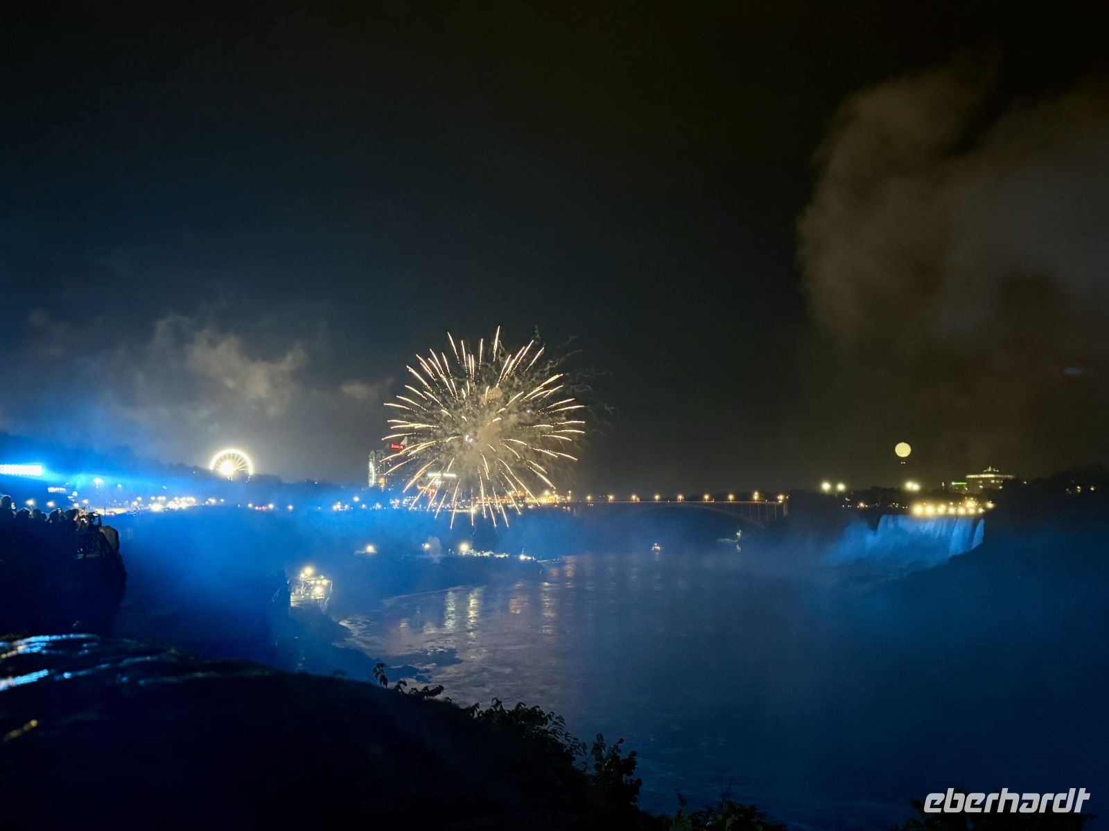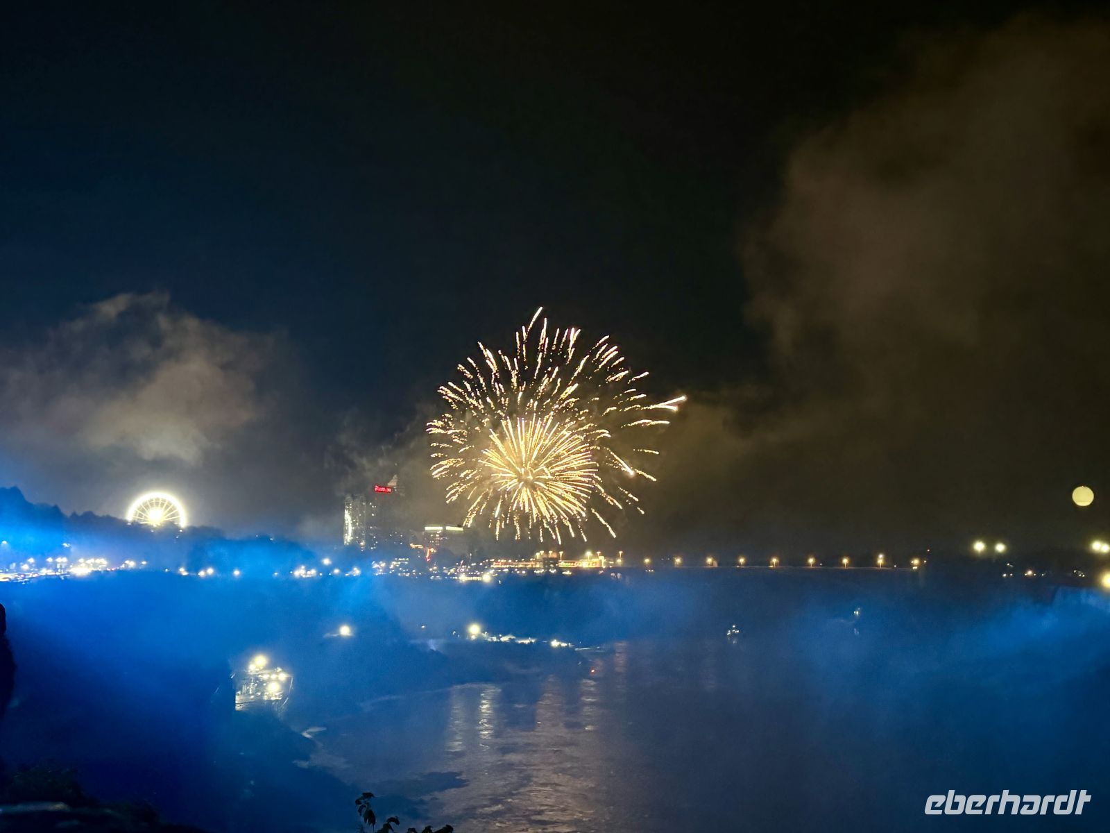Nach dem Essen fuhren wir für ein weiteres Highlight des Tages erneut zu den Niagarafällen. Jetzt, nach Einbruch der Dunkelheit, waren die Wasserfälle in bunten Lichtern illuminiert – ein faszinierender Anblick, der fast etwas Magisches hatte. Als krönender Abschluss dieses besonderen Tages erlebten wir dann noch ein Feuerwerk direkt über den Fällen, das den Himmel in bunten Farben erstrahlen ließ.