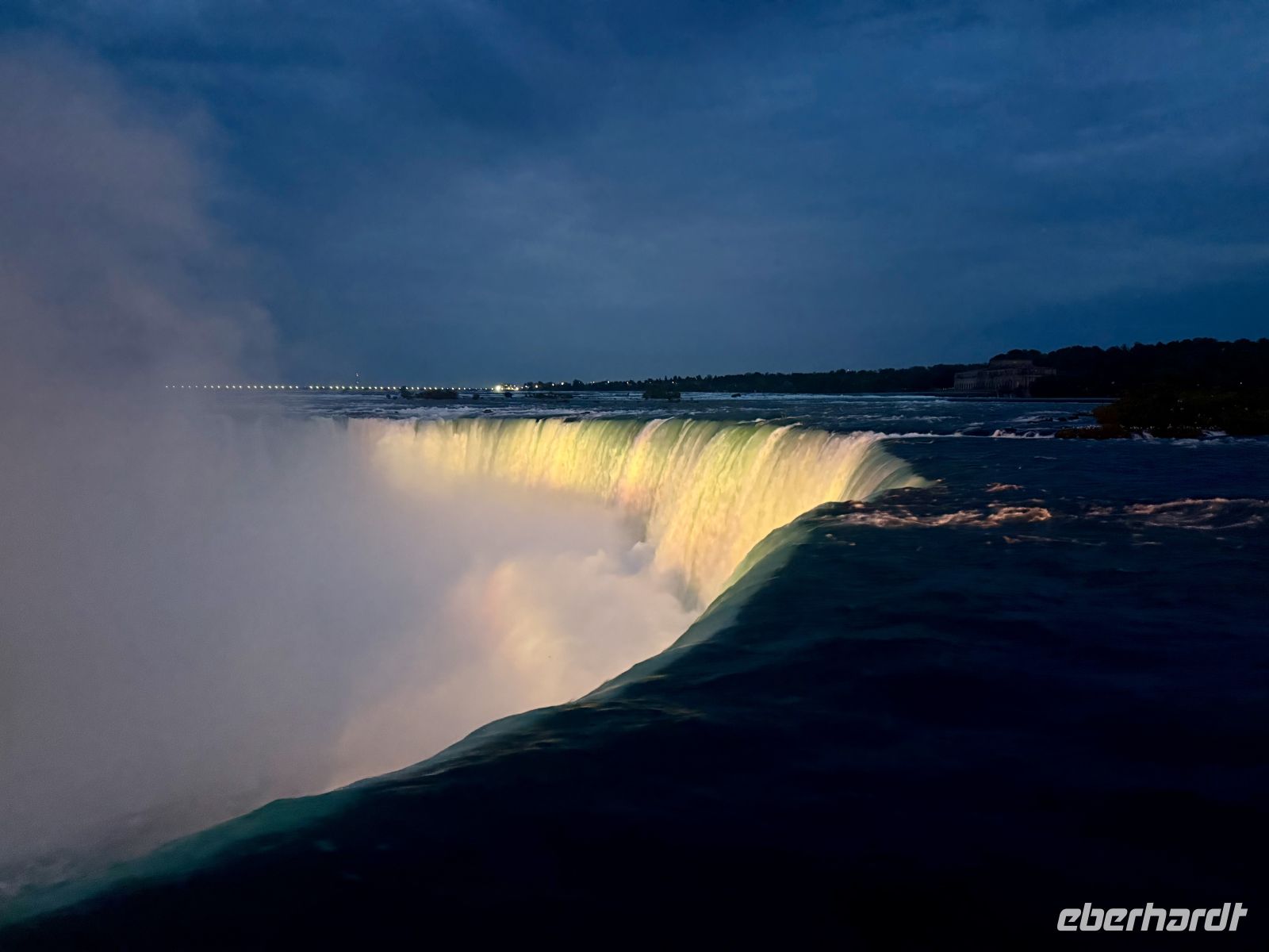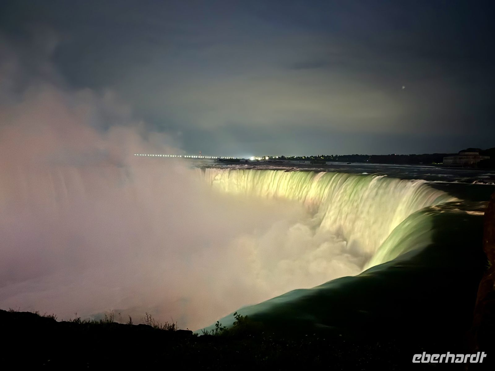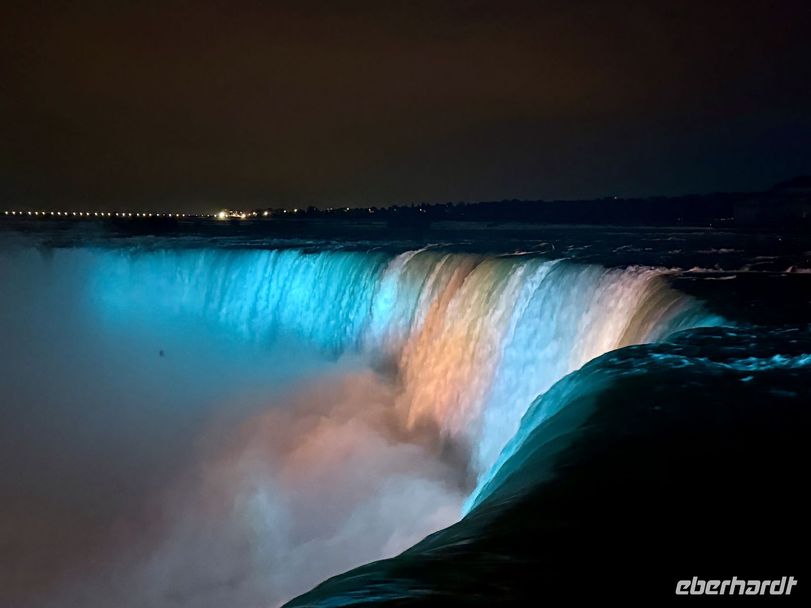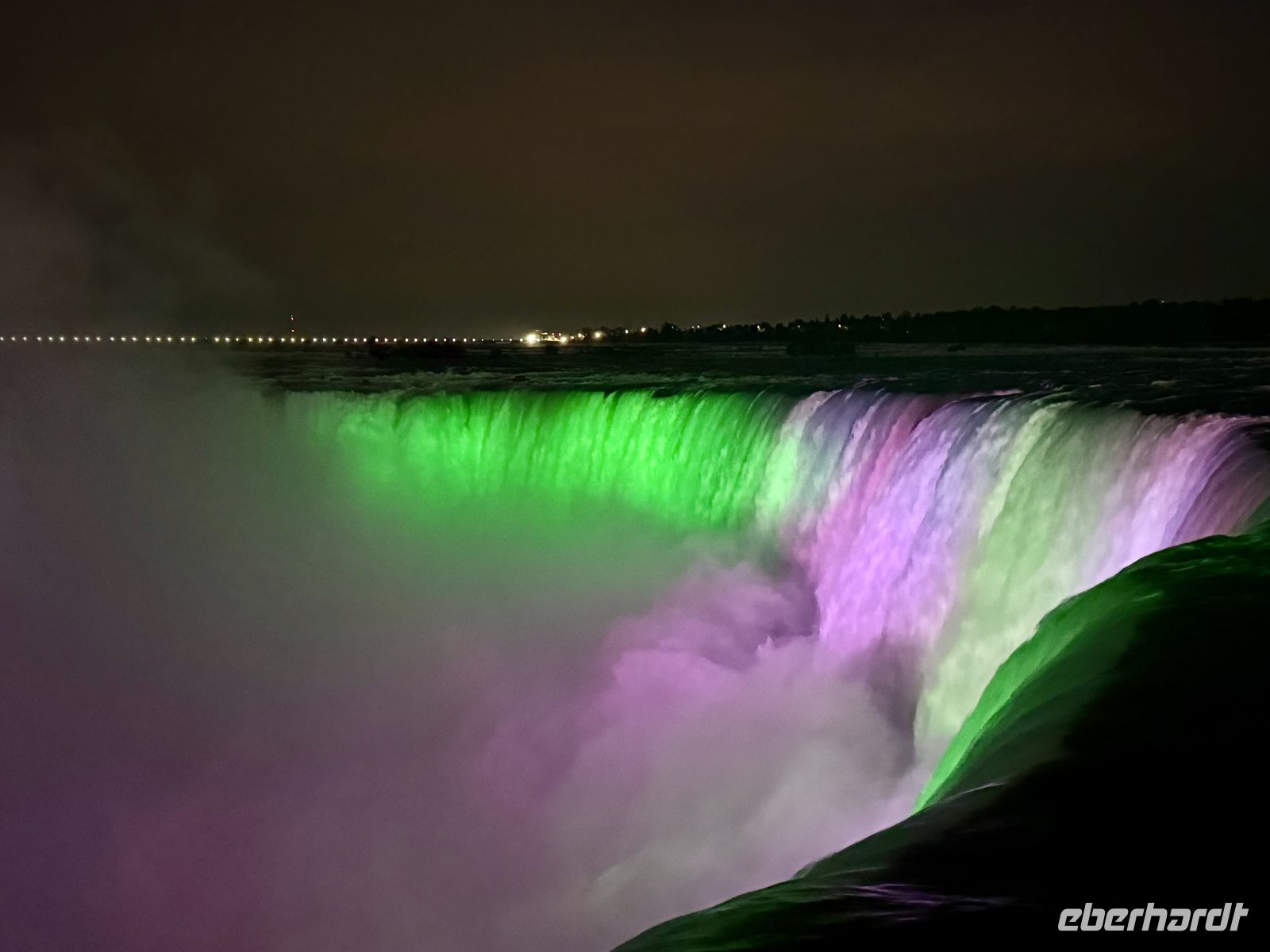 Nach dem Essen fuhren wir für ein weiteres Highlight des Tages erneut zu den Niagarafällen. Jetzt, nach Einbruch der Dunkelheit, waren die Wasserfälle in bunten Lichtern illuminiert – ein faszinierender Anblick, der fast etwas Magisches hatte. Als krönender Abschluss dieses besonderen Tages erlebten wir dann noch ein Feuerwerk direkt über den Fällen, das den Himmel in bunten Farben erstrahlen ließ.