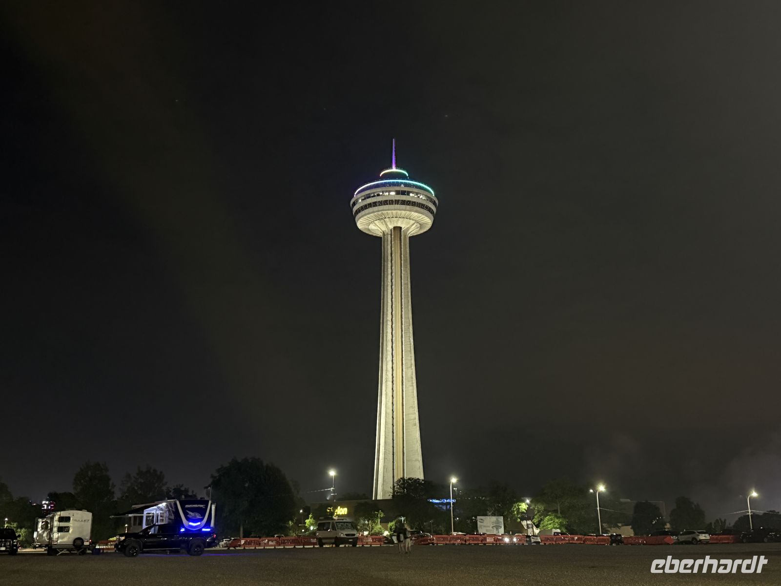 Hungrig von dem aufregenden Erlebnis, fuhren wir anschließend zum Skylon Tower, einem 160 Meter hohen Aussichtsturm, der sich direkt neben den Fällen erhebt. Von dort aus hatten wir beim Abendessen nicht nur eine hervorragende Auswahl an Speisen und Weinen, sondern auch einen wunderschönen Ausblick auf die Niagarafälle und die umliegende Landschaft.