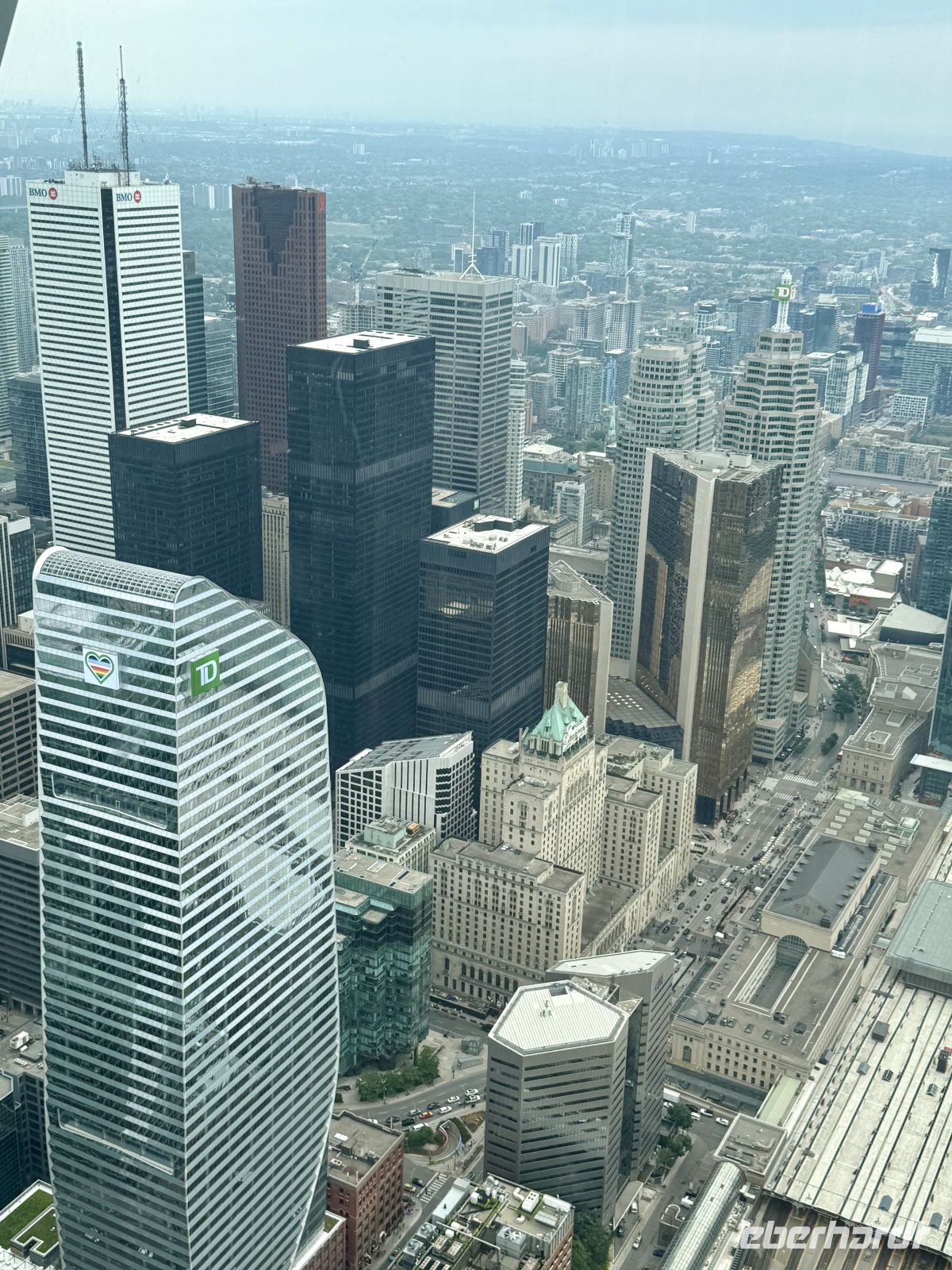 Anschließend machten wir uns auf den Rückweg nach Toronto. Dort angekommen, führte uns unser erster Weg zum berühmten CN Tower, dem Wahrzeichen der Stadt. Mit einer Höhe von 553 Metern war der CN Tower bis 2009 das höchste freistehende Bauwerk der Welt. Die Aussichtsplattform in 346 Metern Höhe bot uns einen atemberaubenden Panoramablick über Toronto, den Ontariosee und bei guter Sicht sogar bis nach Rochester im US-Bundesstaat New York. Für Mutige gab es außerdem den sogenannten Glass Floor, auf dem man direkt in die Tiefe schauen kann – ein echtes Erlebnis.