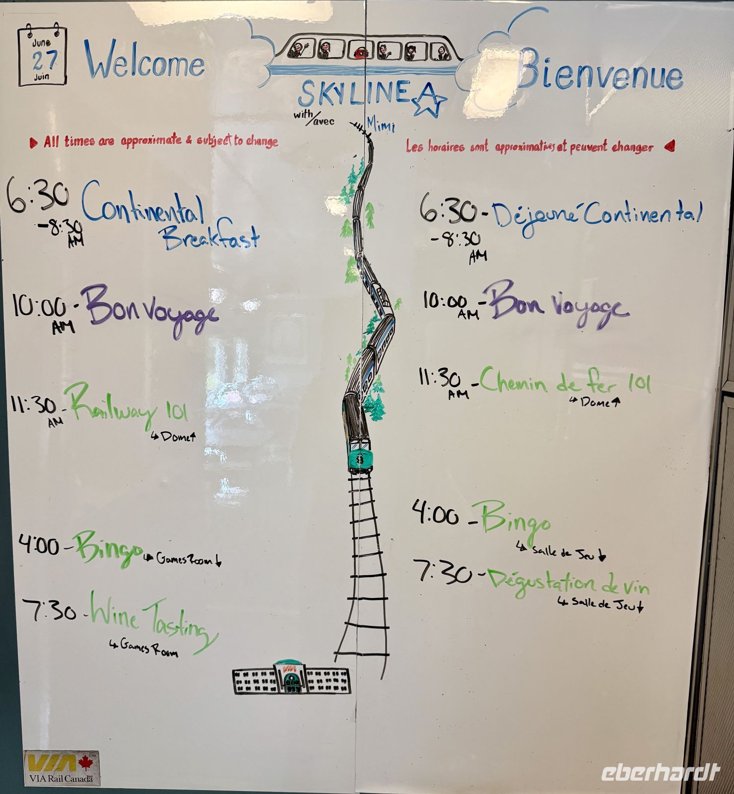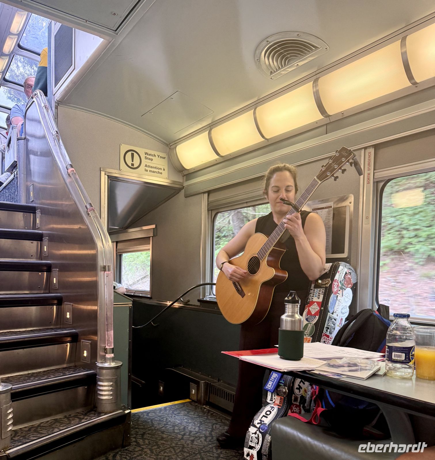 Am Vormittag nahmen einige von uns am Bingo teil – eine beliebte Aktivität an Bord, die für viel Spaß und Unterhaltung sorgte. Im Anschluss genossen wir ein weiteres leckeres Mittagessen im Speisewagen, das mit regionalen Spezialitäten und frischen Zutaten überzeugt. Danach gab es noch einmal Live-Musik im Lounge-Wagen, gefolgt von einem interessanten Vortrag über die Provinz Manitoba.