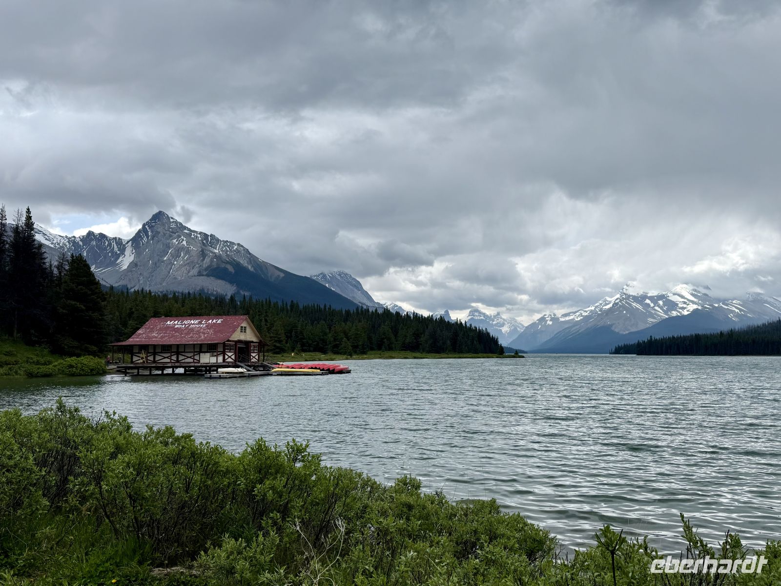 Leider war der Maligne Canyon aufgrund von Waldbränden gesperrt, sodass wir dieses beeindruckende Naturwunder nicht besuchen konnten. Dafür gelangten wir zum malerischen Maligne Lake, der mit seinen 22 Kilometern Länge und einer Breite von bis zu 1,5 Kilometern einer der größten Gletscherseen der Rockies ist. Die Wassertemperatur liegt das ganze Jahr über bei kühlen etwa 9 Grad Celsius, während im Winter Temperaturen von bis zu -56 Grad Celsius gemessen werden können.
