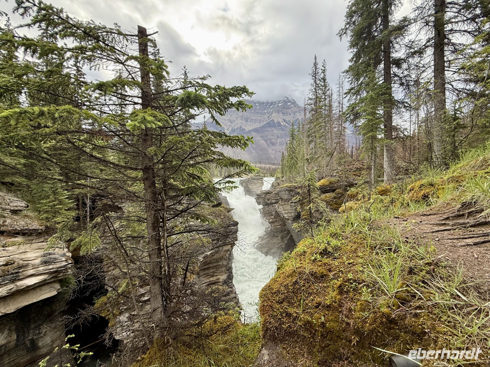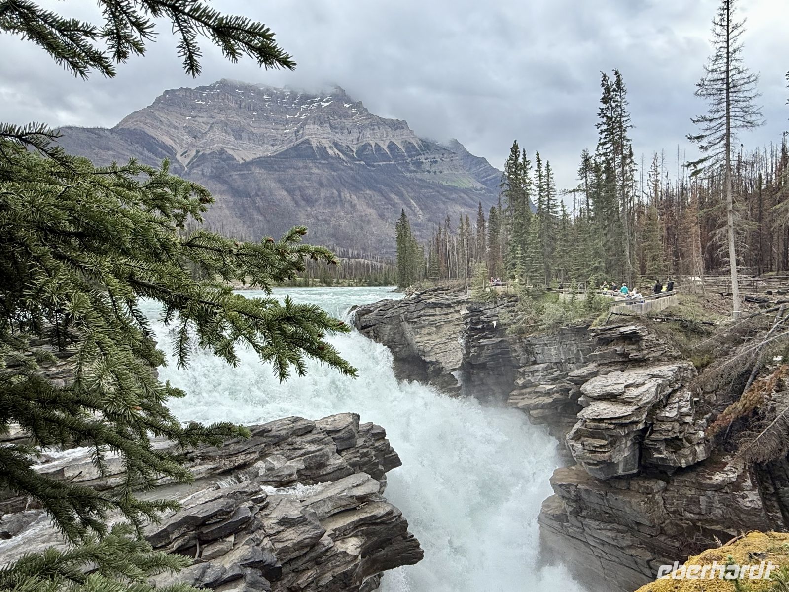 Am heutigen Tag verließen wir zunächst Jasper und machten uns auf den Weg nach Banff – eine der landschaftlich beeindruckendsten Strecken unserer Reise. Unser erster Halt waren die Athabasca Falls, ein 23 Meter hoher Wasserfall des gleichnamigen Flusses. Obwohl er nicht besonders hoch ist, beeindruckt er durch seine enorme Wassermenge und die enge Schlucht, durch die sich das Wasser mit großer Kraft seinen Weg bahnt. Die Gischt, das Tosen und der Blick auf das tief eingeschnittene Flussbett machten diesen Stopp zu einem besonderen Erlebnis.