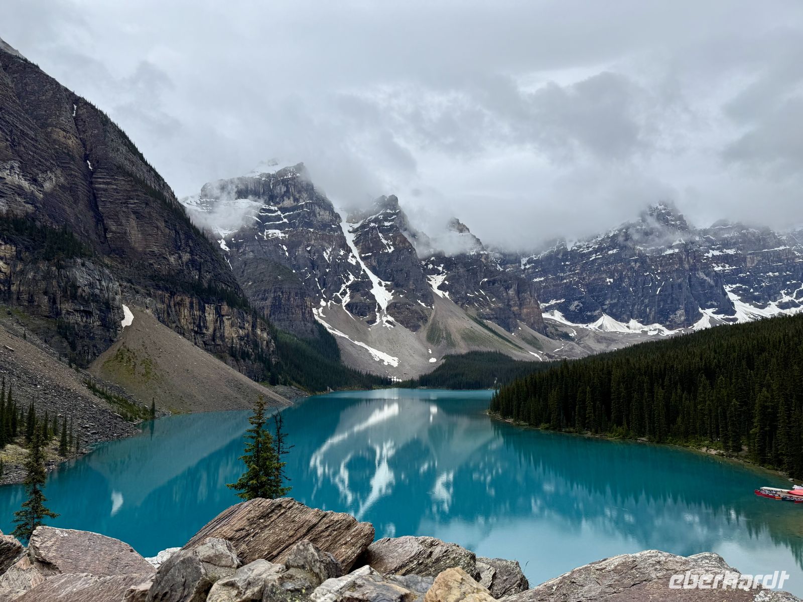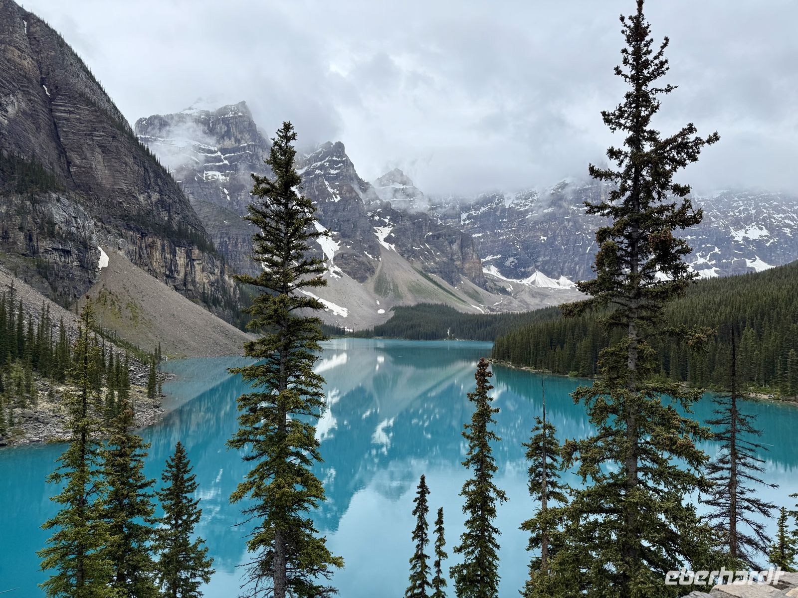 Von dort aus ging es weiter zum Moraine Lake, der etwa 14 Kilometer südlich von Lake Louise im Valley of the Ten Peaks liegt. Auch dieser Gletschersee beeindruckt mit seinem intensiv türkisblauen Wasser, das je nach Tageslicht unterschiedlich schimmert. Umgeben von zehn markanten Berggipfeln bietet der See eine atemberaubende Kulisse, die nicht umsonst einst die Rückseite der kanadischen 20-Dollar-Note zierte.