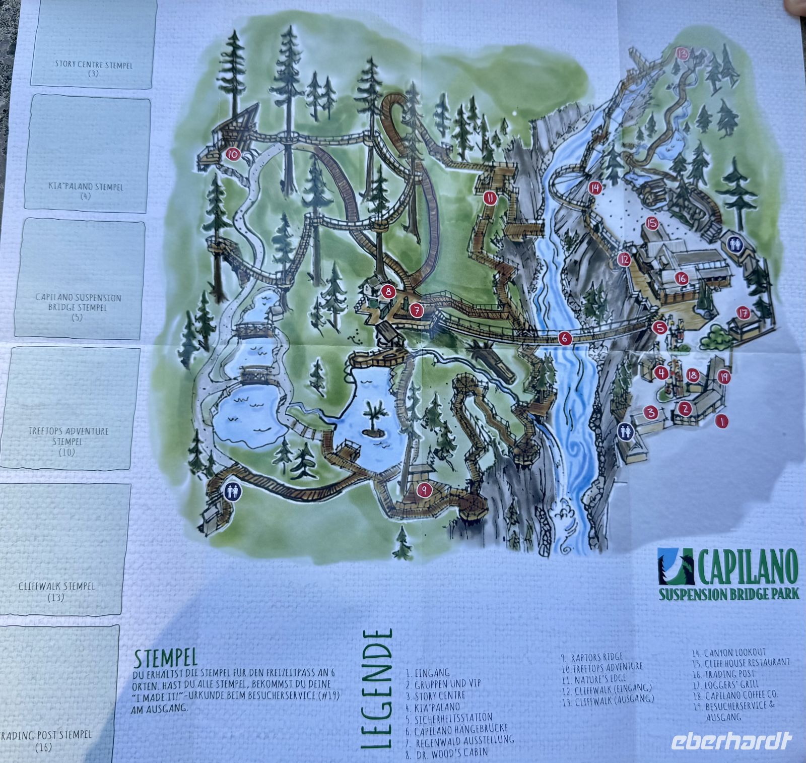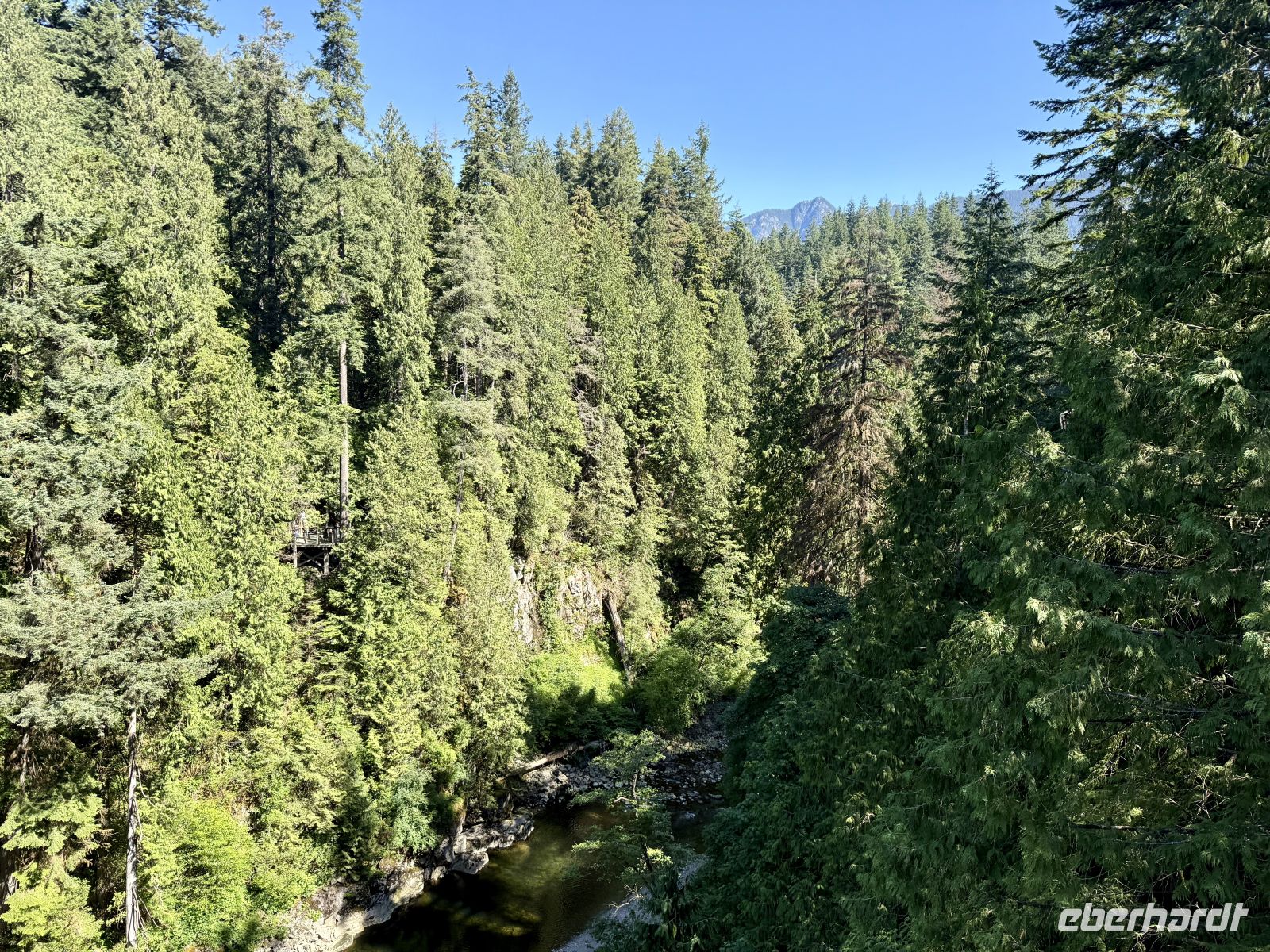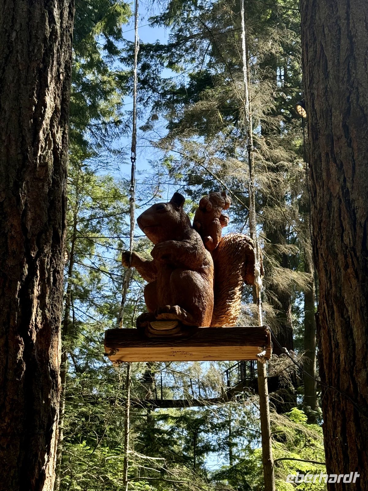 Ein weiteres Highlight war die berühmte Capilano Suspension Bridge, eine 137 Meter lange und 70 Meter hohe Hängebrücke über den Capilano River. Sie wurde ursprünglich 1889 aus Hanfseilen und Holzbohlen errichtet und ist heute eine der meistbesuchten Attraktionen der Stadt. Die Brücke schwankt leicht, während man über den Fluss geht. Zusätzlich besuchten wir den Treetops Adventure und den Cliffwalk, zwei weitere spektakuläre Pfade durch die Baumkronen und entlang der Felswand.