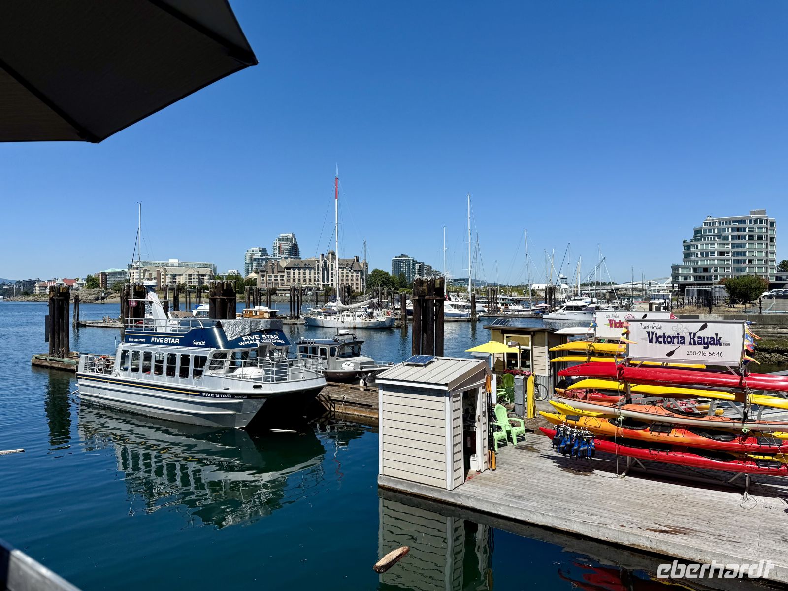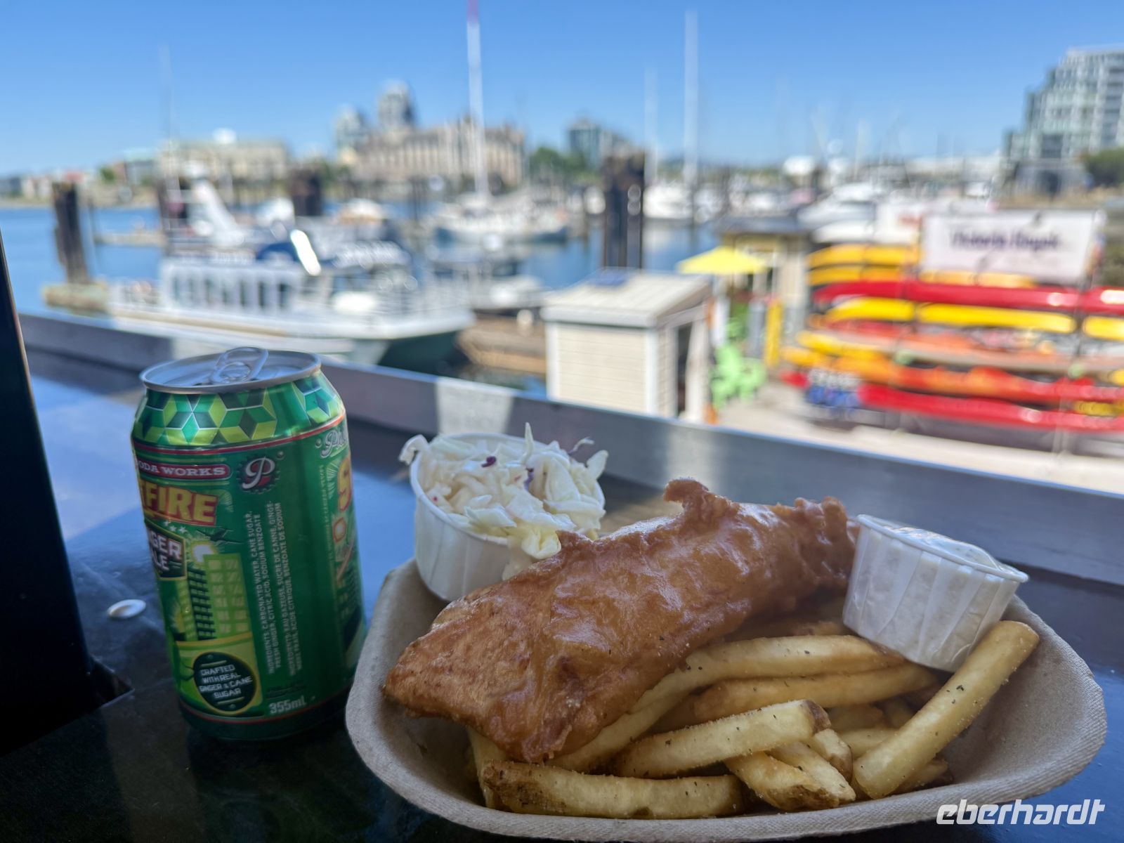 Danach führte ich die Gäste zu einem leckeren Imbiss namens Red Fish Blue Fish, einem beliebten Foodtruck direkt am Hafen von Victoria. Dort gibt es frischen, nachhaltig gefangenen Fisch, beispielsweise in Form von Fish & Chips oder Tacos. Besonders beeindruckend war die wunderschöne Aussicht auf den Hafen, wo ständig Wasserflugzeuge starten und landen – ein typisches Bild für die Region.