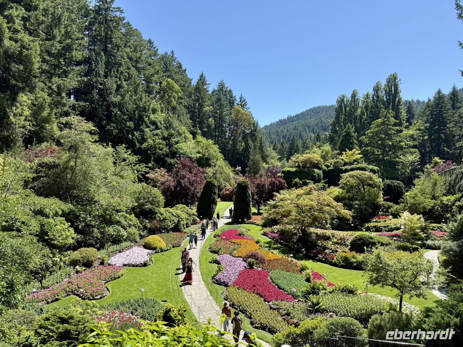 Unser nächstes Ziel waren die weltberühmten Butchart Gardens, eine atemberaubende Gartenanlage, die auf einer ehemaligen Kalksteinmine angelegt wurde. Die Gärten erstrecken sich über 22 Hektar und bieten eine unglaubliche Vielfalt an Blumen, Bäumen und Landschaftsbildern, die zu jeder Jahreszeit faszinieren. Besonders bekannt sind die farbenfrohen Blumenbeete, der Rosengarten und der japanische Garten.