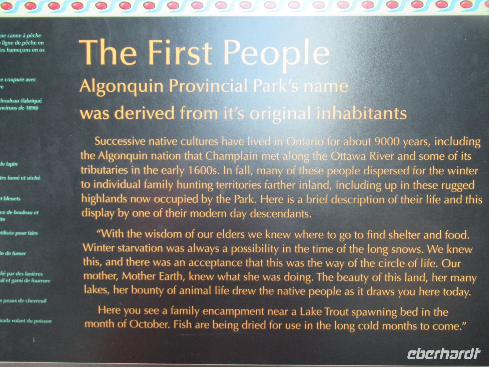 Die Siedlung wurde 1639 von französischen Jesuitenpriestern als Missionsstation gegründet, um den christlichen Glauben unter den Huron-Indianern zu verbreiten und Handel zu betreiben. In den 1640er Jahren wurde die Siedlung mehrmals von Irokesen angegriffen, was zu ihrer Zerstörung im Jahr 1649 führte. Die Jesuiten verließen die Siedlung, und Zerstörung nahm ihren Lauf. Das Gelände wurde als Freilichtmuseum wiederhergestellt, um den Alltag, die Handelsaktivitäten und die religiösen Praktiken dieser Zeit für die nachkommende Generationen veranschaulich zu machen. Ein sehr interessanter Einblick in eine Periode der Kolonialzeit von Kanada. Wir schlendern beim schönen Wetter durch das Gelände, entdecken einzelne Details, wie z.B. die Dachbedeckung mit Holzrinde, aber auch sehr ausgeklügeltes Handwerkzeug, die die Missionäre aus Europa mitgebracht haben.