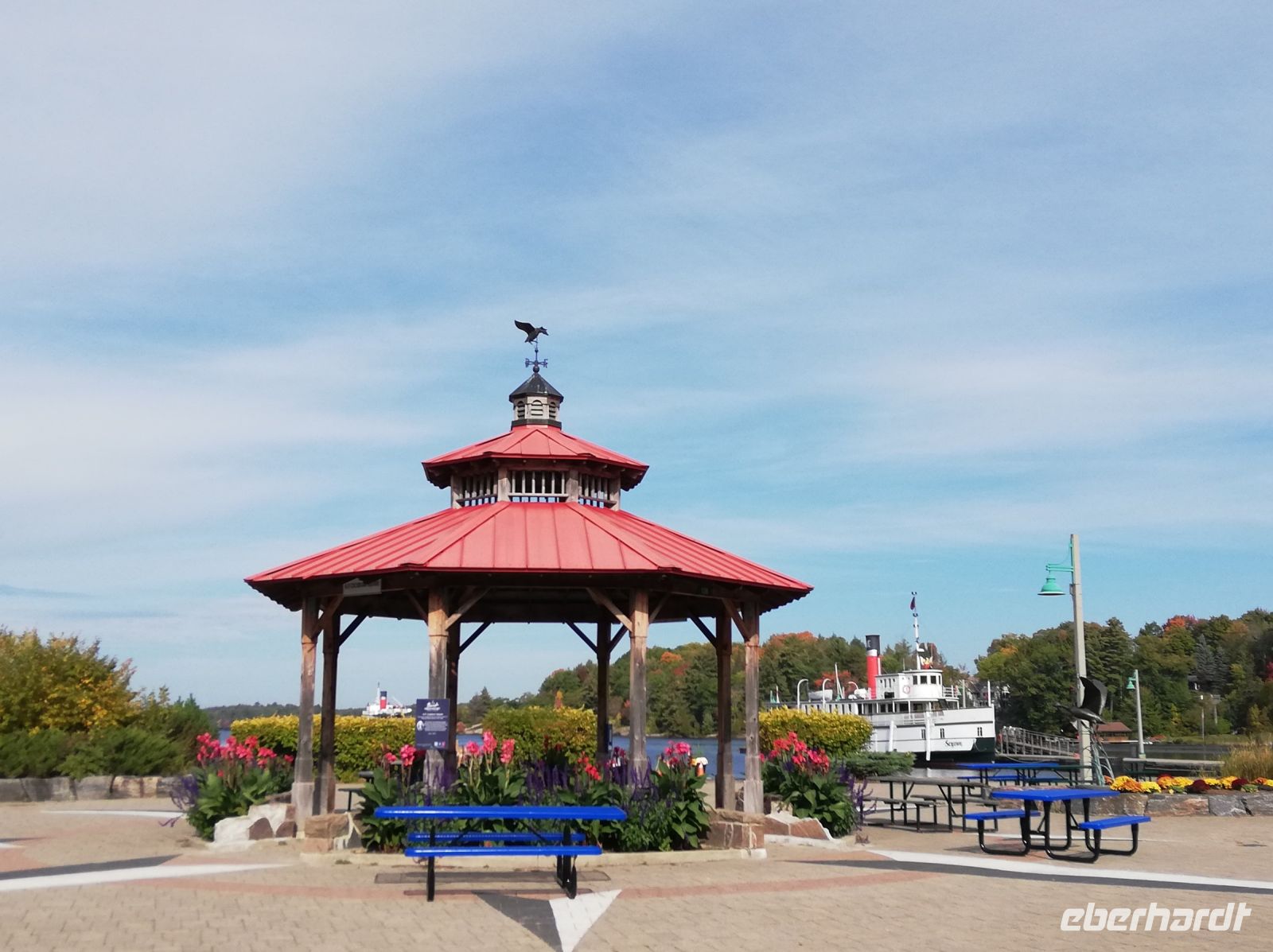 Der Ort wirkt etwas verschlafen und so kehren wir zurück und genießen in der Sonne noch einen Kaffee, manche Gäste stöbern in der kleinen Boutique. Jetzt aber auf das Muskoka Schiff, jeder findet ein Plätzchen auf dem recht großzügigen Dampfer. Hier empfängt uns der „Board-Direktor“ der uns über die Region und den Muskoka Lake in Englisch erzählt. Da es nicht so gut verständlich und auch durch Nebengeräusche gestört war, amüsieren wir uns eher an dem Auftritt des großen Mannes im schwarzen Anzug, den man glatt als Schauspieler engagieren könnte.