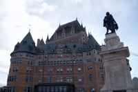 Blätter leuchteten noch intensiver rund um die imposante Basilika Sainte-Anne-de-Beaupré. Das Gotteshaus, mit seiner außergewöhnlichen Architektur, war ganz anders als die Kirchen, die wir auf unserer Reise bisher gesehen hatten. Als wir das Innere der Basilika betraten, wurden wir direkt von wundervoller Orgelmusik empfangen – ein wahrhaft traumhafter Moment. Nachdem uns der Regen schließlich doch einholte, den wir bis dahin glücklicherweise weitgehend umfahren konnten, sammelte uns unser Busfahrer Jim ein, und wir machten uns auf den Weg zu unserem letzten großen Ziel der Reise. Schon von Weitem konnten wir die Türme des Château Frontenac am Horizont erkennen. Am Manege Militaire, einem ehemaligen Exerzierplatz der Stadt, trafen wir unsere Reiseleiterin Nadia, die uns auf einen spannenden Rundgang durch die Stadt mitnahm.