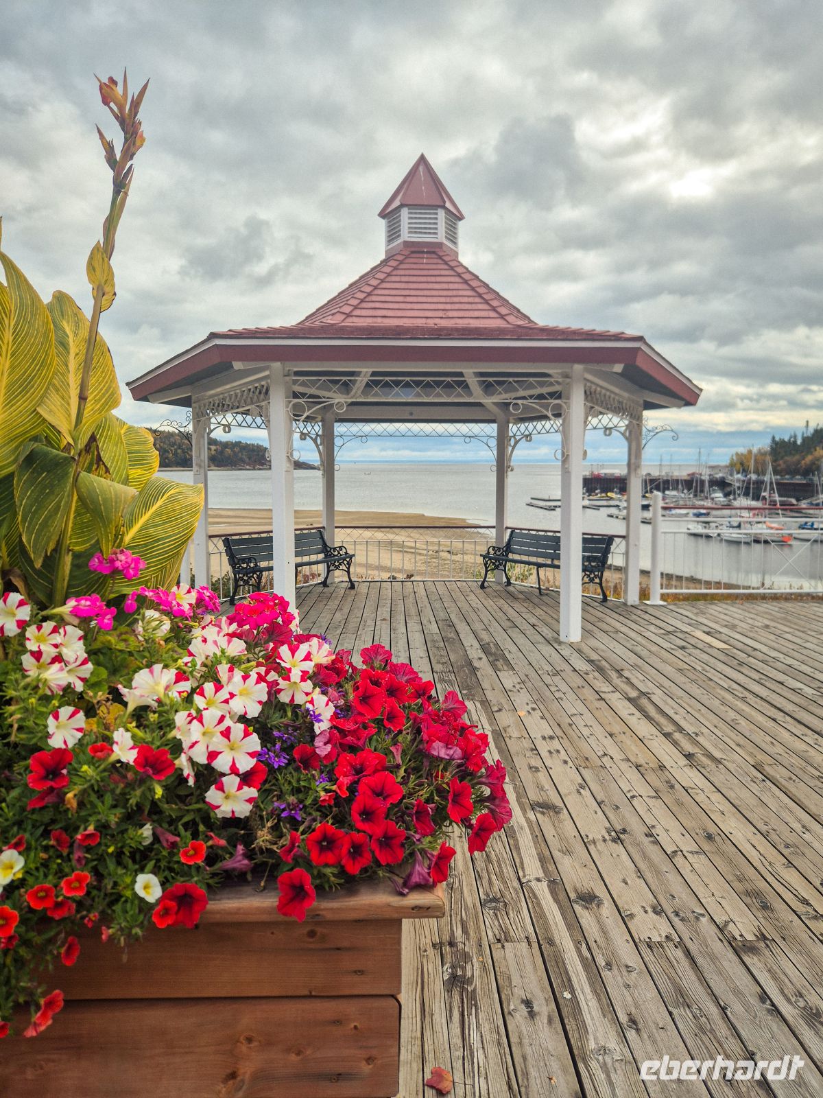 Am Morgen fuhren wir weiter immer entlang des beeindruckenden St.-Lorenz-Stroms in Richtung Tadoussac. Unterwegs legten wir einen kurzen Halt am Aussichtspunkt von La Malbaie ein, von wo aus wir trotz frischer Temperaturen einen schönen Blick über die Bucht genießen konnten.