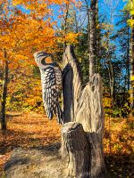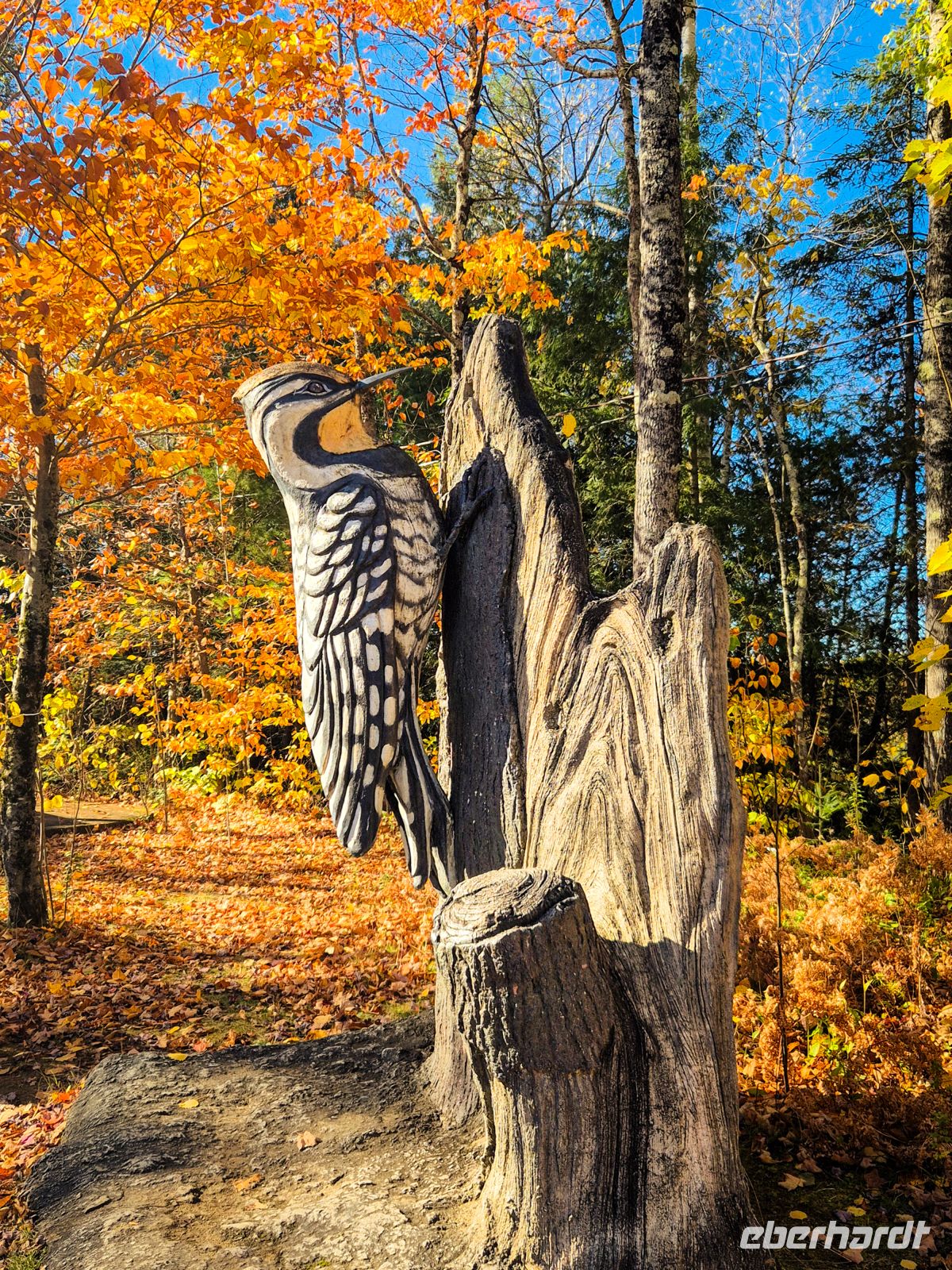 Unser erster Halt war das Visitor Center mit Museum, Souvenirshop und einer kleinen Kunstausstellung. Von der Terrasse genossen wir den weiten Blick über die Wälder des Parks. Anschließend besuchten wir den Logging Trail, der die Geschichte der Holzwirtschaft in Kanada anschaulich darstellt. Nach einer kurzen Filmvorführung erkundeten wir den Rundweg mit seinen Stationen. Bei bestem Wetter konnten wir uns im Wald sehr gut vorstellen, wie hart die Arbeit der Holzfäller in früheren Zeiten war. Bereits im 19. Jahrhundert zogen Holzfäller in die Wälder, um mit Muskelkraft Bäume zu fällen. Mit Äxten und Handsägen wurden riesige Stämme geschlagen, die man auf gefrorenen Wegen, über Seen oder Flüsse in die Sägewerke transportierte. Besonders im Frühling, wenn das Eis schmolz, trieben sogenannte „River Drivers“ die Stämme schwimmend flussabwärts – eine äußerst gefährliche Arbeit. Heute ist die Forstwirtschaft zwar immer noch ein bedeutender Wirtschaftszweig, doch im Algonquin Park streng reguliert, um die Natur nachhaltig zu schützen.