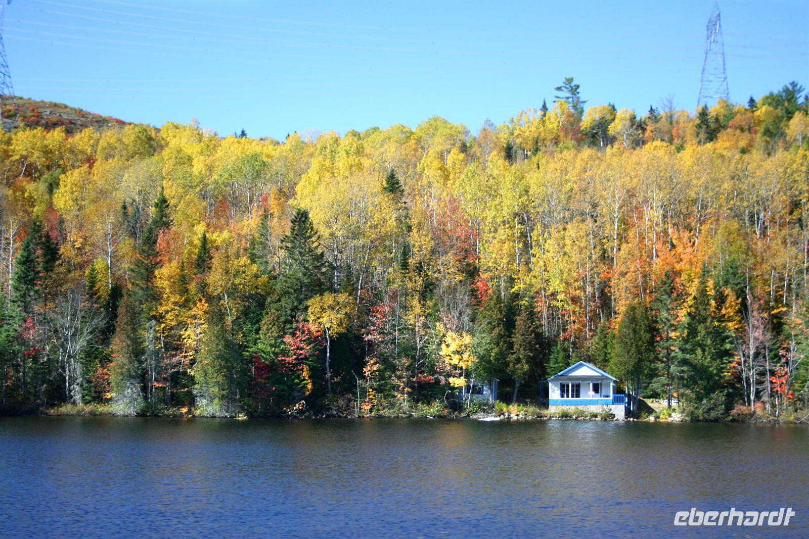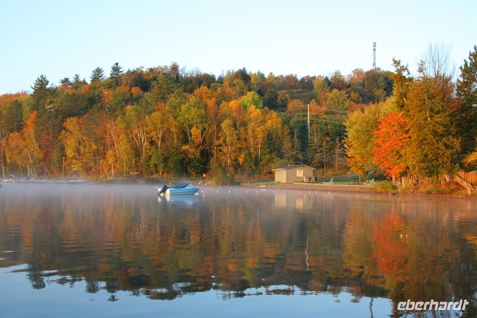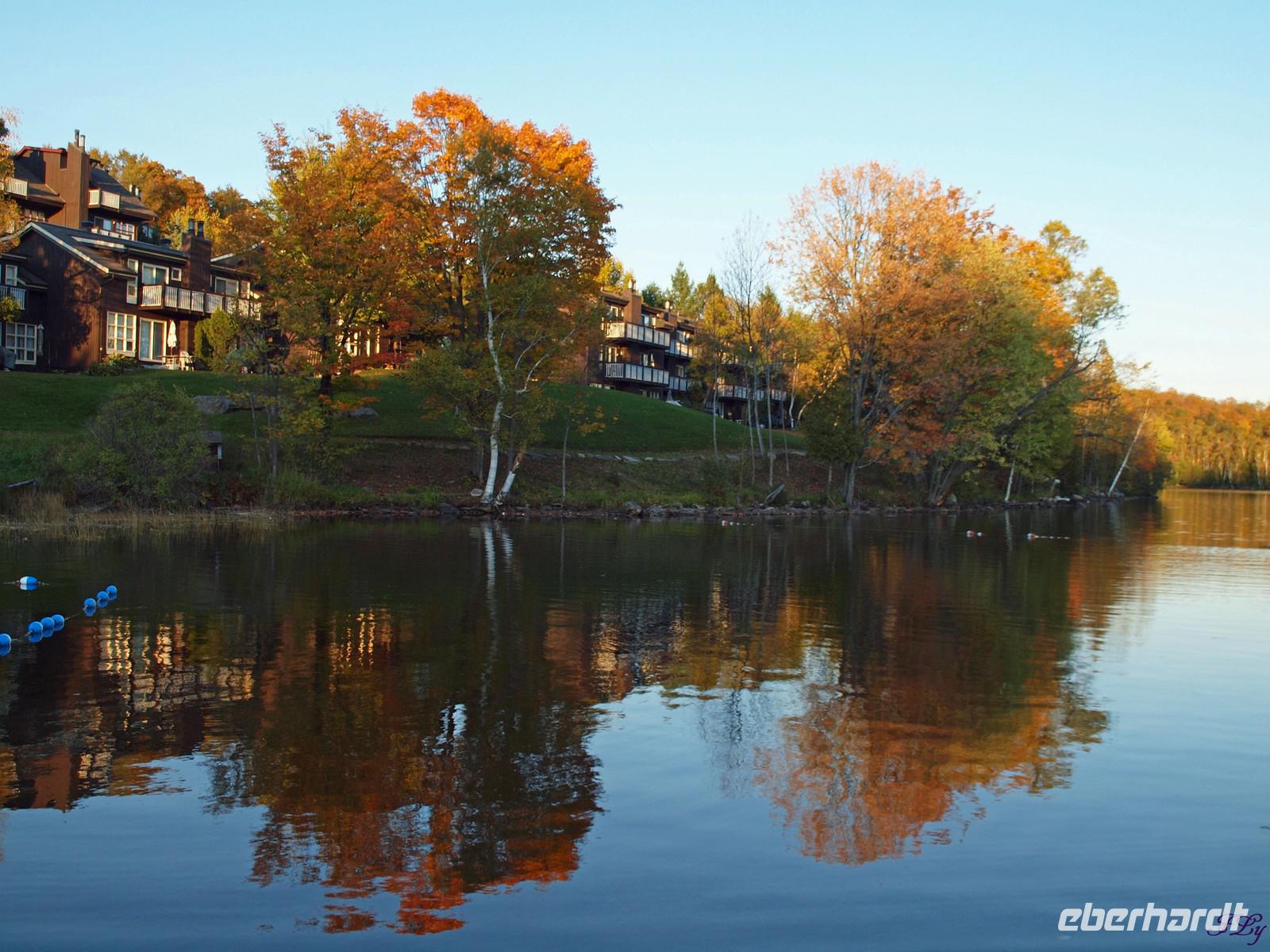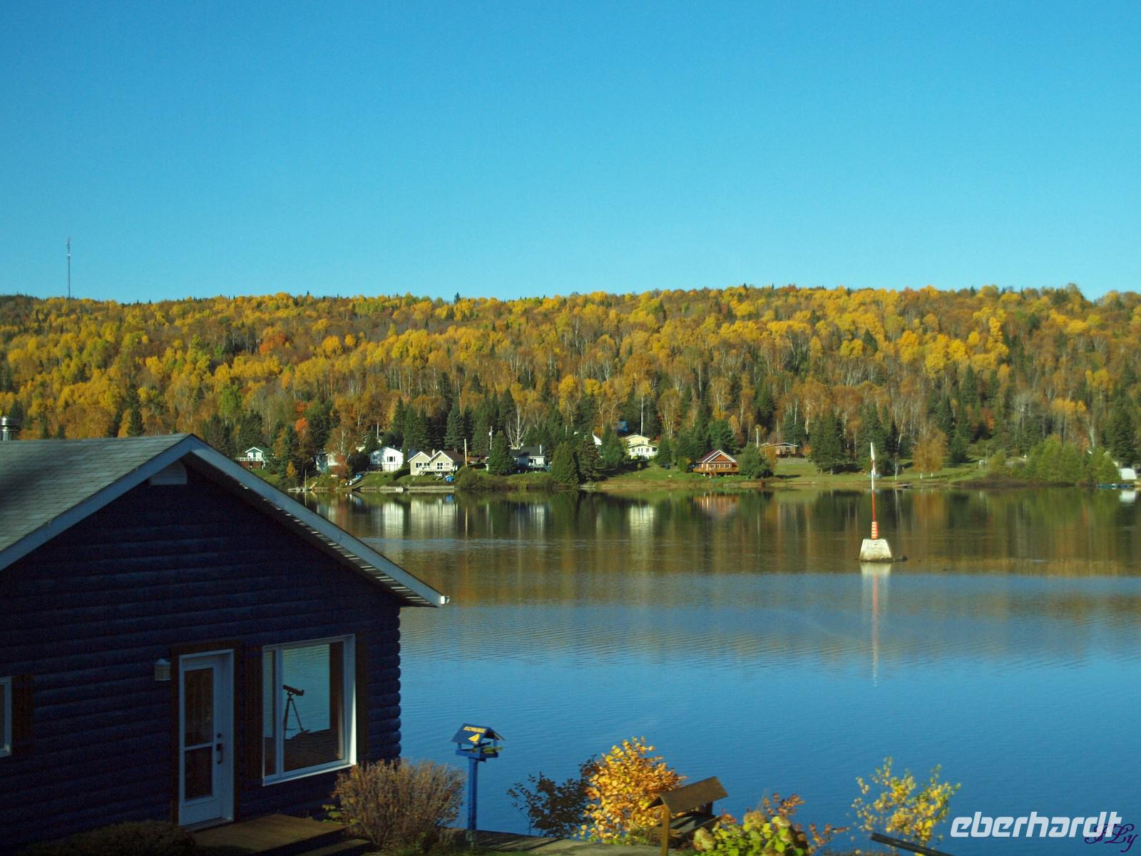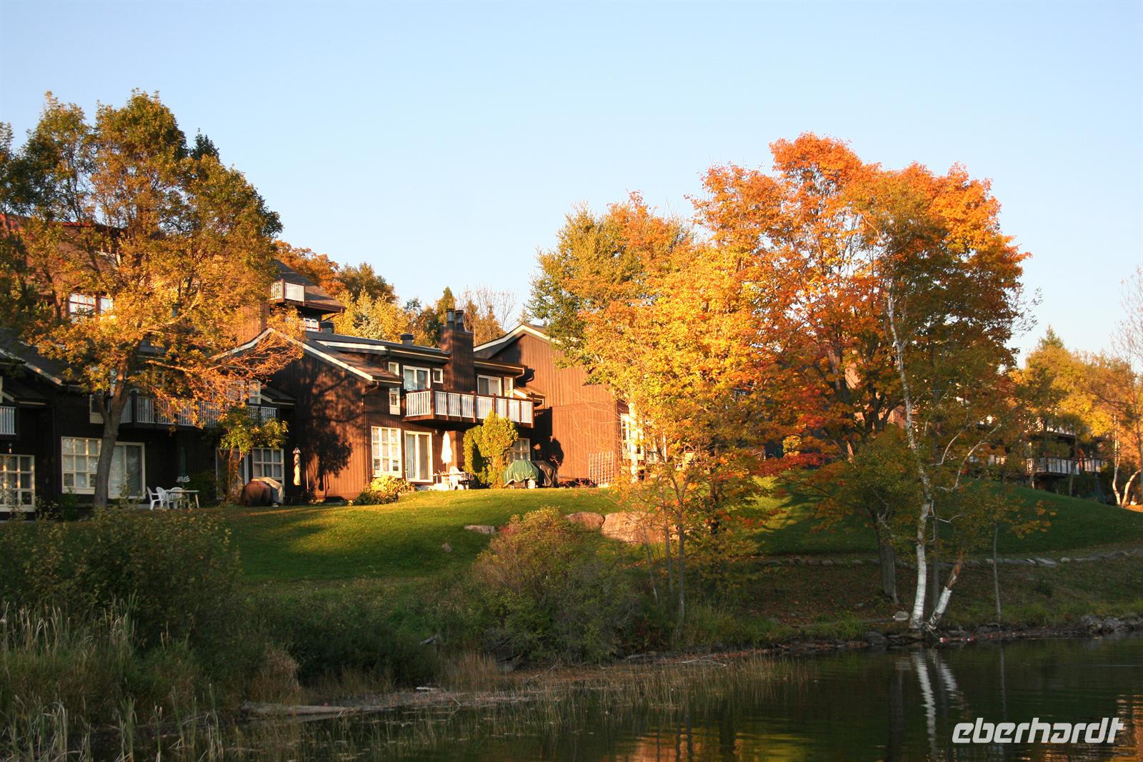 Ab 7.30 Uhr Frühstück im Hotel. Es gibt ein kleines Buffet und eine Mitarbeiterin des Hotels hält warme Milch für das Müsli und Bohnen, eine Spezialität der Region, auf Wunsch bereit. Wir nutzen den schönen Sonnenaufgang über dem St. Lorenz Strom auch schon für die ersten Fotomotive des Tages. Um 8.30 Uhr fahren wir los. Heute liegt eine weite Strecke von etwa 300 Kilometern vor uns. Wir fahren am St. Lorenz Strom entlang zurück in Richtung Quebec City. Unterwegs sehen wir am Ufer des St. Lorenz Stromes hunderte Schneegänse fliegen, die sich hier Anfang Oktober für ihren Flug gen Süden sammeln.Dann besichtigen wir die Basilika Sainte Anne de Beaupre. Wunderschön liegt die helle Kirche vor den Herbstfarben der Bäume. Hier gibt es auch jede Menge öffentlicher Toiletten. Dann besichtigen wir die riesige Kirche von innen. Aufgrund einiger Wunderheilungen, die hier geschehen sein sollen, zieht die Wallfahrtskirche bis heute viele katholische Gläubige an. Im Inneren kann man kunstvolle Mosaike und Bleiglasfenster bestaunen. Nach etwa 30 Minuten Aufenthalt fahren wir weiter in Richtung Quebec und biegen am Stadtrand in Richtung Nordwesten ab. Die Autobahn führt durch herrliche rot und orange gefärbte Wälder. Selbst die Hügelketten am Horizont erstrahlen in roten Tönen. Das bekommt man wirklich nur hier in Ostkanada zu sehen! Die Farben sind einfach unglaublich und wir haben riesiges Glück mit dem schönen Wetter! Um 13.00 Uhr legen wir eine Mittagspause wieder an der Kathedrale am Cap Madeleine am St. Lorenz Strom ein. Die Cafeteria hat leider schon Winterpause. Wir nutzen die Toiletten und die Getränkeautomaten und bummeln durch den Park, in dem es von Eichhörnchen nur so wimmelt. Gern posieren sie für die Kamera. Weiterfahrt um 13.45 Uhr. Nun verlassen wir den St. Lorenz Strom und es geht in Richtung Norden. Hier gibt es nur noch ländliche Regionen mit Landwirtschaft und kleinen, beschaulichen Dörfern. Die hübschen Holzhäuschen vor den bunten Laubbäumen, die Bauernhöfe und die rot bewaldeten Hügelketten sind eine Augenweide! Gegen 16.00 Uhr legen wir einen letzten Fotostopp in Saint Zenon ein. Hier gibt es neben der kleinen Kirche einen schönen Aussichtspunkt, von dem man über das Tal blicken kann. Dann sind es nur noch etwa 30 Minuten bis zu unserem Hotel in der Nähe von Saint Michel des Saints.Wir erreichen das Resort „Auberge du Lac Taureau“ am gleichnamigen See gegen 17.15 Uhr.Die Zimmer sind im Landhausstil eingerichtet, eher klein und gemütlich. Es gibt wie üblich TV, Telefon, Radiowecker, Föhn, Kosmetikartikel, Klimaanlage, Bügeleisen, Kaffeemaschine und teilweise auch einen Kühlschrank. Um 19.00 Uhr treffen wir uns alle zum Abendessen. Das Restaurant liegt in dem Gebäude rechts von der Rezeption. Es gibt ein 3-Gang-Menü mit Salat, Fisch oder Steak als Hauptgericht und Dessert mit Kaffee. Ein Glas Wein kostet 10 bis 11 CAD, das Trinkgeld ist bereits inkludiert. Das Personal ist freundlich und schnell. Im Untergeschoss befinden sich das Schwimmbad (ca. 12 x 5 Meter) und die Sauna. Da die Herrensauna geschlossen ist, können alle die Damensauna benutzen. Handtücher liegen in den Umkleideräumen extra bereit. Einen Bademantel kann man sich kostenlos an der Rezeption ausleihen. In die Sauna geht man hier übrigens, wie in Amerika üblich, mit Badebekleidung und nicht nackt. Die gemütliche Bar im Untergeschoss lädt zu einem Gute-Nacht-Getränk ein. Mittwoch, 12.10.2011