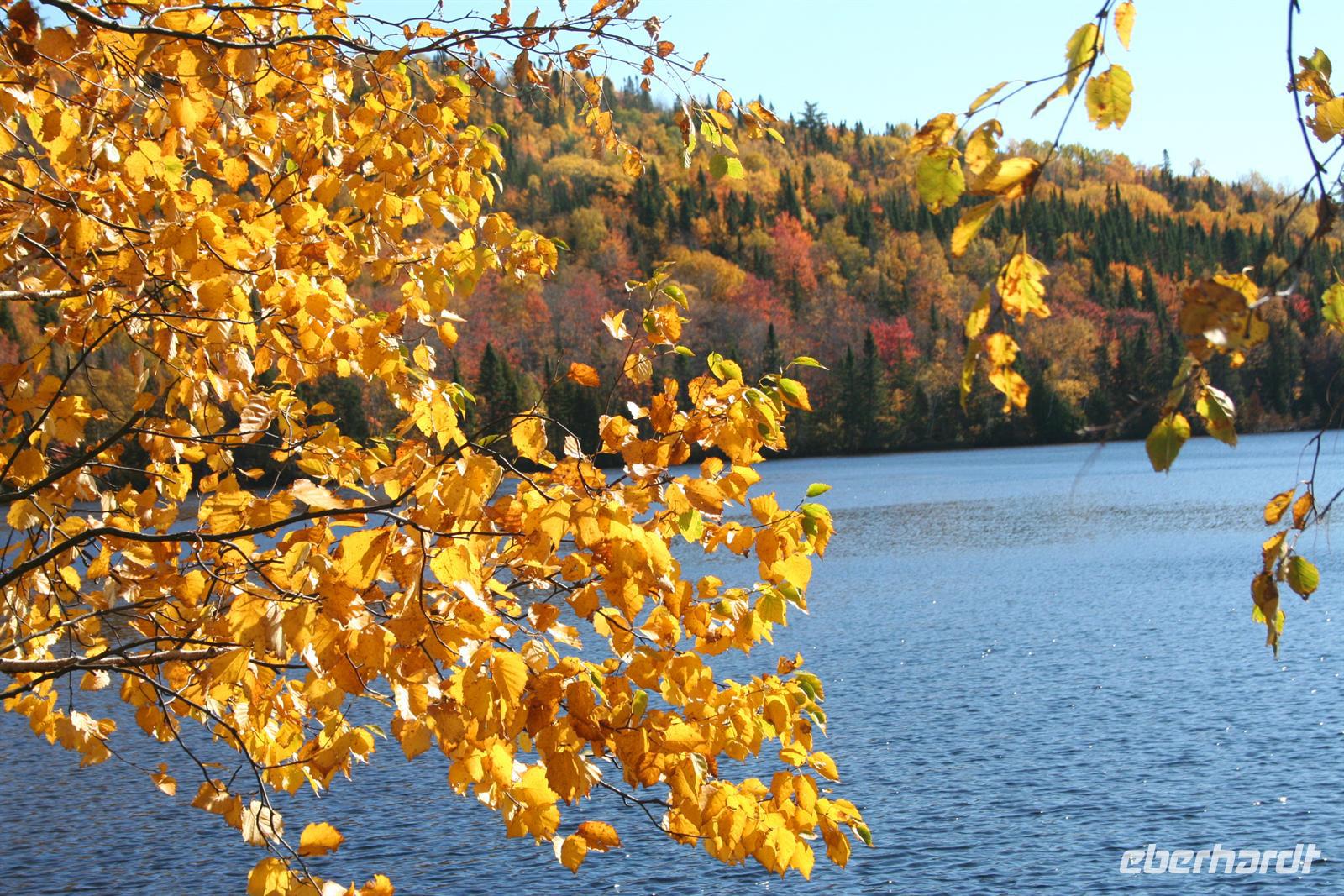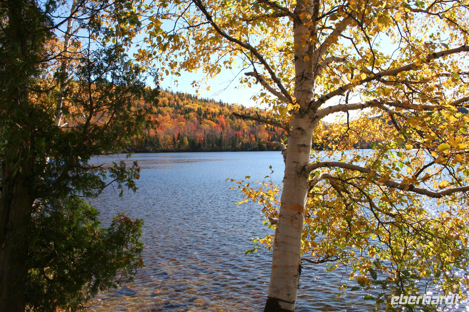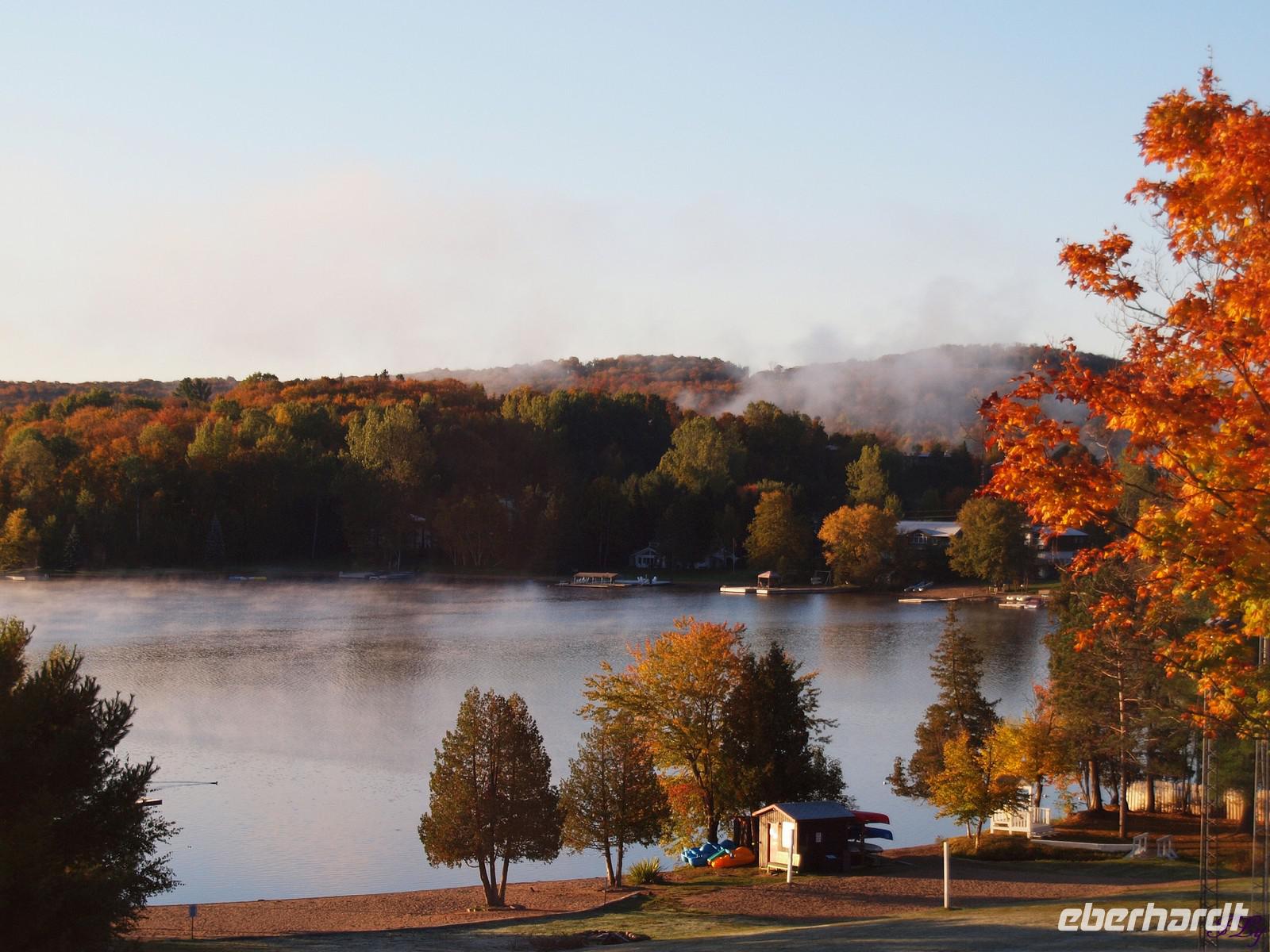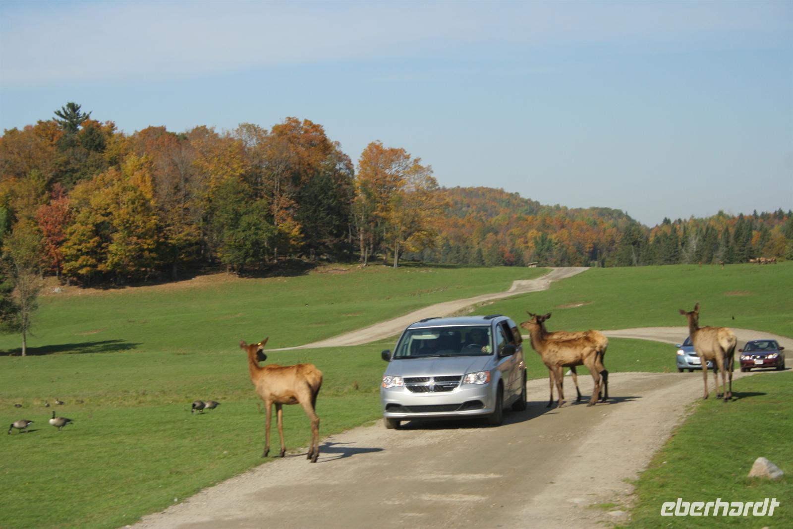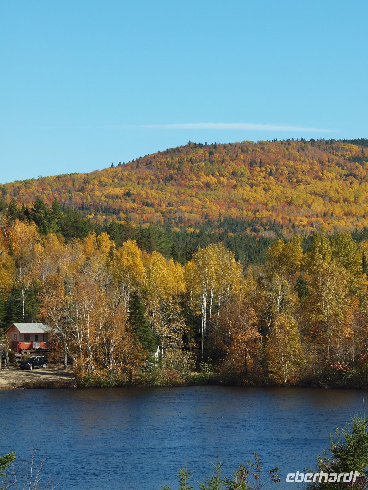 Ab 7.30 Uhr Frühstück im Hotel. Es gibt ein kleines Buffet und eine Mitarbeiterin des Hotels hält warme Milch für das Müsli und Bohnen, eine Spezialität der Region, auf Wunsch bereit. Wir nutzen den schönen Sonnenaufgang über dem St. Lorenz Strom auch schon für die ersten Fotomotive des Tages. Um 8.30 Uhr fahren wir los. Heute liegt eine weite Strecke von etwa 300 Kilometern vor uns. Wir fahren am St. Lorenz Strom entlang zurück in Richtung Quebec City. Unterwegs sehen wir am Ufer des St. Lorenz Stromes hunderte Schneegänse fliegen, die sich hier Anfang Oktober für ihren Flug gen Süden sammeln.Dann besichtigen wir die Basilika Sainte Anne de Beaupre. Wunderschön liegt die helle Kirche vor den Herbstfarben der Bäume. Hier gibt es auch jede Menge öffentlicher Toiletten. Dann besichtigen wir die riesige Kirche von innen. Aufgrund einiger Wunderheilungen, die hier geschehen sein sollen, zieht die Wallfahrtskirche bis heute viele katholische Gläubige an. Im Inneren kann man kunstvolle Mosaike und Bleiglasfenster bestaunen. Nach etwa 30 Minuten Aufenthalt fahren wir weiter in Richtung Quebec und biegen am Stadtrand in Richtung Nordwesten ab. Die Autobahn führt durch herrliche rot und orange gefärbte Wälder. Selbst die Hügelketten am Horizont erstrahlen in roten Tönen. Das bekommt man wirklich nur hier in Ostkanada zu sehen! Die Farben sind einfach unglaublich und wir haben riesiges Glück mit dem schönen Wetter! Um 13.00 Uhr legen wir eine Mittagspause wieder an der Kathedrale am Cap Madeleine am St. Lorenz Strom ein. Die Cafeteria hat leider schon Winterpause. Wir nutzen die Toiletten und die Getränkeautomaten und bummeln durch den Park, in dem es von Eichhörnchen nur so wimmelt. Gern posieren sie für die Kamera. Weiterfahrt um 13.45 Uhr. Nun verlassen wir den St. Lorenz Strom und es geht in Richtung Norden. Hier gibt es nur noch ländliche Regionen mit Landwirtschaft und kleinen, beschaulichen Dörfern. Die hübschen Holzhäuschen vor den bunten Laubbäumen, die Bauernhöfe und die rot bewaldeten Hügelketten sind eine Augenweide! Gegen 16.00 Uhr legen wir einen letzten Fotostopp in Saint Zenon ein. Hier gibt es neben der kleinen Kirche einen schönen Aussichtspunkt, von dem man über das Tal blicken kann. Dann sind es nur noch etwa 30 Minuten bis zu unserem Hotel in der Nähe von Saint Michel des Saints.Wir erreichen das Resort „Auberge du Lac Taureau“ am gleichnamigen See gegen 17.15 Uhr.Die Zimmer sind im Landhausstil eingerichtet, eher klein und gemütlich. Es gibt wie üblich TV, Telefon, Radiowecker, Föhn, Kosmetikartikel, Klimaanlage, Bügeleisen, Kaffeemaschine und teilweise auch einen Kühlschrank. Um 19.00 Uhr treffen wir uns alle zum Abendessen. Das Restaurant liegt in dem Gebäude rechts von der Rezeption. Es gibt ein 3-Gang-Menü mit Salat, Fisch oder Steak als Hauptgericht und Dessert mit Kaffee. Ein Glas Wein kostet 10 bis 11 CAD, das Trinkgeld ist bereits inkludiert. Das Personal ist freundlich und schnell. Im Untergeschoss befinden sich das Schwimmbad (ca. 12 x 5 Meter) und die Sauna. Da die Herrensauna geschlossen ist, können alle die Damensauna benutzen. Handtücher liegen in den Umkleideräumen extra bereit. Einen Bademantel kann man sich kostenlos an der Rezeption ausleihen. In die Sauna geht man hier übrigens, wie in Amerika üblich, mit Badebekleidung und nicht nackt. Die gemütliche Bar im Untergeschoss lädt zu einem Gute-Nacht-Getränk ein. Mittwoch, 12.10.2011