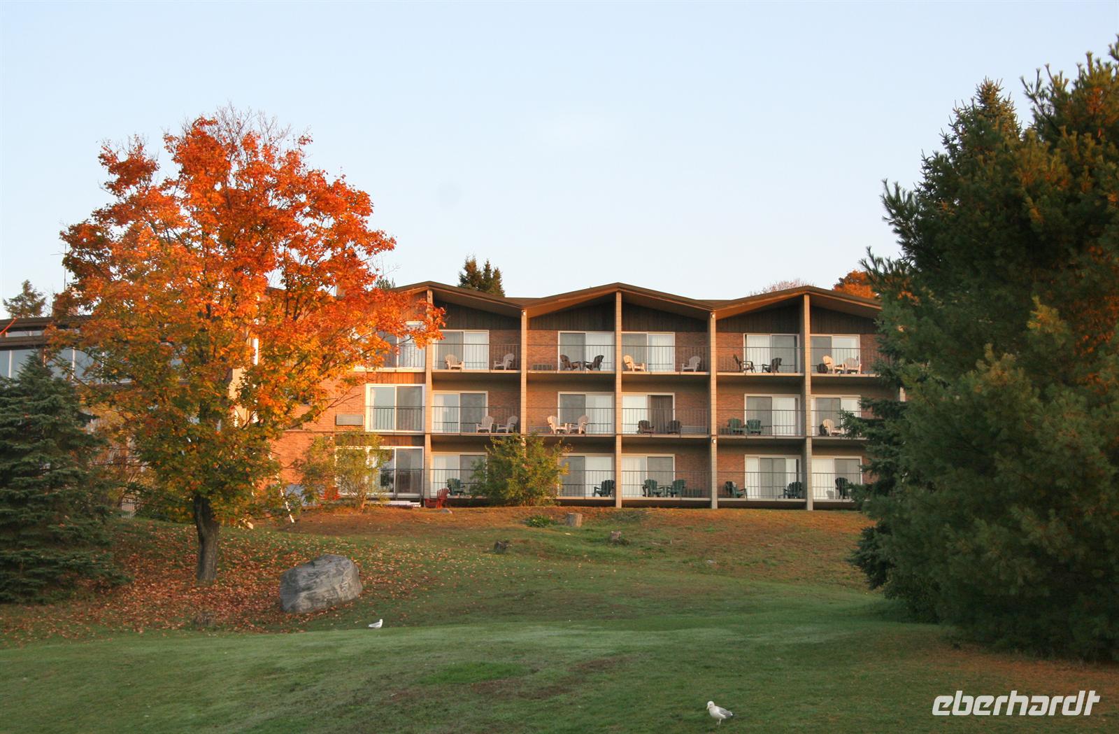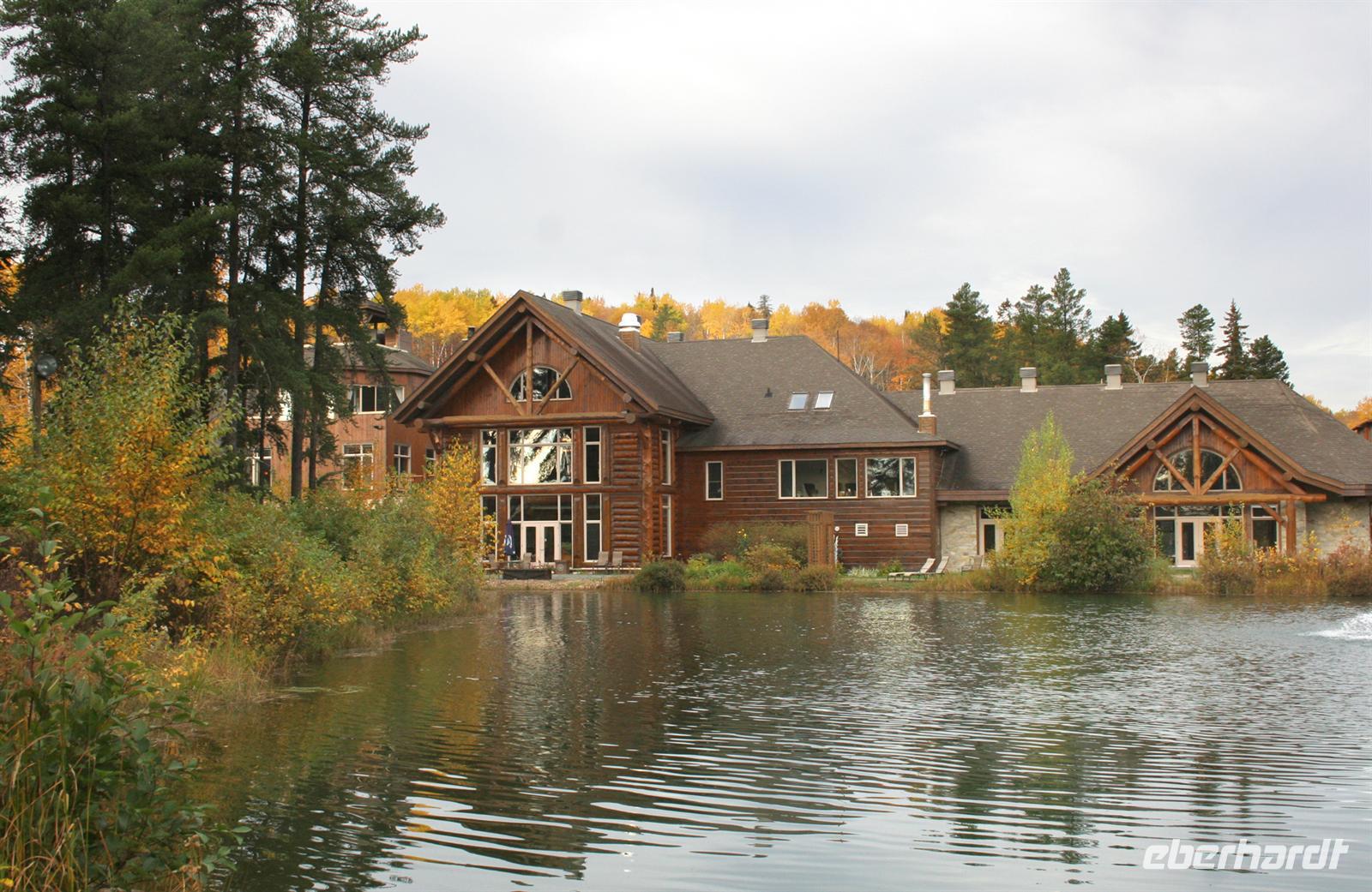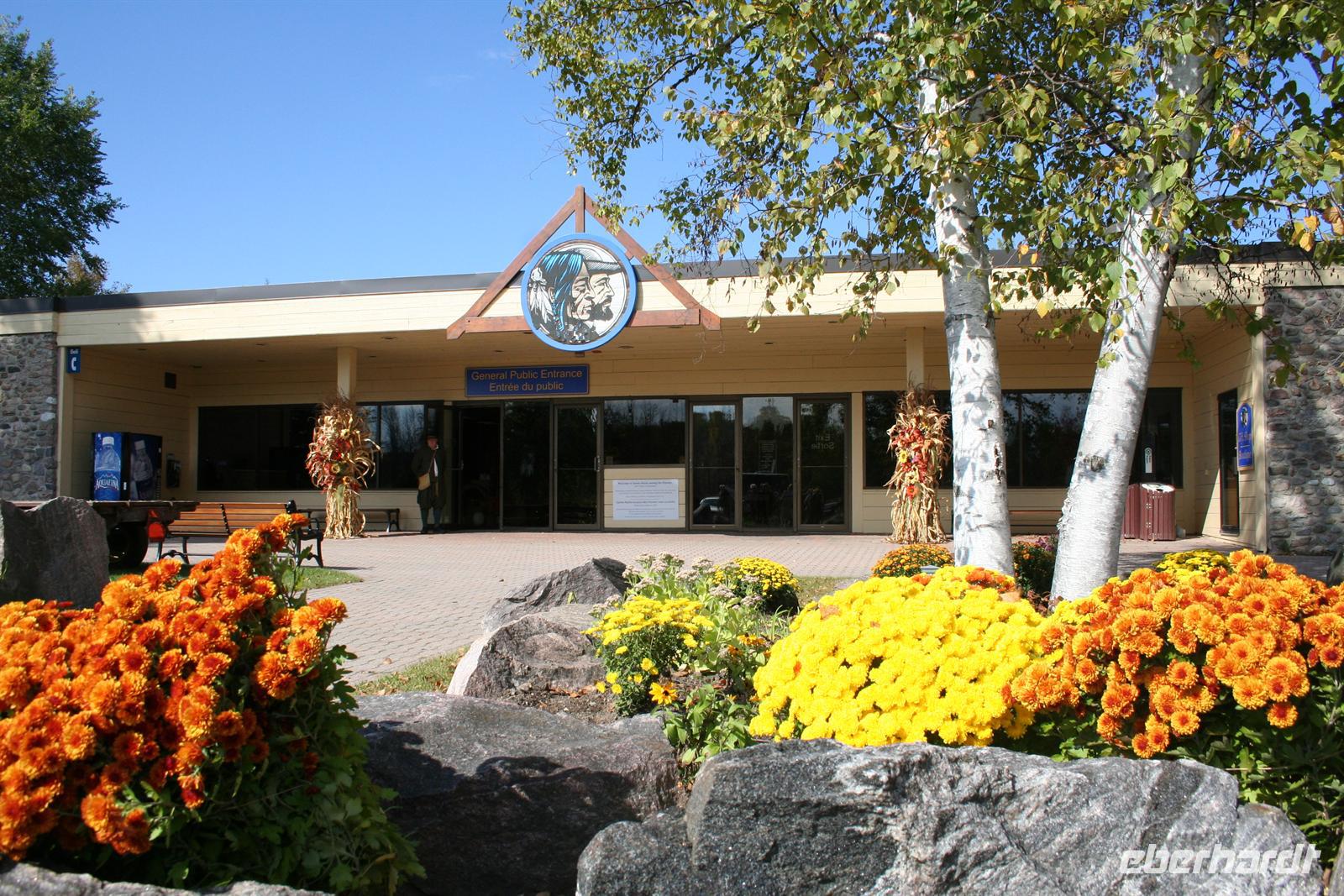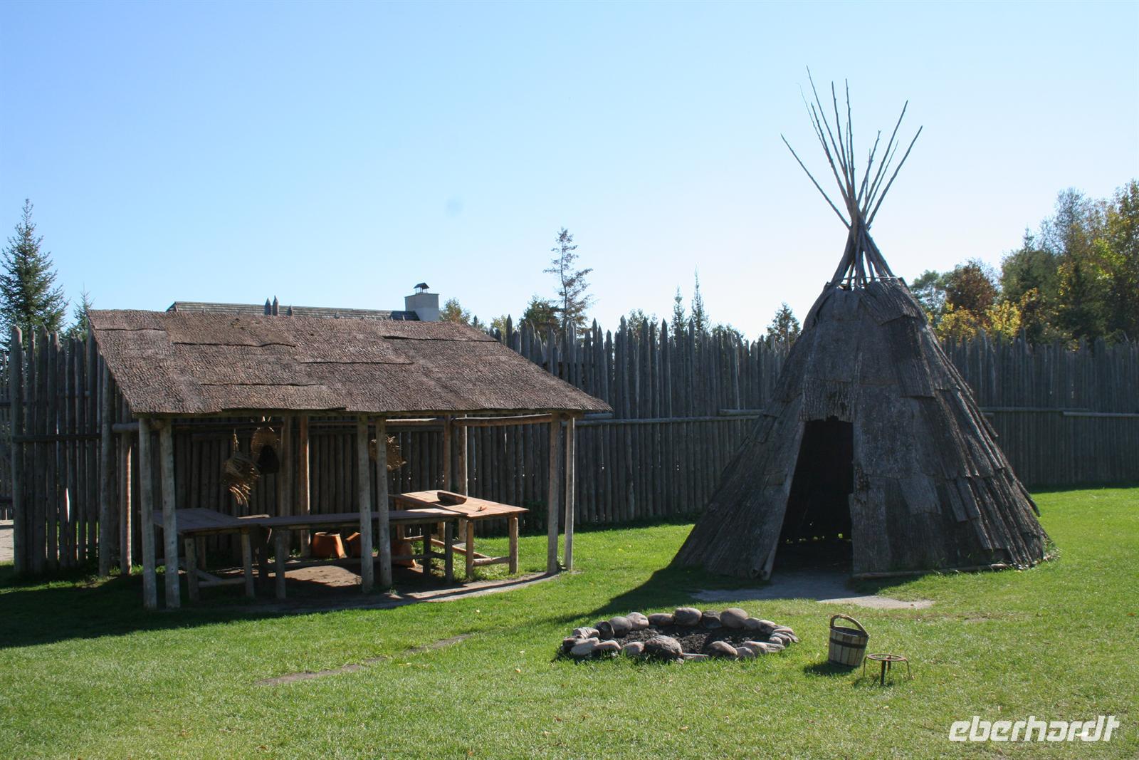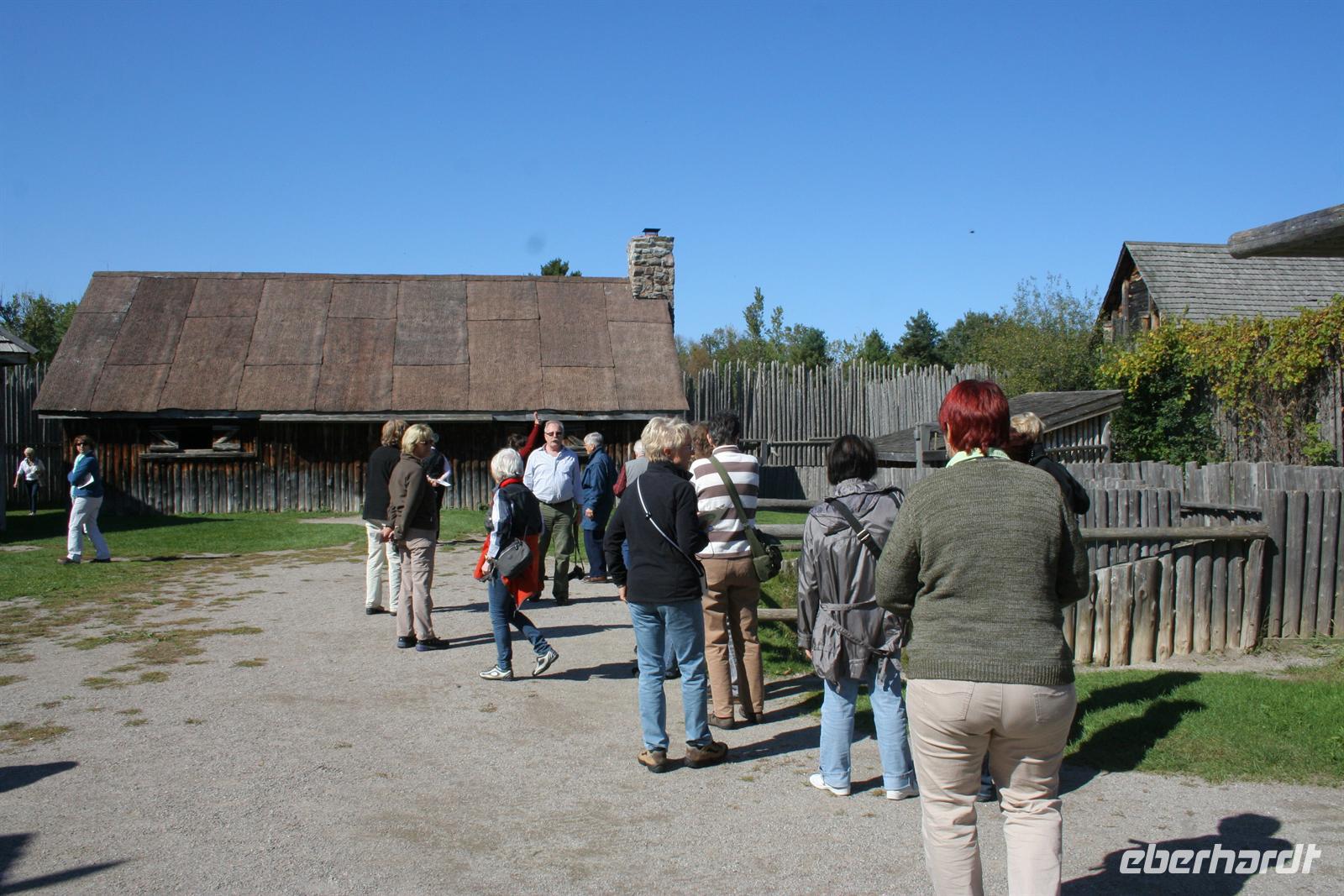 Weckruf um 6.30 Uhr. Frühstück im Hotelrestaurant um 7.30 Uhr. Das Frühstück erfolgte direkt am Tisch. Es standen große Platten mit Wurst und Käse sowie Obst auf dem Tisch und jeder bekam einen Teller mit Rührei, Toast und kleinen Croissants dazu. Das Frühstück kam sehr gut an und war sehr reichlich. Schön ist das frische Obst: Melone, Weintrauben, Erdbeeren.8.30 Uhr Koffer verladen und Abfahrt zurück in Richtung Toronto und weiter in die Muskoka-Region nördlich von Toronto. In Midland besuchen wir die rekonstruierte Jesuitenmission Sainte-Marie among the Hurons. Das kleine mit Holzpalisaden umrahmte Dorf wurde originalgetreu rekonstruiert und zeigt die Gebäude der Jesuiten und Huronen-Indianer, die hier zeitweise gemeinsam lebten. Die Führung in Deutsch übernimmt eine örtliche Führerin Ilse, die selbst aus Deutschland stammt. Sie zeigt uns die Gebäude und erklärt uns alles Wissenswerte zum Leben der Jesuiten und Indianer. Jeder bekommt ein Prospekt mit Lageplan und Erklärungen in Deutsch. Wir sehen die Gebetshäuser, die Lager und Ställe, die einfachen Wohnräume der Jesuiten, Indianer-Tipis aus Holz und Rinde sowie die typischen Langhäuser der Indianer. Es ist sehr interessant.Im Museumsgebäude essen wir zu Mittag. Es gibt Salat, Lasagne, Hackfleisch und Kartoffeln, Möhren und Kuchen, Kaffee und Obst zum Dessert. Im Souvenirgeschäft kann man Indianer-Souvenirs kaufen: Traumfänger, Bücher, Schmuck, Tassen, Bilder ... alles wurde hier in Kanada hergestellt. Gegen 15.00 Uhr fahren wir weiter in Richtung Norden bzw. Nordosten. Unser Ziel ist das „Hidden Valley Resort" am Rande des Algonquin-Nationalparks. Etwa 10 Minuten vor dem Hotel kaufen wir noch einmal in einem Supermarkt ein. So kann sich jeder etwas zum Essen und ein Fläschchen Wein für abends besorgen. Natürlich besteht auch die Möglichkeit, individuell im Hotelrestaurant zu essen. Um 18.00 Uhr kommen wir am Hotel an. Es liegt wunderschön ruhig an einem See inmitten der Natur. Wir checken hier für die nächsten beiden Nächte ein und unternehmen einen kleinen Spaziergang durch die Hotelanlage hinunter zum See. Bei einem Glas Wein oder einem Bier von der Bar lassen wir den Tag gemütlich ausklingen.Die Zimmer sind ausgestattet mit Wanne/WC, Föhn, Bügeleisen, Kosmetikartikeln, TV, Radiowecker, Telefon und Klimaanlage/Heizung sowie Balkon. Es gibt ein Restaurant, eine Bar, einen Innen- und einen Außenpool, Tennisplätze und einen Basketballplatz. In der Lobby ist ein Computer mit kostenlosem Internetzugang. Das funktioniert problemlos.Donnerstag, 06.10.2011