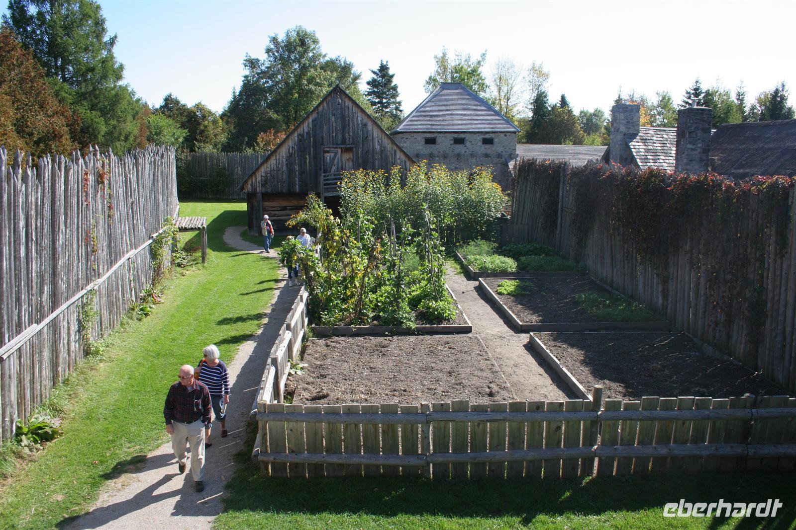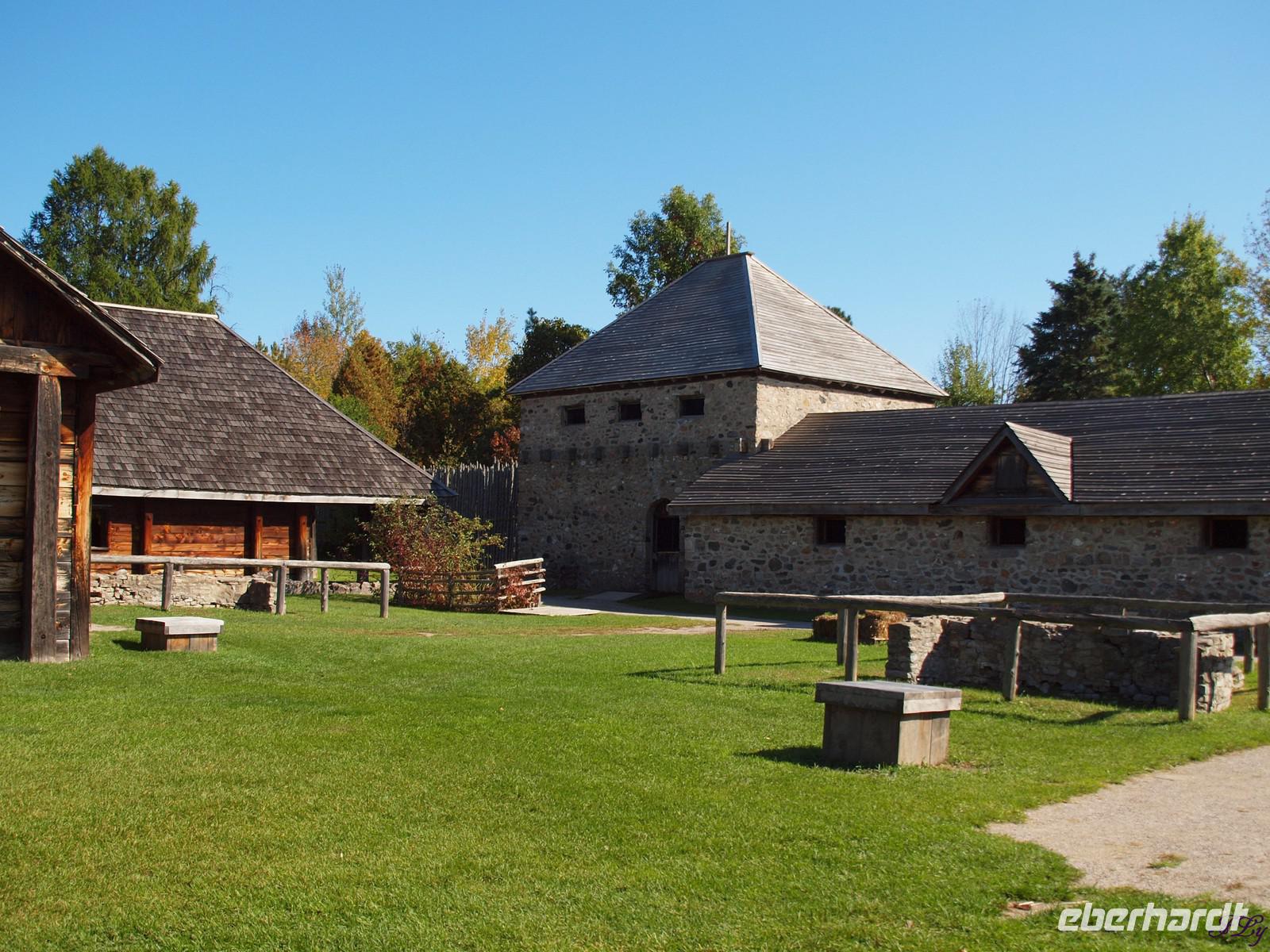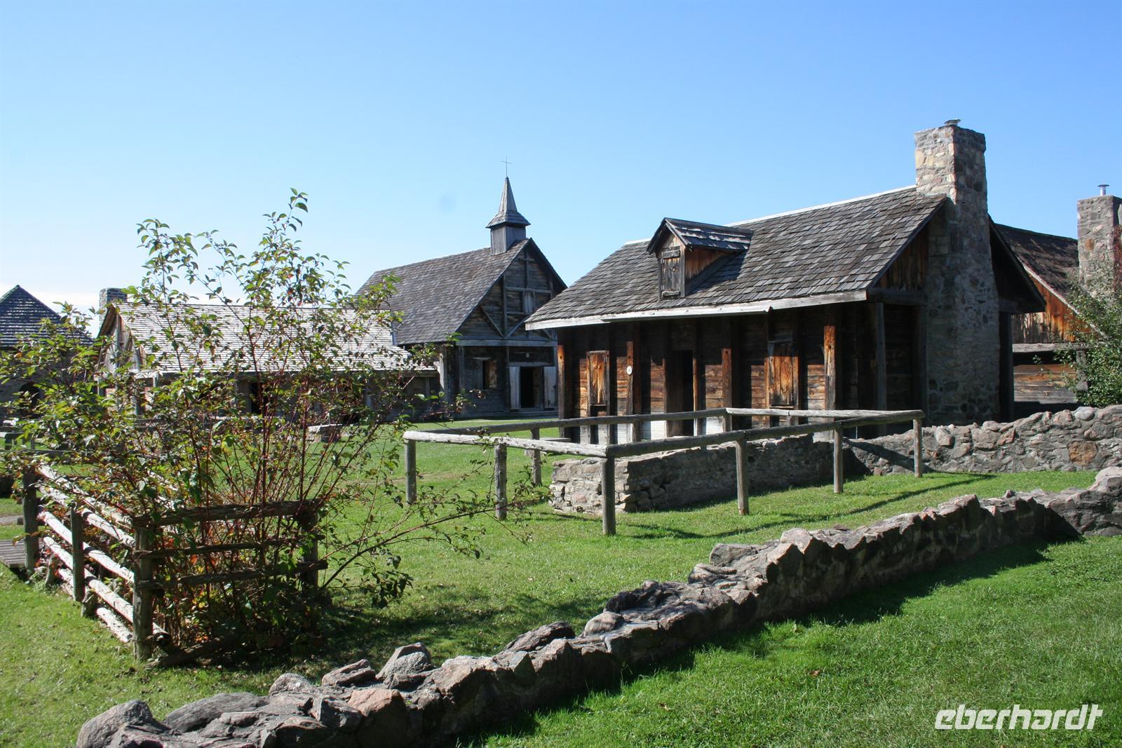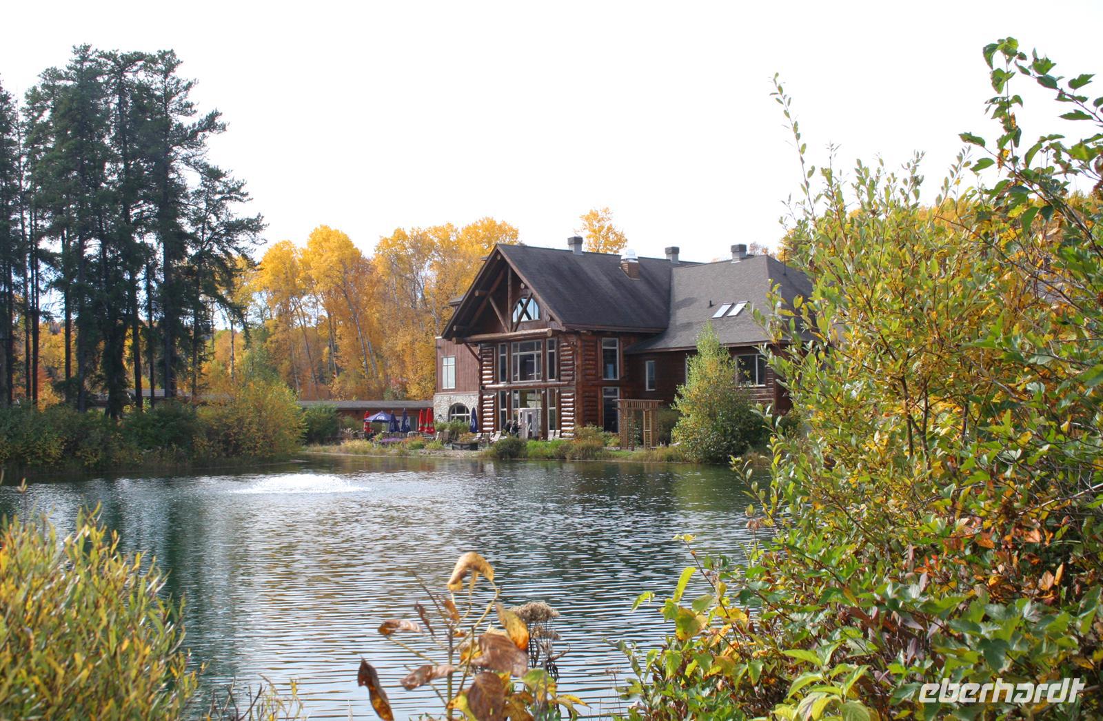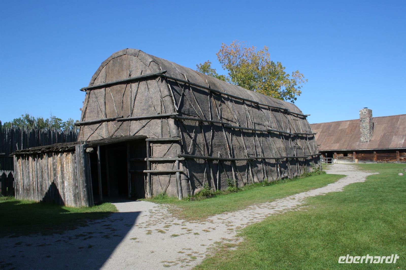 Weckruf um 6.30 Uhr. Frühstück im Hotelrestaurant um 7.30 Uhr. Das Frühstück erfolgte direkt am Tisch. Es standen große Platten mit Wurst und Käse sowie Obst auf dem Tisch und jeder bekam einen Teller mit Rührei, Toast und kleinen Croissants dazu. Das Frühstück kam sehr gut an und war sehr reichlich. Schön ist das frische Obst: Melone, Weintrauben, Erdbeeren.8.30 Uhr Koffer verladen und Abfahrt zurück in Richtung Toronto und weiter in die Muskoka-Region nördlich von Toronto. In Midland besuchen wir die rekonstruierte Jesuitenmission Sainte-Marie among the Hurons. Das kleine mit Holzpalisaden umrahmte Dorf wurde originalgetreu rekonstruiert und zeigt die Gebäude der Jesuiten und Huronen-Indianer, die hier zeitweise gemeinsam lebten. Die Führung in Deutsch übernimmt eine örtliche Führerin Ilse, die selbst aus Deutschland stammt. Sie zeigt uns die Gebäude und erklärt uns alles Wissenswerte zum Leben der Jesuiten und Indianer. Jeder bekommt ein Prospekt mit Lageplan und Erklärungen in Deutsch. Wir sehen die Gebetshäuser, die Lager und Ställe, die einfachen Wohnräume der Jesuiten, Indianer-Tipis aus Holz und Rinde sowie die typischen Langhäuser der Indianer. Es ist sehr interessant.Im Museumsgebäude essen wir zu Mittag. Es gibt Salat, Lasagne, Hackfleisch und Kartoffeln, Möhren und Kuchen, Kaffee und Obst zum Dessert. Im Souvenirgeschäft kann man Indianer-Souvenirs kaufen: Traumfänger, Bücher, Schmuck, Tassen, Bilder ... alles wurde hier in Kanada hergestellt. Gegen 15.00 Uhr fahren wir weiter in Richtung Norden bzw. Nordosten. Unser Ziel ist das „Hidden Valley Resort" am Rande des Algonquin-Nationalparks. Etwa 10 Minuten vor dem Hotel kaufen wir noch einmal in einem Supermarkt ein. So kann sich jeder etwas zum Essen und ein Fläschchen Wein für abends besorgen. Natürlich besteht auch die Möglichkeit, individuell im Hotelrestaurant zu essen. Um 18.00 Uhr kommen wir am Hotel an. Es liegt wunderschön ruhig an einem See inmitten der Natur. Wir checken hier für die nächsten beiden Nächte ein und unternehmen einen kleinen Spaziergang durch die Hotelanlage hinunter zum See. Bei einem Glas Wein oder einem Bier von der Bar lassen wir den Tag gemütlich ausklingen.Die Zimmer sind ausgestattet mit Wanne/WC, Föhn, Bügeleisen, Kosmetikartikeln, TV, Radiowecker, Telefon und Klimaanlage/Heizung sowie Balkon. Es gibt ein Restaurant, eine Bar, einen Innen- und einen Außenpool, Tennisplätze und einen Basketballplatz. In der Lobby ist ein Computer mit kostenlosem Internetzugang. Das funktioniert problemlos.Donnerstag, 06.10.2011