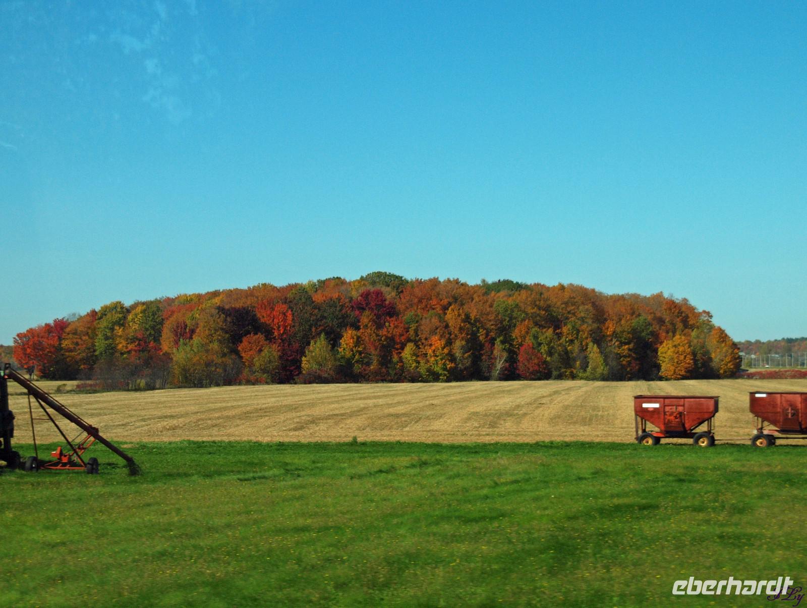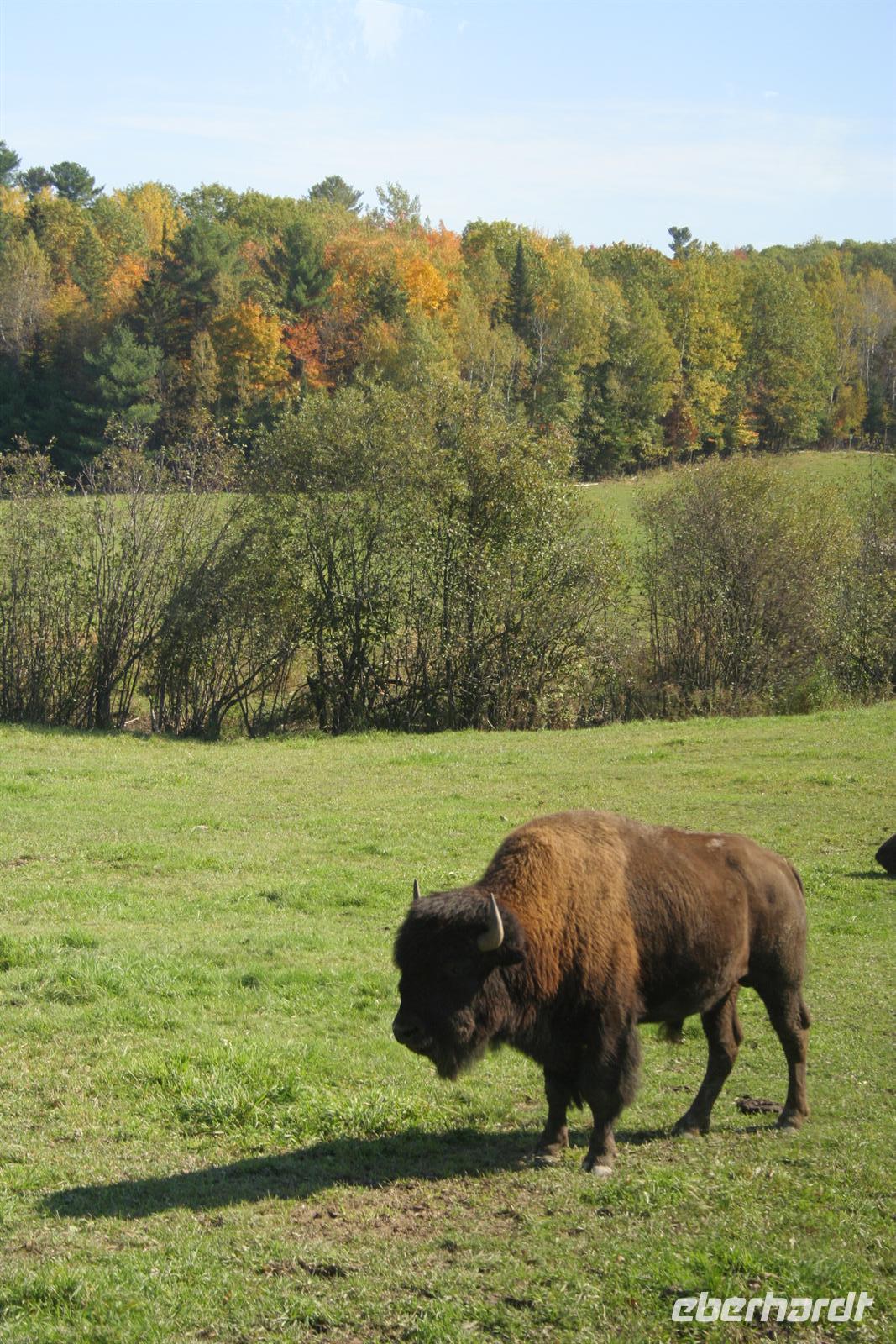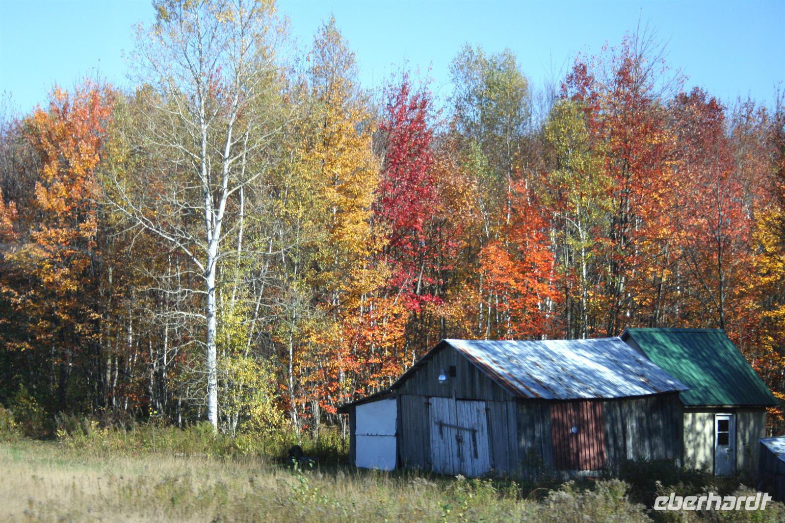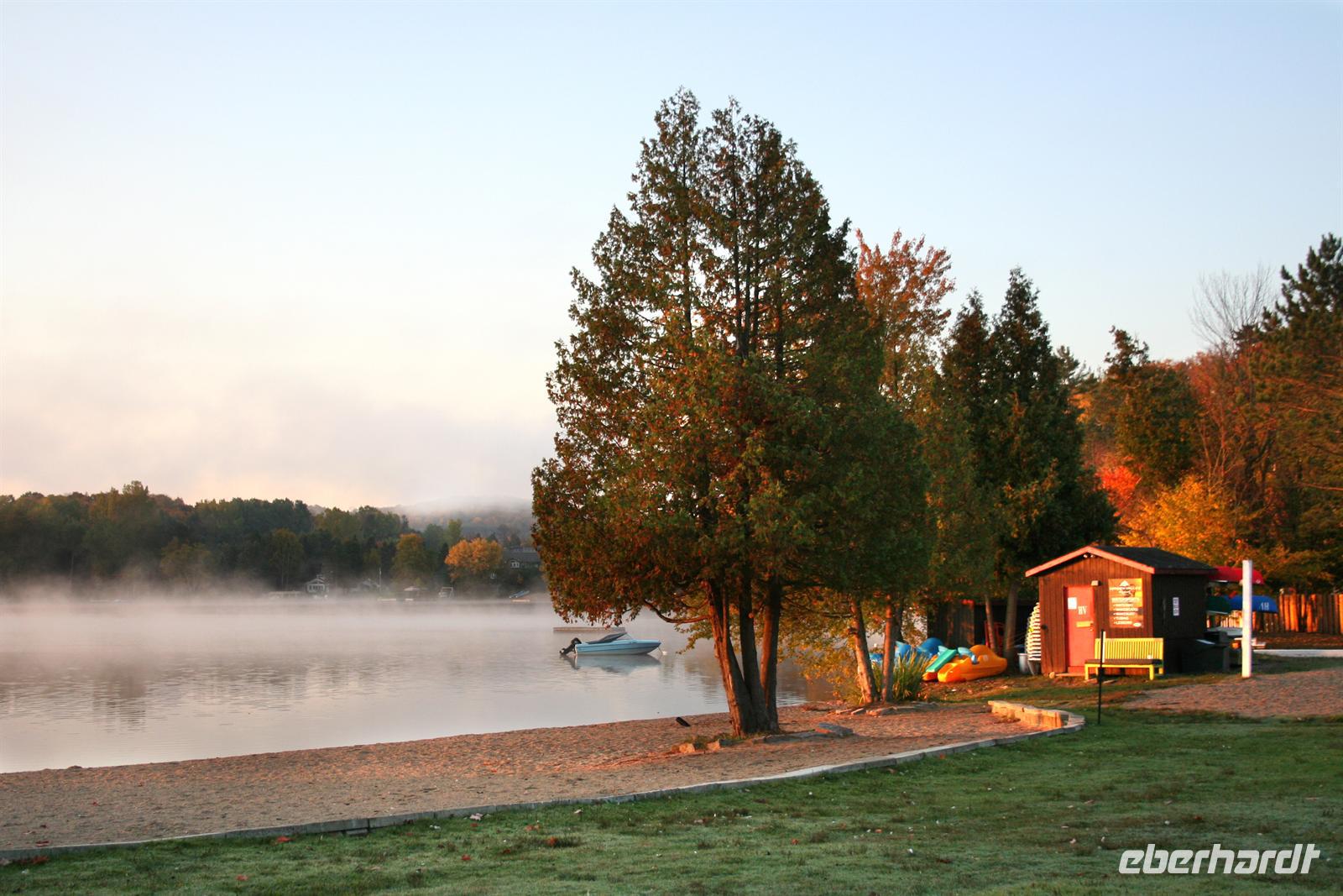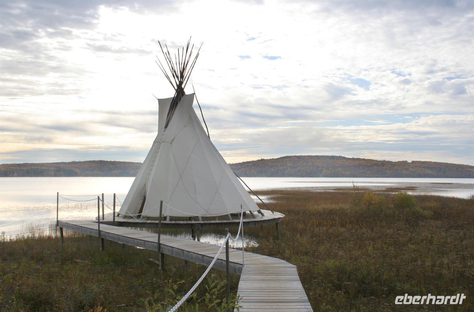 Weckruf um 6.30 Uhr. Frühstück im Hotelrestaurant um 7.30 Uhr. Das Frühstück erfolgte direkt am Tisch. Es standen große Platten mit Wurst und Käse sowie Obst auf dem Tisch und jeder bekam einen Teller mit Rührei, Toast und kleinen Croissants dazu. Das Frühstück kam sehr gut an und war sehr reichlich. Schön ist das frische Obst: Melone, Weintrauben, Erdbeeren.8.30 Uhr Koffer verladen und Abfahrt zurück in Richtung Toronto und weiter in die Muskoka-Region nördlich von Toronto. In Midland besuchen wir die rekonstruierte Jesuitenmission Sainte-Marie among the Hurons. Das kleine mit Holzpalisaden umrahmte Dorf wurde originalgetreu rekonstruiert und zeigt die Gebäude der Jesuiten und Huronen-Indianer, die hier zeitweise gemeinsam lebten. Die Führung in Deutsch übernimmt eine örtliche Führerin Ilse, die selbst aus Deutschland stammt. Sie zeigt uns die Gebäude und erklärt uns alles Wissenswerte zum Leben der Jesuiten und Indianer. Jeder bekommt ein Prospekt mit Lageplan und Erklärungen in Deutsch. Wir sehen die Gebetshäuser, die Lager und Ställe, die einfachen Wohnräume der Jesuiten, Indianer-Tipis aus Holz und Rinde sowie die typischen Langhäuser der Indianer. Es ist sehr interessant.Im Museumsgebäude essen wir zu Mittag. Es gibt Salat, Lasagne, Hackfleisch und Kartoffeln, Möhren und Kuchen, Kaffee und Obst zum Dessert. Im Souvenirgeschäft kann man Indianer-Souvenirs kaufen: Traumfänger, Bücher, Schmuck, Tassen, Bilder ... alles wurde hier in Kanada hergestellt. Gegen 15.00 Uhr fahren wir weiter in Richtung Norden bzw. Nordosten. Unser Ziel ist das „Hidden Valley Resort" am Rande des Algonquin-Nationalparks. Etwa 10 Minuten vor dem Hotel kaufen wir noch einmal in einem Supermarkt ein. So kann sich jeder etwas zum Essen und ein Fläschchen Wein für abends besorgen. Natürlich besteht auch die Möglichkeit, individuell im Hotelrestaurant zu essen. Um 18.00 Uhr kommen wir am Hotel an. Es liegt wunderschön ruhig an einem See inmitten der Natur. Wir checken hier für die nächsten beiden Nächte ein und unternehmen einen kleinen Spaziergang durch die Hotelanlage hinunter zum See. Bei einem Glas Wein oder einem Bier von der Bar lassen wir den Tag gemütlich ausklingen.Die Zimmer sind ausgestattet mit Wanne/WC, Föhn, Bügeleisen, Kosmetikartikeln, TV, Radiowecker, Telefon und Klimaanlage/Heizung sowie Balkon. Es gibt ein Restaurant, eine Bar, einen Innen- und einen Außenpool, Tennisplätze und einen Basketballplatz. In der Lobby ist ein Computer mit kostenlosem Internetzugang. Das funktioniert problemlos.Donnerstag, 06.10.2011