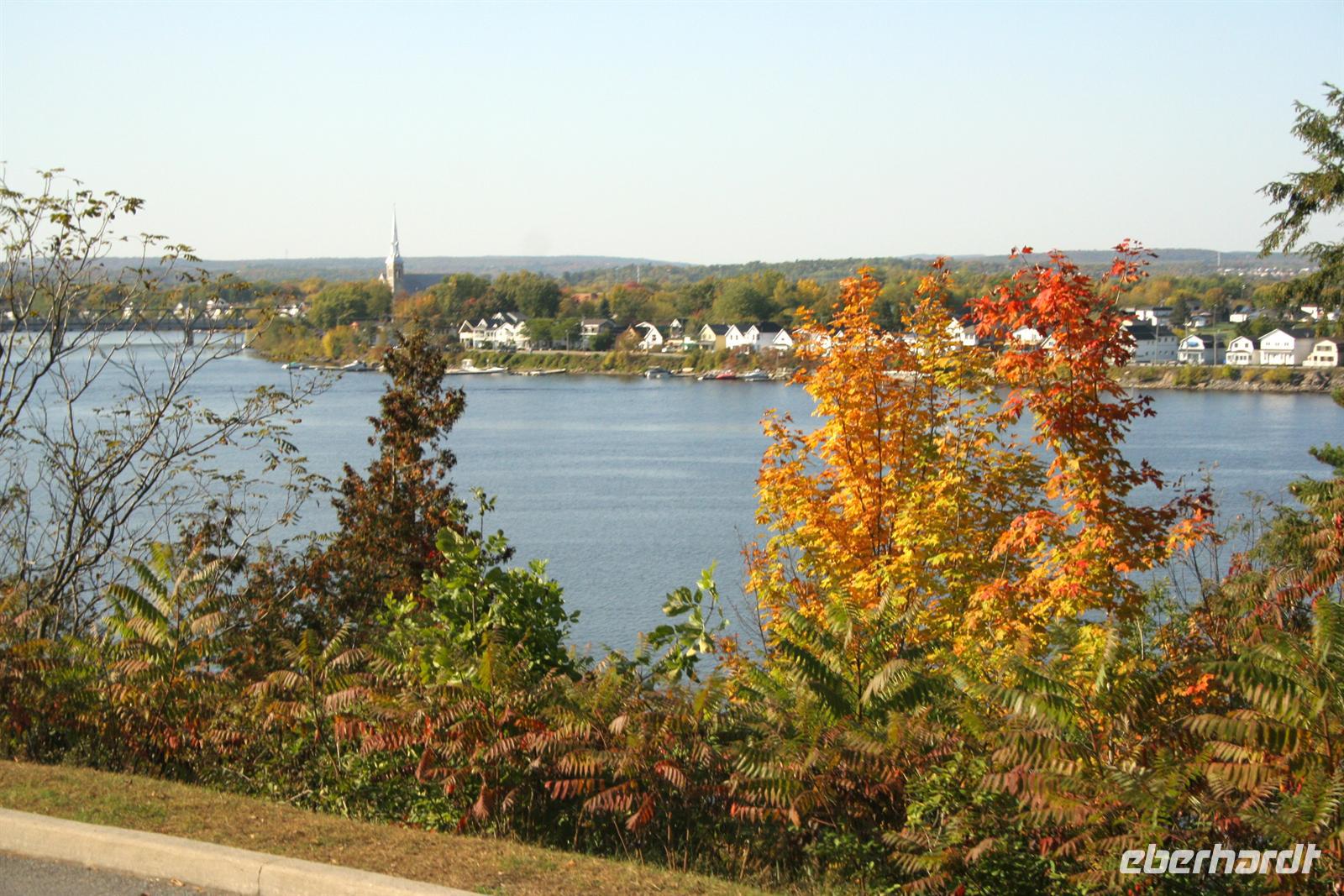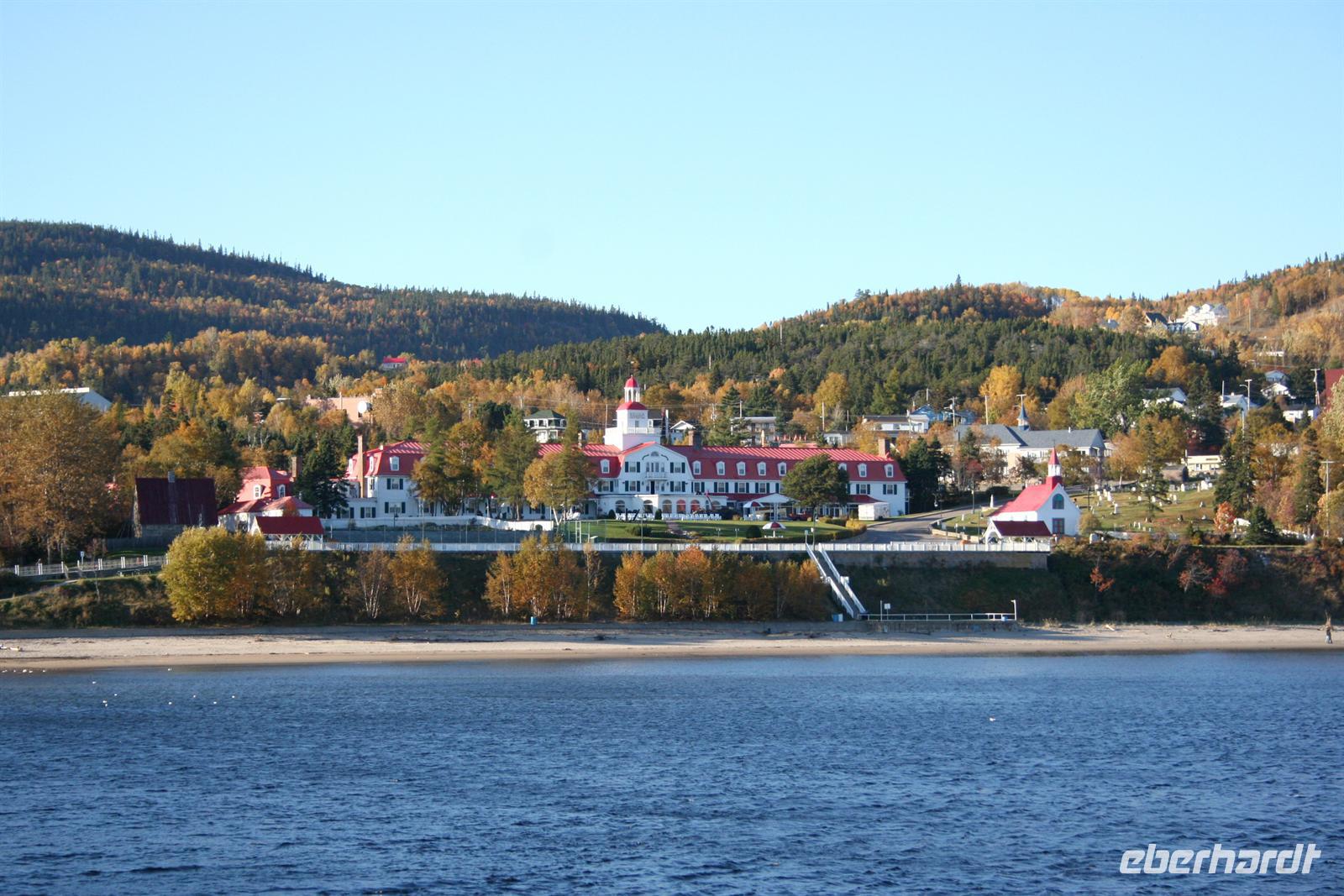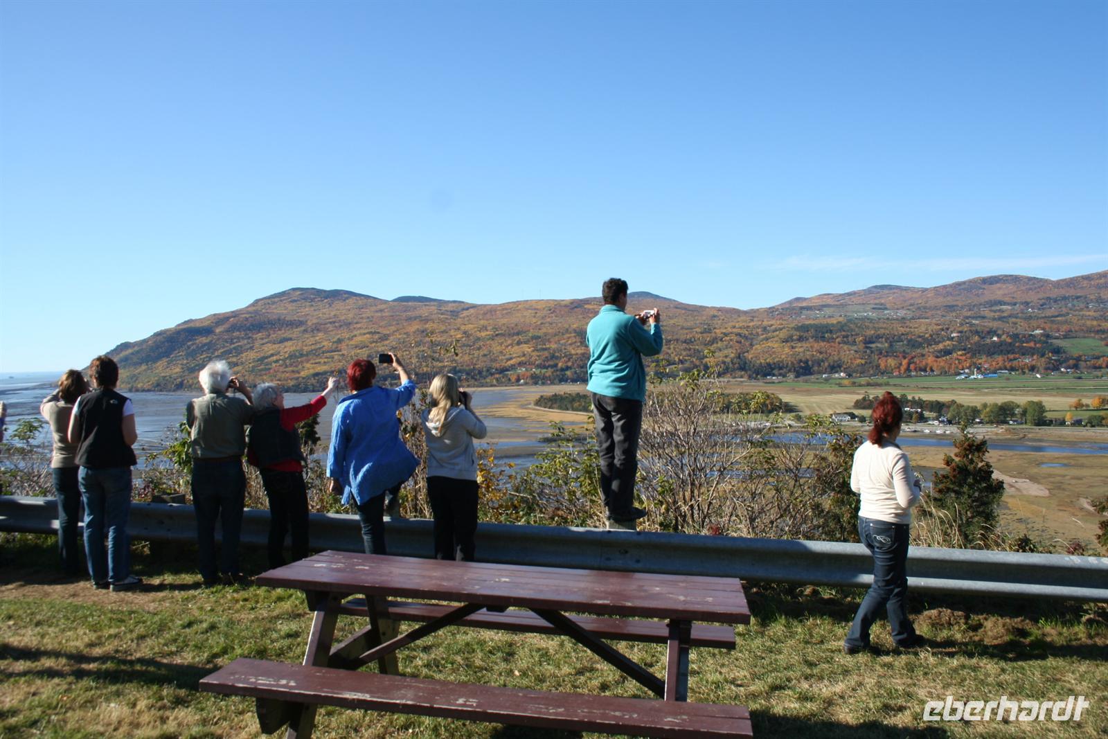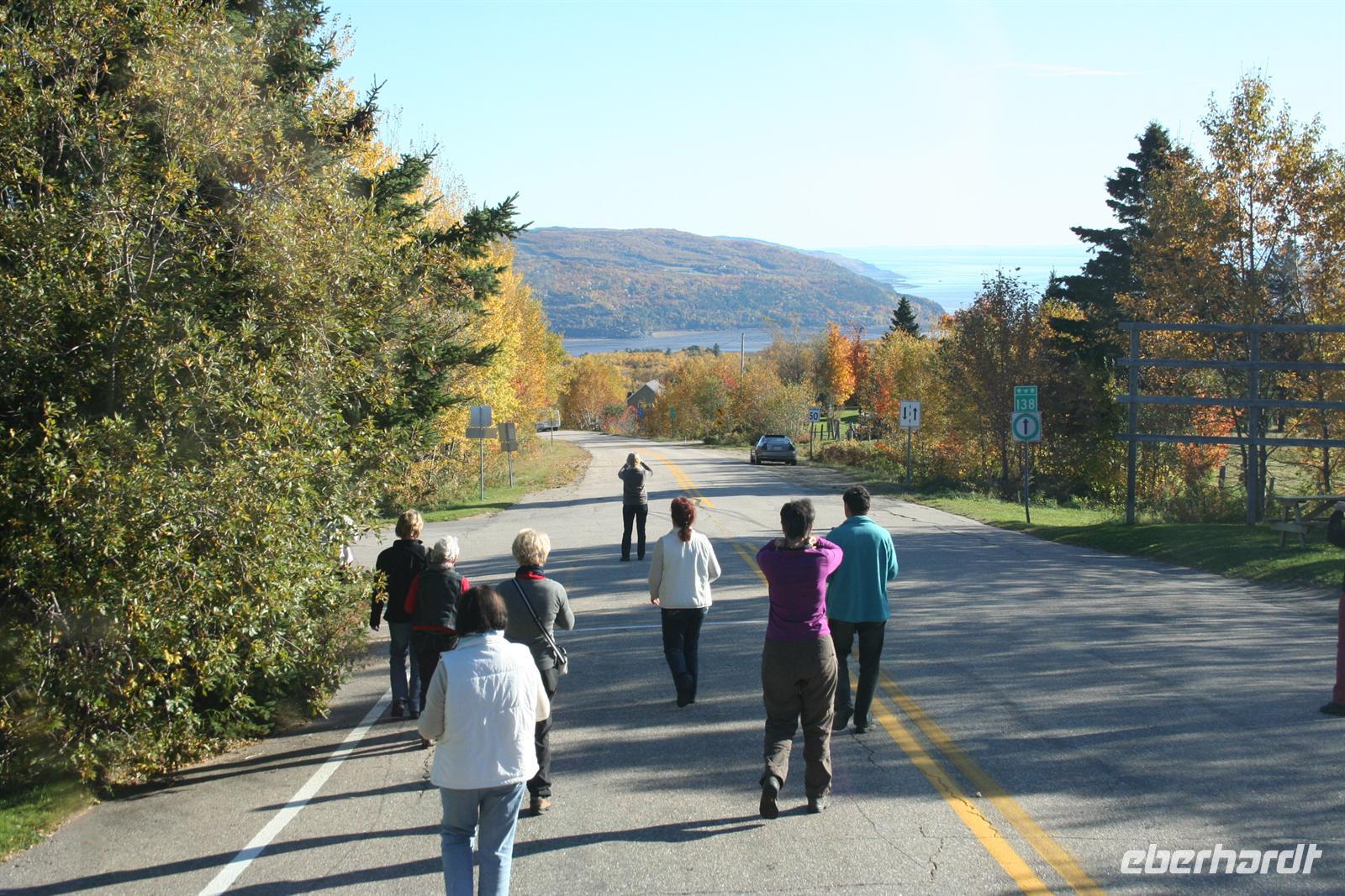 8.00 Uhr Abfahrt von Quebec in Richtung La Malbaie. Wir sehen unterwegs wieder wunderschöne Laubfärbungen. Um 9.30 Uhr legen wir eine Pause an einem Informationszentrum ein, von wo man auch eine schöne Aussicht auf die Bucht von La Malbaie hat. Dann stimmt unser Fahrer Remy zu, mit uns eine alternative Route entlang der Küste des St. Lorenz Stromes zu fahren, anstatt weiter auf der Autobahn. So sehen wir noch einmal kleine Dörfer und Buchten sowie die Farben des Indian Summer. Um 11.30 Uhr legen wir einen Fotostopp an einem idyllischen See ein. Als Überraschung schenken wir einen kleinen kanadischen Whisky aus. Er ist eher mild und schmeckt uns allen gut. Wir bedanken uns bei Remy mit einem kräftigen Applaus für seine tollen Fahrkünste auf der schmalen Strecke. Wir kommen um 12.30 Uhr in St. Catherine Bay an. Hier ist die Abfahrtsstelle unserer Bootstour. Hier gibt es Toiletten und einen kleinen Souvenirshop. Unser Bus fährt weiter nach Tadoussac, wo er uns nach 3 Stunden Bootstour wieder abholt. Wir nehmen also unsere warmen Sachen und alles was wir sonst die nächsten Stunden brauchen mit. Um 13.30 Uhr kommt unser kleines Schiff und wir starten 13.45 Uhr unsere Walbeobachtungstour auf dem St.Lorenz Strom. Wir fahren aus der Bucht des Saguenay-Flusses heraus auf den St. Lorenz, wo sich warmes Süßwasser (oben) und kaltes Atlantikwasser (unten) mischen. Hier gibt es besonders viel Nahrung für die Wale. Buckelwale gibt es nur bis Ende September hier zu sehen, sie sind schon in wärmere Gewässer gezogen. Mink-Wale und die weißen Beluga-Wale leben hier dagegen das ganze Jahr über. Diese beiden Arten sehen wir von Weitem bei unserer Bootsfahrt. Wir sehen auch mehrere Finn-Wale, die man an den hohen Fontänen erkennt, die sie ausblasen. Es ist nach dem Blauwal, den man hier auch manchmal sieht, die zweitgrößte Walart. Auf dem Boot erklärt eine Sprecherin die verschiedenen Walarten und die Sichtungspunkte nach dem Uhrzeigerprinzip (z. B. Minkwal auf ein Uhr) in Französisch und Englisch. Die Schiffe sind relativ groß für etwa 100 Personen. Man kann auf 2 verschiedenen Decks stehen oder sich in der Bar bei einem Kaffee (2,25 CAD) aufwärmen und die Wale von drinnen beobachten. Toiletten gibt es an der Anfahrtsstelle und auch auf dem Schiff. Wir haben sehr schönes Wetter und flache See ohne Wellengang. Trotz der guten Temperaturen von 15 bis 20 °C ist es recht kühl durch den Seewind. Man sollte sich unbedingt warm und windgeschützt anziehen sowie Mütze und Handschuhe dabei haben. Wir waren gut vorbereitet. Nach etwa 2,5 Stunden erfolgreicher Walbeobachtung fahren wir zurück zum Hafen und von dort ein weiteres Stück die Küste entlang bis nach Tadoussa, den nördlichsten Punkt unserer Ostkanada-Reise. Hier gehen wir an Land und steigen wieder in unseren Bus. In Tadoussac machen wir einen kurzen Fotostopp an der ältesten kleinen Holzkirche Nordamerikas gleich gegenüber dem historischen Hotelkomplex, für das der kleine Ort ebenfalls bekannt ist. Mit einer Fähre setzen wir mit dem Bus über die Bucht von Tadoussac an das andere Ufer über. Von Tadoussac fahren wir nun etwa 1,5 Stunden mit dem Bus zurück bis La Malbaie, unserem heutigen Übernachtungsort direkt am St. Lorenz Strom. Um 18.15 Uhr kommen wir am Hotel „Le Petit Manoir du Casino“ an. Die Zimmer sind sehr groß und wieder mit einer kleinen Küche ausgestattet. Es gibt sogar einen künstlichen Kamin und einen Whirlpool in den Zimmern. TV, Telefon, Radiowecker, Föhn, Kosmetik, Klimaanlage und Bügeleisen gehören wie üblich hier wieder zur Ausstattung. Der Frühstücksraum befindet sich im Erdgeschoss, genauso wie ein Aufenthaltsraum mit Internetecke und Wellness-Bereich mit Whirlpools. Um 18.45 Uhr treffen wir uns alle, um zum Abendessen in einem benachbarten Hotel zu gehen. Zum Abendessen gibt es ein 4-Gang-Menü mit Vorspeise, Suppe, Hauptgericht (Lachs, Steak, Hähnchen oder Meeresfrüchte) und Dessert mit Kaffee. Der Service spricht kaum Englisch, ist aber sonst sehr freundlich. Es dauert nur alles ein wenig lang, was wir bisher nicht von den Kanadiern gewöhnt sind. Das Essen ist sehr gut. Wir sind erst gegen 21.15 Uhr fertig mit dem Dessert und dem Bezahlen der Getränke, dann laufen wir zurück zu unserem Hotel. Von der vielen Seeluft sind wir heute alle ziemlich müde. Gute Nacht! Dienstag, 11.10.2011