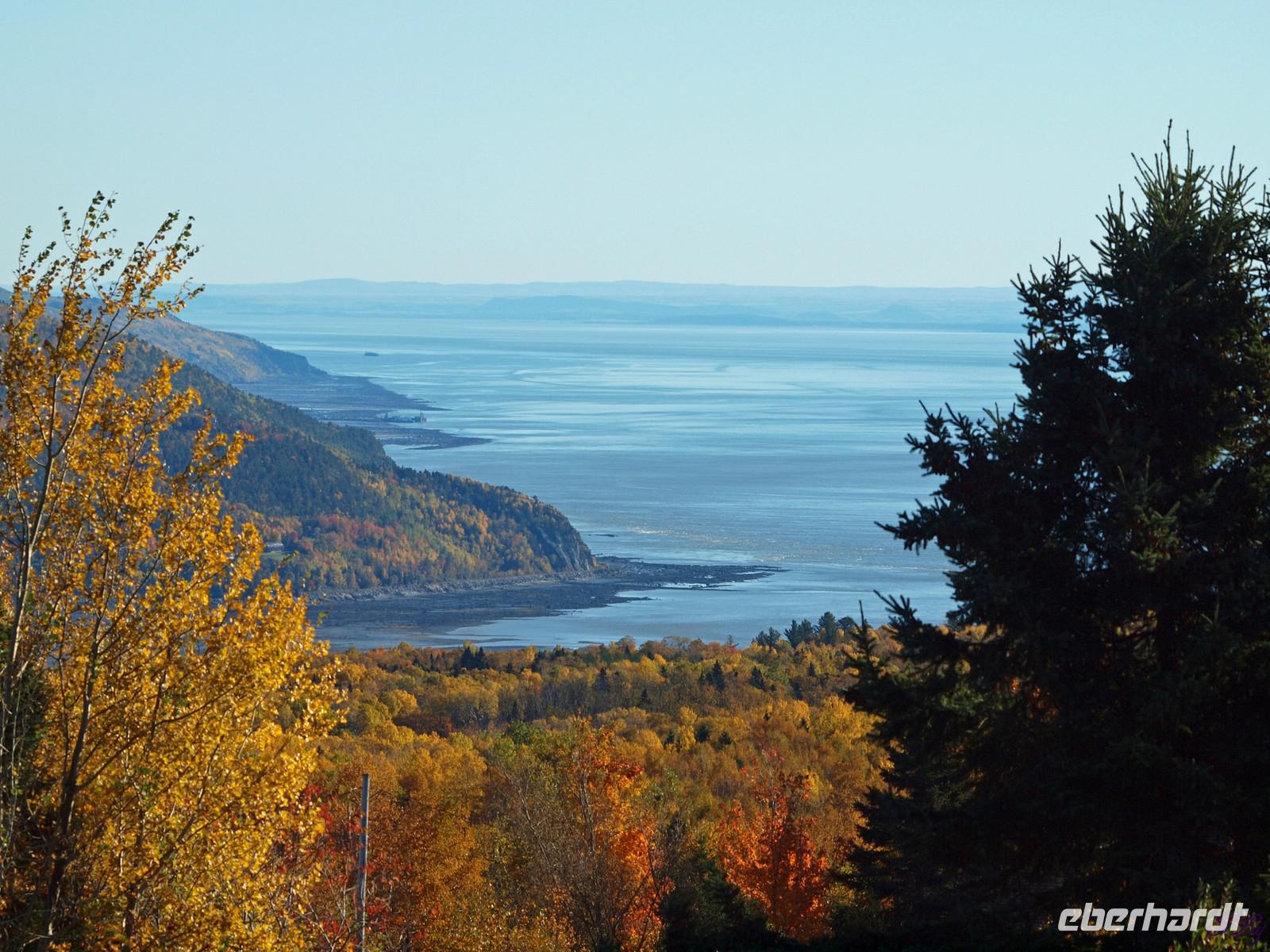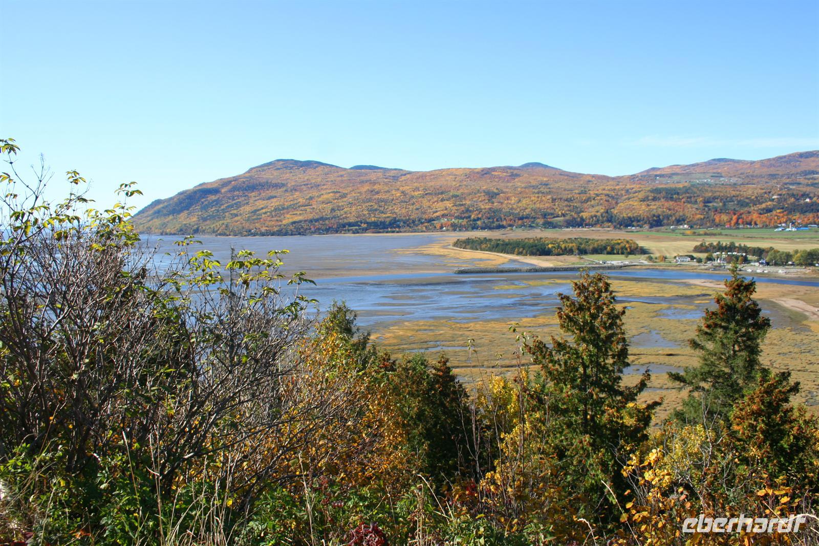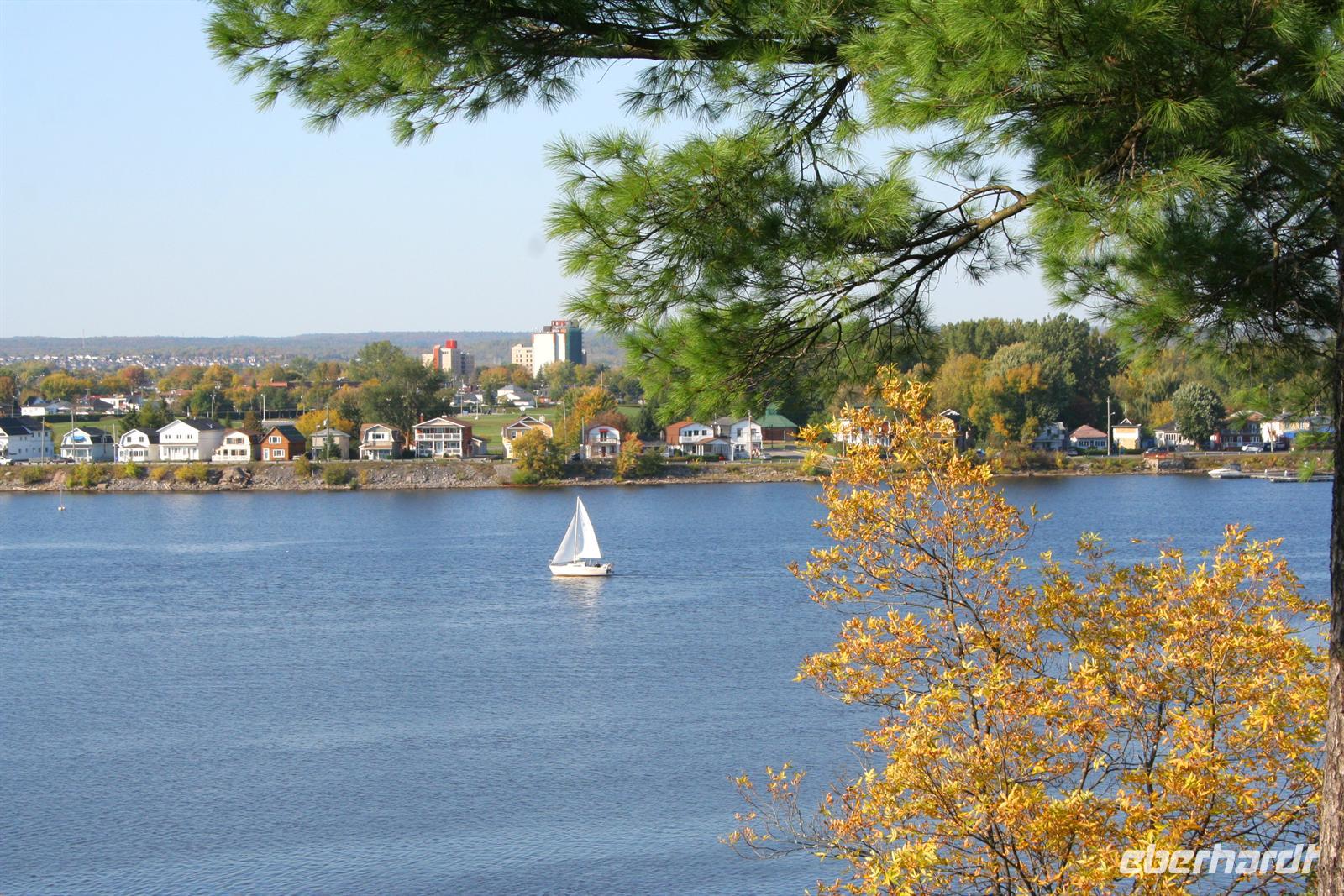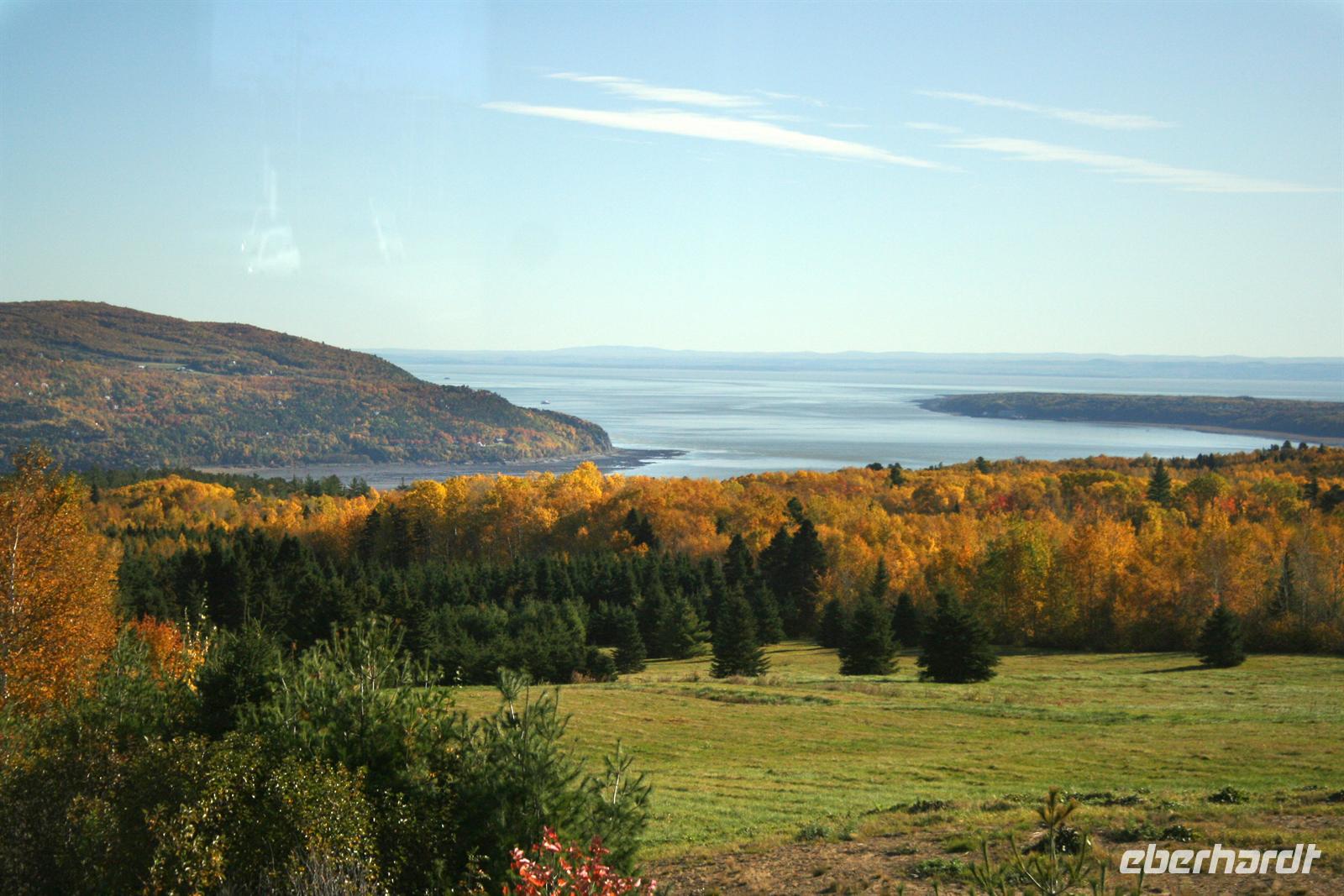 8.00 Uhr Abfahrt von Quebec in Richtung La Malbaie. Wir sehen unterwegs wieder wunderschöne Laubfärbungen. Um 9.30 Uhr legen wir eine Pause an einem Informationszentrum ein, von wo man auch eine schöne Aussicht auf die Bucht von La Malbaie hat. Dann stimmt unser Fahrer Remy zu, mit uns eine alternative Route entlang der Küste des St. Lorenz Stromes zu fahren, anstatt weiter auf der Autobahn. So sehen wir noch einmal kleine Dörfer und Buchten sowie die Farben des Indian Summer. Um 11.30 Uhr legen wir einen Fotostopp an einem idyllischen See ein. Als Überraschung schenken wir einen kleinen kanadischen Whisky aus. Er ist eher mild und schmeckt uns allen gut. Wir bedanken uns bei Remy mit einem kräftigen Applaus für seine tollen Fahrkünste auf der schmalen Strecke. Wir kommen um 12.30 Uhr in St. Catherine Bay an. Hier ist die Abfahrtsstelle unserer Bootstour. Hier gibt es Toiletten und einen kleinen Souvenirshop. Unser Bus fährt weiter nach Tadoussac, wo er uns nach 3 Stunden Bootstour wieder abholt. Wir nehmen also unsere warmen Sachen und alles was wir sonst die nächsten Stunden brauchen mit. Um 13.30 Uhr kommt unser kleines Schiff und wir starten 13.45 Uhr unsere Walbeobachtungstour auf dem St.Lorenz Strom. Wir fahren aus der Bucht des Saguenay-Flusses heraus auf den St. Lorenz, wo sich warmes Süßwasser (oben) und kaltes Atlantikwasser (unten) mischen. Hier gibt es besonders viel Nahrung für die Wale. Buckelwale gibt es nur bis Ende September hier zu sehen, sie sind schon in wärmere Gewässer gezogen. Mink-Wale und die weißen Beluga-Wale leben hier dagegen das ganze Jahr über. Diese beiden Arten sehen wir von Weitem bei unserer Bootsfahrt. Wir sehen auch mehrere Finn-Wale, die man an den hohen Fontänen erkennt, die sie ausblasen. Es ist nach dem Blauwal, den man hier auch manchmal sieht, die zweitgrößte Walart. Auf dem Boot erklärt eine Sprecherin die verschiedenen Walarten und die Sichtungspunkte nach dem Uhrzeigerprinzip (z. B. Minkwal auf ein Uhr) in Französisch und Englisch. Die Schiffe sind relativ groß für etwa 100 Personen. Man kann auf 2 verschiedenen Decks stehen oder sich in der Bar bei einem Kaffee (2,25 CAD) aufwärmen und die Wale von drinnen beobachten. Toiletten gibt es an der Anfahrtsstelle und auch auf dem Schiff. Wir haben sehr schönes Wetter und flache See ohne Wellengang. Trotz der guten Temperaturen von 15 bis 20 °C ist es recht kühl durch den Seewind. Man sollte sich unbedingt warm und windgeschützt anziehen sowie Mütze und Handschuhe dabei haben. Wir waren gut vorbereitet. Nach etwa 2,5 Stunden erfolgreicher Walbeobachtung fahren wir zurück zum Hafen und von dort ein weiteres Stück die Küste entlang bis nach Tadoussa, den nördlichsten Punkt unserer Ostkanada-Reise. Hier gehen wir an Land und steigen wieder in unseren Bus. In Tadoussac machen wir einen kurzen Fotostopp an der ältesten kleinen Holzkirche Nordamerikas gleich gegenüber dem historischen Hotelkomplex, für das der kleine Ort ebenfalls bekannt ist. Mit einer Fähre setzen wir mit dem Bus über die Bucht von Tadoussac an das andere Ufer über. Von Tadoussac fahren wir nun etwa 1,5 Stunden mit dem Bus zurück bis La Malbaie, unserem heutigen Übernachtungsort direkt am St. Lorenz Strom. Um 18.15 Uhr kommen wir am Hotel „Le Petit Manoir du Casino“ an. Die Zimmer sind sehr groß und wieder mit einer kleinen Küche ausgestattet. Es gibt sogar einen künstlichen Kamin und einen Whirlpool in den Zimmern. TV, Telefon, Radiowecker, Föhn, Kosmetik, Klimaanlage und Bügeleisen gehören wie üblich hier wieder zur Ausstattung. Der Frühstücksraum befindet sich im Erdgeschoss, genauso wie ein Aufenthaltsraum mit Internetecke und Wellness-Bereich mit Whirlpools. Um 18.45 Uhr treffen wir uns alle, um zum Abendessen in einem benachbarten Hotel zu gehen. Zum Abendessen gibt es ein 4-Gang-Menü mit Vorspeise, Suppe, Hauptgericht (Lachs, Steak, Hähnchen oder Meeresfrüchte) und Dessert mit Kaffee. Der Service spricht kaum Englisch, ist aber sonst sehr freundlich. Es dauert nur alles ein wenig lang, was wir bisher nicht von den Kanadiern gewöhnt sind. Das Essen ist sehr gut. Wir sind erst gegen 21.15 Uhr fertig mit dem Dessert und dem Bezahlen der Getränke, dann laufen wir zurück zu unserem Hotel. Von der vielen Seeluft sind wir heute alle ziemlich müde. Gute Nacht! Dienstag, 11.10.2011