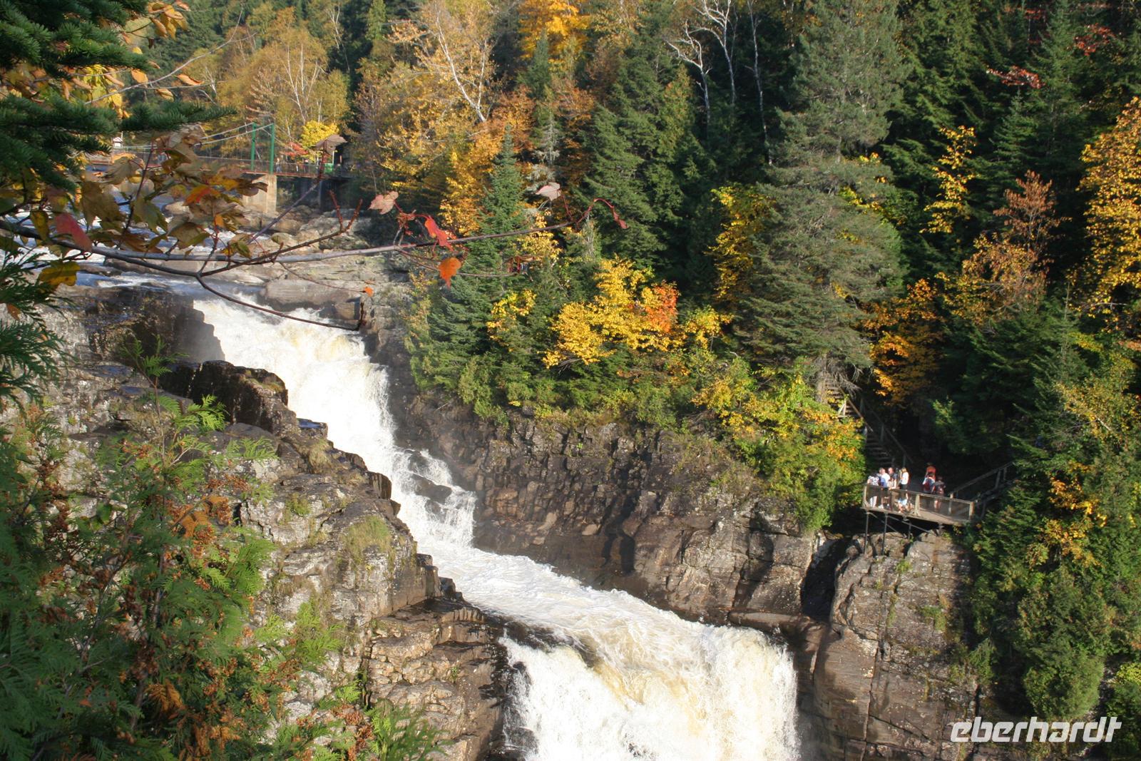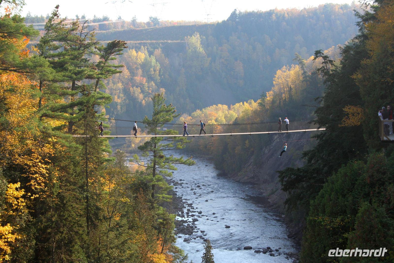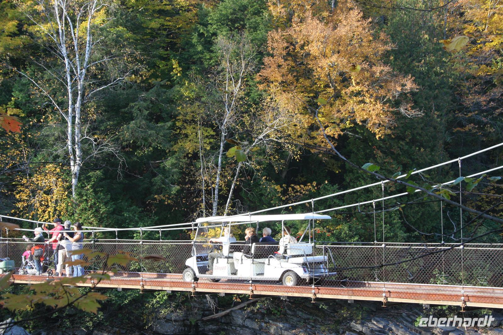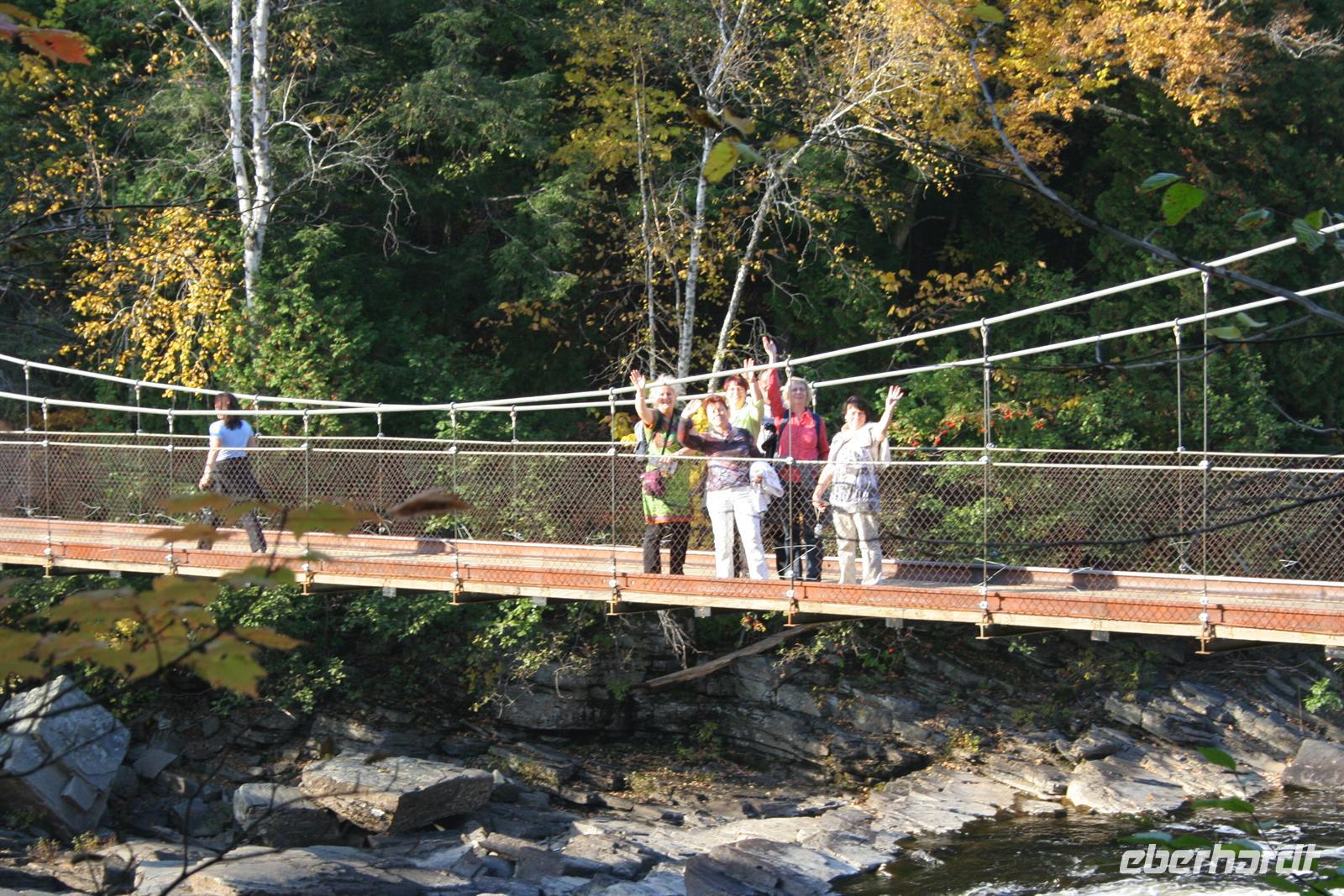 Dann geht es weiter zum Parlamentsgebäude von Quebec. Nadja erklärt einiges zur Geschichte, den Statuen und dem Brunnen vor dem Gebäude. Selbst den Indianern wurde hier ein Denkmal gesetzt. Wir müssen etwas warten, bis wir einen Parkplatz vorm Parlament bekommen, da einige Kreuzfahrt-Busse in der Stadt unterwegs sind. Anschließend fahren wir noch einmal in die Altstadt und bummeln durch die Gassen der Unterstadt. Nadja erläutert uns das riesige Wandgemälde, was die Geschichte Quebecs zusammenfasst. Nach der dreistündigen Stadtführung verabschieden wir uns von Nadja und haben nun noch zwei Stunden Freizeit in der Altstadt, die jeder selbst gestalten kann. Empfehlenswert ist natürlich ein Spaziergang in der Oberstadt rund um das Chateau Frontenac. Wer möchte, kann den Aufstieg über die sogenannte „Halsbrechertreppe“ antreten, wobei diese nicht so gefährlich ist, wie ihr Name klingt, oder man kann für ein paar Dollar die kleine Zahnradbahn nutzen. Das Wetter ist super und wir können schöne Fotos vom Chateau Frontenac und der Altstadt Quebecs machen. In der Nähe des Chateaus gibt es eine Touristeninformation, in der man Geld tauschen und am ATM Automaten mit Kreditkarte abheben kann. Auch Toiletten gibt es hier. Die kleine Kunsthandwerkergasse in der Oberstadt und die hübschen Souvenirläden und Cafés sind ebenfalls einen Besuch wert. Nach den zwei Stunden Freizeit treffen alle wieder am Bus ein und wir fahren hinaus aus der Stadt zu den Montmorency-Wasserfällen. Der große Wasserfall ist 84 Meter hoch und damit höher als die Niagara-Fälle. Wer möchte, kann auf einem Spazierweg bis an den Wasserfall heran gehen oder über Treppen nach oben steigen. In der Eingangshalle gibt es eine Cafeteria und Toiletten. Gegen 14.00 Uhr steigen wir wieder in unseren Bus und fahren etwa 1,5 Stunden zum St. Anne Canyon. Auch hier unternehmen wir einen Spaziergang zum Canyon und über große Hängebrücken über die Schlucht, durch die die Wassermassen unter uns toben. Für Gäste, die schlecht zu Fuß sind, kann man einen Buggy mit Fahrer haben, der sie über die erste Brücke und weiter den Rundweg entlang fährt. Am Eingang zum Park gibt es überlebensgroße Tierfiguren der heimischen Tiere. Hier machen wir das eine oder andere lustige Foto. Der Rundweg ist gut begehbar. Wer möchte, kann auch die vielen Stufen hinab zur dritten Brücke laufen und wieder hinauf. Eine Cafeteria und ein Souvenirshop sind am Eingang zu finden. Ich kaufe ein paar Tüten Ahorn-Bonbons und verteile sie im Bus an alle zur Einstimmung auf unser bevorstehendes Ahornsirup-Abendessen.