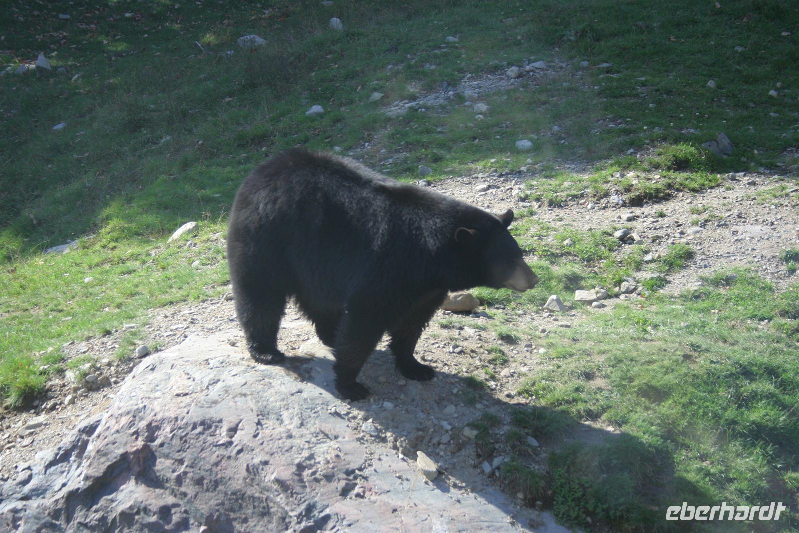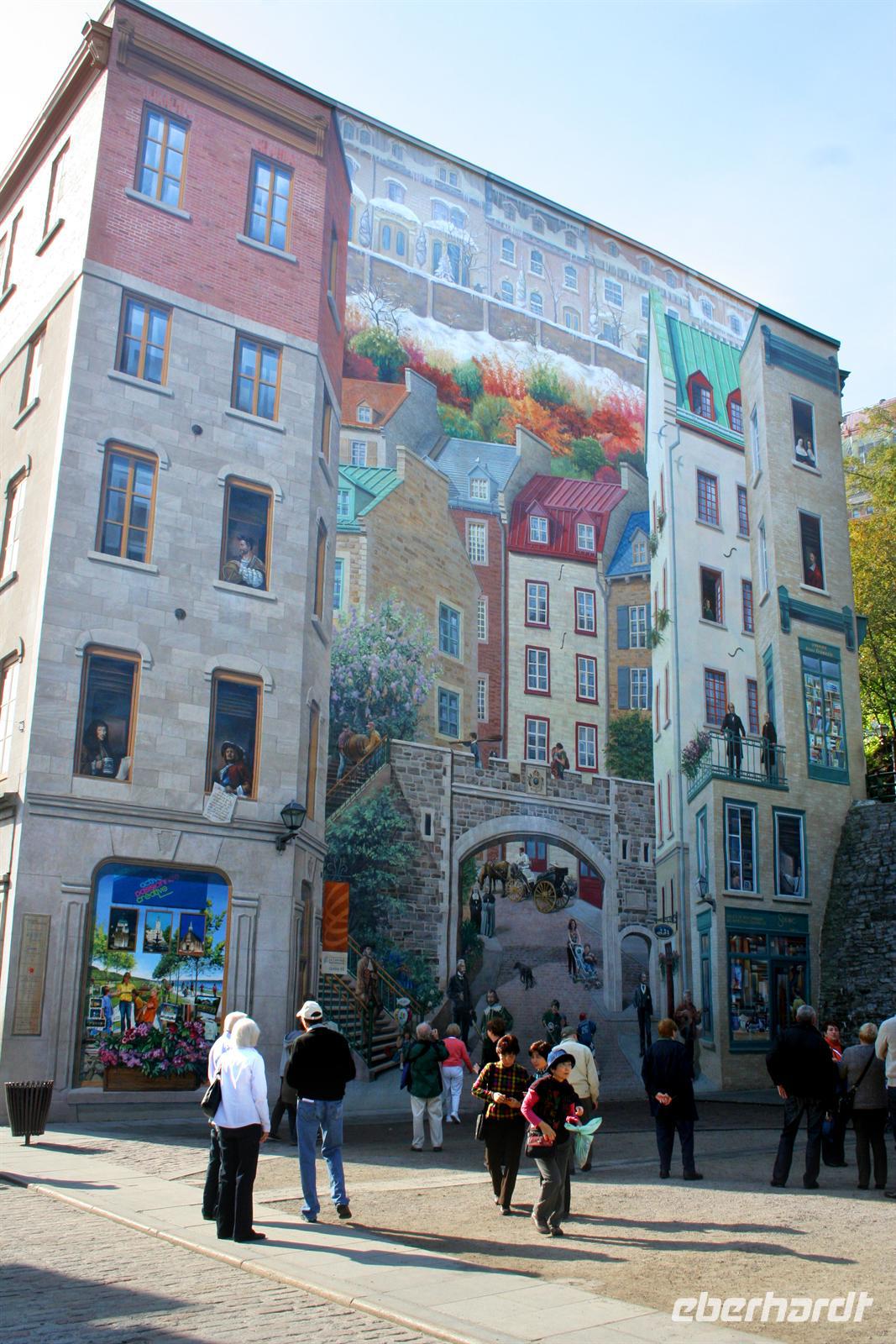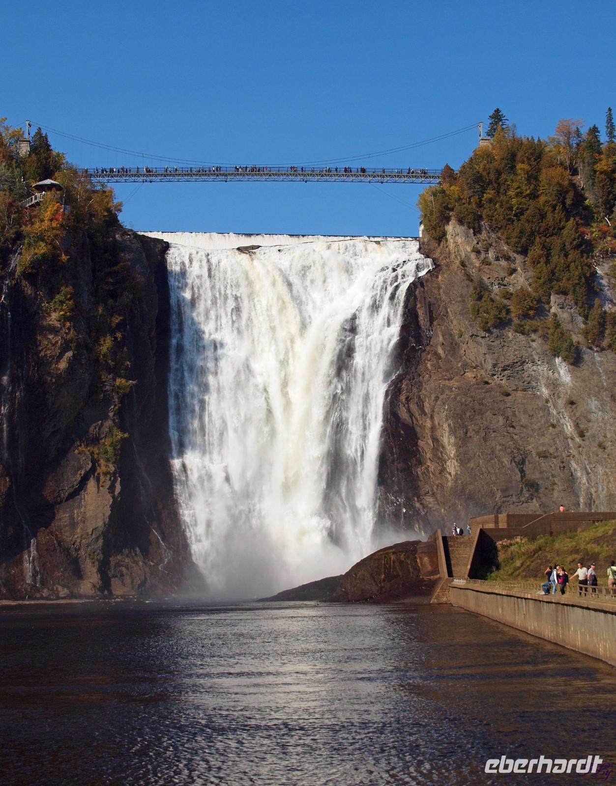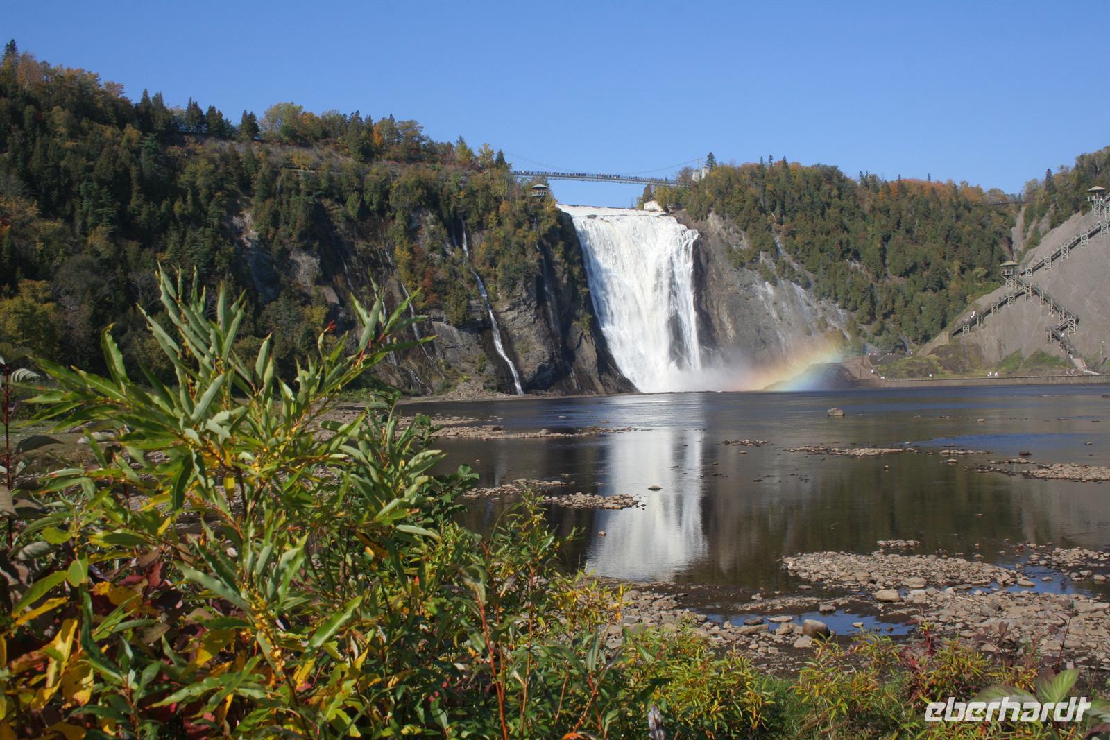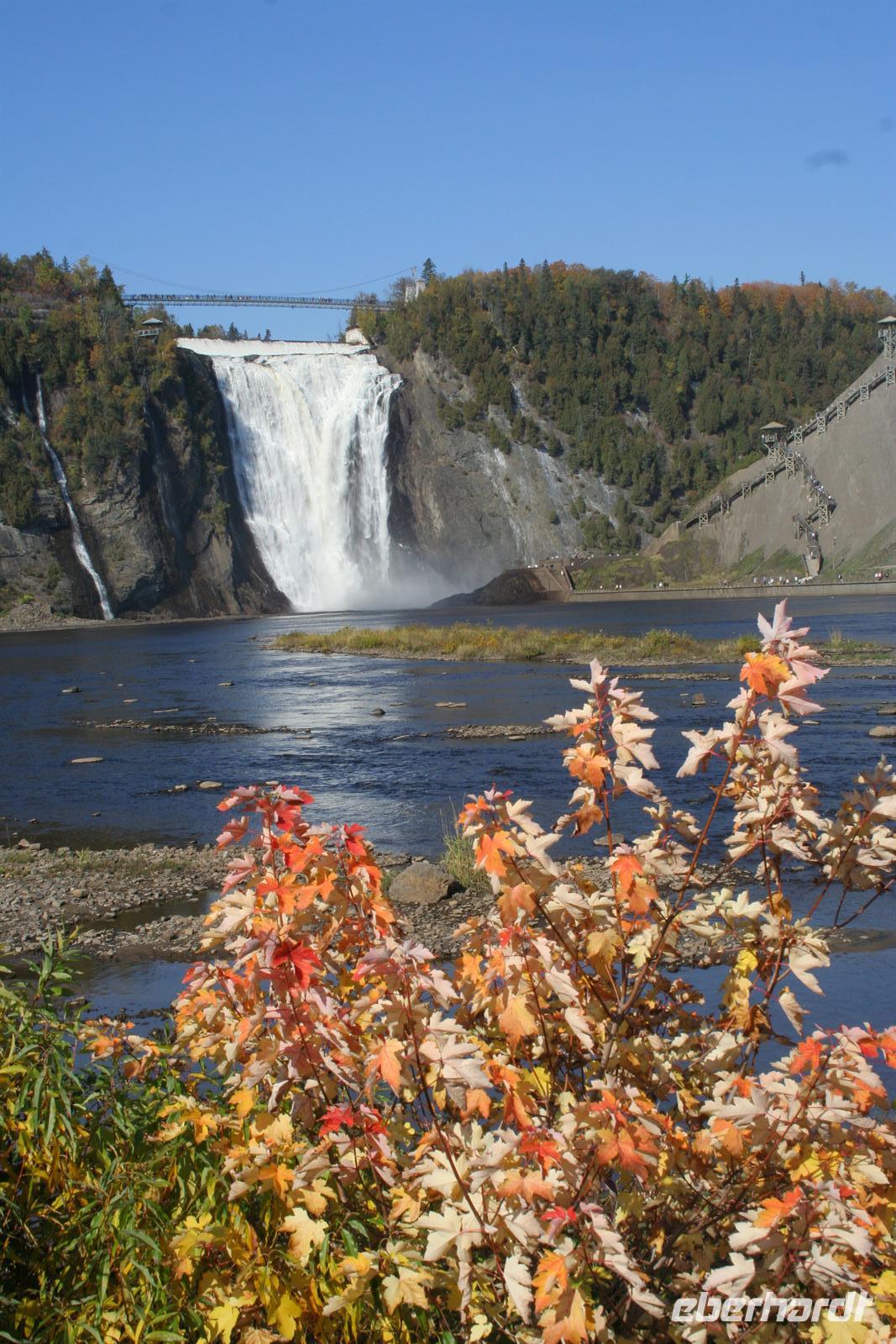 Dann geht es weiter zum Parlamentsgebäude von Quebec. Nadja erklärt einiges zur Geschichte, den Statuen und dem Brunnen vor dem Gebäude. Selbst den Indianern wurde hier ein Denkmal gesetzt. Wir müssen etwas warten, bis wir einen Parkplatz vorm Parlament bekommen, da einige Kreuzfahrt-Busse in der Stadt unterwegs sind. Anschließend fahren wir noch einmal in die Altstadt und bummeln durch die Gassen der Unterstadt. Nadja erläutert uns das riesige Wandgemälde, was die Geschichte Quebecs zusammenfasst. Nach der dreistündigen Stadtführung verabschieden wir uns von Nadja und haben nun noch zwei Stunden Freizeit in der Altstadt, die jeder selbst gestalten kann. Empfehlenswert ist natürlich ein Spaziergang in der Oberstadt rund um das Chateau Frontenac. Wer möchte, kann den Aufstieg über die sogenannte „Halsbrechertreppe“ antreten, wobei diese nicht so gefährlich ist, wie ihr Name klingt, oder man kann für ein paar Dollar die kleine Zahnradbahn nutzen. Das Wetter ist super und wir können schöne Fotos vom Chateau Frontenac und der Altstadt Quebecs machen. In der Nähe des Chateaus gibt es eine Touristeninformation, in der man Geld tauschen und am ATM Automaten mit Kreditkarte abheben kann. Auch Toiletten gibt es hier. Die kleine Kunsthandwerkergasse in der Oberstadt und die hübschen Souvenirläden und Cafés sind ebenfalls einen Besuch wert. Nach den zwei Stunden Freizeit treffen alle wieder am Bus ein und wir fahren hinaus aus der Stadt zu den Montmorency-Wasserfällen. Der große Wasserfall ist 84 Meter hoch und damit höher als die Niagara-Fälle. Wer möchte, kann auf einem Spazierweg bis an den Wasserfall heran gehen oder über Treppen nach oben steigen. In der Eingangshalle gibt es eine Cafeteria und Toiletten. Gegen 14.00 Uhr steigen wir wieder in unseren Bus und fahren etwa 1,5 Stunden zum St. Anne Canyon. Auch hier unternehmen wir einen Spaziergang zum Canyon und über große Hängebrücken über die Schlucht, durch die die Wassermassen unter uns toben. Für Gäste, die schlecht zu Fuß sind, kann man einen Buggy mit Fahrer haben, der sie über die erste Brücke und weiter den Rundweg entlang fährt. Am Eingang zum Park gibt es überlebensgroße Tierfiguren der heimischen Tiere. Hier machen wir das eine oder andere lustige Foto. Der Rundweg ist gut begehbar. Wer möchte, kann auch die vielen Stufen hinab zur dritten Brücke laufen und wieder hinauf. Eine Cafeteria und ein Souvenirshop sind am Eingang zu finden. Ich kaufe ein paar Tüten Ahorn-Bonbons und verteile sie im Bus an alle zur Einstimmung auf unser bevorstehendes Ahornsirup-Abendessen.