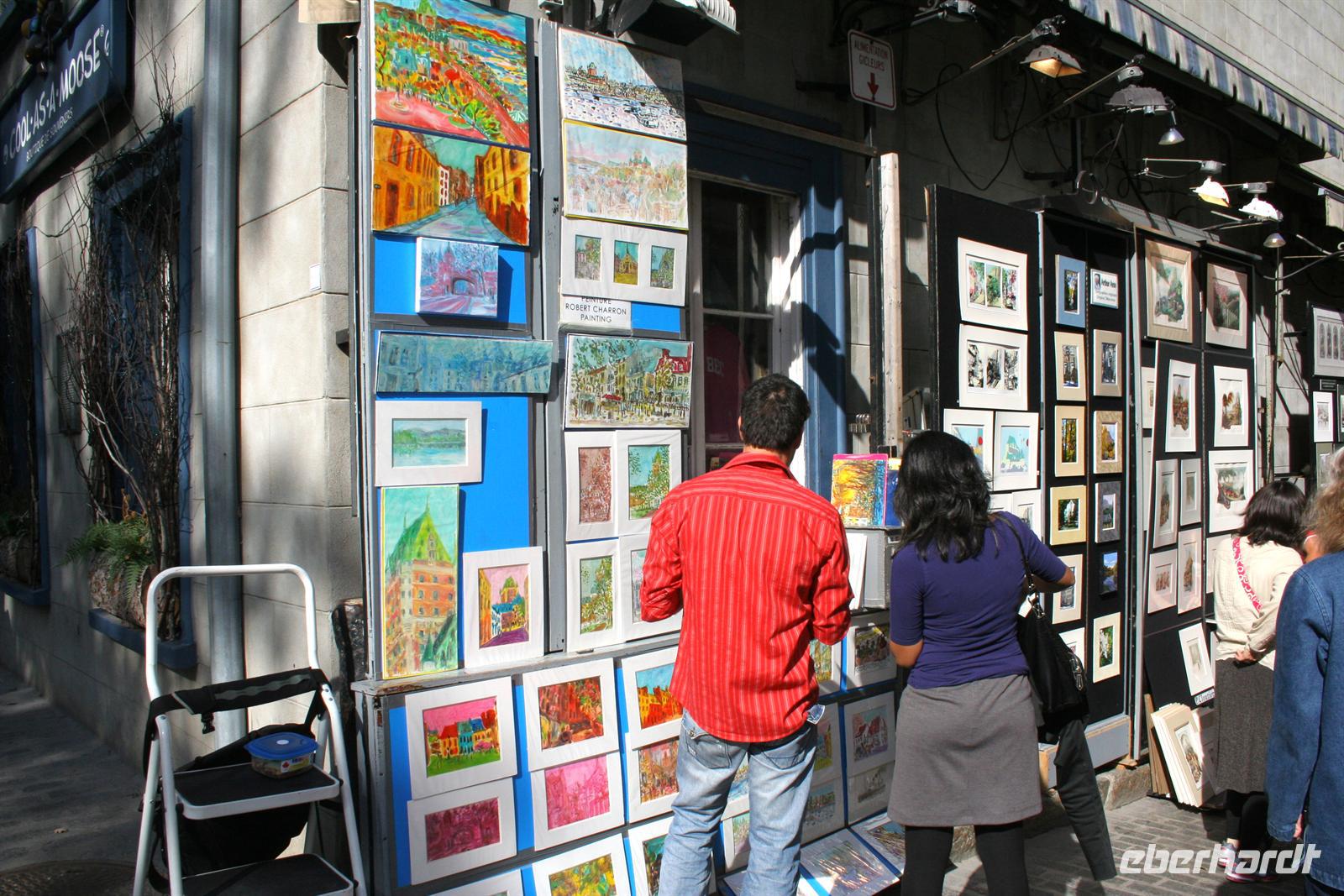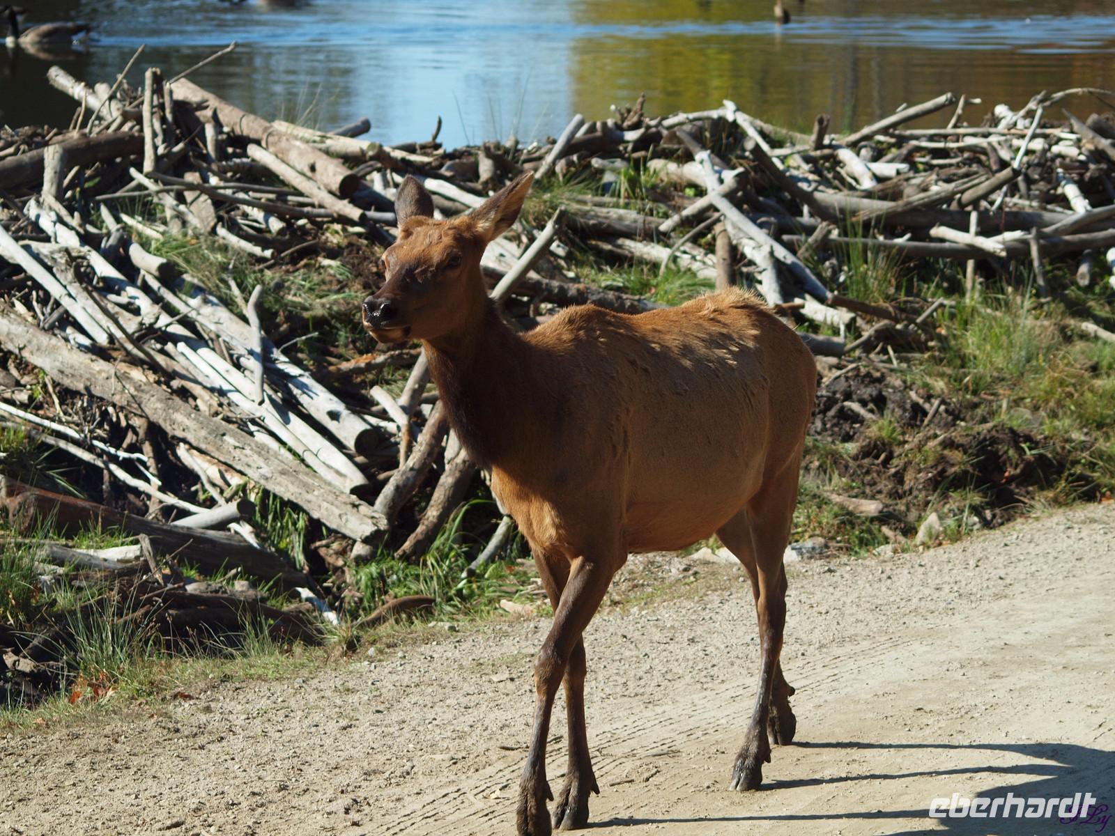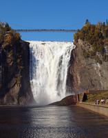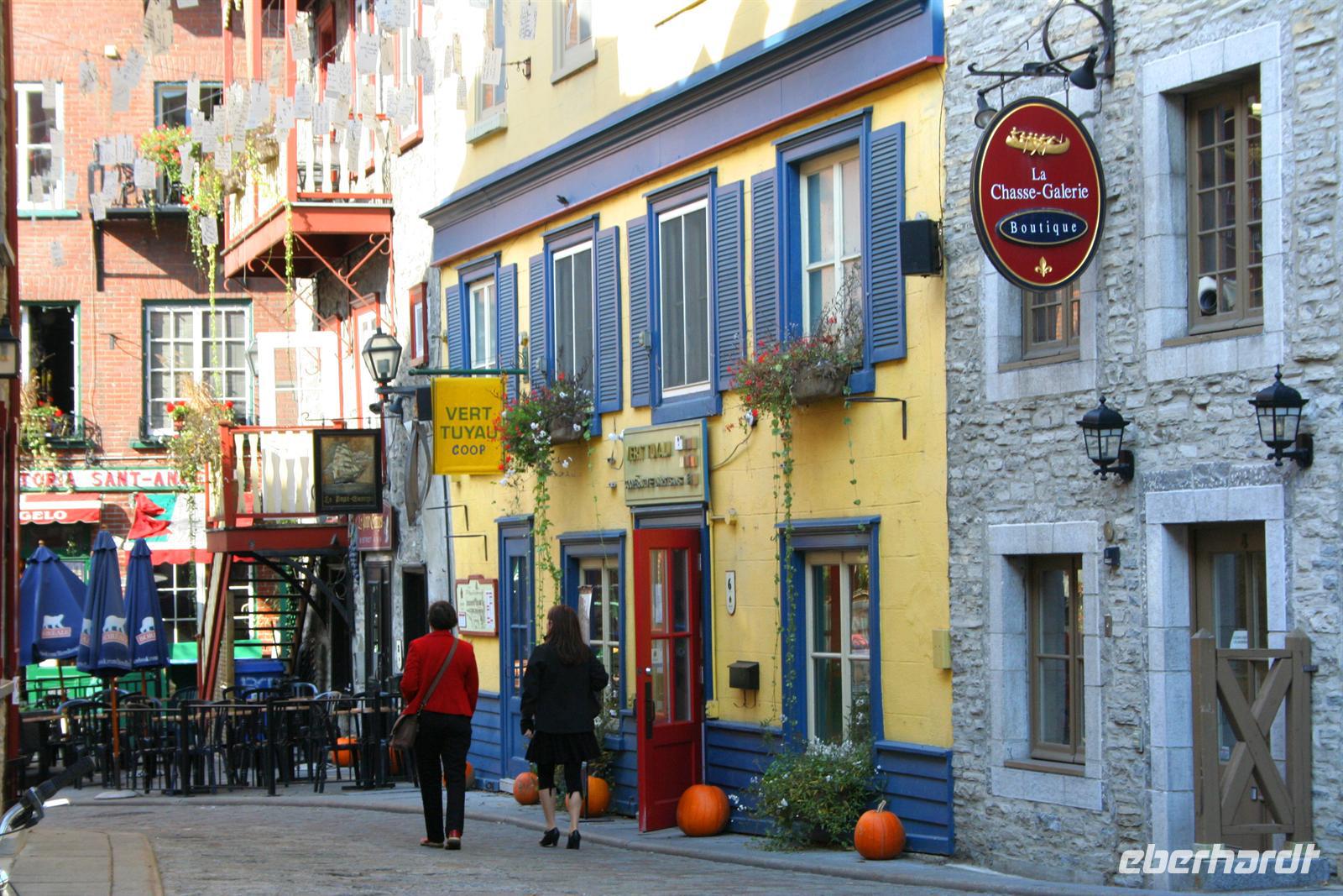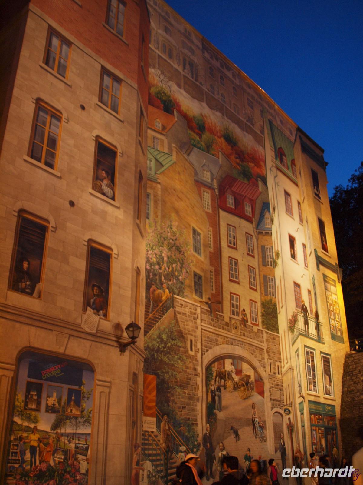 Dann geht es weiter zum Parlamentsgebäude von Quebec. Nadja erklärt einiges zur Geschichte, den Statuen und dem Brunnen vor dem Gebäude. Selbst den Indianern wurde hier ein Denkmal gesetzt. Wir müssen etwas warten, bis wir einen Parkplatz vorm Parlament bekommen, da einige Kreuzfahrt-Busse in der Stadt unterwegs sind. Anschließend fahren wir noch einmal in die Altstadt und bummeln durch die Gassen der Unterstadt. Nadja erläutert uns das riesige Wandgemälde, was die Geschichte Quebecs zusammenfasst. Nach der dreistündigen Stadtführung verabschieden wir uns von Nadja und haben nun noch zwei Stunden Freizeit in der Altstadt, die jeder selbst gestalten kann. Empfehlenswert ist natürlich ein Spaziergang in der Oberstadt rund um das Chateau Frontenac. Wer möchte, kann den Aufstieg über die sogenannte „Halsbrechertreppe“ antreten, wobei diese nicht so gefährlich ist, wie ihr Name klingt, oder man kann für ein paar Dollar die kleine Zahnradbahn nutzen. Das Wetter ist super und wir können schöne Fotos vom Chateau Frontenac und der Altstadt Quebecs machen. In der Nähe des Chateaus gibt es eine Touristeninformation, in der man Geld tauschen und am ATM Automaten mit Kreditkarte abheben kann. Auch Toiletten gibt es hier. Die kleine Kunsthandwerkergasse in der Oberstadt und die hübschen Souvenirläden und Cafés sind ebenfalls einen Besuch wert. Nach den zwei Stunden Freizeit treffen alle wieder am Bus ein und wir fahren hinaus aus der Stadt zu den Montmorency-Wasserfällen. Der große Wasserfall ist 84 Meter hoch und damit höher als die Niagara-Fälle. Wer möchte, kann auf einem Spazierweg bis an den Wasserfall heran gehen oder über Treppen nach oben steigen. In der Eingangshalle gibt es eine Cafeteria und Toiletten. Gegen 14.00 Uhr steigen wir wieder in unseren Bus und fahren etwa 1,5 Stunden zum St. Anne Canyon. Auch hier unternehmen wir einen Spaziergang zum Canyon und über große Hängebrücken über die Schlucht, durch die die Wassermassen unter uns toben. Für Gäste, die schlecht zu Fuß sind, kann man einen Buggy mit Fahrer haben, der sie über die erste Brücke und weiter den Rundweg entlang fährt. Am Eingang zum Park gibt es überlebensgroße Tierfiguren der heimischen Tiere. Hier machen wir das eine oder andere lustige Foto. Der Rundweg ist gut begehbar. Wer möchte, kann auch die vielen Stufen hinab zur dritten Brücke laufen und wieder hinauf. Eine Cafeteria und ein Souvenirshop sind am Eingang zu finden. Ich kaufe ein paar Tüten Ahorn-Bonbons und verteile sie im Bus an alle zur Einstimmung auf unser bevorstehendes Ahornsirup-Abendessen.