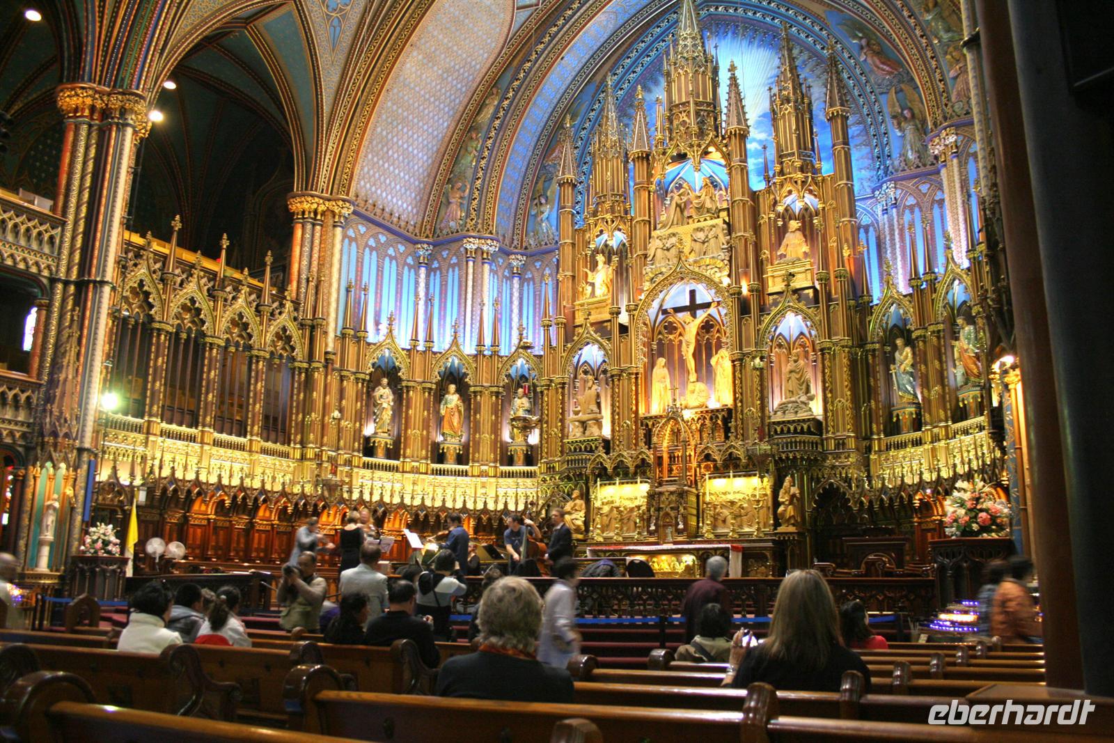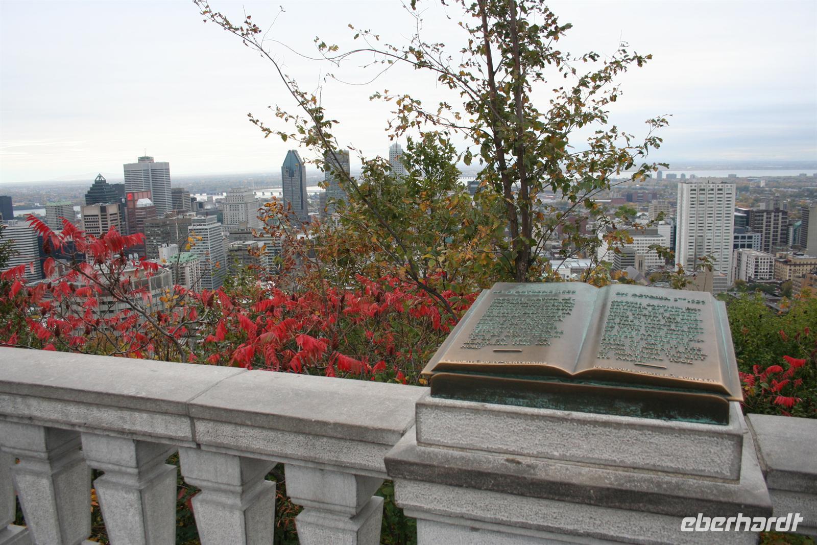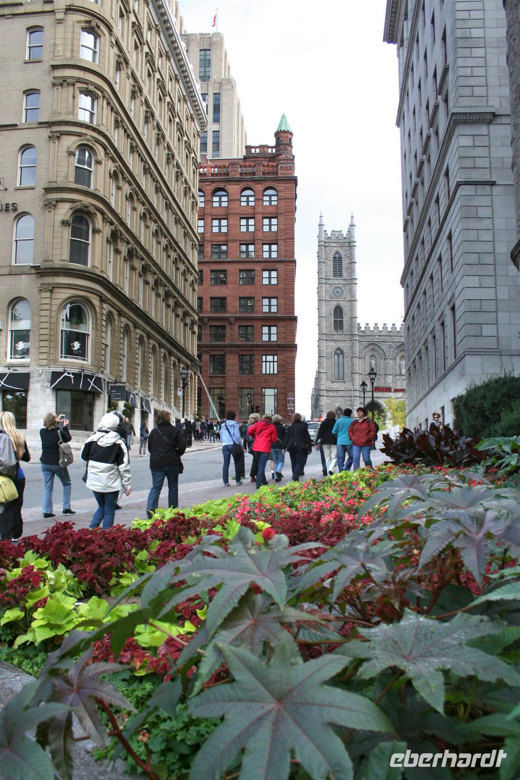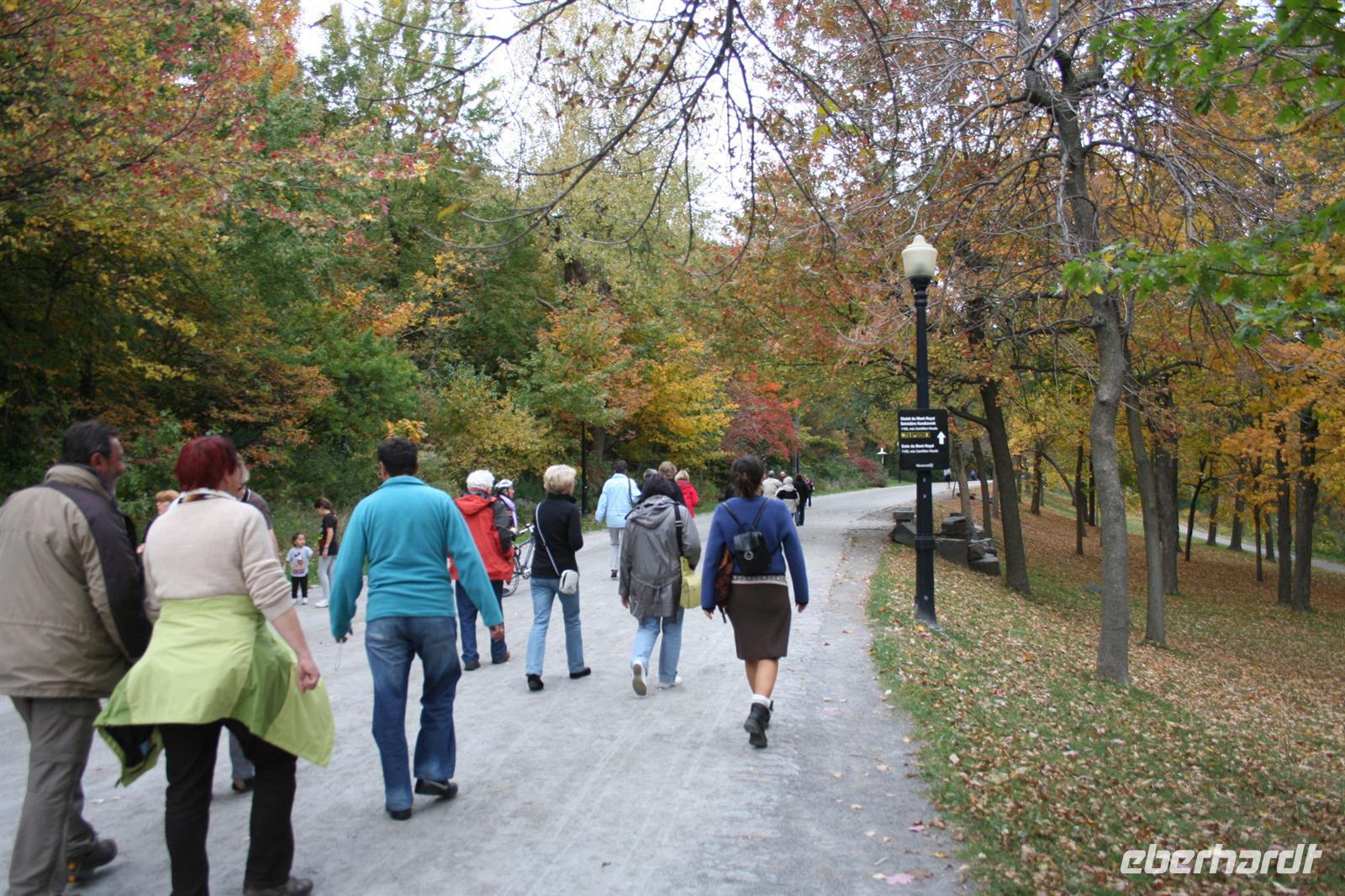 Um 9.00 Uhr fahren wir los in Richtung Montreal. Das Wetter hat sich etwas verschlechtert, es ist bewölkt und nieselt teilweise ein bisschen. Das macht uns aber nichts aus, denn wir sind ja den größten Teil im Bus. Die Fahrt dauert etwa 3 Stunden. Wir kommen um 12.00 Uhr in Montreal an. Unser erster Stopp ist am ehemaligen Olympiazentrum. Hier befindet sich auch das Naturkunde- und Umwelt-Schau, der „Biodome“ in der ehemaligen Radsporthalle. In der Innenstadt treffen wir um 12.30 Uhr unsere örtliche Stadtführerin Sylvia. Sie wird uns Montreal zeigen. Wir fahren auf die im St. Lorenz Strom gelegene Insel Sainte Helen. Hier sehen wir einige Pavillons der Weltausstellung Expo 1967 und die Formel Eins Rennstrecke für den Großen Preis von Kanada, auf der man direkt lang fahren kann. Wir machen einen Fotostopp an der Start-Ziel-Linie und einen, von dem wir einen guten Blick auf die Skyline von Montreal haben. Dann geht es zurück in die Innenstadt. Nächster Besichtigungspunkt ist die Basilika Notre Dame de Montreal, die wir auch von Innen besichtigen. Besonders schön sind die französischen Bleiglasfenster, die Orgel mit 7000 Pfeifen und die prachtvollen Holzschnitzereien, aus denen die Bänke, die Balustraden und der Altar bestehen. Auch die angeschlossene Kapelle Saint Sacrement ist wegen ihrer schönen Holz-Einrichtung sehr sehenswert. Neben der Kapelle, in der Basilika gibt es auch Toiletten. Zurück in der Innenstadt unternehmen wir noch einen Spaziergang durch die Unterstadt (Ville Souterraine). Bis zu 6 Stockwerke sind die unterirdischen Einkaufszentren hoch. In vielen Geschäften gibt es Rolltreppen hinunter in die unterirdischen Etagen. An der Christ Church fahren wir wieder nach oben ans Tageslicht. Hier verabschiedet sich unsere Stadtführerin Sylvia und ich gebe ihr im Bus im Namen der Gruppe 25 CAD Trinkgeld für die 3-stündige Stadtführung. Um 15.30 Uhr steigen wir wieder in den Bus und fahren hinauf zum Mount Royal, dem 232 Meter hohn Hausberg von Montreal. Wir unternehmen einen kleinen Spaziergang (ca. 15 Minuten) zur Aussichtsterrasse auf dem Mount Royal. Von hier haben wir einen weiten Blick über Montreal bis auf die andere Seite des St. Lorenz Stromes. Gegen 17.00 Uhr erreichen wir unser Hotel „Le Nouvel“ am Rene-Levesque-Boulevard in der Innenstadt. Nur eine Parallelstraße nördlich befindet sich die Haupteinkaufsstraße Rue Sainte-Catherine mit verschiedenen Rolltreppen in die Unterstadt. Die Metrostation Guy-Concordia ist auch nur 2 Straßen in nördlicher Richtung entfernt. Wir beziehen unsere Zimmer, die relativ groß sind und ausgestattet sind mit TV, Telefon, Radiowecker, Zimmersafe, Bügeleisen, Fön, Kosmetik, Kaffeemaschine und Klimaanlage. Bis zum Abendessen um 19.00 Uhr haben wir Freizeit. Das Abendessen ist im Hotelrestaurant. Es gibt ein 3-Gang-Menü mit Salat oder Suppe, Lachsfilet und Kuchen mit Kaffee. Das Restaurant ist sehr nüchtern eingerichtet und das Essen ist im Vergleich zu dem Essen in Lac Taureau nicht so gut (lauwarm und nicht so reichlich). Es ist ok, aber für den letzten Abend eben kein Highlight. Nur eine einzige Servicekraft bedient unsere ganze Gruppe. Der Service ist aber freundlich und spricht auch Englisch. Man kann in bar oder mit Kreditkarte bezahlen. Das Trinkgeld ist hier wieder bereits inkludiert. Wir bestellen den Weckruf für den nächsten Tag um 7.00 Uhr. Ab 9.00 Uhr stellt Brigitta ihr Zimmer zur Verfügung, um die Koffer darin abzustellen. Ich biete um 9.30 Uhr den Treffpunkt in der Lobby an, um mit mir in den Biodome Montreal zu fahren. Freitag, 14.10.2011