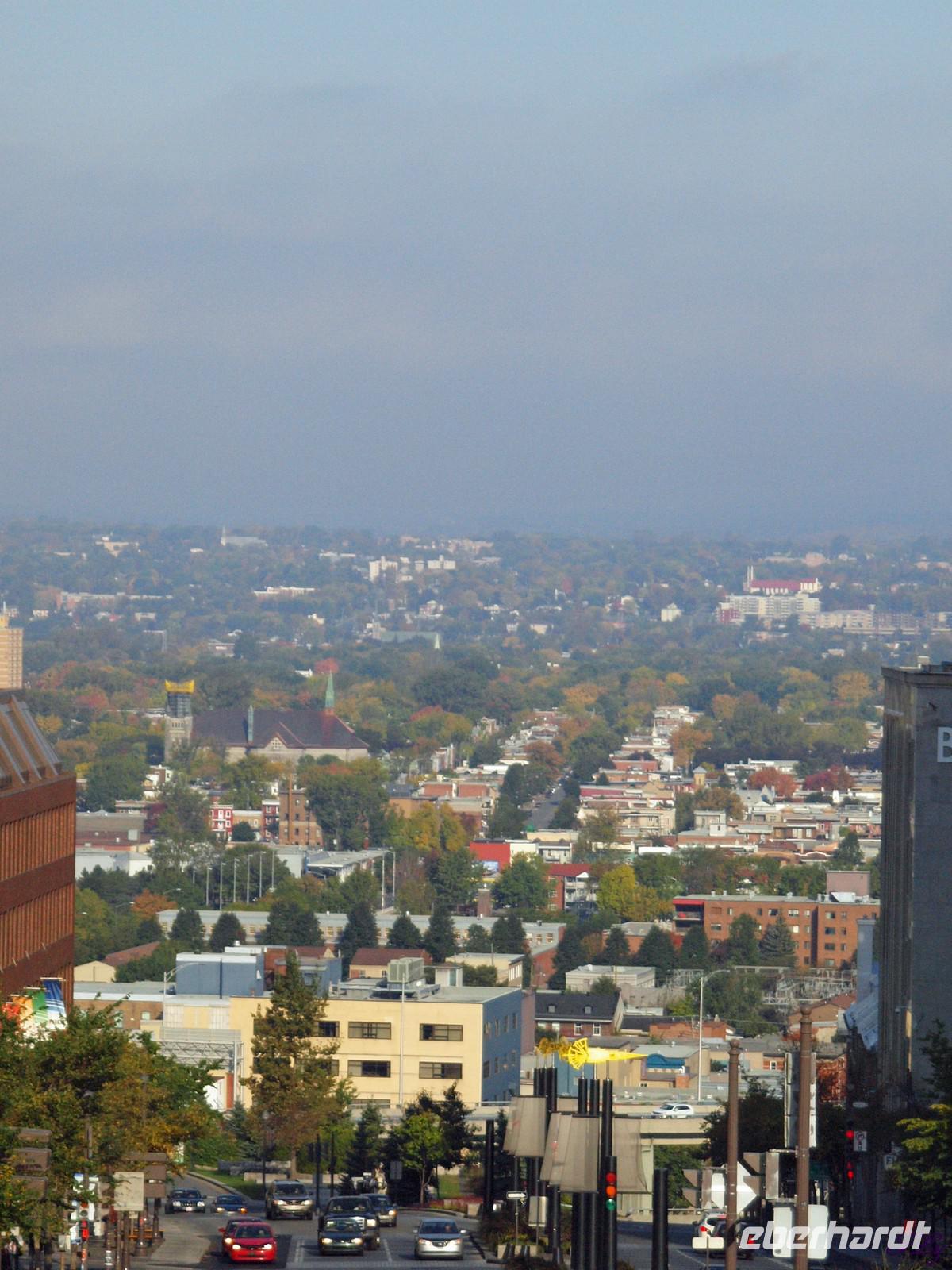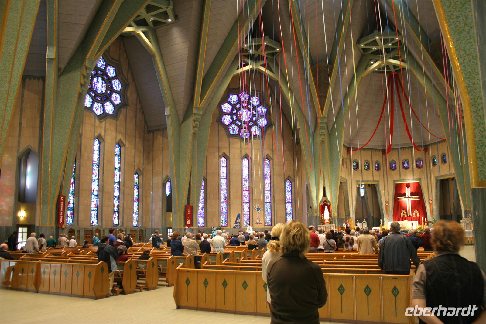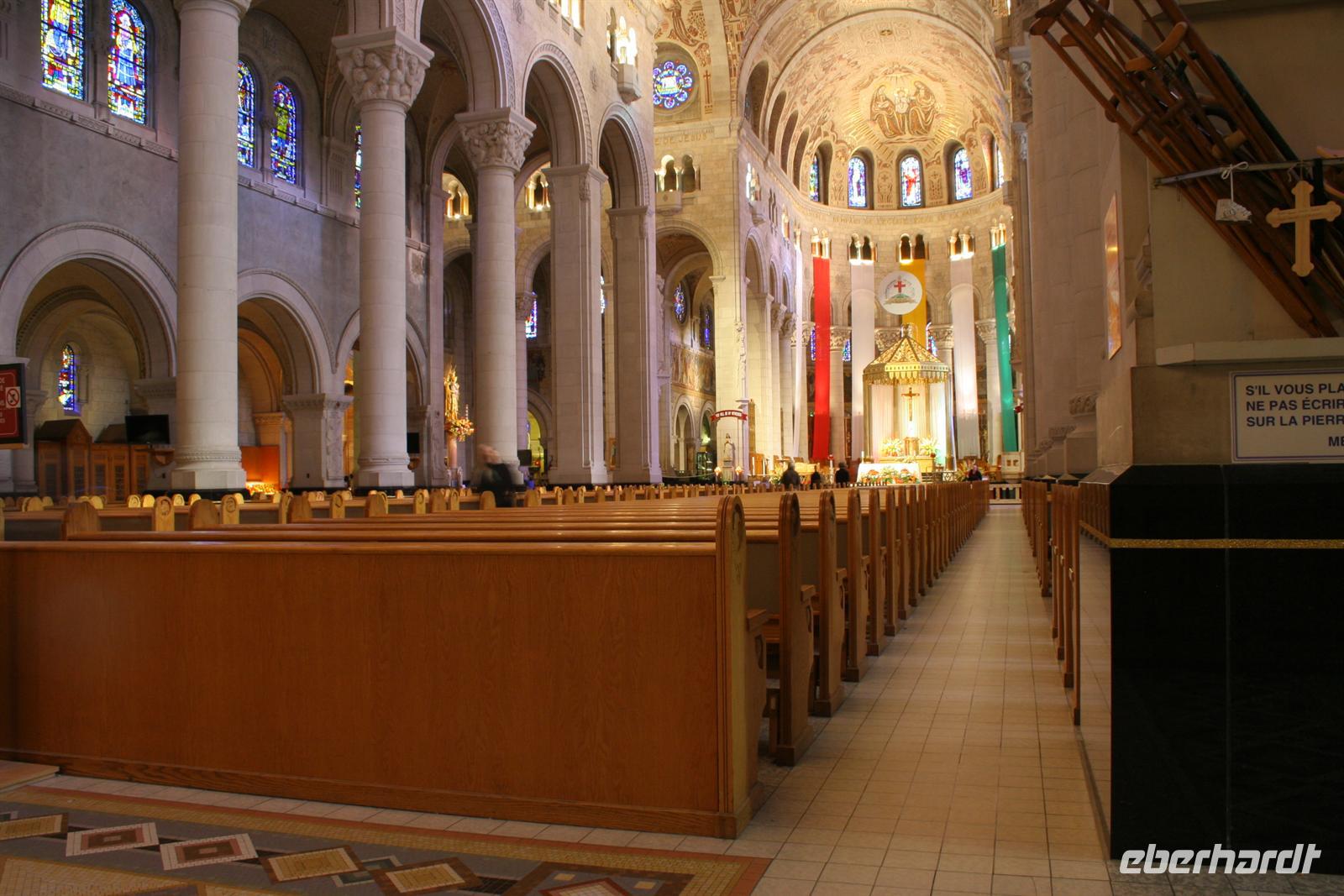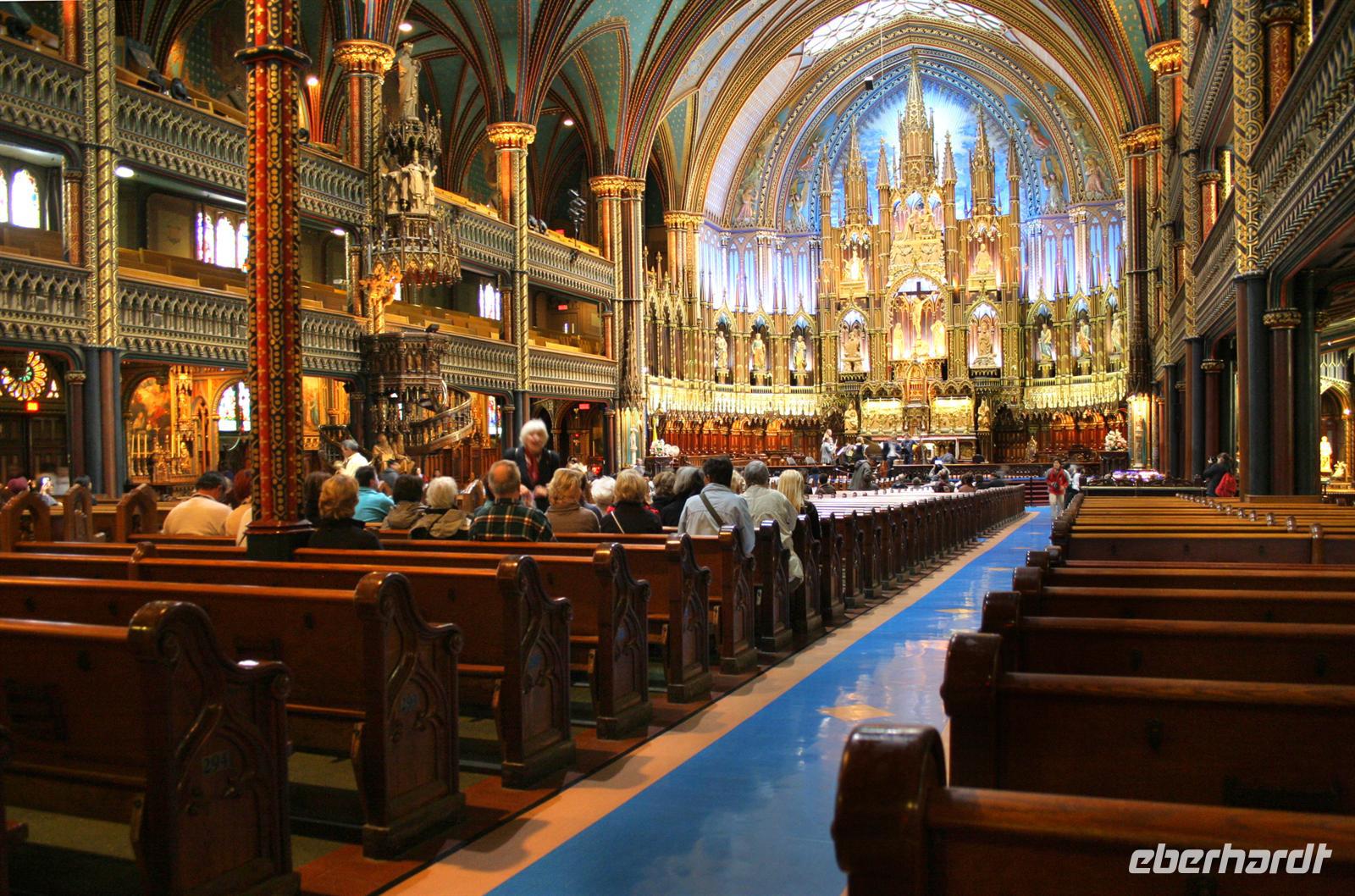 Um 9.00 Uhr fahren wir los in Richtung Montreal. Das Wetter hat sich etwas verschlechtert, es ist bewölkt und nieselt teilweise ein bisschen. Das macht uns aber nichts aus, denn wir sind ja den größten Teil im Bus. Die Fahrt dauert etwa 3 Stunden. Wir kommen um 12.00 Uhr in Montreal an. Unser erster Stopp ist am ehemaligen Olympiazentrum. Hier befindet sich auch das Naturkunde- und Umwelt-Schau, der „Biodome“ in der ehemaligen Radsporthalle. In der Innenstadt treffen wir um 12.30 Uhr unsere örtliche Stadtführerin Sylvia. Sie wird uns Montreal zeigen. Wir fahren auf die im St. Lorenz Strom gelegene Insel Sainte Helen. Hier sehen wir einige Pavillons der Weltausstellung Expo 1967 und die Formel Eins Rennstrecke für den Großen Preis von Kanada, auf der man direkt lang fahren kann. Wir machen einen Fotostopp an der Start-Ziel-Linie und einen, von dem wir einen guten Blick auf die Skyline von Montreal haben. Dann geht es zurück in die Innenstadt. Nächster Besichtigungspunkt ist die Basilika Notre Dame de Montreal, die wir auch von Innen besichtigen. Besonders schön sind die französischen Bleiglasfenster, die Orgel mit 7000 Pfeifen und die prachtvollen Holzschnitzereien, aus denen die Bänke, die Balustraden und der Altar bestehen. Auch die angeschlossene Kapelle Saint Sacrement ist wegen ihrer schönen Holz-Einrichtung sehr sehenswert. Neben der Kapelle, in der Basilika gibt es auch Toiletten. Zurück in der Innenstadt unternehmen wir noch einen Spaziergang durch die Unterstadt (Ville Souterraine). Bis zu 6 Stockwerke sind die unterirdischen Einkaufszentren hoch. In vielen Geschäften gibt es Rolltreppen hinunter in die unterirdischen Etagen. An der Christ Church fahren wir wieder nach oben ans Tageslicht. Hier verabschiedet sich unsere Stadtführerin Sylvia und ich gebe ihr im Bus im Namen der Gruppe 25 CAD Trinkgeld für die 3-stündige Stadtführung. Um 15.30 Uhr steigen wir wieder in den Bus und fahren hinauf zum Mount Royal, dem 232 Meter hohn Hausberg von Montreal. Wir unternehmen einen kleinen Spaziergang (ca. 15 Minuten) zur Aussichtsterrasse auf dem Mount Royal. Von hier haben wir einen weiten Blick über Montreal bis auf die andere Seite des St. Lorenz Stromes. Gegen 17.00 Uhr erreichen wir unser Hotel „Le Nouvel“ am Rene-Levesque-Boulevard in der Innenstadt. Nur eine Parallelstraße nördlich befindet sich die Haupteinkaufsstraße Rue Sainte-Catherine mit verschiedenen Rolltreppen in die Unterstadt. Die Metrostation Guy-Concordia ist auch nur 2 Straßen in nördlicher Richtung entfernt. Wir beziehen unsere Zimmer, die relativ groß sind und ausgestattet sind mit TV, Telefon, Radiowecker, Zimmersafe, Bügeleisen, Fön, Kosmetik, Kaffeemaschine und Klimaanlage. Bis zum Abendessen um 19.00 Uhr haben wir Freizeit. Das Abendessen ist im Hotelrestaurant. Es gibt ein 3-Gang-Menü mit Salat oder Suppe, Lachsfilet und Kuchen mit Kaffee. Das Restaurant ist sehr nüchtern eingerichtet und das Essen ist im Vergleich zu dem Essen in Lac Taureau nicht so gut (lauwarm und nicht so reichlich). Es ist ok, aber für den letzten Abend eben kein Highlight. Nur eine einzige Servicekraft bedient unsere ganze Gruppe. Der Service ist aber freundlich und spricht auch Englisch. Man kann in bar oder mit Kreditkarte bezahlen. Das Trinkgeld ist hier wieder bereits inkludiert. Wir bestellen den Weckruf für den nächsten Tag um 7.00 Uhr. Ab 9.00 Uhr stellt Brigitta ihr Zimmer zur Verfügung, um die Koffer darin abzustellen. Ich biete um 9.30 Uhr den Treffpunkt in der Lobby an, um mit mir in den Biodome Montreal zu fahren. Freitag, 14.10.2011