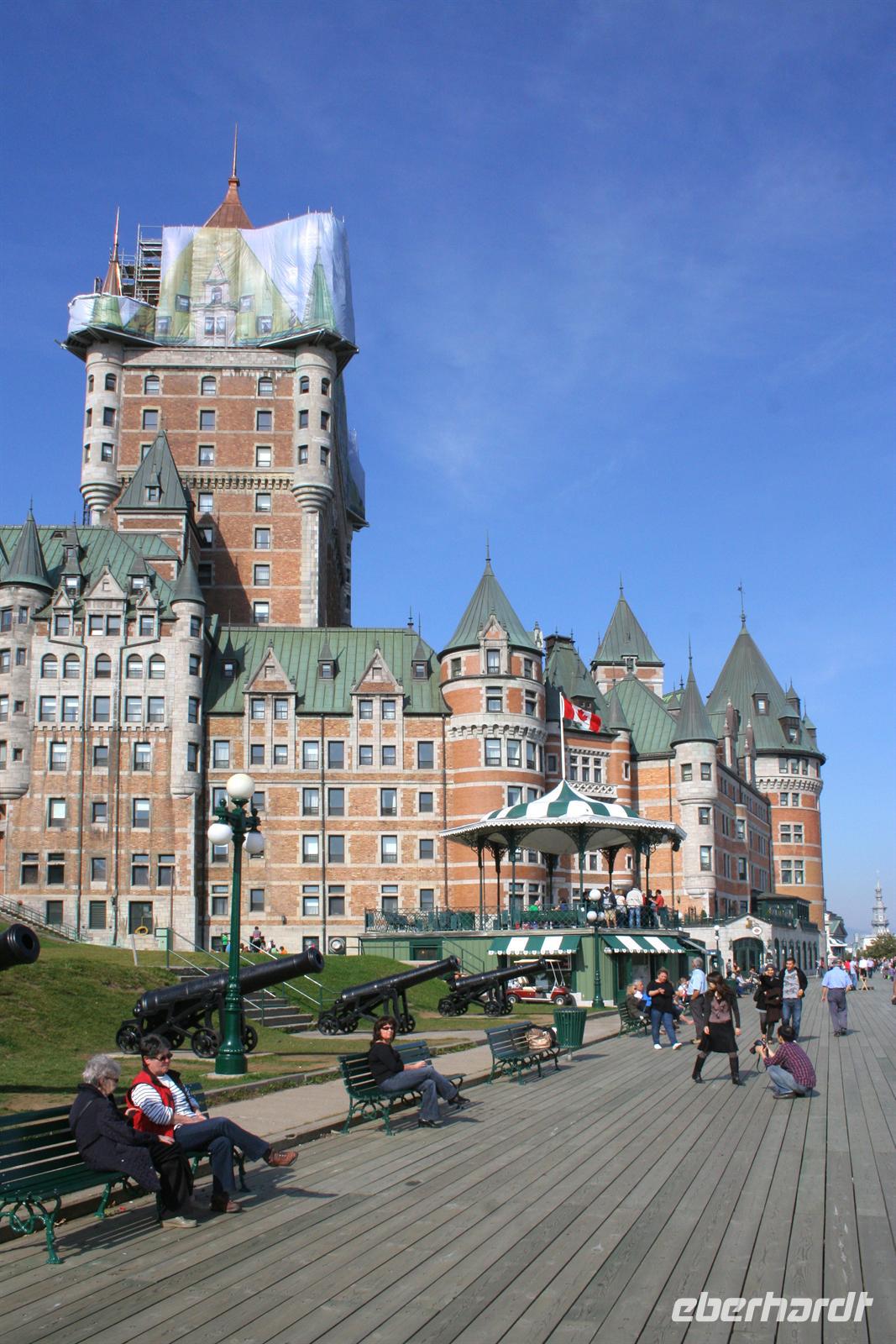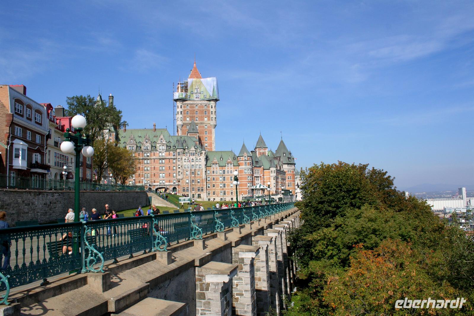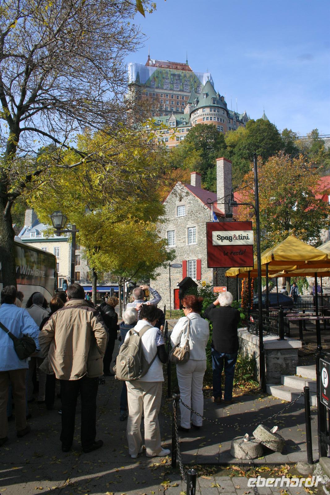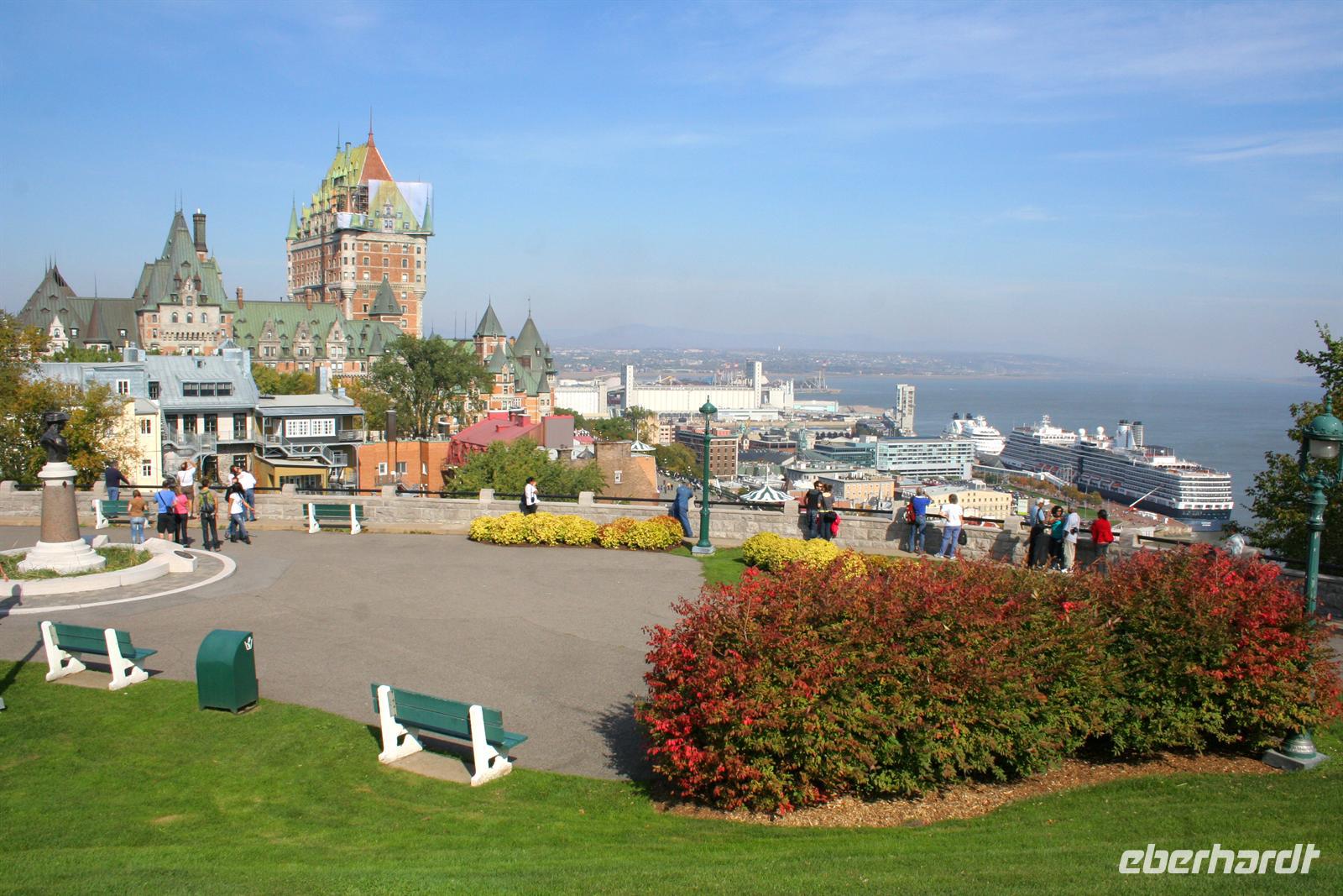 7.30 Uhr Frühstück im Hotel „Clarion“. Das Frühstücksbuffet ist reichhaltig und gut mit kalten und warmen Speisen, Pancakes, Müsli und frischem Obst. Der Kaffee wird am Tisch serviert. Gut gestärkt beginnen wir unser Tagesprogramm. Zunächst steht die Besichtigung von Quebec City an. Wir treffen unsere örtliche Stadtführerin Nadja unweit vom Hotel und beginnen unsere Stadtrundfahrt durch Quebec. Am Battlefield Park haben wir einen schönen Blick auf den St. Lorenz Strom und die gegenüber liegende Uferseite. Der Strom ist hier nicht so breit. Schließlich kommt der Name der Stadt von „Kebek“, einem Wort aus der Sprache der Algonquin-Indianer, das „Engstelle“ bedeutet. Hier im Battlefield Park standen sich einst englische und französische Truppen gegenüber und die Briten besiegten die hier ansässigen Franzosen.