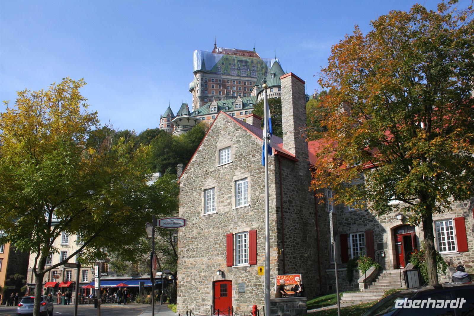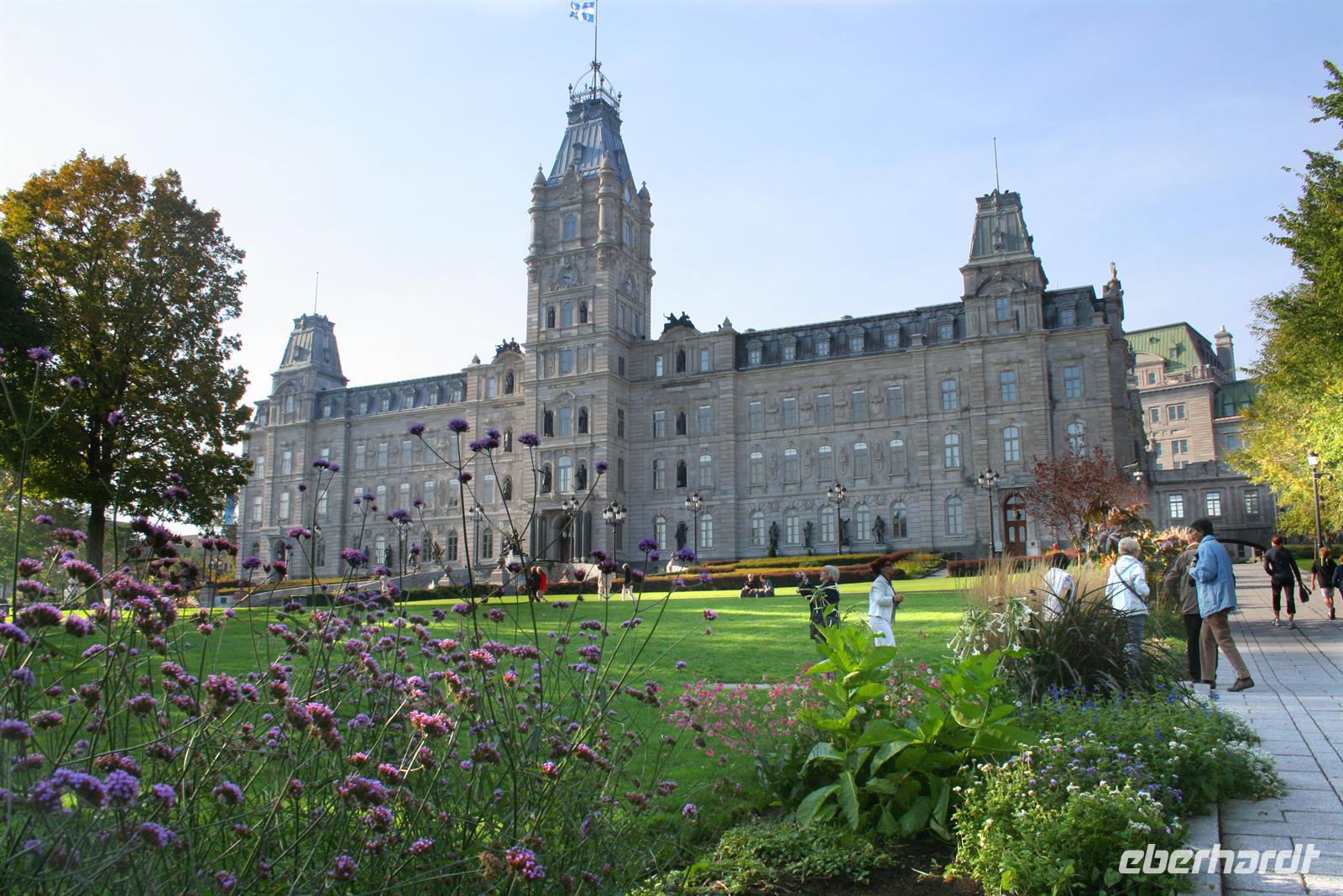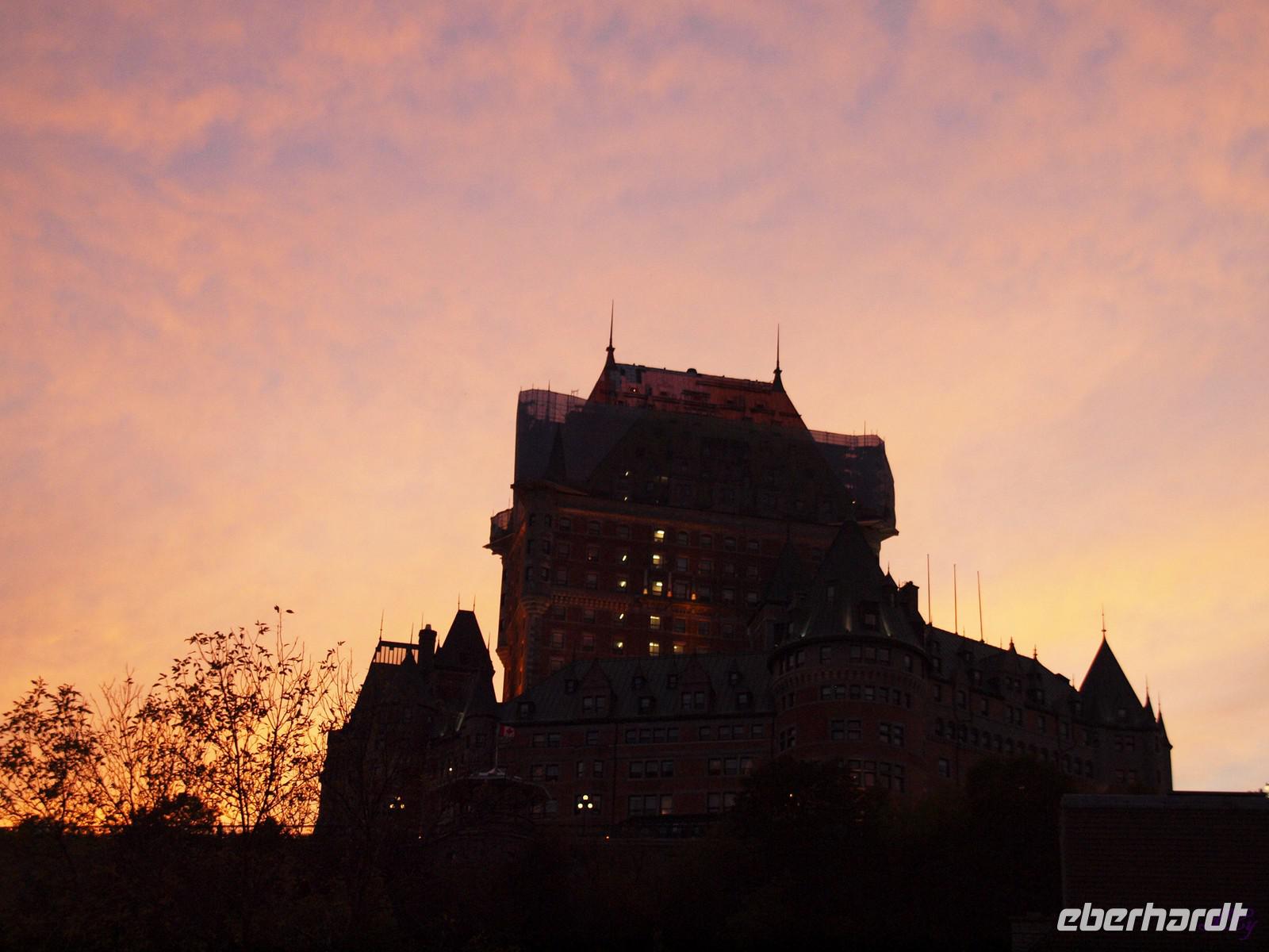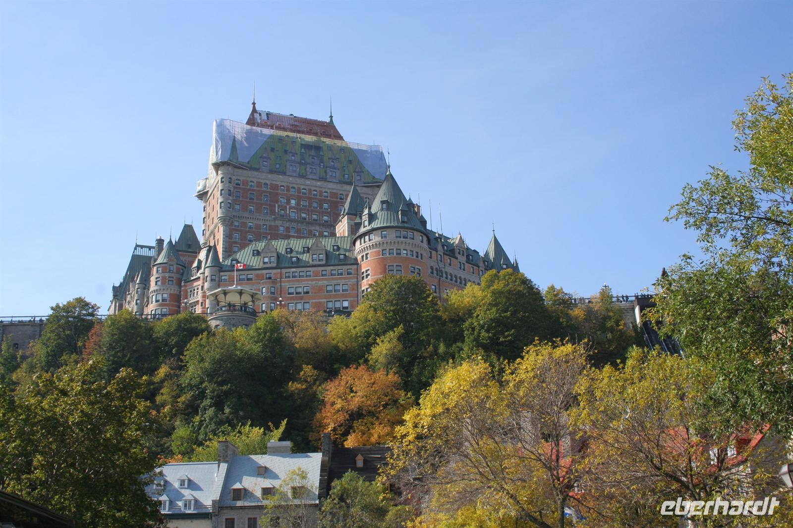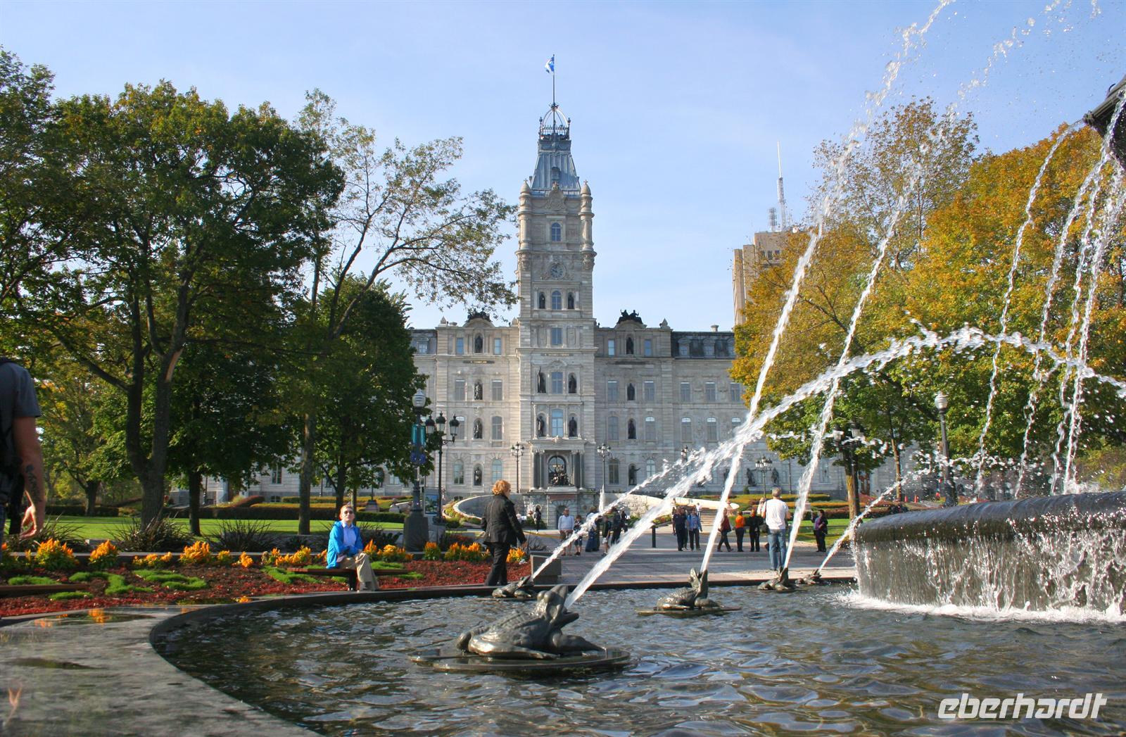 7.30 Uhr Frühstück im Hotel „Clarion“. Das Frühstücksbuffet ist reichhaltig und gut mit kalten und warmen Speisen, Pancakes, Müsli und frischem Obst. Der Kaffee wird am Tisch serviert. Gut gestärkt beginnen wir unser Tagesprogramm. Zunächst steht die Besichtigung von Quebec City an. Wir treffen unsere örtliche Stadtführerin Nadja unweit vom Hotel und beginnen unsere Stadtrundfahrt durch Quebec. Am Battlefield Park haben wir einen schönen Blick auf den St. Lorenz Strom und die gegenüber liegende Uferseite. Der Strom ist hier nicht so breit. Schließlich kommt der Name der Stadt von „Kebek“, einem Wort aus der Sprache der Algonquin-Indianer, das „Engstelle“ bedeutet. Hier im Battlefield Park standen sich einst englische und französische Truppen gegenüber und die Briten besiegten die hier ansässigen Franzosen.
