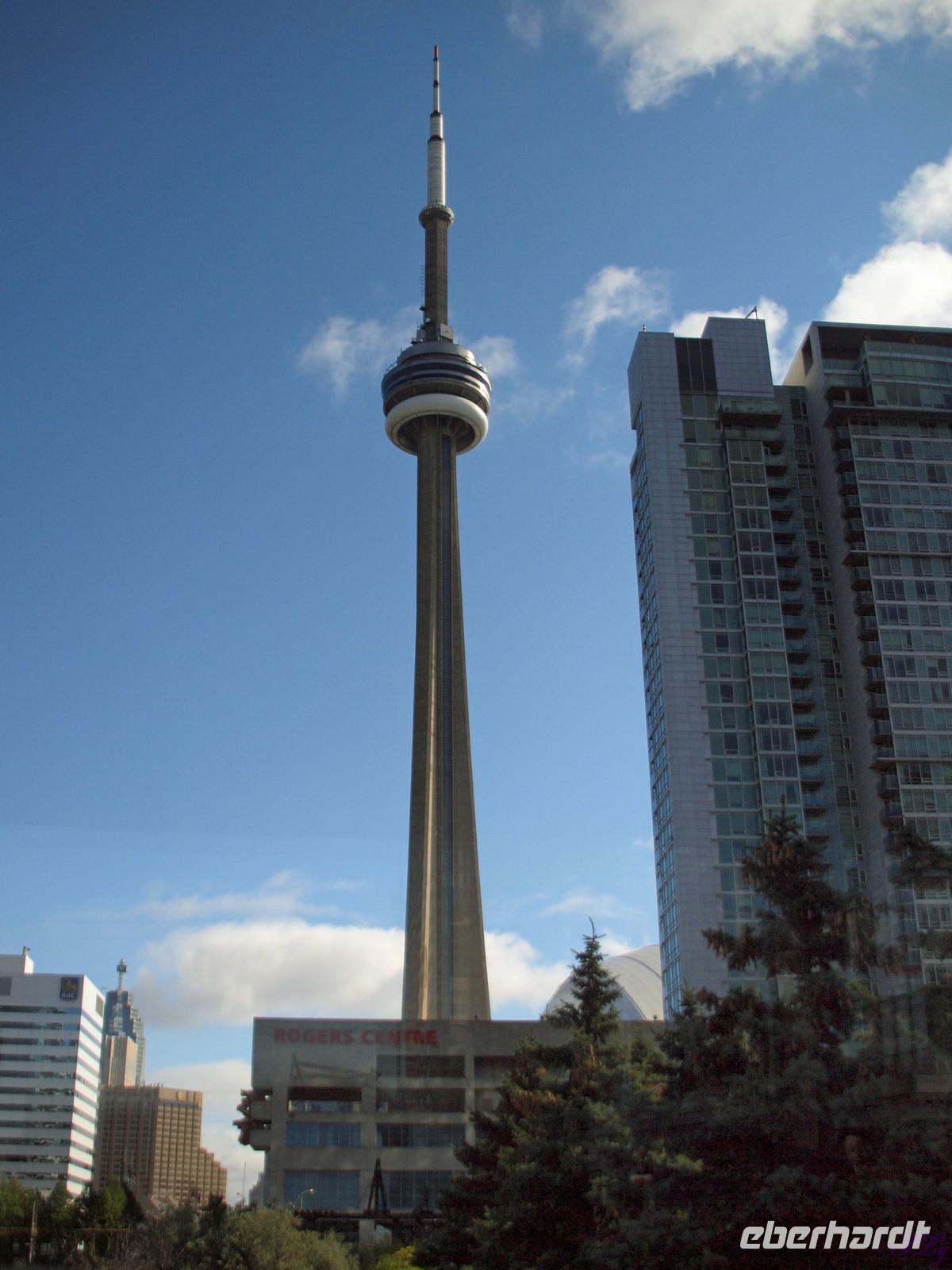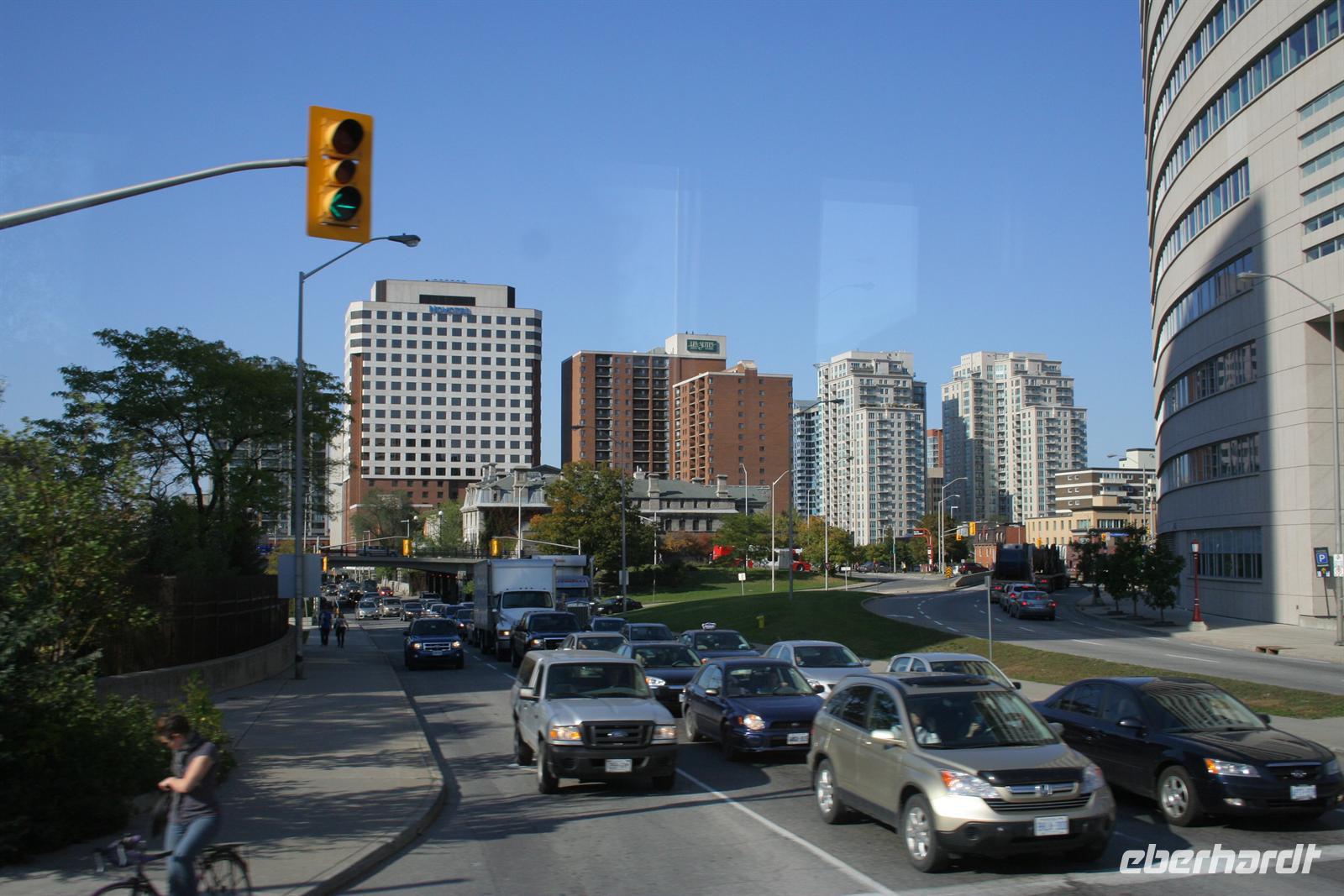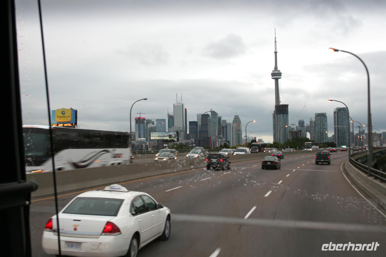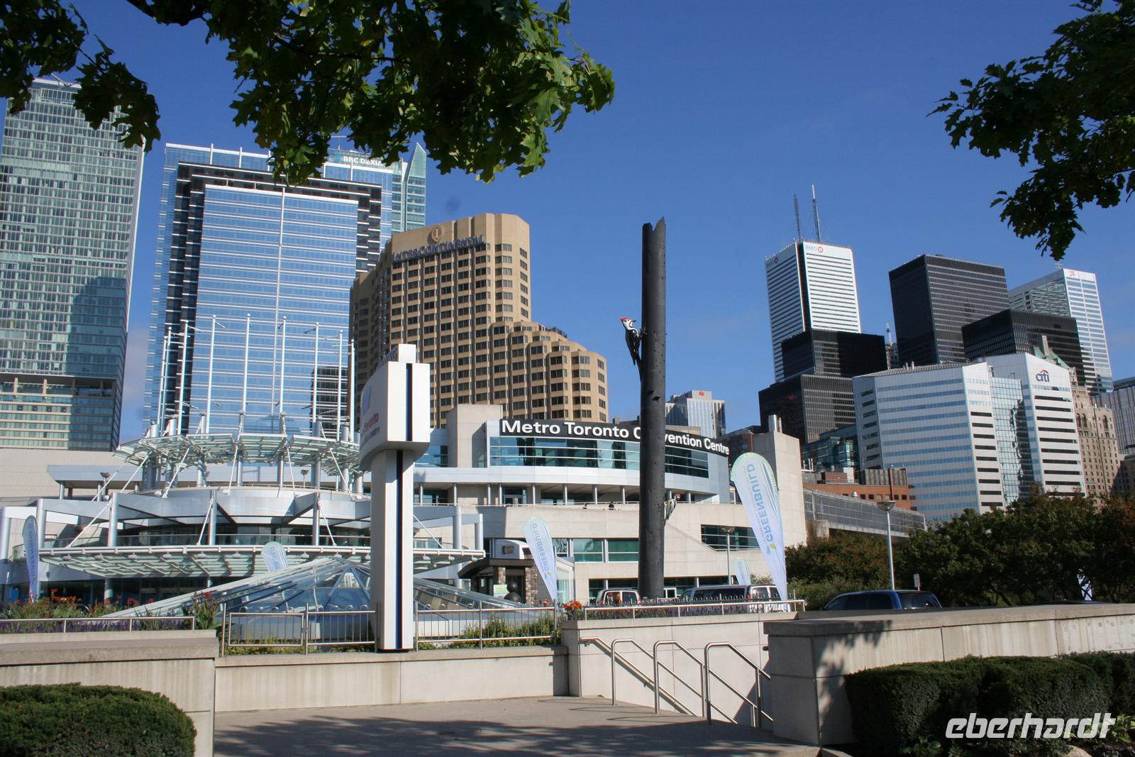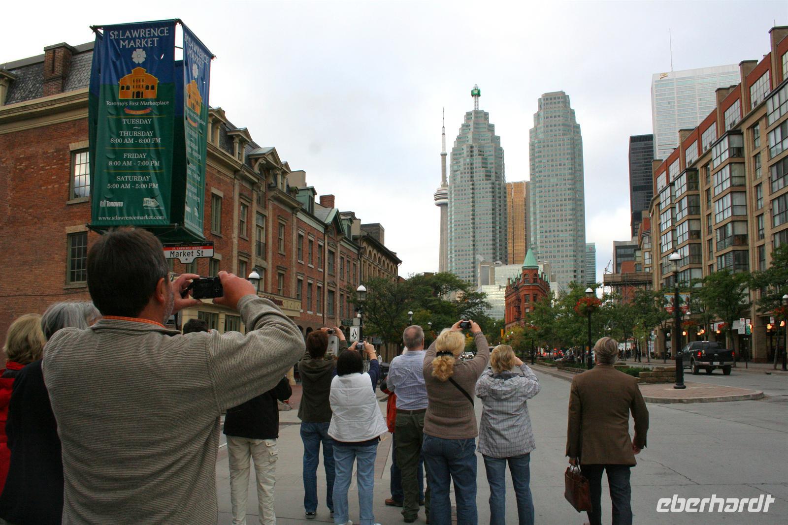 Am Montag Morgen, es ist der 3. Oktober - Tag der Deutschen Einheit - treffen wir uns um 7.00 Uhr im Flughafen Dresden. Weitere Gäste fliegen von Berlin oder von Leipzig nach Frankfurt/Main oder reisen mit der Bahn direkt zum Flughafen Frankfurt an.Nach einem Frühstück im Flughafen geht es los mit unserem Lufthansa-Flug nach Frankfurt. Wir kommen pünktlich um 9.30 Uhr in Frankfurt an. Da wir 4 Stunden Aufenthaltszeit haben, lassen wir uns Zeit, um vom Terminal A zum Terminal B zu laufen. Die Wege sind wie üblich lang, aber gut ausgeschildert. Das genaue Abfluggate nach Toronto ist noch nicht bekannt gegeben. Wir müssen daher noch einmal das Gate wechseln, nachdem ich beim Service Center nachgefragt habe, von welchem Gate unser Flug startet. Die Berliner Gäste und die Frankfurter Gäste hatten schon das richte Gate und so treffen wir uns ca. 1 Stunde vor Abflug endlich am Gate B43. Alle sind gut angekommen.Unser Flug nach Toronto startet pünktlich um 14.00 Uhr. Der Flug dauert etwa 8,5 Stunden. An Bord gibt es ein warmes Abendessen und noch mal einen warmen Snack etwa eine Stunde vor der Landung. Im Flugzeug werden auch die Zollformulare ausgeteilt, die wir mit Hilfe unserer Eberhardt-Vorlage problemlos ausfüllen. Man muss das Formular bei Ankunft im Flughafen bei der Passkontrolle zeigen und abgeben, wenn man den Transferbereich mit den Koffern verlässt. An der Passkontrolle gibt es einen Stempel und teilweise werden auch Fragen gestellt: Warum sind Sie hier? Wie lange sind Sie hier? Haben Sie Lebensmittel dabei? Nach der Kontrolle geht man hinunter zum Gepäckband. Wir warten bis alle ihren Koffer haben und verlassen gemeinsam den Transferbereich. Hier erwartet uns Reiseleiterin Brigitta Gamm. Wer möchte, kann hier in der Eingangshalle an einem Kiosk auch noch Geld tauschen. Bei uns hatten das schon alle zu Hause erledigt. Wir gehen gemeinsam zum Busparkplatz, wo unser Fahrer Remy mit unserem modernen Reisebus wartet. Gegen 18.00 Uhr verlassen wir den Flughafen mit etwas Verspätung.Die Fahrt zum Hotel „Delta Chelsea" in der Innenstadt von Toronto dauert etwa 30 Minuten. Brigitta erklärt im Bus den weiteren Ablauf des Tages und holt die Zimmerschlüssel. Ich kaufe bei Remy für jeden eine Flasche Wasser für je 1 CAD und verteile sie unterdessen im Bus. Dann checken wir im Hotel ein. Das Hotel liegt an der Gerrard Street und der Einkaufsstraße Yong Street, nur 5 Minuten vom Eaton Center, Torontos bekanntestem Einkaufscenter. Da wir verspätet ankamen, verschieben wir das Abendessen im Hotelrestaurant „Bb33" auf 19.30 Uhr. Es gibt ein feines 3-Gang-Menü mit je drei Vor- und Hauptspeisen zur Wahl: Suppe oder Salat, Chinesische Wokpfanne, Lachs oder Hähnchen sowie ein leckeres Dessert mit Kaffee oder Tee. Tafelwasser ist inklusive, ein Bier kostet 6-7 CAD, ein Softdrink 3,60 CAD. Trinkgeld und Tax sind bereits inkludiert. Es schmeckt alles prima!Nach dem Essen unternehmen wir noch einen kleinen Spaziergang mit Brigitta. Mit einigen trinke ich noch einen Absacker in der Hotelbar „Elmstreet Lounge". Alle sind geschafft und wir gehen 22.30 Uhr auf die Zimmer. Die Zimmer sind geräumig und ausgestattet mit Wanne/WC, Föhn, Bügeleisen, Kosmetikartikeln, TV, Radiowecker, Telefon und Klimaanlage.Dienstag, 04.10.2011
