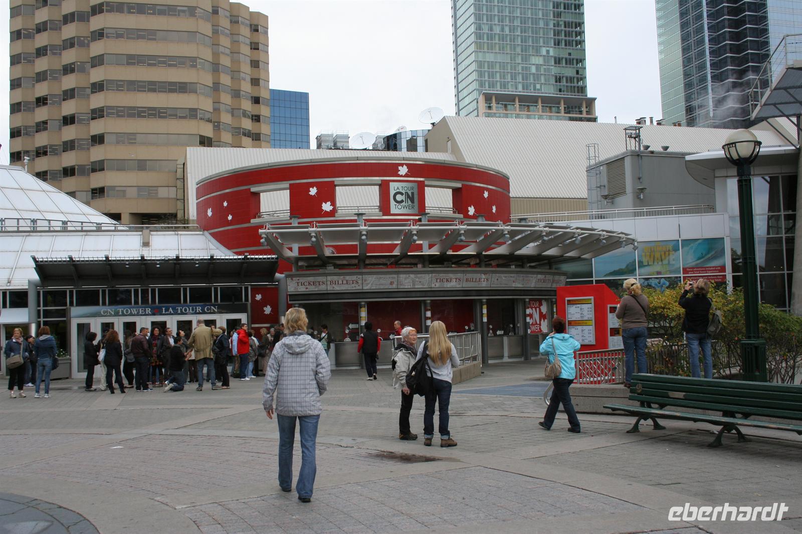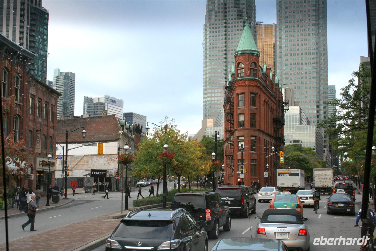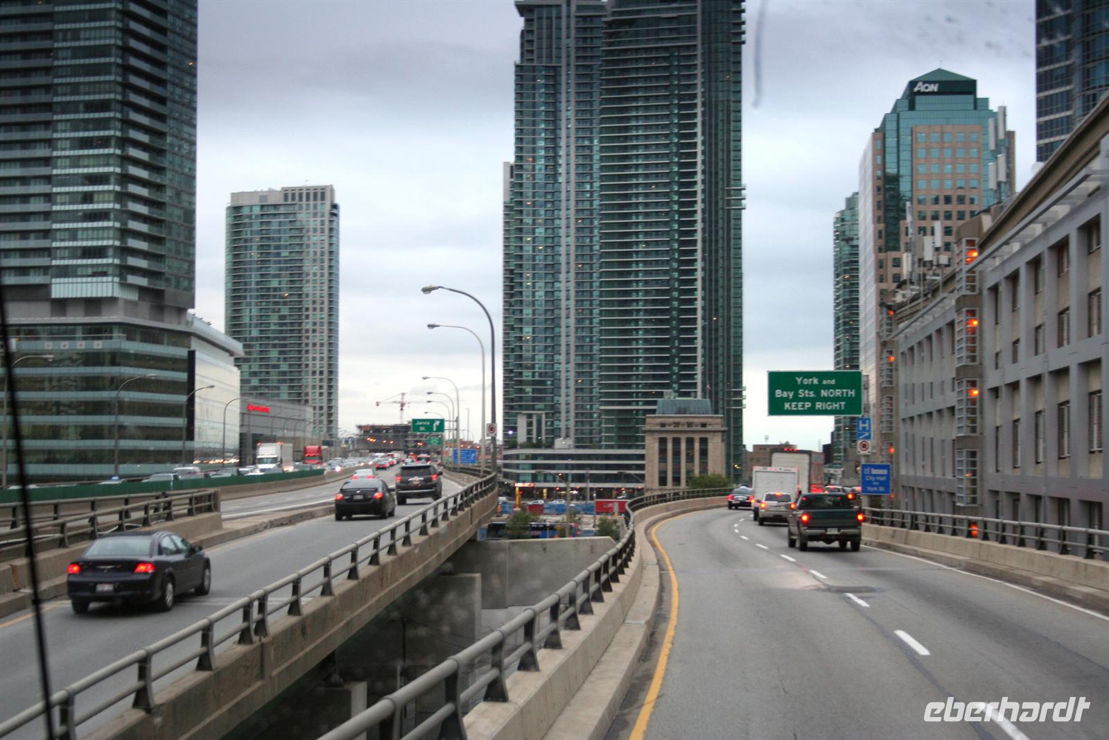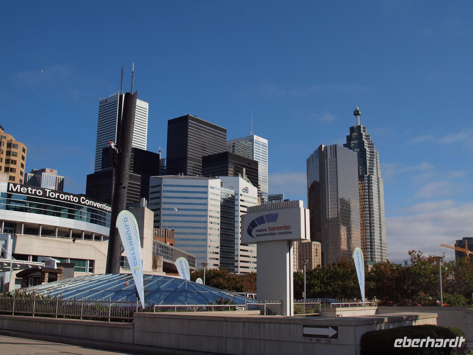 Am Montag Morgen, es ist der 3. Oktober - Tag der Deutschen Einheit - treffen wir uns um 7.00 Uhr im Flughafen Dresden. Weitere Gäste fliegen von Berlin oder von Leipzig nach Frankfurt/Main oder reisen mit der Bahn direkt zum Flughafen Frankfurt an.Nach einem Frühstück im Flughafen geht es los mit unserem Lufthansa-Flug nach Frankfurt. Wir kommen pünktlich um 9.30 Uhr in Frankfurt an. Da wir 4 Stunden Aufenthaltszeit haben, lassen wir uns Zeit, um vom Terminal A zum Terminal B zu laufen. Die Wege sind wie üblich lang, aber gut ausgeschildert. Das genaue Abfluggate nach Toronto ist noch nicht bekannt gegeben. Wir müssen daher noch einmal das Gate wechseln, nachdem ich beim Service Center nachgefragt habe, von welchem Gate unser Flug startet. Die Berliner Gäste und die Frankfurter Gäste hatten schon das richte Gate und so treffen wir uns ca. 1 Stunde vor Abflug endlich am Gate B43. Alle sind gut angekommen.Unser Flug nach Toronto startet pünktlich um 14.00 Uhr. Der Flug dauert etwa 8,5 Stunden. An Bord gibt es ein warmes Abendessen und noch mal einen warmen Snack etwa eine Stunde vor der Landung. Im Flugzeug werden auch die Zollformulare ausgeteilt, die wir mit Hilfe unserer Eberhardt-Vorlage problemlos ausfüllen. Man muss das Formular bei Ankunft im Flughafen bei der Passkontrolle zeigen und abgeben, wenn man den Transferbereich mit den Koffern verlässt. An der Passkontrolle gibt es einen Stempel und teilweise werden auch Fragen gestellt: Warum sind Sie hier? Wie lange sind Sie hier? Haben Sie Lebensmittel dabei? Nach der Kontrolle geht man hinunter zum Gepäckband. Wir warten bis alle ihren Koffer haben und verlassen gemeinsam den Transferbereich. Hier erwartet uns Reiseleiterin Brigitta Gamm. Wer möchte, kann hier in der Eingangshalle an einem Kiosk auch noch Geld tauschen. Bei uns hatten das schon alle zu Hause erledigt. Wir gehen gemeinsam zum Busparkplatz, wo unser Fahrer Remy mit unserem modernen Reisebus wartet. Gegen 18.00 Uhr verlassen wir den Flughafen mit etwas Verspätung.Die Fahrt zum Hotel „Delta Chelsea" in der Innenstadt von Toronto dauert etwa 30 Minuten. Brigitta erklärt im Bus den weiteren Ablauf des Tages und holt die Zimmerschlüssel. Ich kaufe bei Remy für jeden eine Flasche Wasser für je 1 CAD und verteile sie unterdessen im Bus. Dann checken wir im Hotel ein. Das Hotel liegt an der Gerrard Street und der Einkaufsstraße Yong Street, nur 5 Minuten vom Eaton Center, Torontos bekanntestem Einkaufscenter. Da wir verspätet ankamen, verschieben wir das Abendessen im Hotelrestaurant „Bb33" auf 19.30 Uhr. Es gibt ein feines 3-Gang-Menü mit je drei Vor- und Hauptspeisen zur Wahl: Suppe oder Salat, Chinesische Wokpfanne, Lachs oder Hähnchen sowie ein leckeres Dessert mit Kaffee oder Tee. Tafelwasser ist inklusive, ein Bier kostet 6-7 CAD, ein Softdrink 3,60 CAD. Trinkgeld und Tax sind bereits inkludiert. Es schmeckt alles prima!Nach dem Essen unternehmen wir noch einen kleinen Spaziergang mit Brigitta. Mit einigen trinke ich noch einen Absacker in der Hotelbar „Elmstreet Lounge". Alle sind geschafft und wir gehen 22.30 Uhr auf die Zimmer. Die Zimmer sind geräumig und ausgestattet mit Wanne/WC, Föhn, Bügeleisen, Kosmetikartikeln, TV, Radiowecker, Telefon und Klimaanlage.Dienstag, 04.10.2011