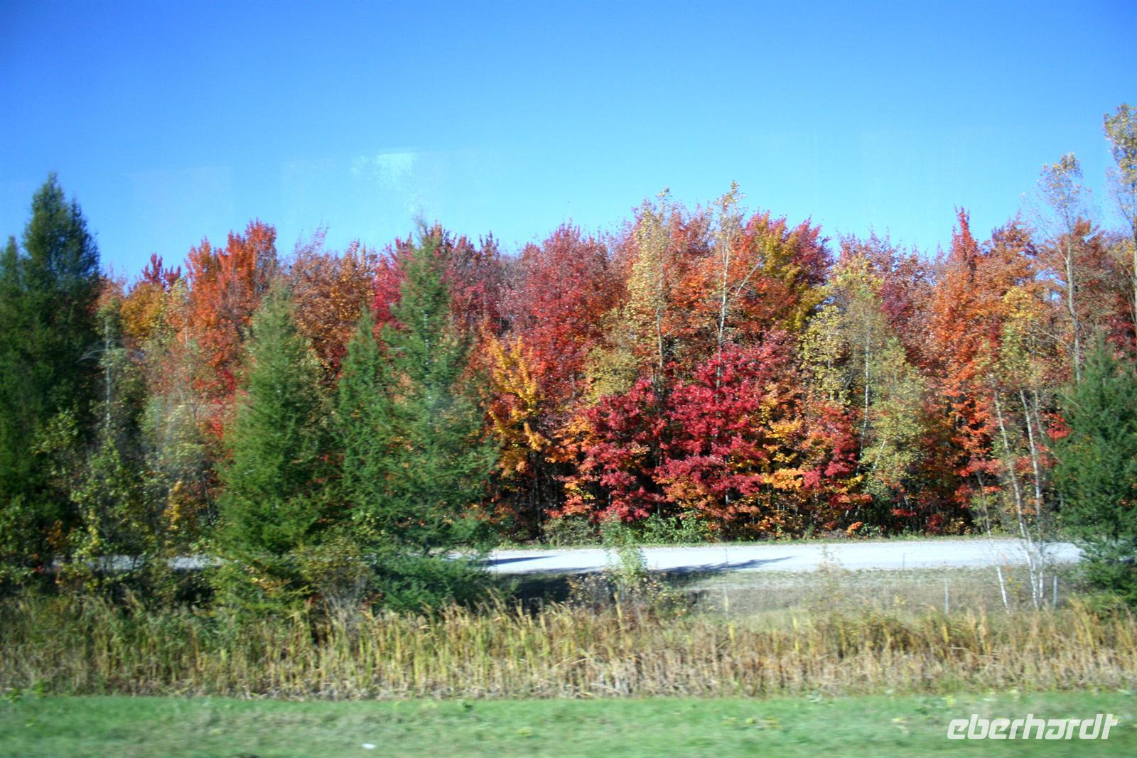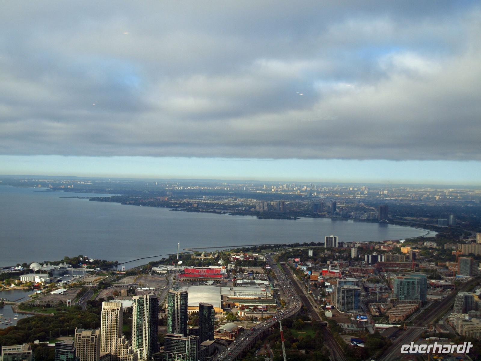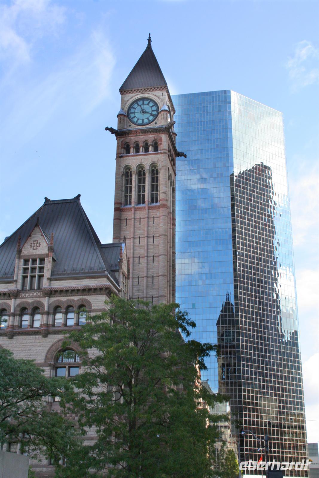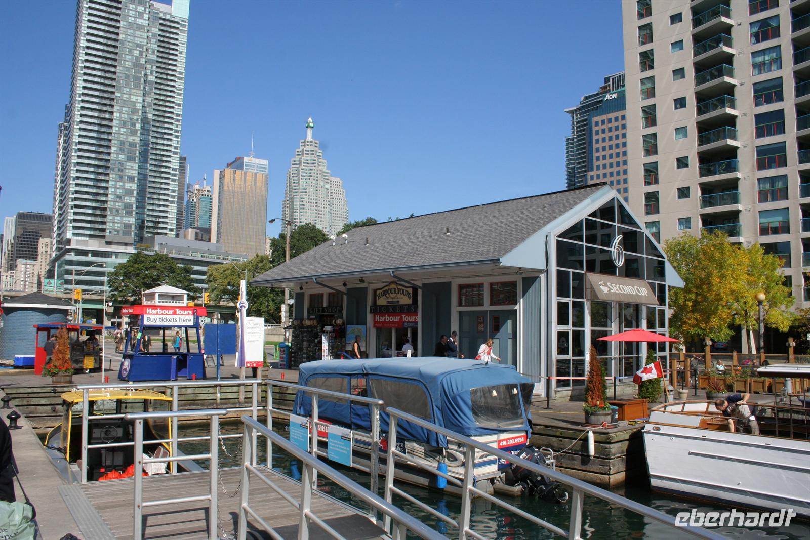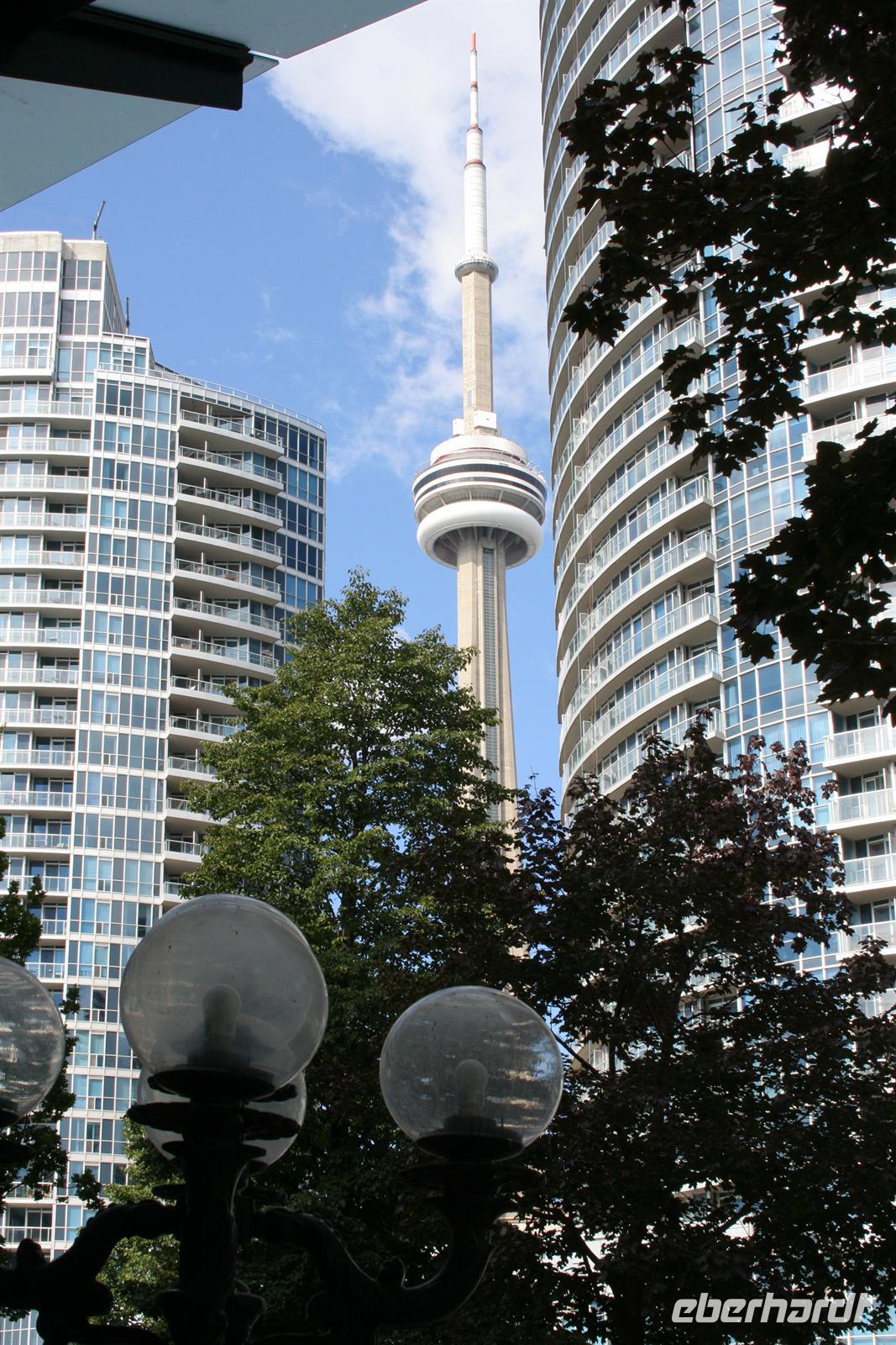 Am Montag Morgen, es ist der 3. Oktober - Tag der Deutschen Einheit - treffen wir uns um 7.00 Uhr im Flughafen Dresden. Weitere Gäste fliegen von Berlin oder von Leipzig nach Frankfurt/Main oder reisen mit der Bahn direkt zum Flughafen Frankfurt an.Nach einem Frühstück im Flughafen geht es los mit unserem Lufthansa-Flug nach Frankfurt. Wir kommen pünktlich um 9.30 Uhr in Frankfurt an. Da wir 4 Stunden Aufenthaltszeit haben, lassen wir uns Zeit, um vom Terminal A zum Terminal B zu laufen. Die Wege sind wie üblich lang, aber gut ausgeschildert. Das genaue Abfluggate nach Toronto ist noch nicht bekannt gegeben. Wir müssen daher noch einmal das Gate wechseln, nachdem ich beim Service Center nachgefragt habe, von welchem Gate unser Flug startet. Die Berliner Gäste und die Frankfurter Gäste hatten schon das richte Gate und so treffen wir uns ca. 1 Stunde vor Abflug endlich am Gate B43. Alle sind gut angekommen.Unser Flug nach Toronto startet pünktlich um 14.00 Uhr. Der Flug dauert etwa 8,5 Stunden. An Bord gibt es ein warmes Abendessen und noch mal einen warmen Snack etwa eine Stunde vor der Landung. Im Flugzeug werden auch die Zollformulare ausgeteilt, die wir mit Hilfe unserer Eberhardt-Vorlage problemlos ausfüllen. Man muss das Formular bei Ankunft im Flughafen bei der Passkontrolle zeigen und abgeben, wenn man den Transferbereich mit den Koffern verlässt. An der Passkontrolle gibt es einen Stempel und teilweise werden auch Fragen gestellt: Warum sind Sie hier? Wie lange sind Sie hier? Haben Sie Lebensmittel dabei? Nach der Kontrolle geht man hinunter zum Gepäckband. Wir warten bis alle ihren Koffer haben und verlassen gemeinsam den Transferbereich. Hier erwartet uns Reiseleiterin Brigitta Gamm. Wer möchte, kann hier in der Eingangshalle an einem Kiosk auch noch Geld tauschen. Bei uns hatten das schon alle zu Hause erledigt. Wir gehen gemeinsam zum Busparkplatz, wo unser Fahrer Remy mit unserem modernen Reisebus wartet. Gegen 18.00 Uhr verlassen wir den Flughafen mit etwas Verspätung.Die Fahrt zum Hotel „Delta Chelsea" in der Innenstadt von Toronto dauert etwa 30 Minuten. Brigitta erklärt im Bus den weiteren Ablauf des Tages und holt die Zimmerschlüssel. Ich kaufe bei Remy für jeden eine Flasche Wasser für je 1 CAD und verteile sie unterdessen im Bus. Dann checken wir im Hotel ein. Das Hotel liegt an der Gerrard Street und der Einkaufsstraße Yong Street, nur 5 Minuten vom Eaton Center, Torontos bekanntestem Einkaufscenter. Da wir verspätet ankamen, verschieben wir das Abendessen im Hotelrestaurant „Bb33" auf 19.30 Uhr. Es gibt ein feines 3-Gang-Menü mit je drei Vor- und Hauptspeisen zur Wahl: Suppe oder Salat, Chinesische Wokpfanne, Lachs oder Hähnchen sowie ein leckeres Dessert mit Kaffee oder Tee. Tafelwasser ist inklusive, ein Bier kostet 6-7 CAD, ein Softdrink 3,60 CAD. Trinkgeld und Tax sind bereits inkludiert. Es schmeckt alles prima!Nach dem Essen unternehmen wir noch einen kleinen Spaziergang mit Brigitta. Mit einigen trinke ich noch einen Absacker in der Hotelbar „Elmstreet Lounge". Alle sind geschafft und wir gehen 22.30 Uhr auf die Zimmer. Die Zimmer sind geräumig und ausgestattet mit Wanne/WC, Föhn, Bügeleisen, Kosmetikartikeln, TV, Radiowecker, Telefon und Klimaanlage.Dienstag, 04.10.2011