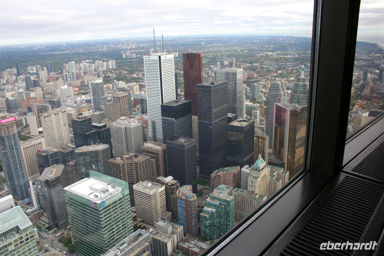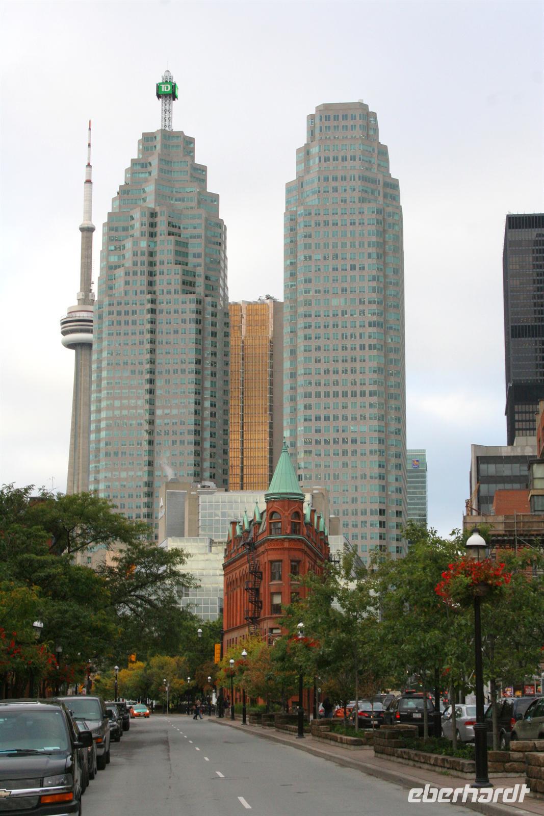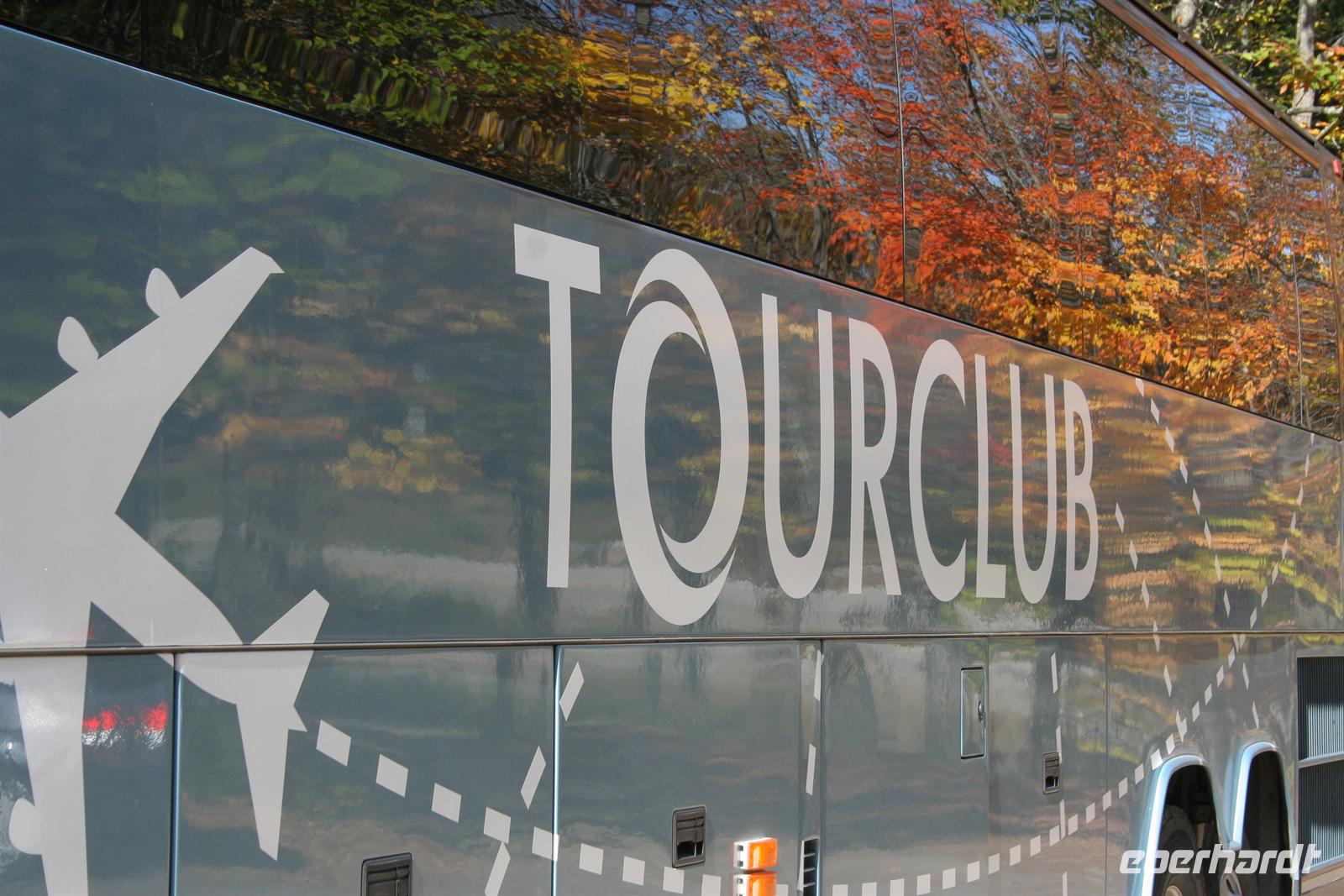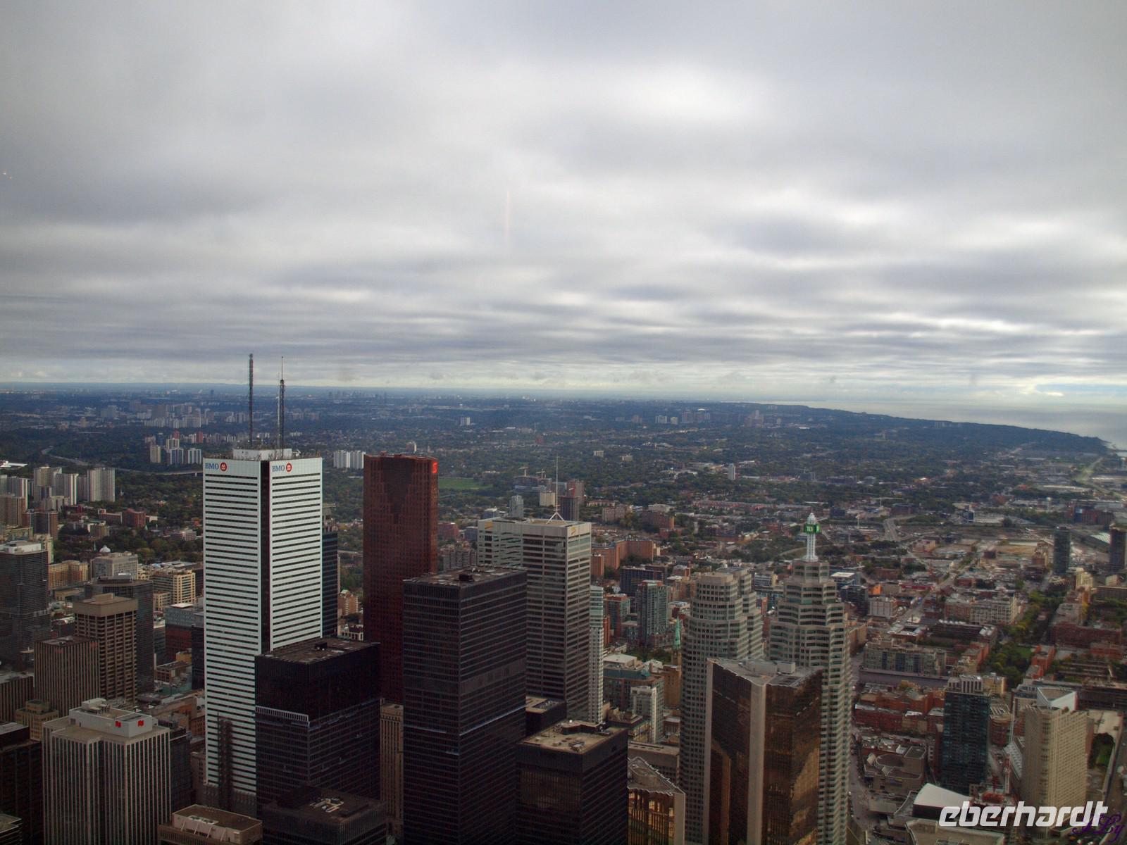 Am Montag Morgen, es ist der 3. Oktober - Tag der Deutschen Einheit - treffen wir uns um 7.00 Uhr im Flughafen Dresden. Weitere Gäste fliegen von Berlin oder von Leipzig nach Frankfurt/Main oder reisen mit der Bahn direkt zum Flughafen Frankfurt an.Nach einem Frühstück im Flughafen geht es los mit unserem Lufthansa-Flug nach Frankfurt. Wir kommen pünktlich um 9.30 Uhr in Frankfurt an. Da wir 4 Stunden Aufenthaltszeit haben, lassen wir uns Zeit, um vom Terminal A zum Terminal B zu laufen. Die Wege sind wie üblich lang, aber gut ausgeschildert. Das genaue Abfluggate nach Toronto ist noch nicht bekannt gegeben. Wir müssen daher noch einmal das Gate wechseln, nachdem ich beim Service Center nachgefragt habe, von welchem Gate unser Flug startet. Die Berliner Gäste und die Frankfurter Gäste hatten schon das richte Gate und so treffen wir uns ca. 1 Stunde vor Abflug endlich am Gate B43. Alle sind gut angekommen.Unser Flug nach Toronto startet pünktlich um 14.00 Uhr. Der Flug dauert etwa 8,5 Stunden. An Bord gibt es ein warmes Abendessen und noch mal einen warmen Snack etwa eine Stunde vor der Landung. Im Flugzeug werden auch die Zollformulare ausgeteilt, die wir mit Hilfe unserer Eberhardt-Vorlage problemlos ausfüllen. Man muss das Formular bei Ankunft im Flughafen bei der Passkontrolle zeigen und abgeben, wenn man den Transferbereich mit den Koffern verlässt. An der Passkontrolle gibt es einen Stempel und teilweise werden auch Fragen gestellt: Warum sind Sie hier? Wie lange sind Sie hier? Haben Sie Lebensmittel dabei? Nach der Kontrolle geht man hinunter zum Gepäckband. Wir warten bis alle ihren Koffer haben und verlassen gemeinsam den Transferbereich. Hier erwartet uns Reiseleiterin Brigitta Gamm. Wer möchte, kann hier in der Eingangshalle an einem Kiosk auch noch Geld tauschen. Bei uns hatten das schon alle zu Hause erledigt. Wir gehen gemeinsam zum Busparkplatz, wo unser Fahrer Remy mit unserem modernen Reisebus wartet. Gegen 18.00 Uhr verlassen wir den Flughafen mit etwas Verspätung.Die Fahrt zum Hotel „Delta Chelsea" in der Innenstadt von Toronto dauert etwa 30 Minuten. Brigitta erklärt im Bus den weiteren Ablauf des Tages und holt die Zimmerschlüssel. Ich kaufe bei Remy für jeden eine Flasche Wasser für je 1 CAD und verteile sie unterdessen im Bus. Dann checken wir im Hotel ein. Das Hotel liegt an der Gerrard Street und der Einkaufsstraße Yong Street, nur 5 Minuten vom Eaton Center, Torontos bekanntestem Einkaufscenter. Da wir verspätet ankamen, verschieben wir das Abendessen im Hotelrestaurant „Bb33" auf 19.30 Uhr. Es gibt ein feines 3-Gang-Menü mit je drei Vor- und Hauptspeisen zur Wahl: Suppe oder Salat, Chinesische Wokpfanne, Lachs oder Hähnchen sowie ein leckeres Dessert mit Kaffee oder Tee. Tafelwasser ist inklusive, ein Bier kostet 6-7 CAD, ein Softdrink 3,60 CAD. Trinkgeld und Tax sind bereits inkludiert. Es schmeckt alles prima!Nach dem Essen unternehmen wir noch einen kleinen Spaziergang mit Brigitta. Mit einigen trinke ich noch einen Absacker in der Hotelbar „Elmstreet Lounge". Alle sind geschafft und wir gehen 22.30 Uhr auf die Zimmer. Die Zimmer sind geräumig und ausgestattet mit Wanne/WC, Föhn, Bügeleisen, Kosmetikartikeln, TV, Radiowecker, Telefon und Klimaanlage.Dienstag, 04.10.2011