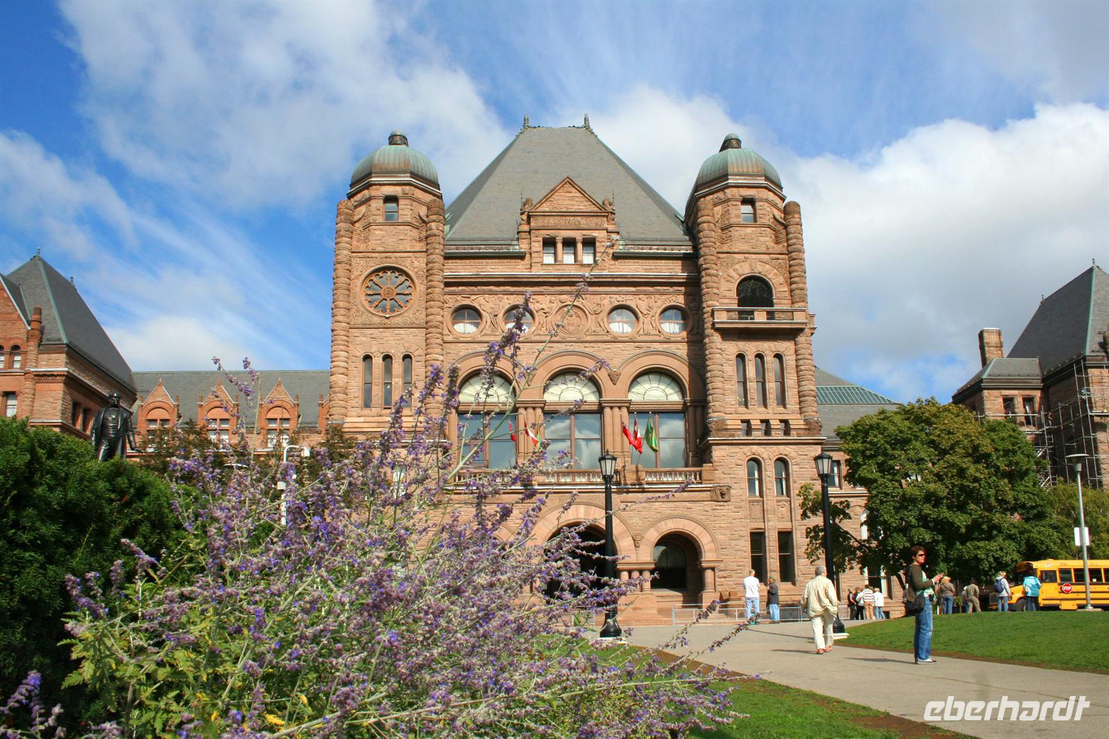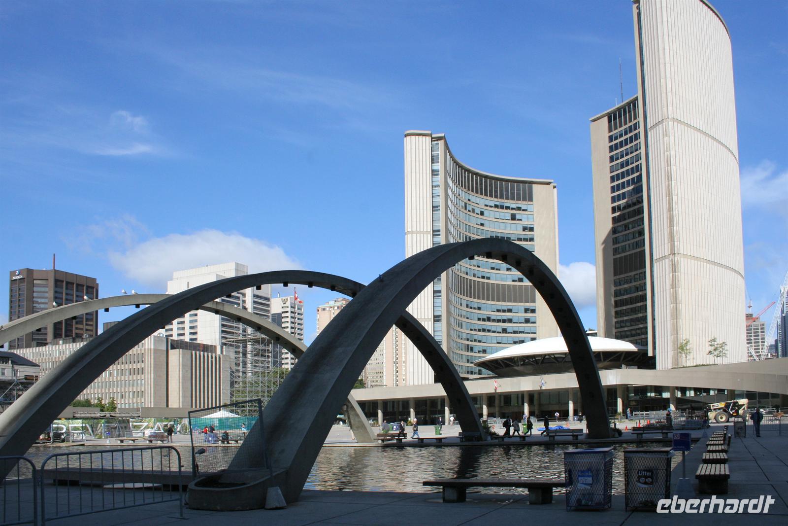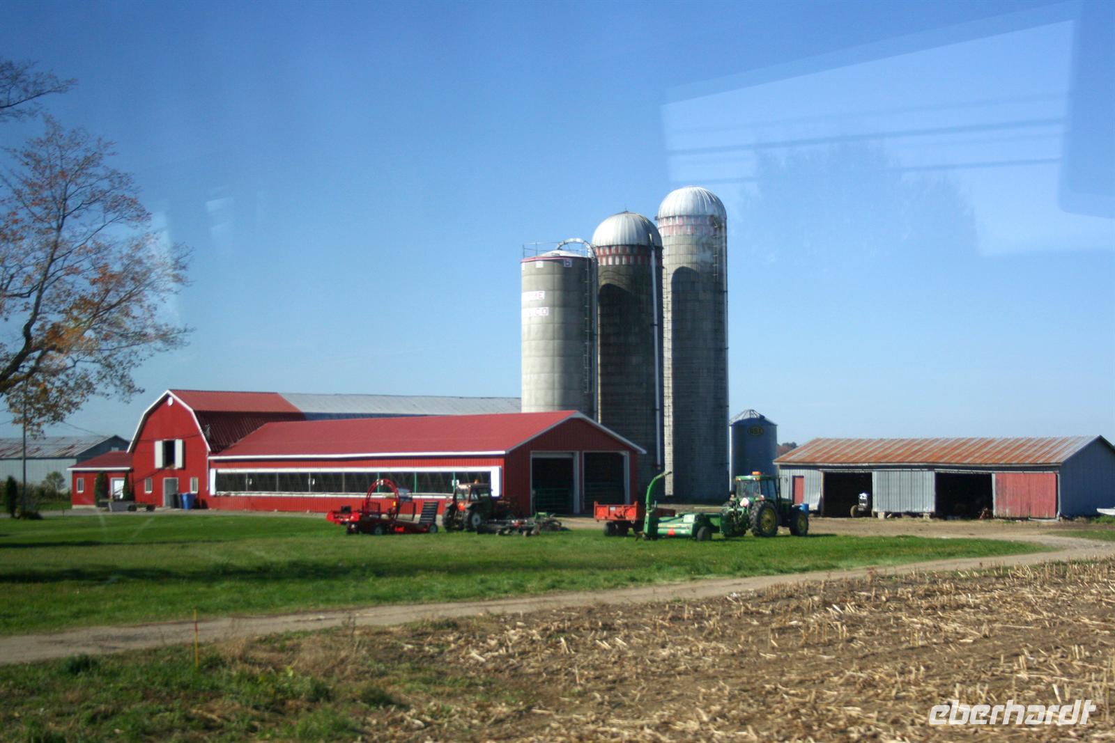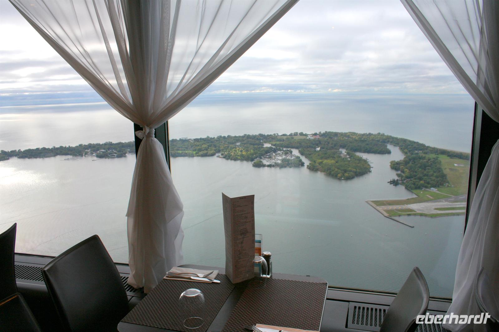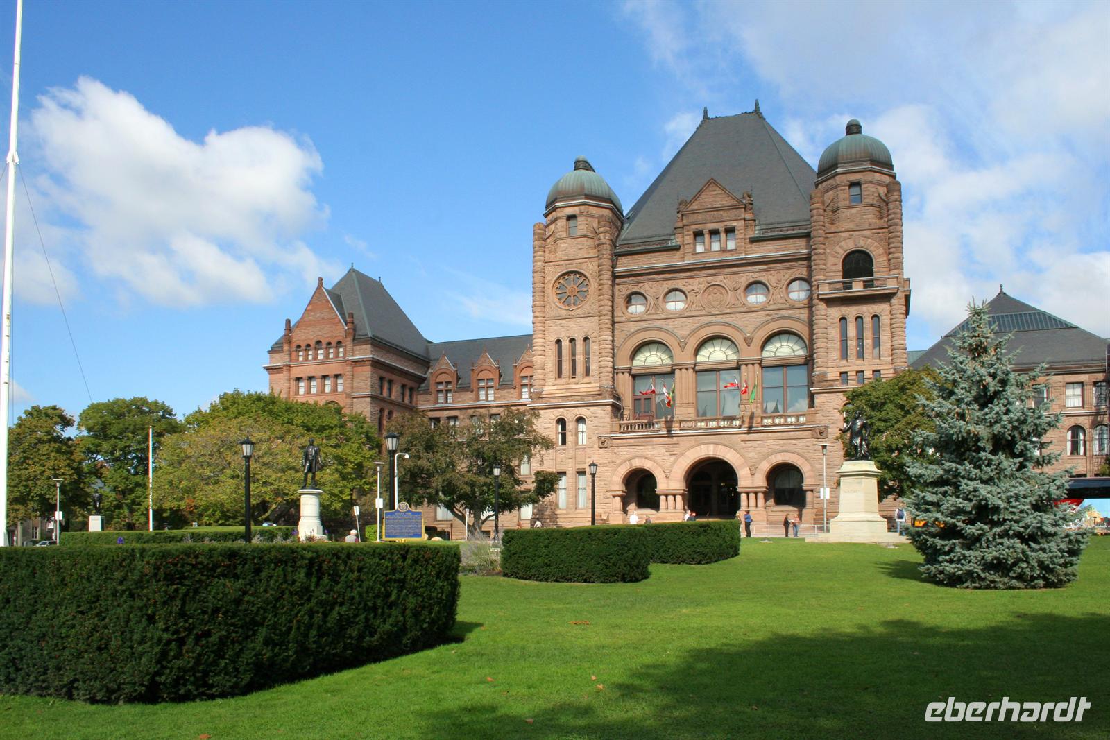 Am Montag Morgen, es ist der 3. Oktober - Tag der Deutschen Einheit - treffen wir uns um 7.00 Uhr im Flughafen Dresden. Weitere Gäste fliegen von Berlin oder von Leipzig nach Frankfurt/Main oder reisen mit der Bahn direkt zum Flughafen Frankfurt an.Nach einem Frühstück im Flughafen geht es los mit unserem Lufthansa-Flug nach Frankfurt. Wir kommen pünktlich um 9.30 Uhr in Frankfurt an. Da wir 4 Stunden Aufenthaltszeit haben, lassen wir uns Zeit, um vom Terminal A zum Terminal B zu laufen. Die Wege sind wie üblich lang, aber gut ausgeschildert. Das genaue Abfluggate nach Toronto ist noch nicht bekannt gegeben. Wir müssen daher noch einmal das Gate wechseln, nachdem ich beim Service Center nachgefragt habe, von welchem Gate unser Flug startet. Die Berliner Gäste und die Frankfurter Gäste hatten schon das richte Gate und so treffen wir uns ca. 1 Stunde vor Abflug endlich am Gate B43. Alle sind gut angekommen.Unser Flug nach Toronto startet pünktlich um 14.00 Uhr. Der Flug dauert etwa 8,5 Stunden. An Bord gibt es ein warmes Abendessen und noch mal einen warmen Snack etwa eine Stunde vor der Landung. Im Flugzeug werden auch die Zollformulare ausgeteilt, die wir mit Hilfe unserer Eberhardt-Vorlage problemlos ausfüllen. Man muss das Formular bei Ankunft im Flughafen bei der Passkontrolle zeigen und abgeben, wenn man den Transferbereich mit den Koffern verlässt. An der Passkontrolle gibt es einen Stempel und teilweise werden auch Fragen gestellt: Warum sind Sie hier? Wie lange sind Sie hier? Haben Sie Lebensmittel dabei? Nach der Kontrolle geht man hinunter zum Gepäckband. Wir warten bis alle ihren Koffer haben und verlassen gemeinsam den Transferbereich. Hier erwartet uns Reiseleiterin Brigitta Gamm. Wer möchte, kann hier in der Eingangshalle an einem Kiosk auch noch Geld tauschen. Bei uns hatten das schon alle zu Hause erledigt. Wir gehen gemeinsam zum Busparkplatz, wo unser Fahrer Remy mit unserem modernen Reisebus wartet. Gegen 18.00 Uhr verlassen wir den Flughafen mit etwas Verspätung.Die Fahrt zum Hotel „Delta Chelsea" in der Innenstadt von Toronto dauert etwa 30 Minuten. Brigitta erklärt im Bus den weiteren Ablauf des Tages und holt die Zimmerschlüssel. Ich kaufe bei Remy für jeden eine Flasche Wasser für je 1 CAD und verteile sie unterdessen im Bus. Dann checken wir im Hotel ein. Das Hotel liegt an der Gerrard Street und der Einkaufsstraße Yong Street, nur 5 Minuten vom Eaton Center, Torontos bekanntestem Einkaufscenter. Da wir verspätet ankamen, verschieben wir das Abendessen im Hotelrestaurant „Bb33" auf 19.30 Uhr. Es gibt ein feines 3-Gang-Menü mit je drei Vor- und Hauptspeisen zur Wahl: Suppe oder Salat, Chinesische Wokpfanne, Lachs oder Hähnchen sowie ein leckeres Dessert mit Kaffee oder Tee. Tafelwasser ist inklusive, ein Bier kostet 6-7 CAD, ein Softdrink 3,60 CAD. Trinkgeld und Tax sind bereits inkludiert. Es schmeckt alles prima!Nach dem Essen unternehmen wir noch einen kleinen Spaziergang mit Brigitta. Mit einigen trinke ich noch einen Absacker in der Hotelbar „Elmstreet Lounge". Alle sind geschafft und wir gehen 22.30 Uhr auf die Zimmer. Die Zimmer sind geräumig und ausgestattet mit Wanne/WC, Föhn, Bügeleisen, Kosmetikartikeln, TV, Radiowecker, Telefon und Klimaanlage.Dienstag, 04.10.2011