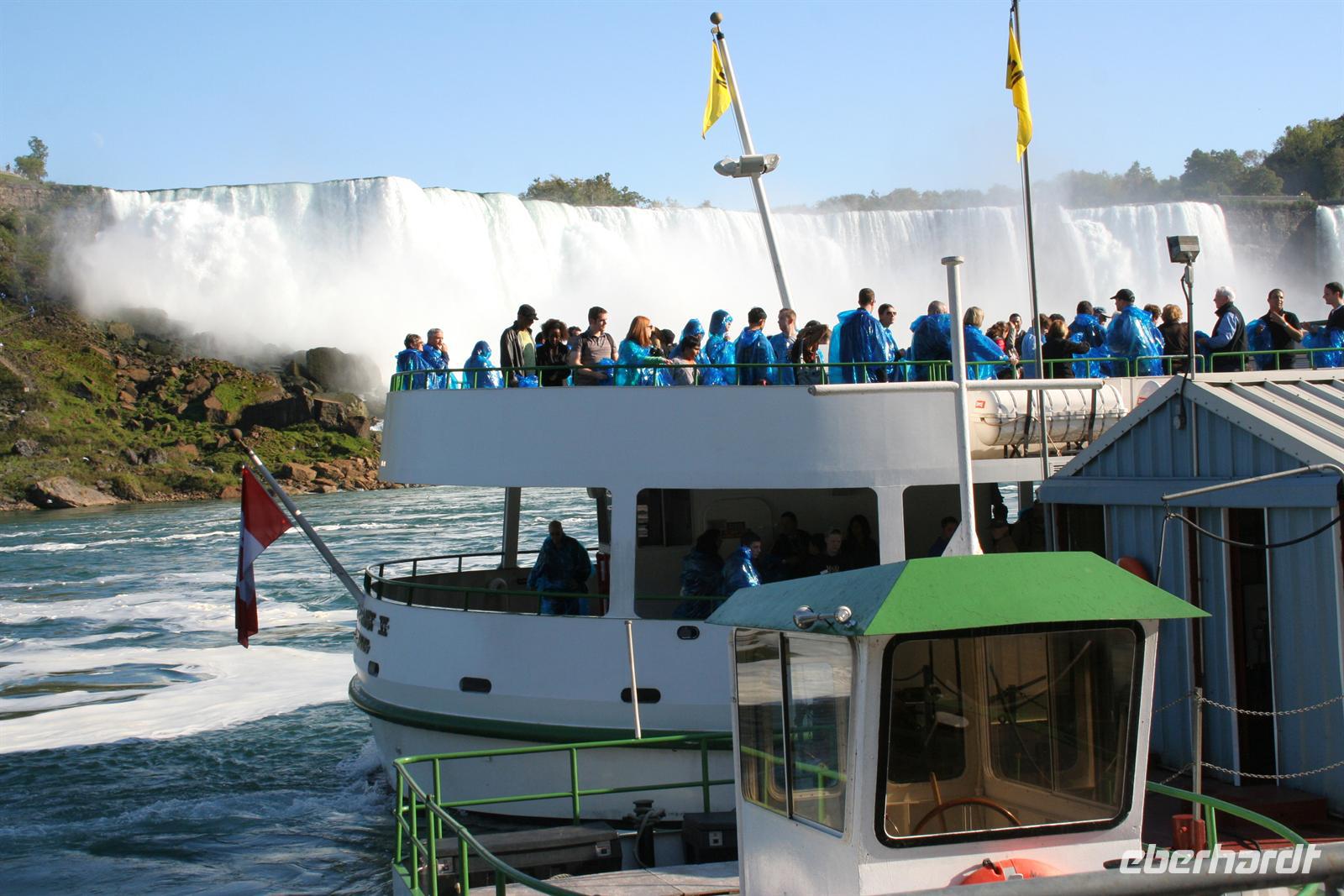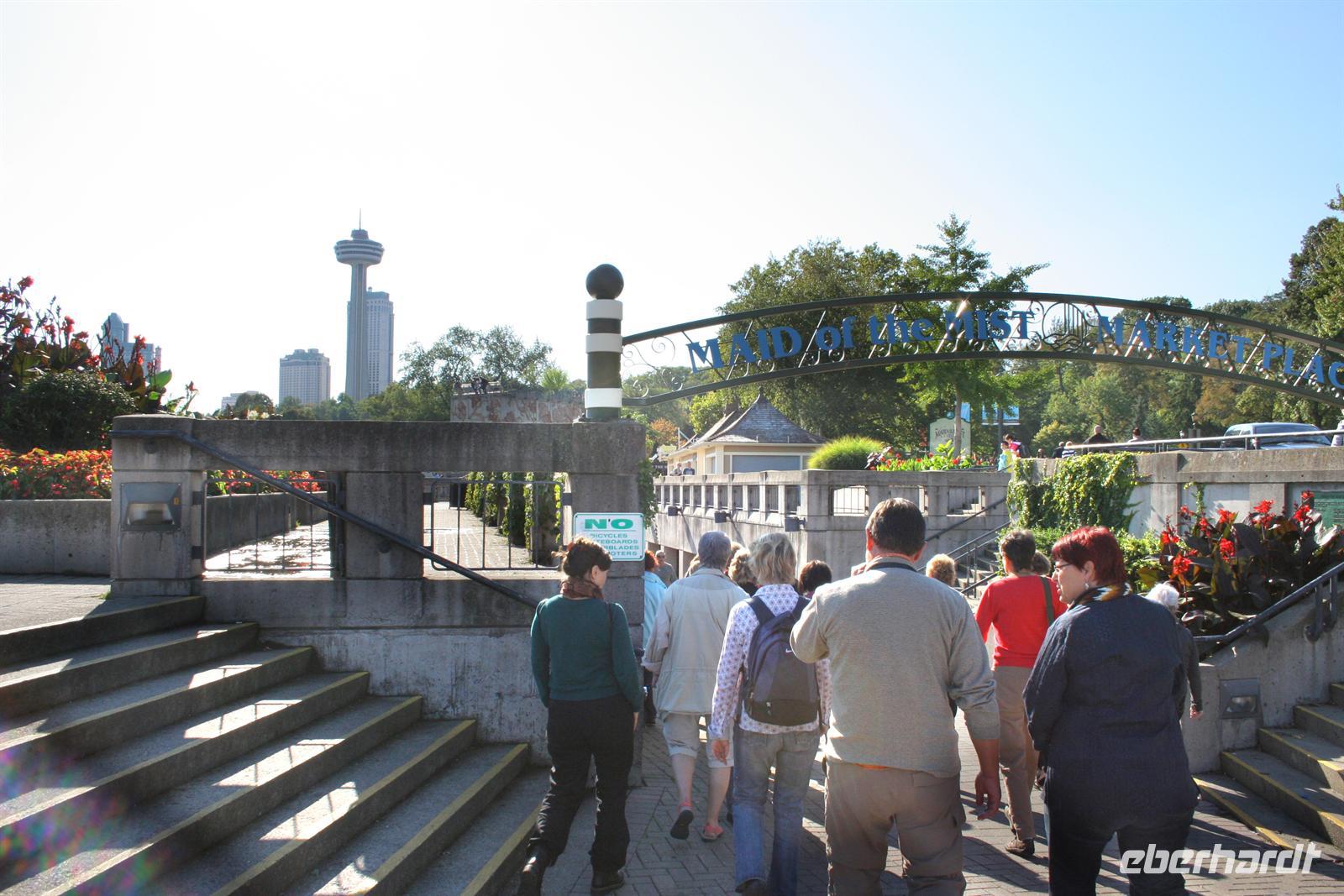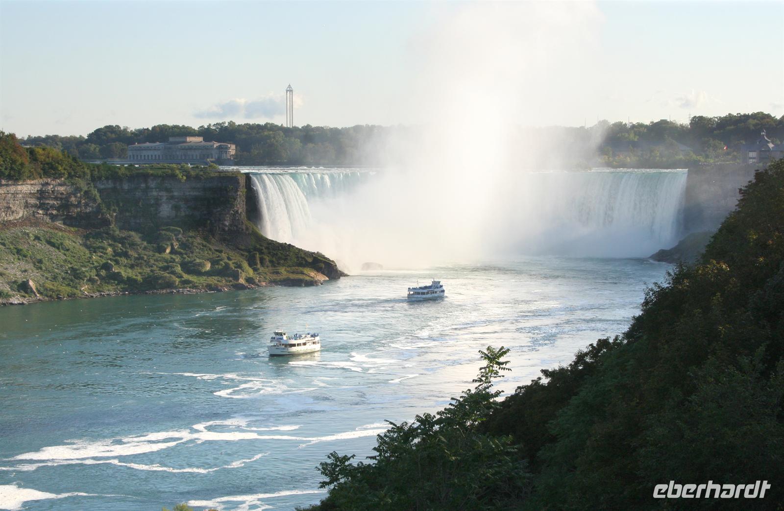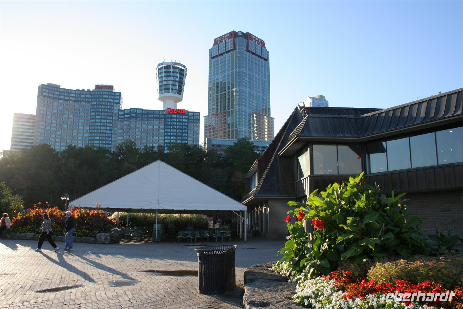Weckruf um 6.30 Uhr. Aufgrund der Zeitverschiebung mehr oder weniger gut ausgeschlafen, treffen wir uns zwischen 7.00 und 7.30 Uhr im Hotelrestaurant zum Frühstück. Die Räume sind nicht so groß, sodass wir teilweise 10 Minuten warten müssen, bis wir nach und nach vom Personal platziert werden. Es ist günstig, etwas zeitlich verteilt zu erscheinen. Das Frühstücksbuffet ist sehr gut und hat für jeden Geschmack etwas zu bieten. Um 8.30 Uhr treffen wir uns zur Abfahrt am Bus. Eine Stadtrundfahrt in Toronto steht auf dem Programm. Wir fahren zunächst in Richtung Ontariosee und CN Tower. Auf dem Weg legen wir einen Fotostopp am Bügeleisen-Haus (Flatiron) und an der Hall of Fame am Brookfield Place ein. Hier bestaunen wir die moderne Architektur aus Glas und Stahl, die einem Wald und einem Kirchenschiff nachempfunden ist.Weiter geht es zum CN Tower. Mit 553 Metern ist der Fernsehturm von Toronto eines der höchsten freistehenden Gebäude der Welt. Brigitta besorgt die Karten und wir fahren nach kurzer Wartezeit mit dem Fahrstuhl hinauf zu den Aussichtsplattformen. Der Himmel klart nach und nach auf und wir bestaunen Toronto und den Ontariosee von oben. Bis zu den Niagara-Fällen kann man heute allerdings nicht schauen. Ein Stück im Inneren ist mit Glasboden versehen, der den Blick nach unten freigibt. Nichts für Menschen mit Höhenangst ;-), aber sonst sehr beeindruckend. Im Untergeschoss gibt es einen Souvenirladen, in dem man auch Postkarten und Modelle vom CN Tower kaufen kann. Die Umsatzsteuer kommt bei den im Laden angegebenen Preisen übrigens immer noch dazu.Dann geht unsere Rundfahrt weiter. Wir sehen das alte und das neue Rathaus und das Parlamentsgebäude. Am Hafen Center legen wir gegen 13.00 Uhr eine kleine Pause zum Einkaufen im Supermarkt und zur Benutzung der Toiletten ein. Die Toilettennutzung ist in Kanada übrigens immer kostenfrei.Schließlich verlassen wir Toronto und machen uns auf den Weg zu den Niagara-Fällen, die etwa 120 Kilometer entfernt liegen. Gegen 15.00 Uhr erreichen wir den hübschen Ort Niagara on the Lake, in dem die Zeit stehen geblieben zu sein scheint. Zeit für einen Bummel haben wir hier leider nicht. Wir legen einen Fotostopp an den Stromschnellen und der 180 Grad Kurve des Niagara-Flusses ein, bevor wir Niagara um 15.45 Uhr erreichen. Wir gehen hinunter zur Anlegestelle der „Maid of the Mist". Hier werden wir mit blauen Regencapes ausgestattet und um 16.15 Uhr beginnt unsere Bootsfahrt an den Niagara-Fällen. Die Boote fahren alle 15 Minuten ab. Die Bootsfahrt dauert etwa eine halbe Stunde. Wir fahren zuerst an den amerikanischen Wasserfällen vorbei, die sich sehr gut fotografieren lassen, weil hier die Gischt nicht so sprüht. Dann geht es hinein in den Horseshoe-Wasserfall der kanadischen Seite. Hier sollte man seine Kamera unbedingt vor dem Spitzwasser schützen und sie unter das Regencape nehmen! Teilweise spritzt das Wasser sehr stark von allen Seiten. Die Bootsfahrt ist ein tolles Erlebnis, das man auf keinen Fall versäumen sollte! Die Regencapes kann man als Andenken behalten. Nach der Bootsfahrt gehen wir etwa 1,5 Kilometer an der Promenade oberhalb der Fälle entlang und nutzen die herrlichen Fotomotive. Am Ende des Fußweges erwartet uns 17.45 Uhr der Bus und wir fahren zum Hotel „Holiday Inn", welches sich gleich neben dem Skylon Tower und dem Imax-Kino befindet. Wir checken ein, machen uns kurz frisch und treffen uns 18.15 Uhr schon wieder, um zum Abendessen im Skylon Tower zu fahren. Den Rückweg gehen wir später zu Fuß. Nachdem Brigitta uns angemeldet hat, geht es nach 10 Minuten Wartezeit mit dem Fahrstuhl hinauf zum Restaurant. Hier sind schon zwei große Tische für uns vorbereitet. Es gibt ein Buffet mit leckeren Salaten, Meeresfrüchten, warmen Speisen und Desserts. Tafelwasser und Kaffee sind wie immer inklusive. Ein Bier kostet 7 CAD, ein Glas kanadischer Hauswein 10 CAD. Von hier oben hat man einen tollen Blick auf die Niagara-Fälle, die farbig beleuchtet werden, sobald die Dunkelheit einsetzt. Wir wurden so platziert, dass wir direkt auf die Fälle schauen konnten, das war toll. Der Service ist freundlich und schnell, das Essen kam super an.Unten im Skylon Tower gibt es Souvenirläden, die auch abends noch geöffnet haben. Gegen 20.30 Uhr gingen wir zurück zum Hotel. Wer will, kann natürlich auch individuell noch einmal zum Wasserfall gehen (ca. 10 Minuten vom Skylon Tower).Die Zimmer im „Holiday Inn by the Falls" sind sehr geräumig und ausgestattet mit Wanne/WC, Föhn, Bügeleisen, Kosmetikartikeln, TV, Radiowecker, Telefon und Klimaanlage. Im Erdgeschoss gibt es auch einen Pool, den man als Hotelgast kostenfrei benutzen kann.Mittwoch, 05.10.2011