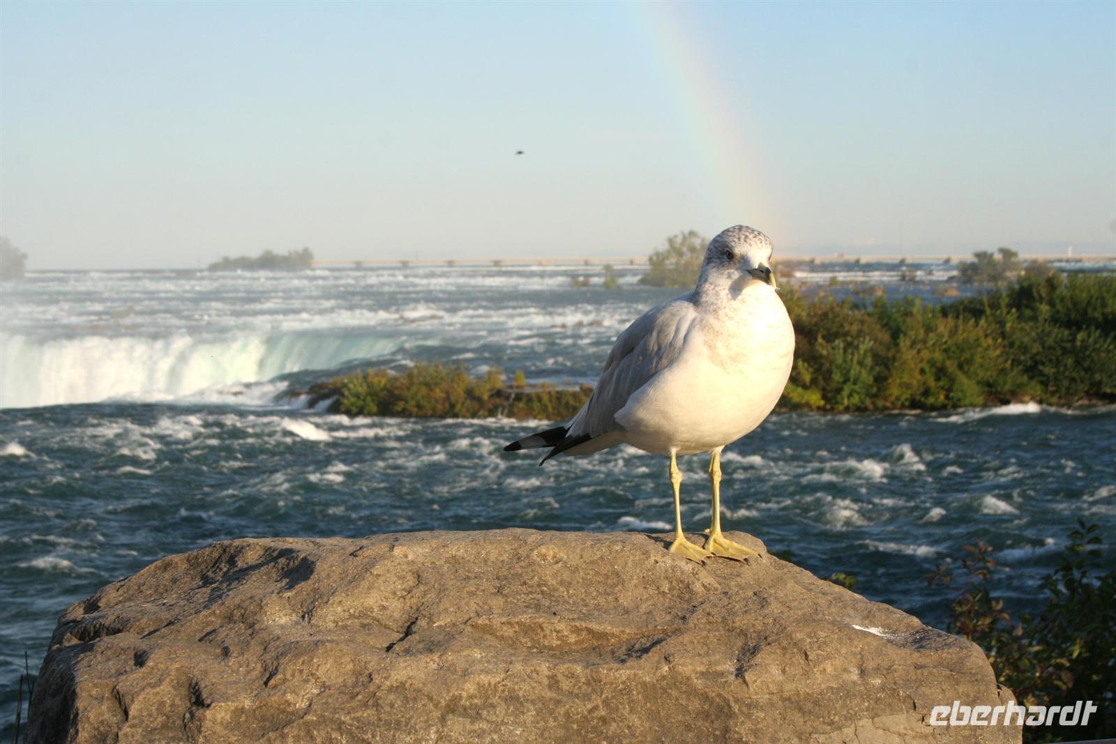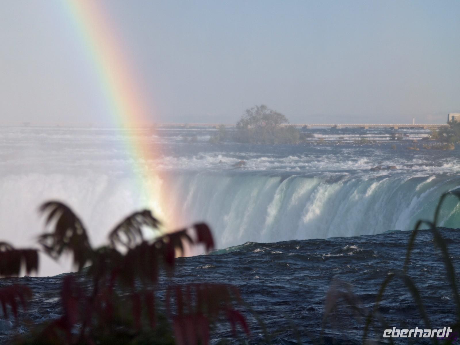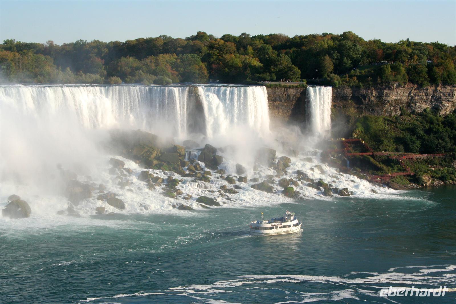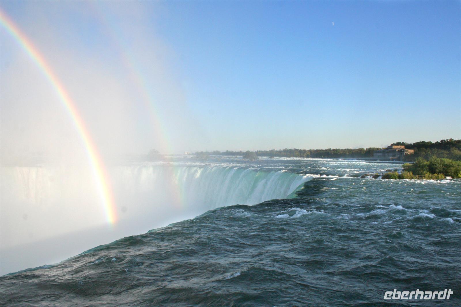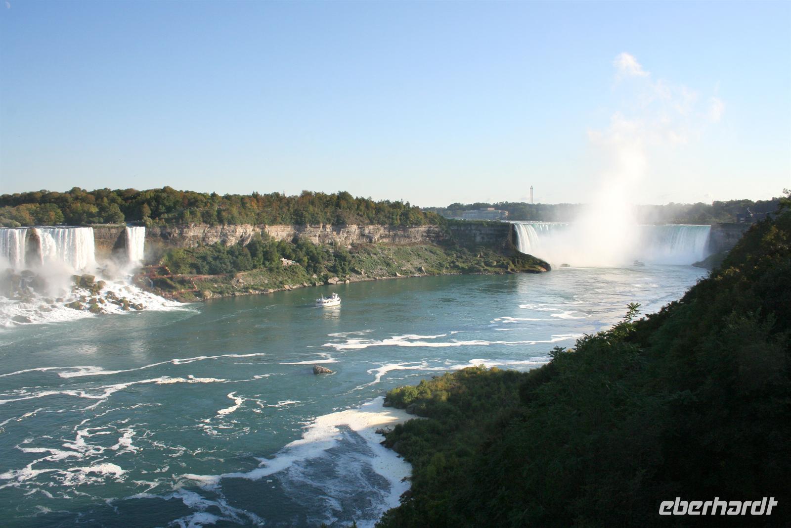 Weckruf um 6.30 Uhr. Aufgrund der Zeitverschiebung mehr oder weniger gut ausgeschlafen, treffen wir uns zwischen 7.00 und 7.30 Uhr im Hotelrestaurant zum Frühstück. Die Räume sind nicht so groß, sodass wir teilweise 10 Minuten warten müssen, bis wir nach und nach vom Personal platziert werden. Es ist günstig, etwas zeitlich verteilt zu erscheinen. Das Frühstücksbuffet ist sehr gut und hat für jeden Geschmack etwas zu bieten. Um 8.30 Uhr treffen wir uns zur Abfahrt am Bus. Eine Stadtrundfahrt in Toronto steht auf dem Programm. Wir fahren zunächst in Richtung Ontariosee und CN Tower. Auf dem Weg legen wir einen Fotostopp am Bügeleisen-Haus (Flatiron) und an der Hall of Fame am Brookfield Place ein. Hier bestaunen wir die moderne Architektur aus Glas und Stahl, die einem Wald und einem Kirchenschiff nachempfunden ist.Weiter geht es zum CN Tower. Mit 553 Metern ist der Fernsehturm von Toronto eines der höchsten freistehenden Gebäude der Welt. Brigitta besorgt die Karten und wir fahren nach kurzer Wartezeit mit dem Fahrstuhl hinauf zu den Aussichtsplattformen. Der Himmel klart nach und nach auf und wir bestaunen Toronto und den Ontariosee von oben. Bis zu den Niagara-Fällen kann man heute allerdings nicht schauen. Ein Stück im Inneren ist mit Glasboden versehen, der den Blick nach unten freigibt. Nichts für Menschen mit Höhenangst ;-), aber sonst sehr beeindruckend. Im Untergeschoss gibt es einen Souvenirladen, in dem man auch Postkarten und Modelle vom CN Tower kaufen kann. Die Umsatzsteuer kommt bei den im Laden angegebenen Preisen übrigens immer noch dazu.Dann geht unsere Rundfahrt weiter. Wir sehen das alte und das neue Rathaus und das Parlamentsgebäude. Am Hafen Center legen wir gegen 13.00 Uhr eine kleine Pause zum Einkaufen im Supermarkt und zur Benutzung der Toiletten ein. Die Toilettennutzung ist in Kanada übrigens immer kostenfrei.Schließlich verlassen wir Toronto und machen uns auf den Weg zu den Niagara-Fällen, die etwa 120 Kilometer entfernt liegen. Gegen 15.00 Uhr erreichen wir den hübschen Ort Niagara on the Lake, in dem die Zeit stehen geblieben zu sein scheint. Zeit für einen Bummel haben wir hier leider nicht. Wir legen einen Fotostopp an den Stromschnellen und der 180 Grad Kurve des Niagara-Flusses ein, bevor wir Niagara um 15.45 Uhr erreichen. Wir gehen hinunter zur Anlegestelle der „Maid of the Mist". Hier werden wir mit blauen Regencapes ausgestattet und um 16.15 Uhr beginnt unsere Bootsfahrt an den Niagara-Fällen. Die Boote fahren alle 15 Minuten ab. Die Bootsfahrt dauert etwa eine halbe Stunde. Wir fahren zuerst an den amerikanischen Wasserfällen vorbei, die sich sehr gut fotografieren lassen, weil hier die Gischt nicht so sprüht. Dann geht es hinein in den Horseshoe-Wasserfall der kanadischen Seite. Hier sollte man seine Kamera unbedingt vor dem Spitzwasser schützen und sie unter das Regencape nehmen! Teilweise spritzt das Wasser sehr stark von allen Seiten. Die Bootsfahrt ist ein tolles Erlebnis, das man auf keinen Fall versäumen sollte! Die Regencapes kann man als Andenken behalten. Nach der Bootsfahrt gehen wir etwa 1,5 Kilometer an der Promenade oberhalb der Fälle entlang und nutzen die herrlichen Fotomotive. Am Ende des Fußweges erwartet uns 17.45 Uhr der Bus und wir fahren zum Hotel „Holiday Inn", welches sich gleich neben dem Skylon Tower und dem Imax-Kino befindet. Wir checken ein, machen uns kurz frisch und treffen uns 18.15 Uhr schon wieder, um zum Abendessen im Skylon Tower zu fahren. Den Rückweg gehen wir später zu Fuß. Nachdem Brigitta uns angemeldet hat, geht es nach 10 Minuten Wartezeit mit dem Fahrstuhl hinauf zum Restaurant. Hier sind schon zwei große Tische für uns vorbereitet. Es gibt ein Buffet mit leckeren Salaten, Meeresfrüchten, warmen Speisen und Desserts. Tafelwasser und Kaffee sind wie immer inklusive. Ein Bier kostet 7 CAD, ein Glas kanadischer Hauswein 10 CAD. Von hier oben hat man einen tollen Blick auf die Niagara-Fälle, die farbig beleuchtet werden, sobald die Dunkelheit einsetzt. Wir wurden so platziert, dass wir direkt auf die Fälle schauen konnten, das war toll. Der Service ist freundlich und schnell, das Essen kam super an.Unten im Skylon Tower gibt es Souvenirläden, die auch abends noch geöffnet haben. Gegen 20.30 Uhr gingen wir zurück zum Hotel. Wer will, kann natürlich auch individuell noch einmal zum Wasserfall gehen (ca. 10 Minuten vom Skylon Tower).Die Zimmer im „Holiday Inn by the Falls" sind sehr geräumig und ausgestattet mit Wanne/WC, Föhn, Bügeleisen, Kosmetikartikeln, TV, Radiowecker, Telefon und Klimaanlage. Im Erdgeschoss gibt es auch einen Pool, den man als Hotelgast kostenfrei benutzen kann.Mittwoch, 05.10.2011