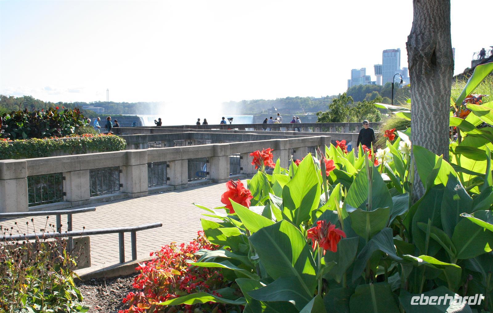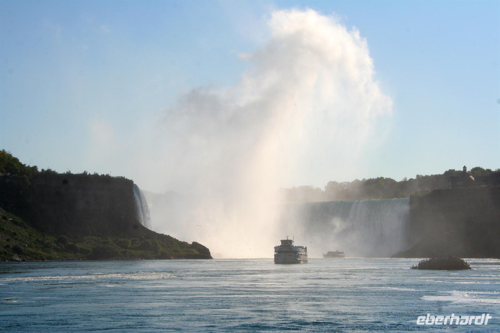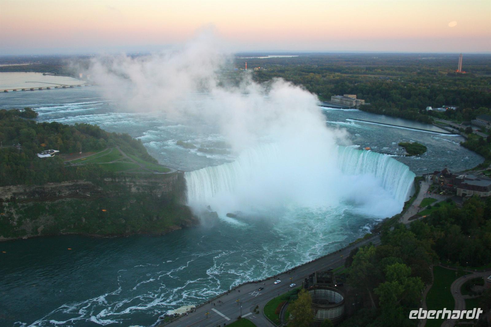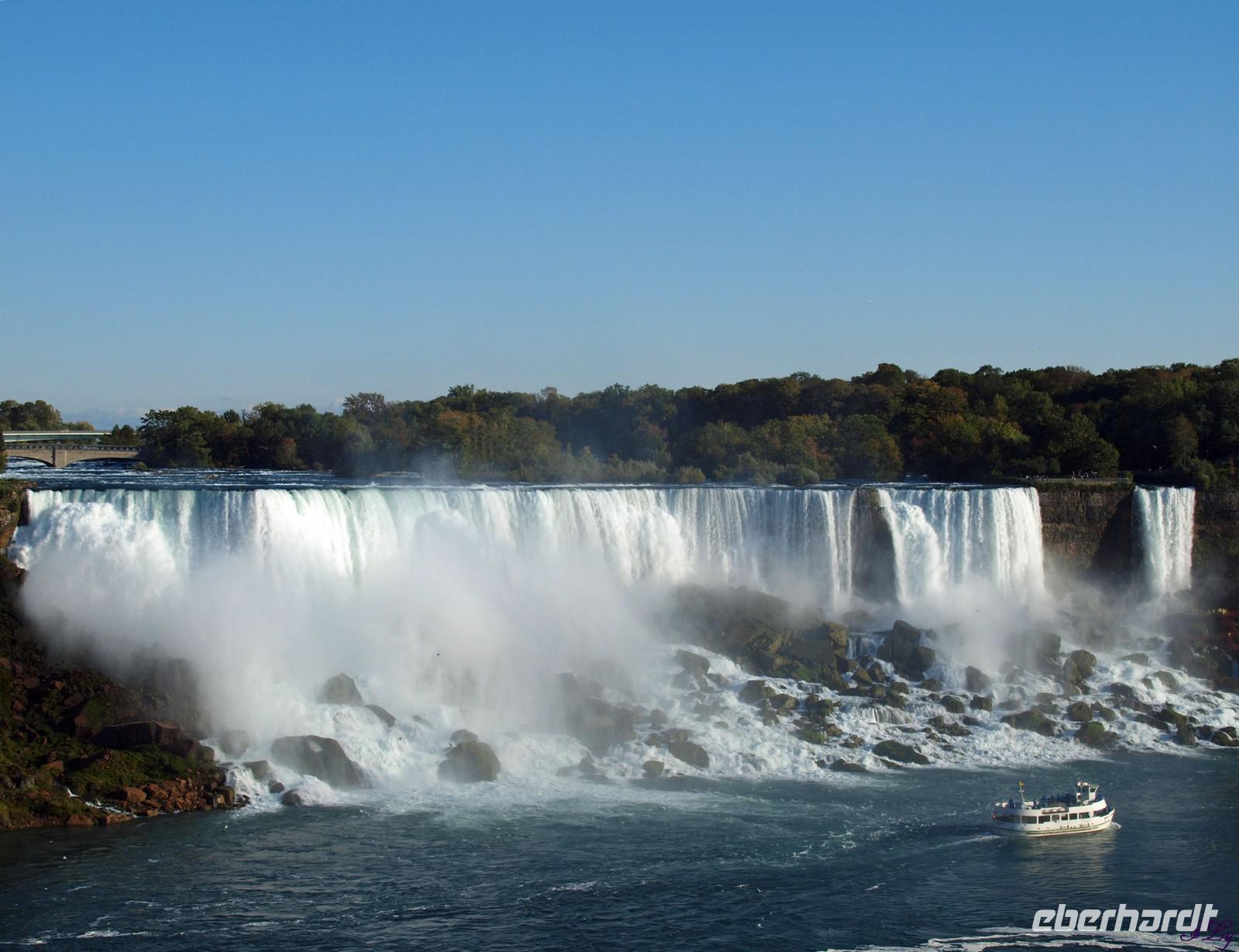 Weckruf um 6.30 Uhr. Aufgrund der Zeitverschiebung mehr oder weniger gut ausgeschlafen, treffen wir uns zwischen 7.00 und 7.30 Uhr im Hotelrestaurant zum Frühstück. Die Räume sind nicht so groß, sodass wir teilweise 10 Minuten warten müssen, bis wir nach und nach vom Personal platziert werden. Es ist günstig, etwas zeitlich verteilt zu erscheinen. Das Frühstücksbuffet ist sehr gut und hat für jeden Geschmack etwas zu bieten. Um 8.30 Uhr treffen wir uns zur Abfahrt am Bus. Eine Stadtrundfahrt in Toronto steht auf dem Programm. Wir fahren zunächst in Richtung Ontariosee und CN Tower. Auf dem Weg legen wir einen Fotostopp am Bügeleisen-Haus (Flatiron) und an der Hall of Fame am Brookfield Place ein. Hier bestaunen wir die moderne Architektur aus Glas und Stahl, die einem Wald und einem Kirchenschiff nachempfunden ist.Weiter geht es zum CN Tower. Mit 553 Metern ist der Fernsehturm von Toronto eines der höchsten freistehenden Gebäude der Welt. Brigitta besorgt die Karten und wir fahren nach kurzer Wartezeit mit dem Fahrstuhl hinauf zu den Aussichtsplattformen. Der Himmel klart nach und nach auf und wir bestaunen Toronto und den Ontariosee von oben. Bis zu den Niagara-Fällen kann man heute allerdings nicht schauen. Ein Stück im Inneren ist mit Glasboden versehen, der den Blick nach unten freigibt. Nichts für Menschen mit Höhenangst ;-), aber sonst sehr beeindruckend. Im Untergeschoss gibt es einen Souvenirladen, in dem man auch Postkarten und Modelle vom CN Tower kaufen kann. Die Umsatzsteuer kommt bei den im Laden angegebenen Preisen übrigens immer noch dazu.Dann geht unsere Rundfahrt weiter. Wir sehen das alte und das neue Rathaus und das Parlamentsgebäude. Am Hafen Center legen wir gegen 13.00 Uhr eine kleine Pause zum Einkaufen im Supermarkt und zur Benutzung der Toiletten ein. Die Toilettennutzung ist in Kanada übrigens immer kostenfrei.Schließlich verlassen wir Toronto und machen uns auf den Weg zu den Niagara-Fällen, die etwa 120 Kilometer entfernt liegen. Gegen 15.00 Uhr erreichen wir den hübschen Ort Niagara on the Lake, in dem die Zeit stehen geblieben zu sein scheint. Zeit für einen Bummel haben wir hier leider nicht. Wir legen einen Fotostopp an den Stromschnellen und der 180 Grad Kurve des Niagara-Flusses ein, bevor wir Niagara um 15.45 Uhr erreichen. Wir gehen hinunter zur Anlegestelle der „Maid of the Mist". Hier werden wir mit blauen Regencapes ausgestattet und um 16.15 Uhr beginnt unsere Bootsfahrt an den Niagara-Fällen. Die Boote fahren alle 15 Minuten ab. Die Bootsfahrt dauert etwa eine halbe Stunde. Wir fahren zuerst an den amerikanischen Wasserfällen vorbei, die sich sehr gut fotografieren lassen, weil hier die Gischt nicht so sprüht. Dann geht es hinein in den Horseshoe-Wasserfall der kanadischen Seite. Hier sollte man seine Kamera unbedingt vor dem Spitzwasser schützen und sie unter das Regencape nehmen! Teilweise spritzt das Wasser sehr stark von allen Seiten. Die Bootsfahrt ist ein tolles Erlebnis, das man auf keinen Fall versäumen sollte! Die Regencapes kann man als Andenken behalten. Nach der Bootsfahrt gehen wir etwa 1,5 Kilometer an der Promenade oberhalb der Fälle entlang und nutzen die herrlichen Fotomotive. Am Ende des Fußweges erwartet uns 17.45 Uhr der Bus und wir fahren zum Hotel „Holiday Inn", welches sich gleich neben dem Skylon Tower und dem Imax-Kino befindet. Wir checken ein, machen uns kurz frisch und treffen uns 18.15 Uhr schon wieder, um zum Abendessen im Skylon Tower zu fahren. Den Rückweg gehen wir später zu Fuß. Nachdem Brigitta uns angemeldet hat, geht es nach 10 Minuten Wartezeit mit dem Fahrstuhl hinauf zum Restaurant. Hier sind schon zwei große Tische für uns vorbereitet. Es gibt ein Buffet mit leckeren Salaten, Meeresfrüchten, warmen Speisen und Desserts. Tafelwasser und Kaffee sind wie immer inklusive. Ein Bier kostet 7 CAD, ein Glas kanadischer Hauswein 10 CAD. Von hier oben hat man einen tollen Blick auf die Niagara-Fälle, die farbig beleuchtet werden, sobald die Dunkelheit einsetzt. Wir wurden so platziert, dass wir direkt auf die Fälle schauen konnten, das war toll. Der Service ist freundlich und schnell, das Essen kam super an.Unten im Skylon Tower gibt es Souvenirläden, die auch abends noch geöffnet haben. Gegen 20.30 Uhr gingen wir zurück zum Hotel. Wer will, kann natürlich auch individuell noch einmal zum Wasserfall gehen (ca. 10 Minuten vom Skylon Tower).Die Zimmer im „Holiday Inn by the Falls" sind sehr geräumig und ausgestattet mit Wanne/WC, Föhn, Bügeleisen, Kosmetikartikeln, TV, Radiowecker, Telefon und Klimaanlage. Im Erdgeschoss gibt es auch einen Pool, den man als Hotelgast kostenfrei benutzen kann.Mittwoch, 05.10.2011