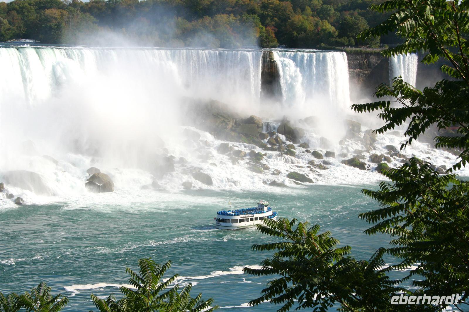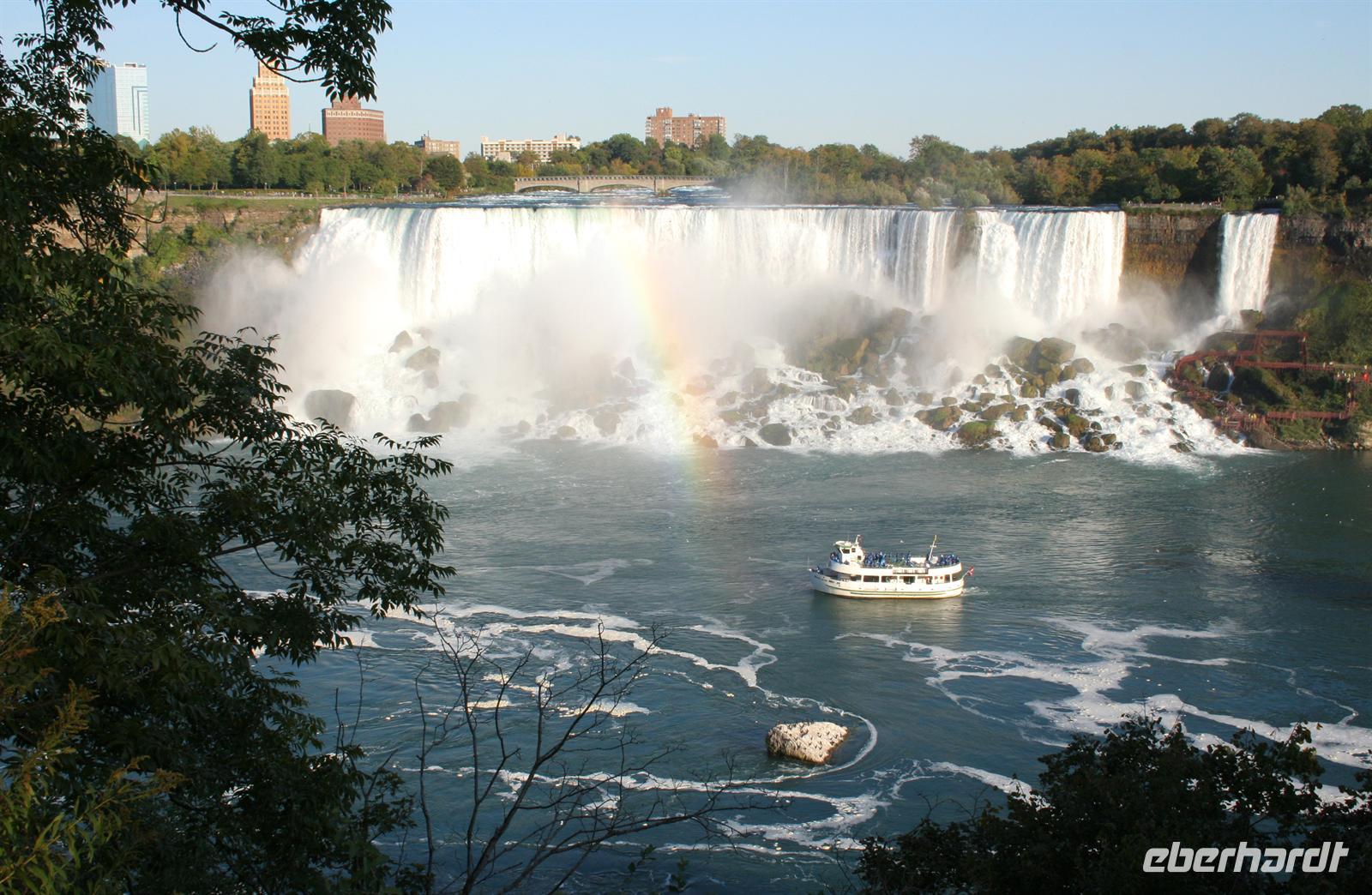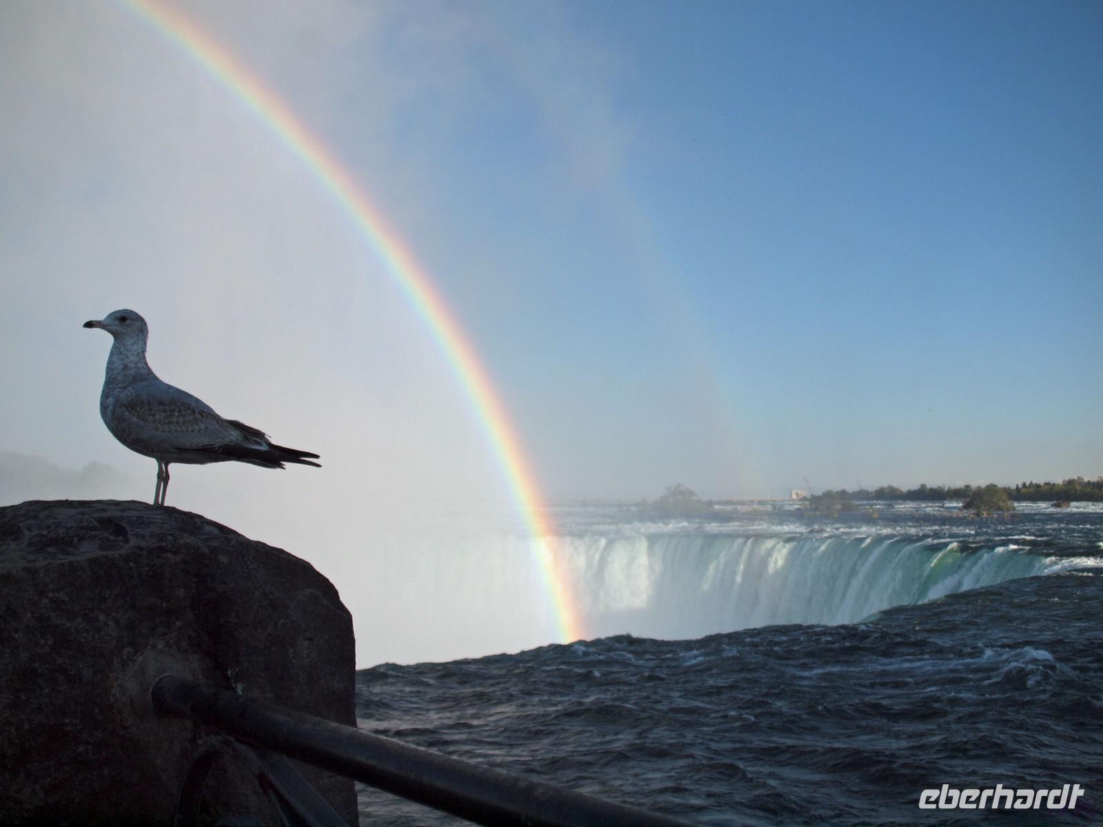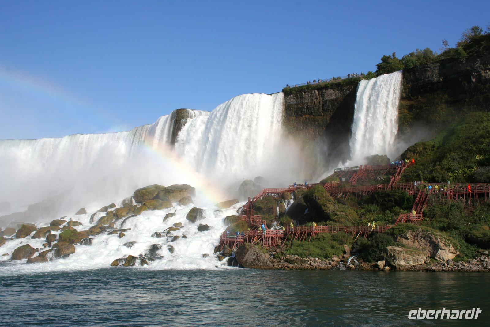 Weckruf um 6.30 Uhr. Aufgrund der Zeitverschiebung mehr oder weniger gut ausgeschlafen, treffen wir uns zwischen 7.00 und 7.30 Uhr im Hotelrestaurant zum Frühstück. Die Räume sind nicht so groß, sodass wir teilweise 10 Minuten warten müssen, bis wir nach und nach vom Personal platziert werden. Es ist günstig, etwas zeitlich verteilt zu erscheinen. Das Frühstücksbuffet ist sehr gut und hat für jeden Geschmack etwas zu bieten. Um 8.30 Uhr treffen wir uns zur Abfahrt am Bus. Eine Stadtrundfahrt in Toronto steht auf dem Programm. Wir fahren zunächst in Richtung Ontariosee und CN Tower. Auf dem Weg legen wir einen Fotostopp am Bügeleisen-Haus (Flatiron) und an der Hall of Fame am Brookfield Place ein. Hier bestaunen wir die moderne Architektur aus Glas und Stahl, die einem Wald und einem Kirchenschiff nachempfunden ist.Weiter geht es zum CN Tower. Mit 553 Metern ist der Fernsehturm von Toronto eines der höchsten freistehenden Gebäude der Welt. Brigitta besorgt die Karten und wir fahren nach kurzer Wartezeit mit dem Fahrstuhl hinauf zu den Aussichtsplattformen. Der Himmel klart nach und nach auf und wir bestaunen Toronto und den Ontariosee von oben. Bis zu den Niagara-Fällen kann man heute allerdings nicht schauen. Ein Stück im Inneren ist mit Glasboden versehen, der den Blick nach unten freigibt. Nichts für Menschen mit Höhenangst ;-), aber sonst sehr beeindruckend. Im Untergeschoss gibt es einen Souvenirladen, in dem man auch Postkarten und Modelle vom CN Tower kaufen kann. Die Umsatzsteuer kommt bei den im Laden angegebenen Preisen übrigens immer noch dazu.Dann geht unsere Rundfahrt weiter. Wir sehen das alte und das neue Rathaus und das Parlamentsgebäude. Am Hafen Center legen wir gegen 13.00 Uhr eine kleine Pause zum Einkaufen im Supermarkt und zur Benutzung der Toiletten ein. Die Toilettennutzung ist in Kanada übrigens immer kostenfrei.Schließlich verlassen wir Toronto und machen uns auf den Weg zu den Niagara-Fällen, die etwa 120 Kilometer entfernt liegen. Gegen 15.00 Uhr erreichen wir den hübschen Ort Niagara on the Lake, in dem die Zeit stehen geblieben zu sein scheint. Zeit für einen Bummel haben wir hier leider nicht. Wir legen einen Fotostopp an den Stromschnellen und der 180 Grad Kurve des Niagara-Flusses ein, bevor wir Niagara um 15.45 Uhr erreichen. Wir gehen hinunter zur Anlegestelle der „Maid of the Mist". Hier werden wir mit blauen Regencapes ausgestattet und um 16.15 Uhr beginnt unsere Bootsfahrt an den Niagara-Fällen. Die Boote fahren alle 15 Minuten ab. Die Bootsfahrt dauert etwa eine halbe Stunde. Wir fahren zuerst an den amerikanischen Wasserfällen vorbei, die sich sehr gut fotografieren lassen, weil hier die Gischt nicht so sprüht. Dann geht es hinein in den Horseshoe-Wasserfall der kanadischen Seite. Hier sollte man seine Kamera unbedingt vor dem Spitzwasser schützen und sie unter das Regencape nehmen! Teilweise spritzt das Wasser sehr stark von allen Seiten. Die Bootsfahrt ist ein tolles Erlebnis, das man auf keinen Fall versäumen sollte! Die Regencapes kann man als Andenken behalten. Nach der Bootsfahrt gehen wir etwa 1,5 Kilometer an der Promenade oberhalb der Fälle entlang und nutzen die herrlichen Fotomotive. Am Ende des Fußweges erwartet uns 17.45 Uhr der Bus und wir fahren zum Hotel „Holiday Inn", welches sich gleich neben dem Skylon Tower und dem Imax-Kino befindet. Wir checken ein, machen uns kurz frisch und treffen uns 18.15 Uhr schon wieder, um zum Abendessen im Skylon Tower zu fahren. Den Rückweg gehen wir später zu Fuß. Nachdem Brigitta uns angemeldet hat, geht es nach 10 Minuten Wartezeit mit dem Fahrstuhl hinauf zum Restaurant. Hier sind schon zwei große Tische für uns vorbereitet. Es gibt ein Buffet mit leckeren Salaten, Meeresfrüchten, warmen Speisen und Desserts. Tafelwasser und Kaffee sind wie immer inklusive. Ein Bier kostet 7 CAD, ein Glas kanadischer Hauswein 10 CAD. Von hier oben hat man einen tollen Blick auf die Niagara-Fälle, die farbig beleuchtet werden, sobald die Dunkelheit einsetzt. Wir wurden so platziert, dass wir direkt auf die Fälle schauen konnten, das war toll. Der Service ist freundlich und schnell, das Essen kam super an.Unten im Skylon Tower gibt es Souvenirläden, die auch abends noch geöffnet haben. Gegen 20.30 Uhr gingen wir zurück zum Hotel. Wer will, kann natürlich auch individuell noch einmal zum Wasserfall gehen (ca. 10 Minuten vom Skylon Tower).Die Zimmer im „Holiday Inn by the Falls" sind sehr geräumig und ausgestattet mit Wanne/WC, Föhn, Bügeleisen, Kosmetikartikeln, TV, Radiowecker, Telefon und Klimaanlage. Im Erdgeschoss gibt es auch einen Pool, den man als Hotelgast kostenfrei benutzen kann.Mittwoch, 05.10.2011