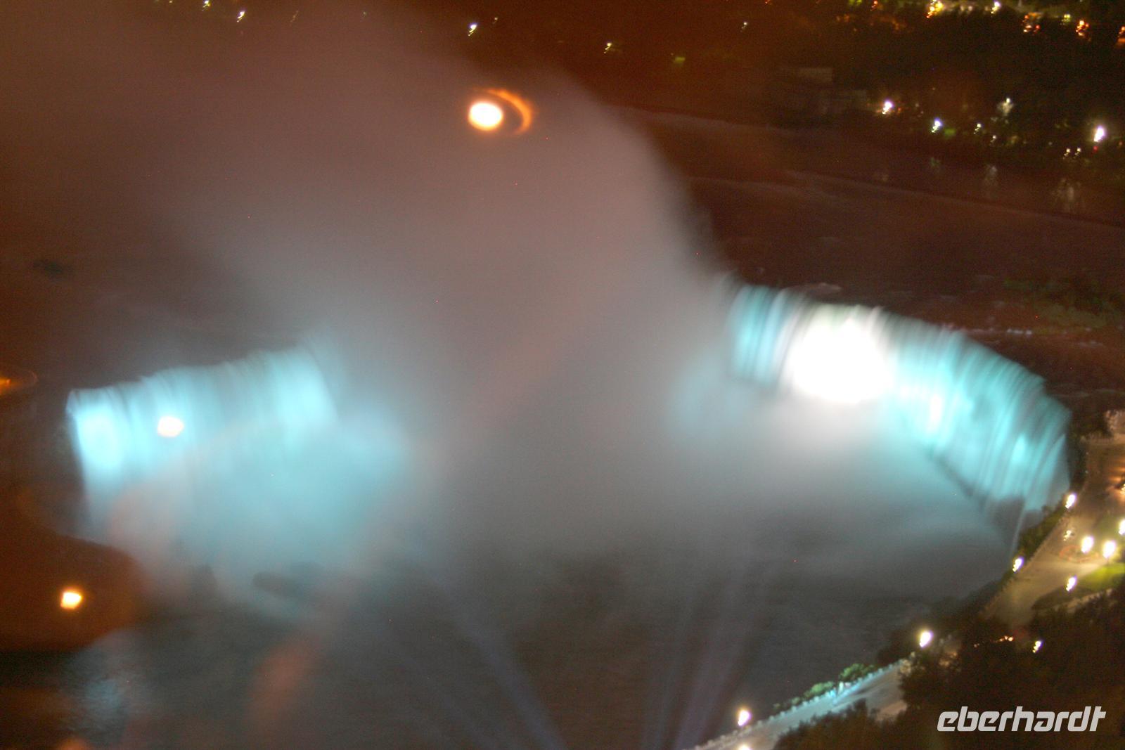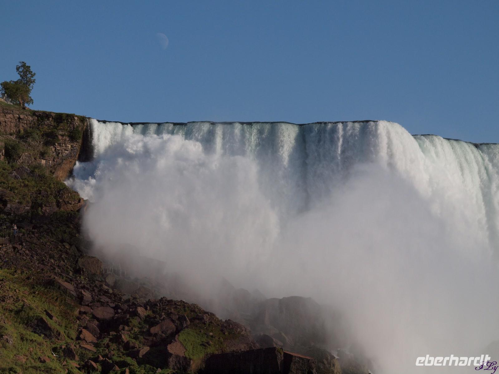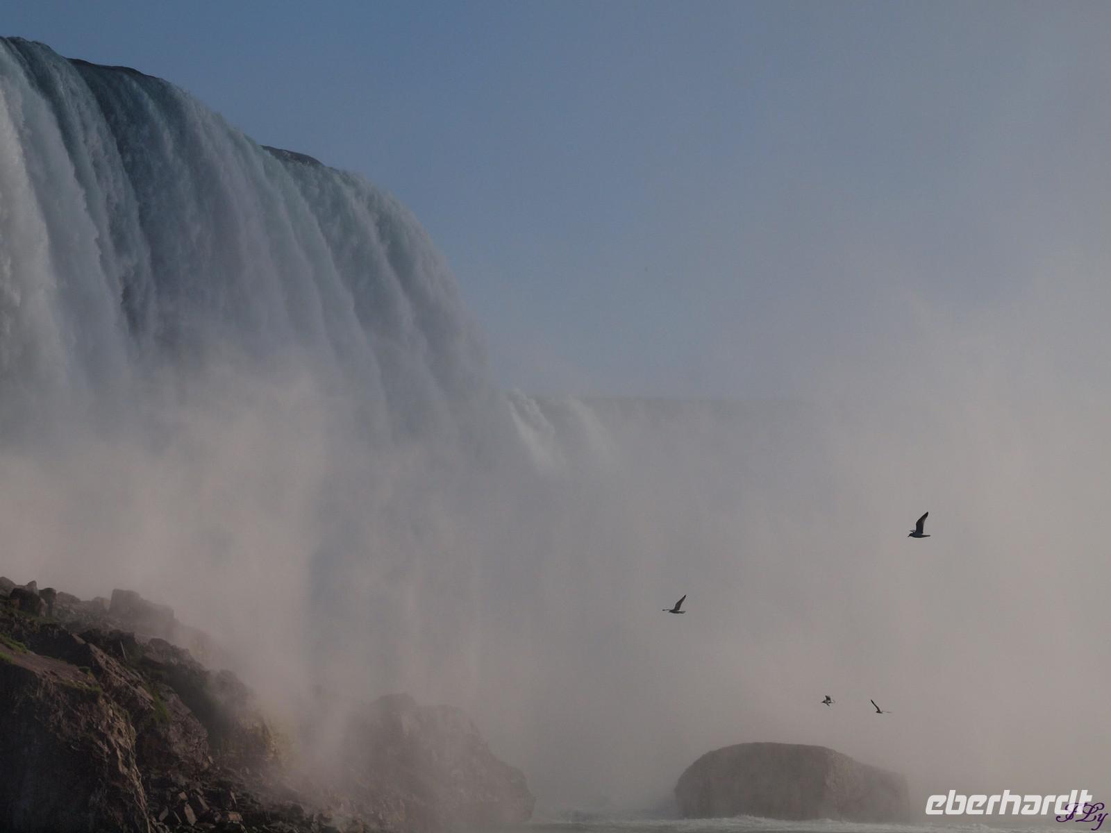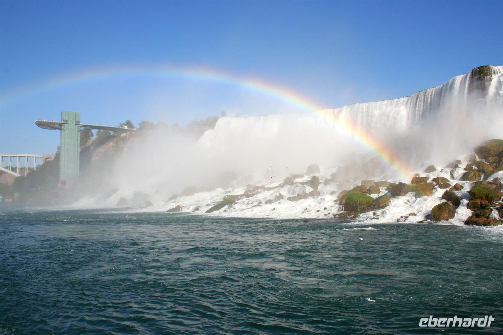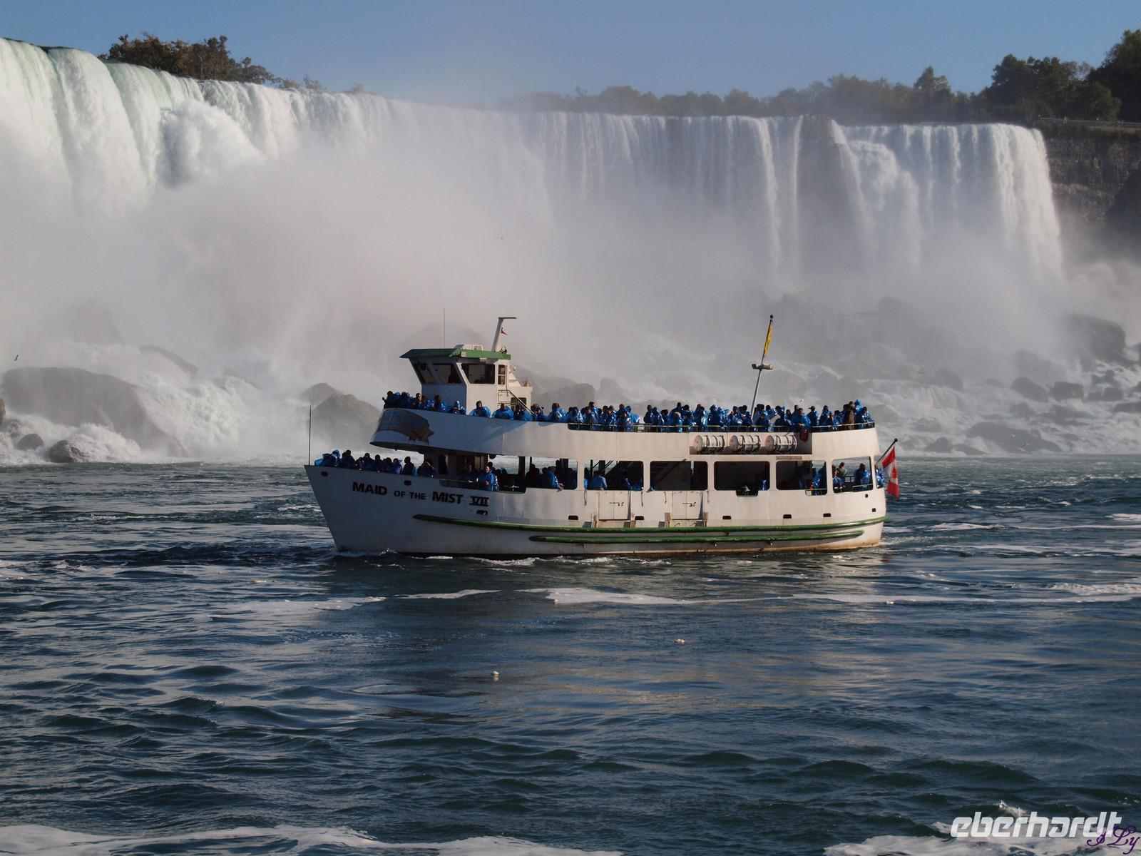 Weckruf um 6.30 Uhr. Aufgrund der Zeitverschiebung mehr oder weniger gut ausgeschlafen, treffen wir uns zwischen 7.00 und 7.30 Uhr im Hotelrestaurant zum Frühstück. Die Räume sind nicht so groß, sodass wir teilweise 10 Minuten warten müssen, bis wir nach und nach vom Personal platziert werden. Es ist günstig, etwas zeitlich verteilt zu erscheinen. Das Frühstücksbuffet ist sehr gut und hat für jeden Geschmack etwas zu bieten. Um 8.30 Uhr treffen wir uns zur Abfahrt am Bus. Eine Stadtrundfahrt in Toronto steht auf dem Programm. Wir fahren zunächst in Richtung Ontariosee und CN Tower. Auf dem Weg legen wir einen Fotostopp am Bügeleisen-Haus (Flatiron) und an der Hall of Fame am Brookfield Place ein. Hier bestaunen wir die moderne Architektur aus Glas und Stahl, die einem Wald und einem Kirchenschiff nachempfunden ist.Weiter geht es zum CN Tower. Mit 553 Metern ist der Fernsehturm von Toronto eines der höchsten freistehenden Gebäude der Welt. Brigitta besorgt die Karten und wir fahren nach kurzer Wartezeit mit dem Fahrstuhl hinauf zu den Aussichtsplattformen. Der Himmel klart nach und nach auf und wir bestaunen Toronto und den Ontariosee von oben. Bis zu den Niagara-Fällen kann man heute allerdings nicht schauen. Ein Stück im Inneren ist mit Glasboden versehen, der den Blick nach unten freigibt. Nichts für Menschen mit Höhenangst ;-), aber sonst sehr beeindruckend. Im Untergeschoss gibt es einen Souvenirladen, in dem man auch Postkarten und Modelle vom CN Tower kaufen kann. Die Umsatzsteuer kommt bei den im Laden angegebenen Preisen übrigens immer noch dazu.Dann geht unsere Rundfahrt weiter. Wir sehen das alte und das neue Rathaus und das Parlamentsgebäude. Am Hafen Center legen wir gegen 13.00 Uhr eine kleine Pause zum Einkaufen im Supermarkt und zur Benutzung der Toiletten ein. Die Toilettennutzung ist in Kanada übrigens immer kostenfrei.Schließlich verlassen wir Toronto und machen uns auf den Weg zu den Niagara-Fällen, die etwa 120 Kilometer entfernt liegen. Gegen 15.00 Uhr erreichen wir den hübschen Ort Niagara on the Lake, in dem die Zeit stehen geblieben zu sein scheint. Zeit für einen Bummel haben wir hier leider nicht. Wir legen einen Fotostopp an den Stromschnellen und der 180 Grad Kurve des Niagara-Flusses ein, bevor wir Niagara um 15.45 Uhr erreichen. Wir gehen hinunter zur Anlegestelle der „Maid of the Mist". Hier werden wir mit blauen Regencapes ausgestattet und um 16.15 Uhr beginnt unsere Bootsfahrt an den Niagara-Fällen. Die Boote fahren alle 15 Minuten ab. Die Bootsfahrt dauert etwa eine halbe Stunde. Wir fahren zuerst an den amerikanischen Wasserfällen vorbei, die sich sehr gut fotografieren lassen, weil hier die Gischt nicht so sprüht. Dann geht es hinein in den Horseshoe-Wasserfall der kanadischen Seite. Hier sollte man seine Kamera unbedingt vor dem Spitzwasser schützen und sie unter das Regencape nehmen! Teilweise spritzt das Wasser sehr stark von allen Seiten. Die Bootsfahrt ist ein tolles Erlebnis, das man auf keinen Fall versäumen sollte! Die Regencapes kann man als Andenken behalten. Nach der Bootsfahrt gehen wir etwa 1,5 Kilometer an der Promenade oberhalb der Fälle entlang und nutzen die herrlichen Fotomotive. Am Ende des Fußweges erwartet uns 17.45 Uhr der Bus und wir fahren zum Hotel „Holiday Inn", welches sich gleich neben dem Skylon Tower und dem Imax-Kino befindet. Wir checken ein, machen uns kurz frisch und treffen uns 18.15 Uhr schon wieder, um zum Abendessen im Skylon Tower zu fahren. Den Rückweg gehen wir später zu Fuß. Nachdem Brigitta uns angemeldet hat, geht es nach 10 Minuten Wartezeit mit dem Fahrstuhl hinauf zum Restaurant. Hier sind schon zwei große Tische für uns vorbereitet. Es gibt ein Buffet mit leckeren Salaten, Meeresfrüchten, warmen Speisen und Desserts. Tafelwasser und Kaffee sind wie immer inklusive. Ein Bier kostet 7 CAD, ein Glas kanadischer Hauswein 10 CAD. Von hier oben hat man einen tollen Blick auf die Niagara-Fälle, die farbig beleuchtet werden, sobald die Dunkelheit einsetzt. Wir wurden so platziert, dass wir direkt auf die Fälle schauen konnten, das war toll. Der Service ist freundlich und schnell, das Essen kam super an.Unten im Skylon Tower gibt es Souvenirläden, die auch abends noch geöffnet haben. Gegen 20.30 Uhr gingen wir zurück zum Hotel. Wer will, kann natürlich auch individuell noch einmal zum Wasserfall gehen (ca. 10 Minuten vom Skylon Tower).Die Zimmer im „Holiday Inn by the Falls" sind sehr geräumig und ausgestattet mit Wanne/WC, Föhn, Bügeleisen, Kosmetikartikeln, TV, Radiowecker, Telefon und Klimaanlage. Im Erdgeschoss gibt es auch einen Pool, den man als Hotelgast kostenfrei benutzen kann.Mittwoch, 05.10.2011