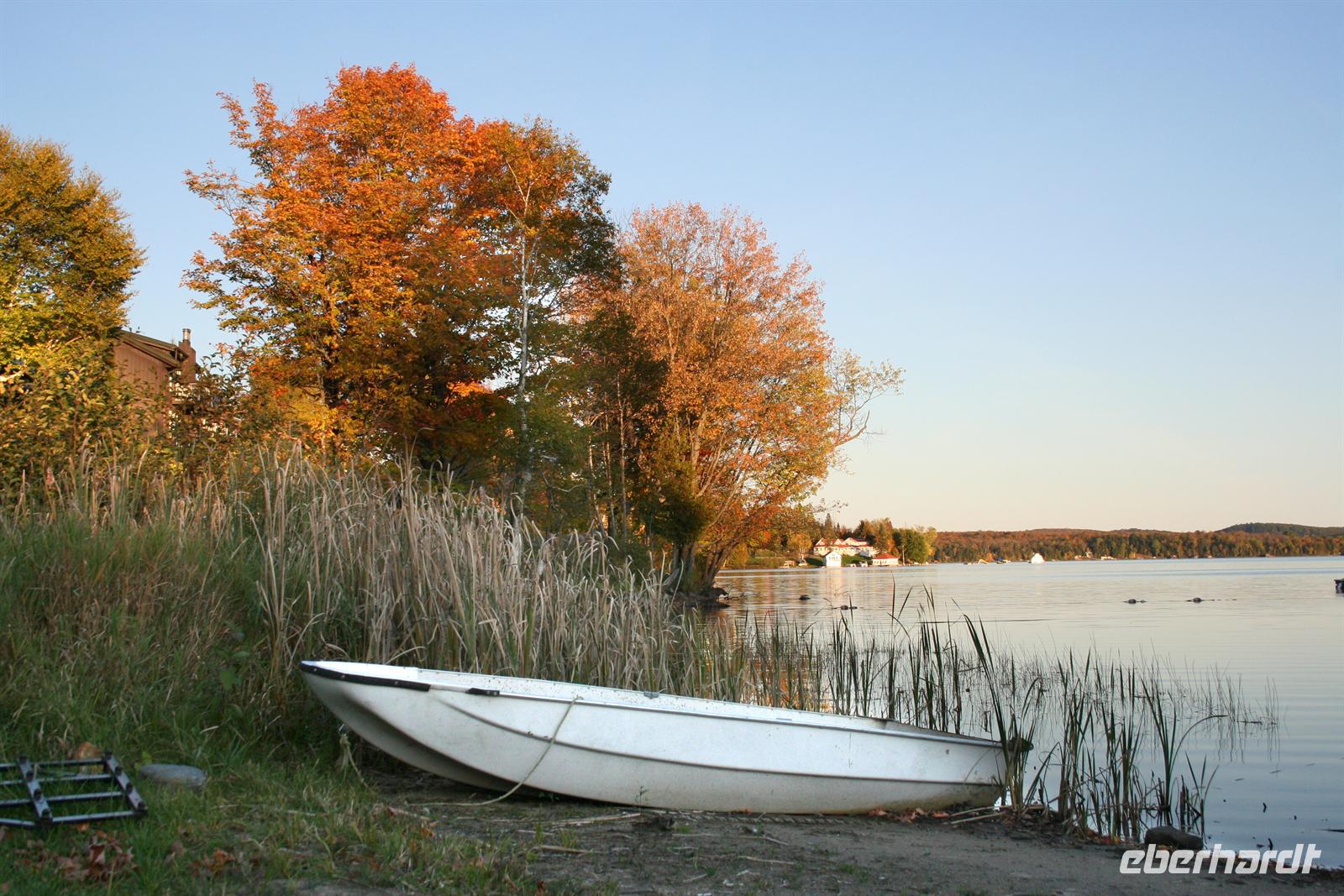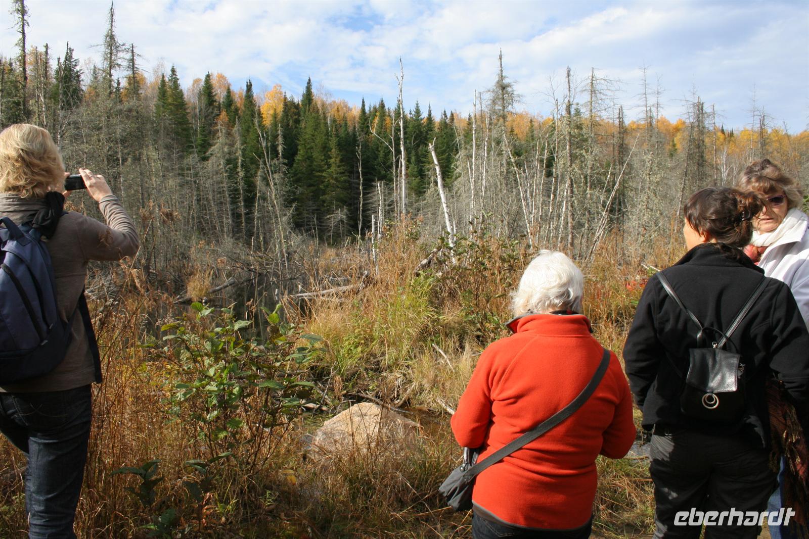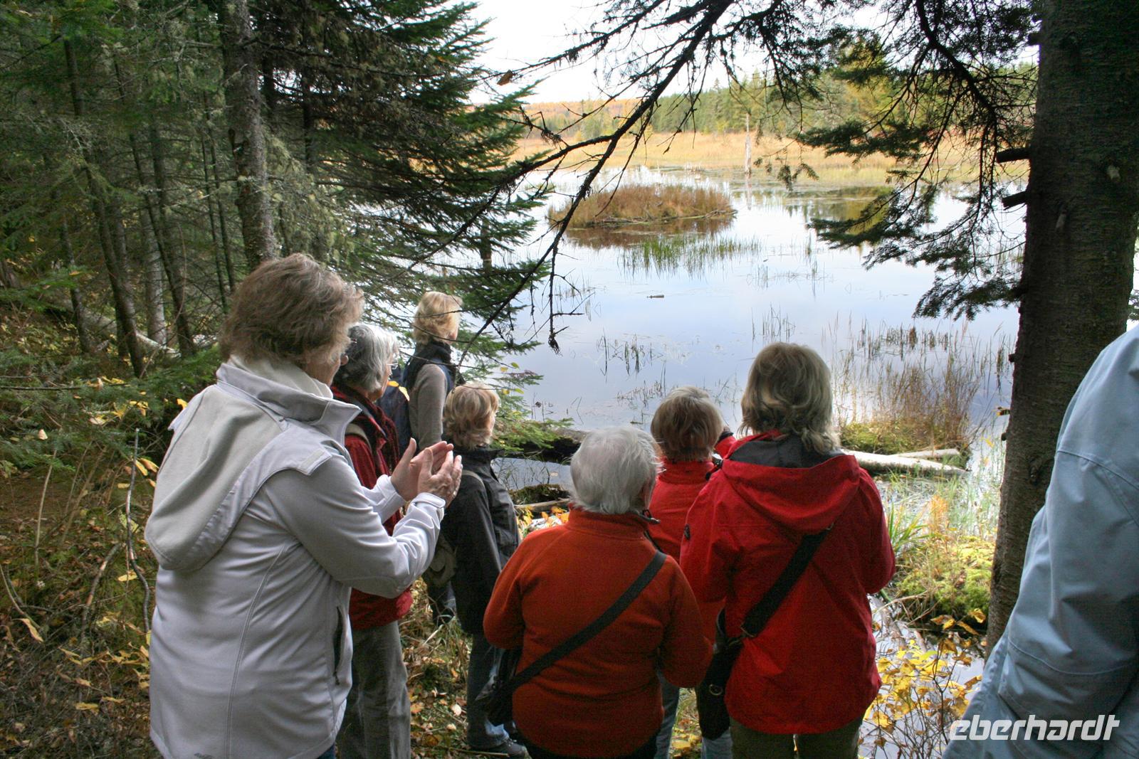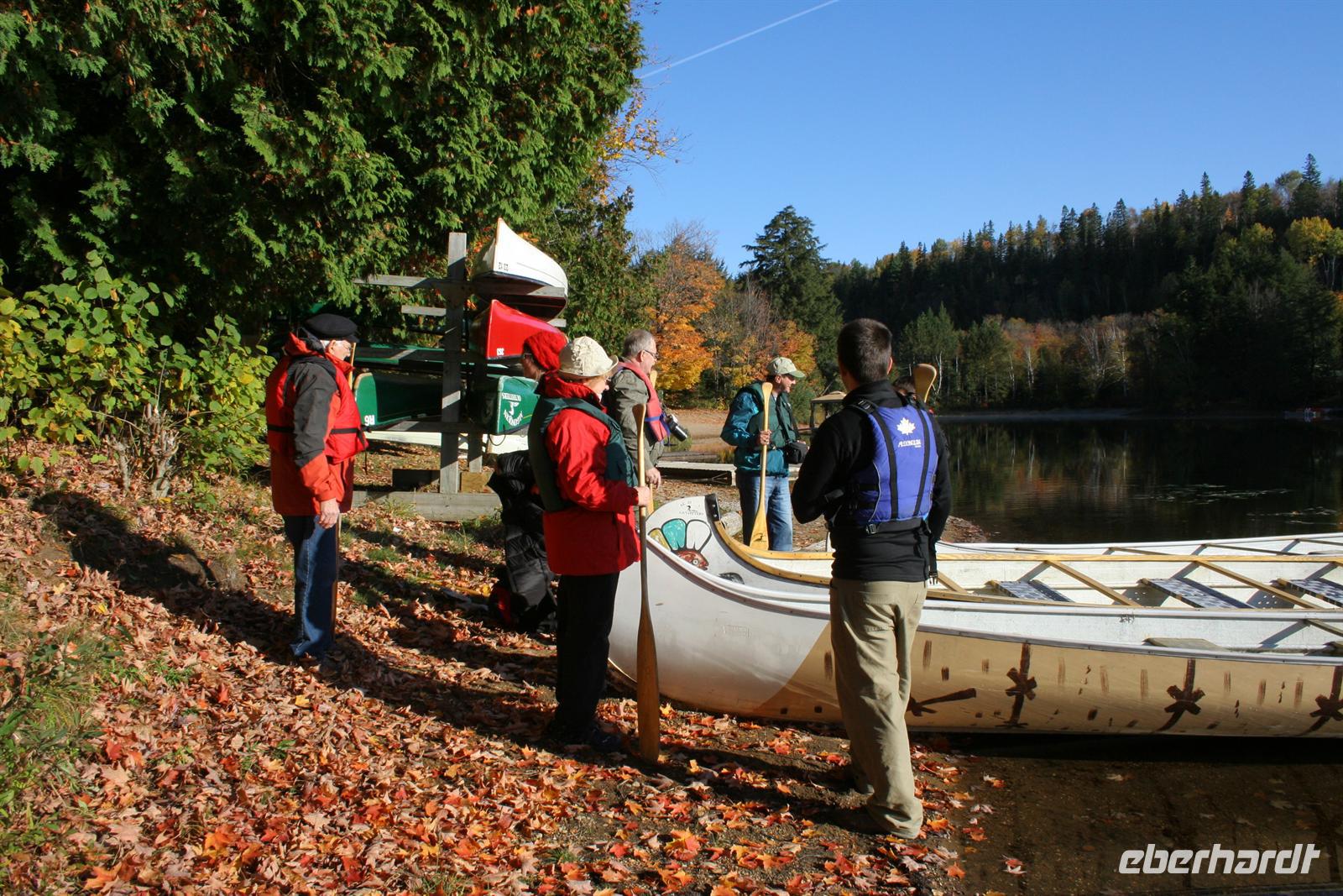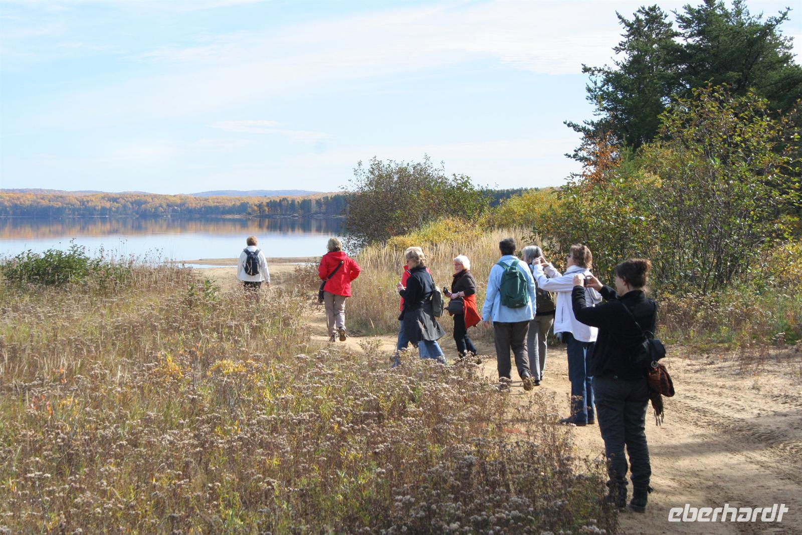 Heute verbringen wir einen ganzen Tag am Lac Taureau. Aufstehen und Frühstück im Hotelrestaurant nach individueller Zeit. Es gibt ein Frühstücksbuffet, der Kaffee wird am Platz serviert. Wer möchte, kann sich an der Theke ein frisches Omelett zubereiten lassen. Sehr zu empfehlen sind die hausgemachten Marmeladen. Um 9.30 Uhr treffen wir uns in der Lobby zu einer Wanderung mit Reiseleiterin Brigitta. Die Wanderung führt durch den Wald und am See entlang. Sie ist je nach Strecke 2 bis 3 Stunden lang. Es geht meist gerade Strecken entlang, am Anfang gibt es jedoch auch ein paar kleine Steigungen. Brigitta zeigt uns einen verlassenen Biberbau und etwas weiter einen noch bewohnten Biberbau und frisch umgenagte Bäume. Der Biber selbst lässt sich allerdings nicht sehen. Wir kommen auch an einem Strand des Lac Taureau vorbei. Das Wetter ist schön, am Morgen etwas bewölkt und etwa 6 °C, gegen Mittag wird es aber immer wärmer und sonniger. Nach etwa 3 Stunden Wanderung kommen wir wieder am Hotel an.Im Bistro im Untergeschoss kann man eine Kleinigkeit zum Mittag essen. Es gibt Salate, Burger, Pizza oder Sandwiches (Preise: 8 bis 13 CAD). Es gibt eine Speisekarte bei der Bedienung, sie serviert dann an den Tisch. Ich verabrede mich mit einigen Gästen zu einer individuellen Kanutour. Im Bootshaus des Hotels erhalten wir Schwimmwesten, Boote und Paddel. Wir sind 5 Personen und nehmen ein 3-Mann-Kanu (einfaches Paddel) und ein 2-Mann-Kajak (doppelseitiges Paddel). Um die Boote ins tiefere Wasser zu bekommen, müssen zwei von uns die Schuhe ausziehen und barfuß ins Wasser. Es geht aber ganz gut und wir schaffen es alle trocken ins Boot zu kommen. Der See ist spiegelglatt und es ist herrlich, die Ruhe und die Natur zu genießen.Wer möchte, kann das Schwimmbad und die Sauna kostenlos nutzen und es gibt auch einen Wellness-Bereich. Eine einstündige Rücken-Nacken-Massage kostet beispielsweise 80 CAD plus Steuer (ca. 92 CAD). Man kann bar oder mit Kreditkarte auf die Zimmernummer bezahlen. Man muss ein kleines Gesundheitsformular (in Englisch) ausfüllen. Ich helfe dabei, es ist kein Problem. Einige Gäste entspannen auf den Sonnenliegen auf der Terrasse oder nutzen ihren Balkon am Zimmer. Am Nachmittag starten unsere gebuchten Bootsfahrten auf dem Lac Taureau um 15.00 bzw. um 16.00 Uhr. Je 10-12 Personen passen auf das kleine Motorboot. Die Seitenwände sind mit durchsichtigen Planen geschlossen, sodass man nicht so schnell friert. Dennoch sollte man sich warm anziehen, weil die Seeluft doch ein bisschen kühl sein kann. Wir fahren je eine Stunde auf dem See und sehen einen großen Biberdamm. Brigitta erklärt die Entstehung des Sees und welche Tiere und Menschen hier leben. Etwa 70 Kilometer nordwestlich gibt es ein Indianerreservat, in dem etwa 2000 einheimische Indianer leben. Für Touristen ist es allerdings nicht erschlossen. Um 17.00 Uhr ist die zweite Gruppe fertig mit der Bootsfahrt. Bis zum Abendessen um 19.00 Uhr genießen alle noch einmal die freie Zeit. Donnerstag, 13.10.2011