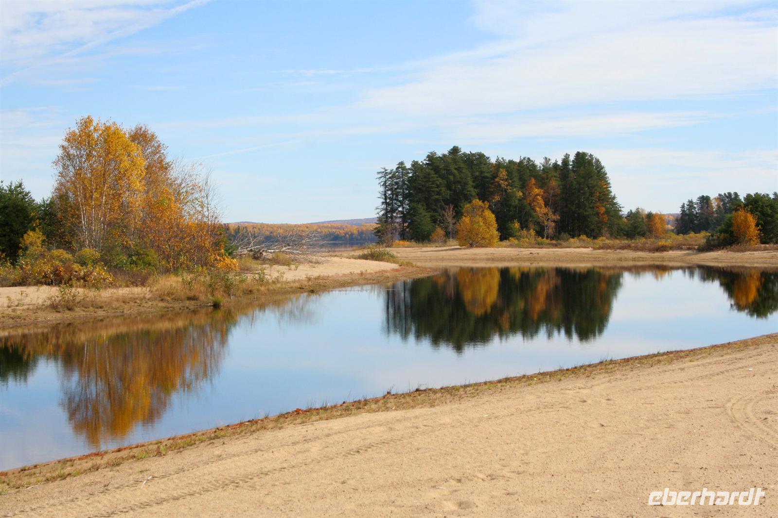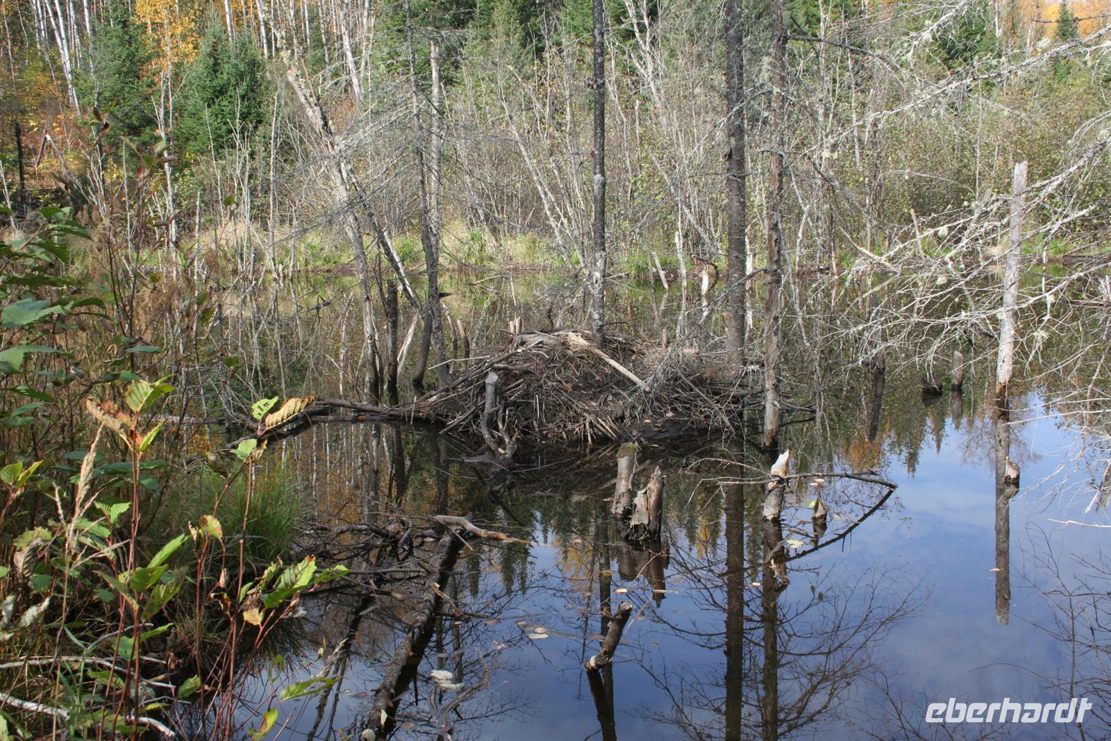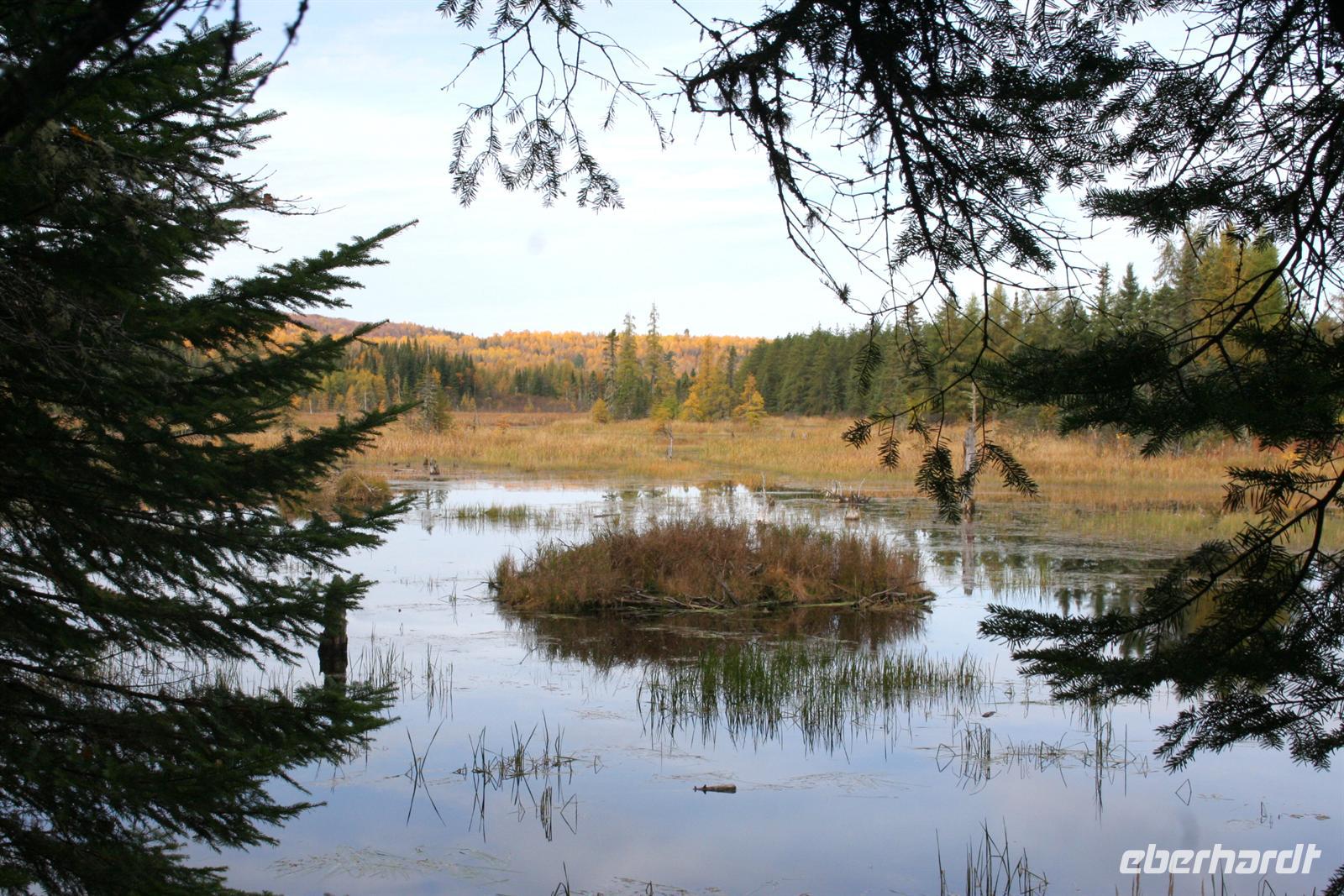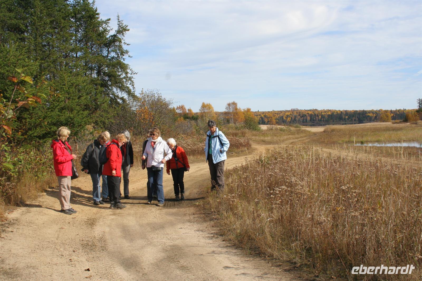 Heute verbringen wir einen ganzen Tag am Lac Taureau. Aufstehen und Frühstück im Hotelrestaurant nach individueller Zeit. Es gibt ein Frühstücksbuffet, der Kaffee wird am Platz serviert. Wer möchte, kann sich an der Theke ein frisches Omelett zubereiten lassen. Sehr zu empfehlen sind die hausgemachten Marmeladen. Um 9.30 Uhr treffen wir uns in der Lobby zu einer Wanderung mit Reiseleiterin Brigitta. Die Wanderung führt durch den Wald und am See entlang. Sie ist je nach Strecke 2 bis 3 Stunden lang. Es geht meist gerade Strecken entlang, am Anfang gibt es jedoch auch ein paar kleine Steigungen. Brigitta zeigt uns einen verlassenen Biberbau und etwas weiter einen noch bewohnten Biberbau und frisch umgenagte Bäume. Der Biber selbst lässt sich allerdings nicht sehen. Wir kommen auch an einem Strand des Lac Taureau vorbei. Das Wetter ist schön, am Morgen etwas bewölkt und etwa 6 °C, gegen Mittag wird es aber immer wärmer und sonniger. Nach etwa 3 Stunden Wanderung kommen wir wieder am Hotel an.Im Bistro im Untergeschoss kann man eine Kleinigkeit zum Mittag essen. Es gibt Salate, Burger, Pizza oder Sandwiches (Preise: 8 bis 13 CAD). Es gibt eine Speisekarte bei der Bedienung, sie serviert dann an den Tisch. Ich verabrede mich mit einigen Gästen zu einer individuellen Kanutour. Im Bootshaus des Hotels erhalten wir Schwimmwesten, Boote und Paddel. Wir sind 5 Personen und nehmen ein 3-Mann-Kanu (einfaches Paddel) und ein 2-Mann-Kajak (doppelseitiges Paddel). Um die Boote ins tiefere Wasser zu bekommen, müssen zwei von uns die Schuhe ausziehen und barfuß ins Wasser. Es geht aber ganz gut und wir schaffen es alle trocken ins Boot zu kommen. Der See ist spiegelglatt und es ist herrlich, die Ruhe und die Natur zu genießen.Wer möchte, kann das Schwimmbad und die Sauna kostenlos nutzen und es gibt auch einen Wellness-Bereich. Eine einstündige Rücken-Nacken-Massage kostet beispielsweise 80 CAD plus Steuer (ca. 92 CAD). Man kann bar oder mit Kreditkarte auf die Zimmernummer bezahlen. Man muss ein kleines Gesundheitsformular (in Englisch) ausfüllen. Ich helfe dabei, es ist kein Problem. Einige Gäste entspannen auf den Sonnenliegen auf der Terrasse oder nutzen ihren Balkon am Zimmer. Am Nachmittag starten unsere gebuchten Bootsfahrten auf dem Lac Taureau um 15.00 bzw. um 16.00 Uhr. Je 10-12 Personen passen auf das kleine Motorboot. Die Seitenwände sind mit durchsichtigen Planen geschlossen, sodass man nicht so schnell friert. Dennoch sollte man sich warm anziehen, weil die Seeluft doch ein bisschen kühl sein kann. Wir fahren je eine Stunde auf dem See und sehen einen großen Biberdamm. Brigitta erklärt die Entstehung des Sees und welche Tiere und Menschen hier leben. Etwa 70 Kilometer nordwestlich gibt es ein Indianerreservat, in dem etwa 2000 einheimische Indianer leben. Für Touristen ist es allerdings nicht erschlossen. Um 17.00 Uhr ist die zweite Gruppe fertig mit der Bootsfahrt. Bis zum Abendessen um 19.00 Uhr genießen alle noch einmal die freie Zeit. Donnerstag, 13.10.2011
