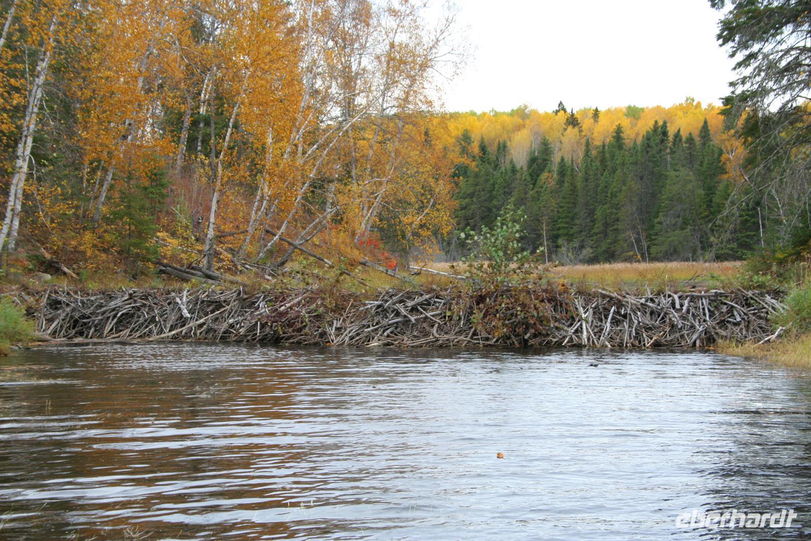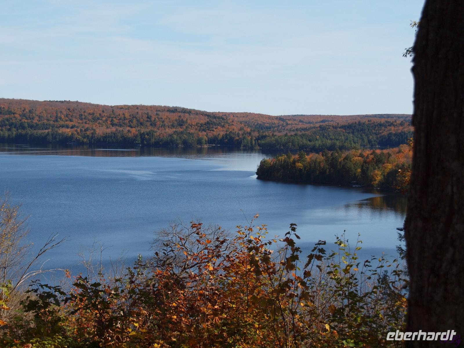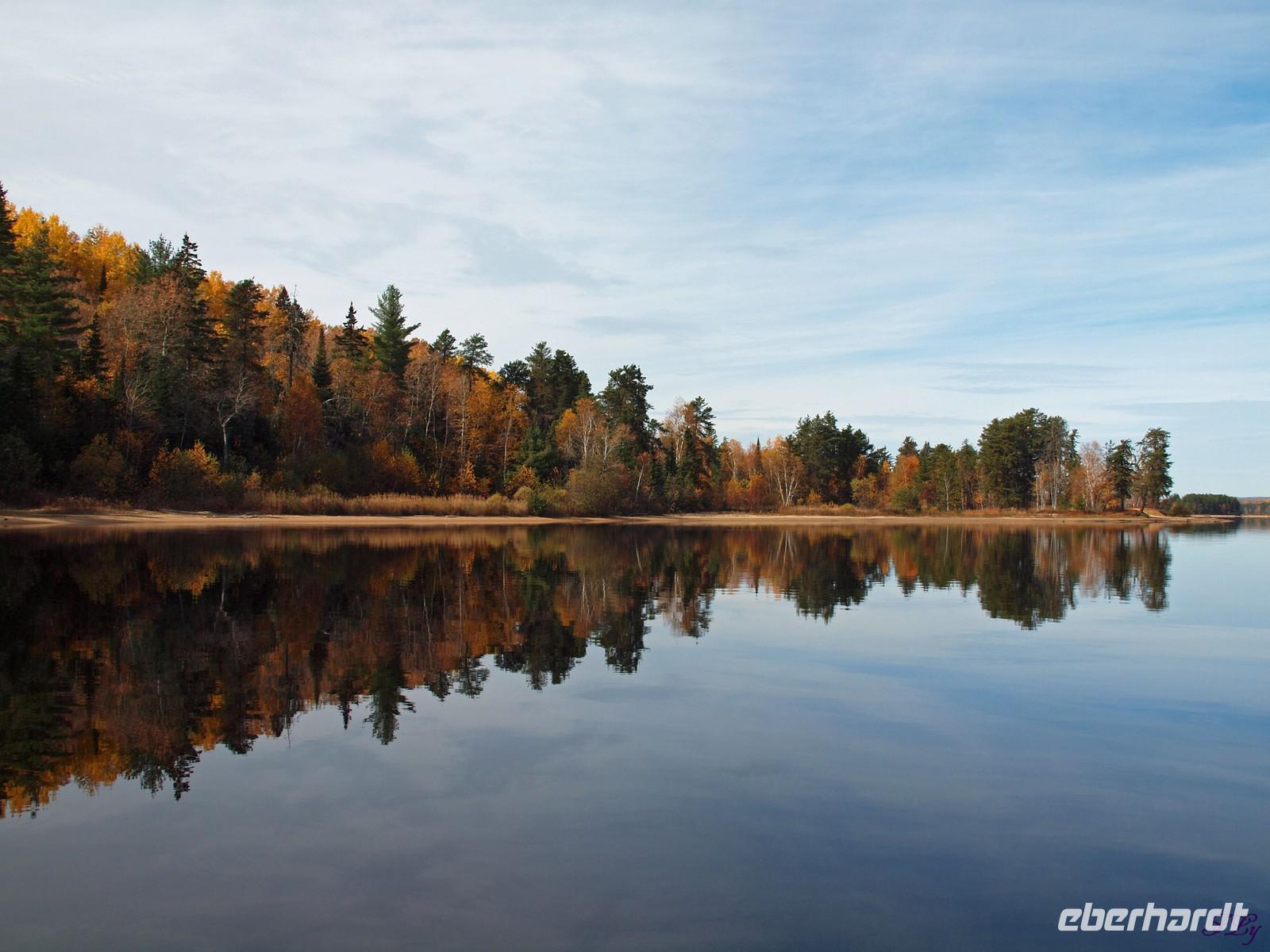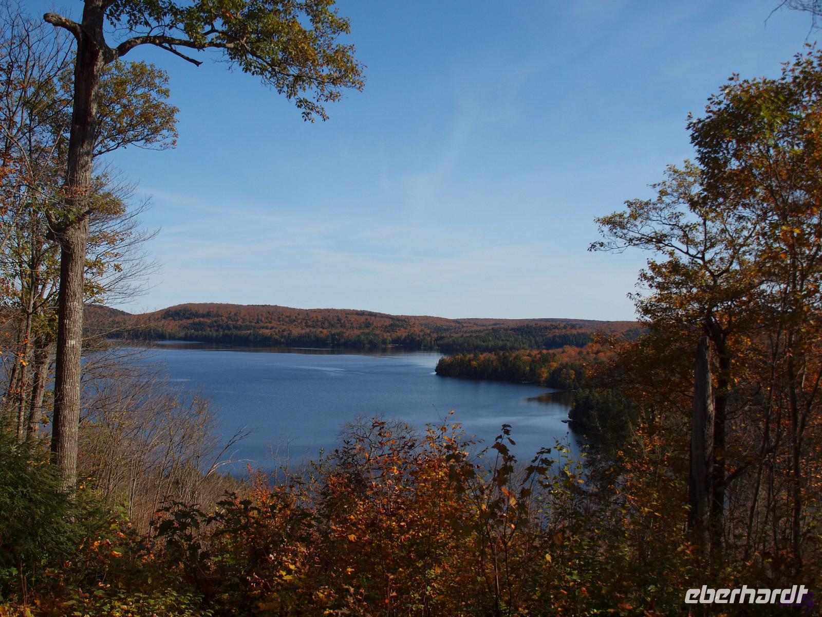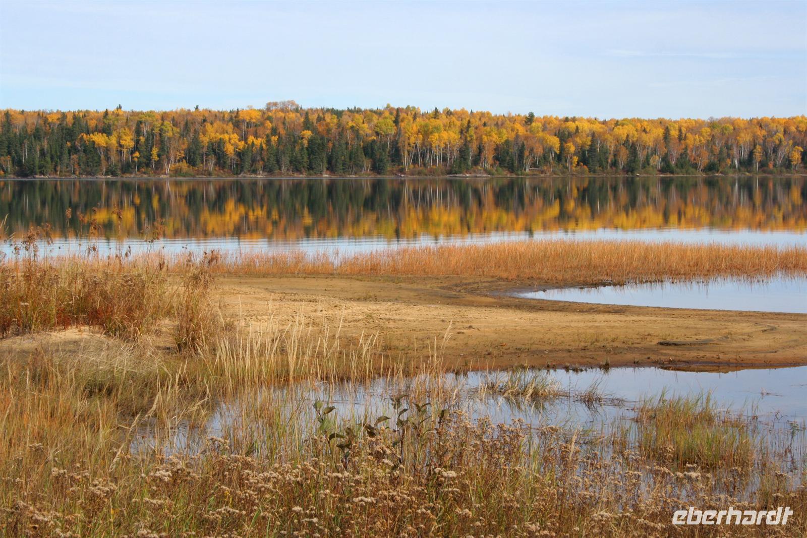 Heute verbringen wir einen ganzen Tag am Lac Taureau. Aufstehen und Frühstück im Hotelrestaurant nach individueller Zeit. Es gibt ein Frühstücksbuffet, der Kaffee wird am Platz serviert. Wer möchte, kann sich an der Theke ein frisches Omelett zubereiten lassen. Sehr zu empfehlen sind die hausgemachten Marmeladen. Um 9.30 Uhr treffen wir uns in der Lobby zu einer Wanderung mit Reiseleiterin Brigitta. Die Wanderung führt durch den Wald und am See entlang. Sie ist je nach Strecke 2 bis 3 Stunden lang. Es geht meist gerade Strecken entlang, am Anfang gibt es jedoch auch ein paar kleine Steigungen. Brigitta zeigt uns einen verlassenen Biberbau und etwas weiter einen noch bewohnten Biberbau und frisch umgenagte Bäume. Der Biber selbst lässt sich allerdings nicht sehen. Wir kommen auch an einem Strand des Lac Taureau vorbei. Das Wetter ist schön, am Morgen etwas bewölkt und etwa 6 °C, gegen Mittag wird es aber immer wärmer und sonniger. Nach etwa 3 Stunden Wanderung kommen wir wieder am Hotel an.Im Bistro im Untergeschoss kann man eine Kleinigkeit zum Mittag essen. Es gibt Salate, Burger, Pizza oder Sandwiches (Preise: 8 bis 13 CAD). Es gibt eine Speisekarte bei der Bedienung, sie serviert dann an den Tisch. Ich verabrede mich mit einigen Gästen zu einer individuellen Kanutour. Im Bootshaus des Hotels erhalten wir Schwimmwesten, Boote und Paddel. Wir sind 5 Personen und nehmen ein 3-Mann-Kanu (einfaches Paddel) und ein 2-Mann-Kajak (doppelseitiges Paddel). Um die Boote ins tiefere Wasser zu bekommen, müssen zwei von uns die Schuhe ausziehen und barfuß ins Wasser. Es geht aber ganz gut und wir schaffen es alle trocken ins Boot zu kommen. Der See ist spiegelglatt und es ist herrlich, die Ruhe und die Natur zu genießen.Wer möchte, kann das Schwimmbad und die Sauna kostenlos nutzen und es gibt auch einen Wellness-Bereich. Eine einstündige Rücken-Nacken-Massage kostet beispielsweise 80 CAD plus Steuer (ca. 92 CAD). Man kann bar oder mit Kreditkarte auf die Zimmernummer bezahlen. Man muss ein kleines Gesundheitsformular (in Englisch) ausfüllen. Ich helfe dabei, es ist kein Problem. Einige Gäste entspannen auf den Sonnenliegen auf der Terrasse oder nutzen ihren Balkon am Zimmer. Am Nachmittag starten unsere gebuchten Bootsfahrten auf dem Lac Taureau um 15.00 bzw. um 16.00 Uhr. Je 10-12 Personen passen auf das kleine Motorboot. Die Seitenwände sind mit durchsichtigen Planen geschlossen, sodass man nicht so schnell friert. Dennoch sollte man sich warm anziehen, weil die Seeluft doch ein bisschen kühl sein kann. Wir fahren je eine Stunde auf dem See und sehen einen großen Biberdamm. Brigitta erklärt die Entstehung des Sees und welche Tiere und Menschen hier leben. Etwa 70 Kilometer nordwestlich gibt es ein Indianerreservat, in dem etwa 2000 einheimische Indianer leben. Für Touristen ist es allerdings nicht erschlossen. Um 17.00 Uhr ist die zweite Gruppe fertig mit der Bootsfahrt. Bis zum Abendessen um 19.00 Uhr genießen alle noch einmal die freie Zeit. Donnerstag, 13.10.2011