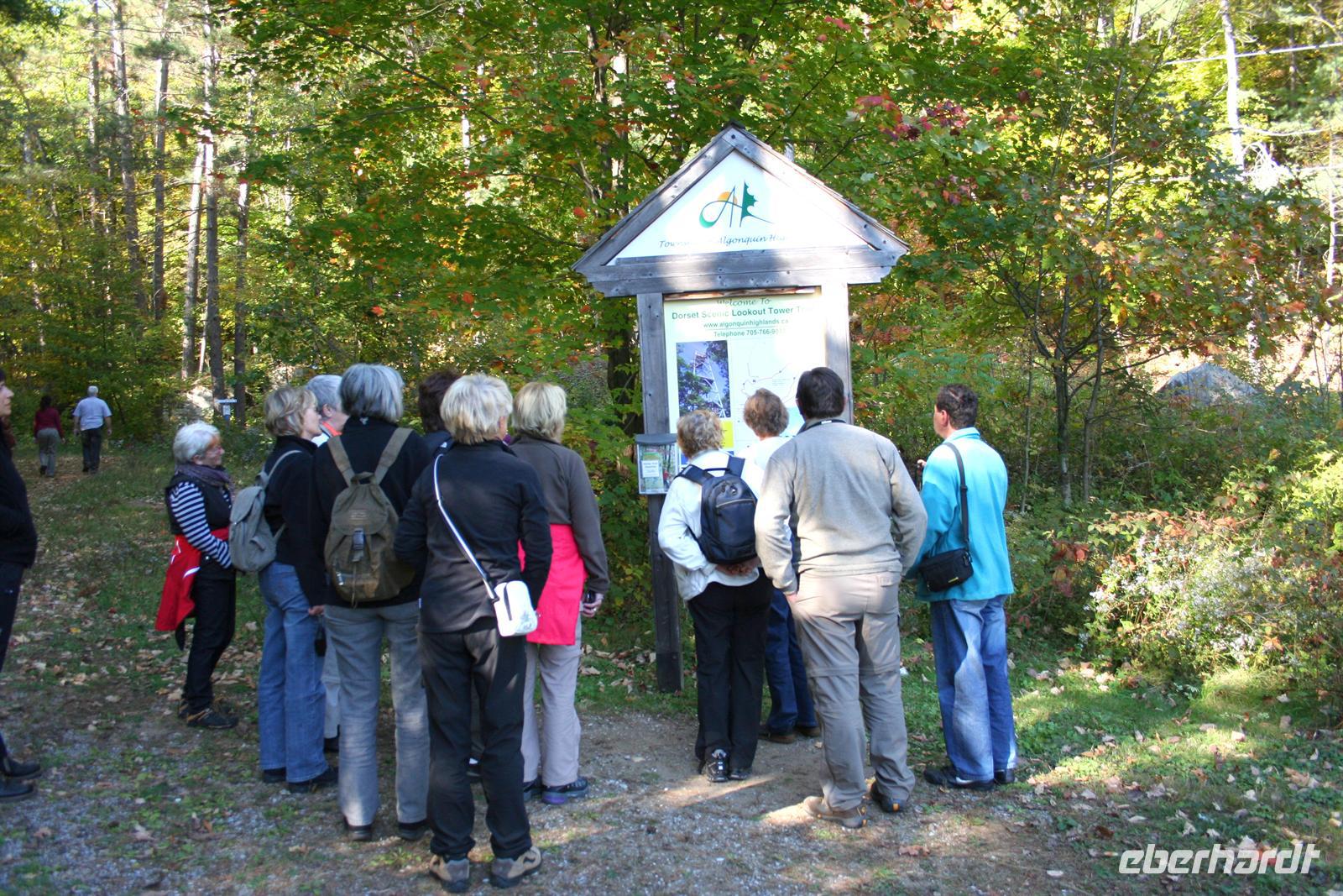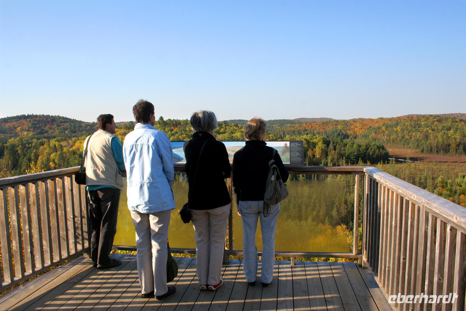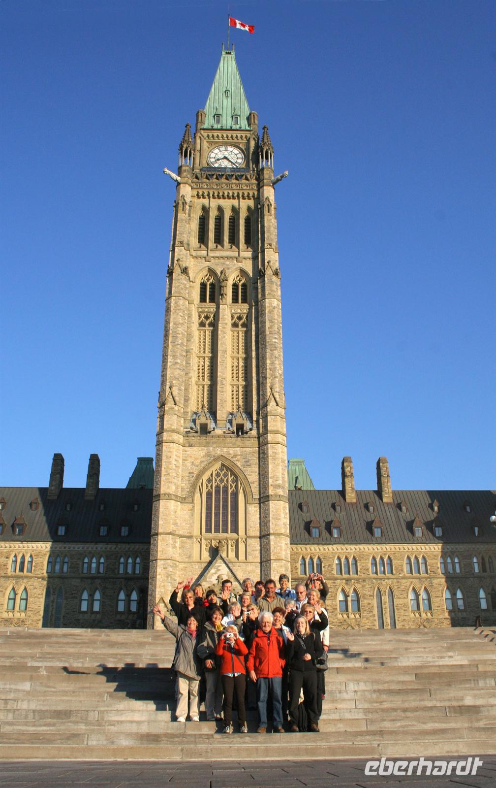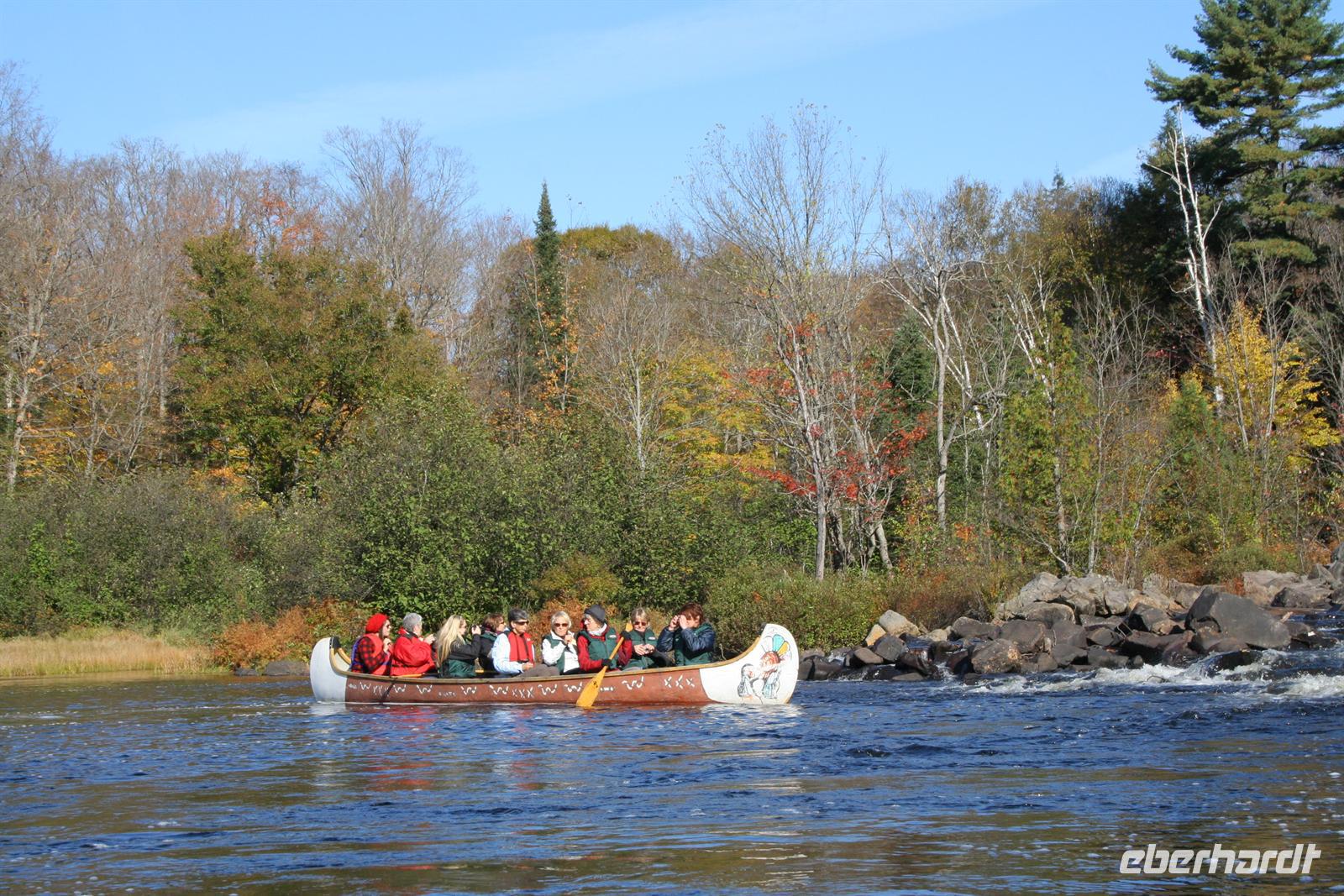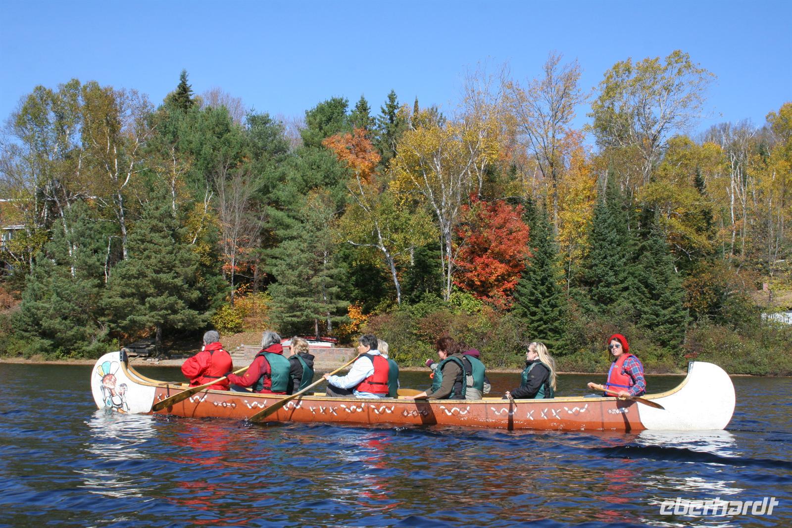 Am nächsten Morgen können wir die Koffer im Hotel lassen, denn wir bleiben noch eine Nacht hier im Hidden Valley. Weckruf um 6.30 Uhr und Frühstück im Hotelrestaurant um 7.30 Uhr. Das Frühstück ist vom Buffet, sehr gut und von allem etwas zu haben. Den Ahornsirup müssen wir natürlich probieren. Dann heißt es warme Sachen und Wanderschuhe anziehen (Mütze, Schal und Handschuhe haben auch die meisten dabei). An der Rezeption bekommt jeder ein Lunchpaket mit belegtem Brot, Wasser, Obst und Müsliriegel. Diese nehmen wir mit in den Bus. Um 8.30 Uhr starten wir zu unserem Tagesausflug in die wunderschöne Natur des Algonquin-Nationalparks. Die Laubfärbung ist fantastisch in allen Grün-, Gelb- und Rottönen. Je nach Lage haben die Bäume auch teilweise ihre Blätter schon verloren. Nachts gibt es jetzt schon Temperaturen unter Null, aber wir haben wieder einen herrlichen Tag mit mittags mehr als 20 Grad.Wir fahren von Huntsville etwa eine halbe Stunde bis zum Kanu-Verleih „Algonquin Outfitters". Um 9.00 Uhr kommen wir an. Alle werden mit einem Paddel und einer Schwimmweste ausgerüstet. Wir bekommen drei Guides und je acht Gäste gehen in ein Kanu. In jedem Kanu sollte ein Übersetzer von uns sitzen, denn die Guides sprechen nur Englisch. Das Einsteigen klappt erstmal problemlos. Um 9.45 Uhr paddeln wir los auf dem Ochsenzungen-See (Oxtongue Lake) und später auf dem gleichnamigen Fluss. Der See und Fluss heißt so, weil die Holzfäller früher auch Ochsen zum Transport der Holzstämme nutzen und diese vor Anstrengung die Zungen raushängen ließen. Nach etwa einer Stunde paddeln erreichen wir unser Ziel, die Dragon Falls (Drachen-Wasserfälle) des Oxtongue-Flusses. Hier wird es etwas schwierig beim Aussteigen, denn es gibt keine feste Anlegestelle, sondern nur ein felsiges Ufer, auf das wir aus den Booten etwas mühsam klettern müssen. Wir kraxeln nach oben zum Anfang des Wasserfalls. Hier machen Brigitta und ich als Überraschung eine kleine Weinprobe mit einem Merlot-Rotwein aus der Niagara-Region. Vom Wein gestärkt erklimmen wir unten am Fluss wieder unsere Kanus und paddeln eine Stunde zurück zum Ausgangspunkt unserer Kanutour. Die Boote lassen sich leicht bewegen und die Guides helfen hinten beim Steuern. Wenn jeder ein bisschen mitpaddelt, wird es für keinen zu anstrengend. Und es funktioniert, auch wenn man vorher noch nie gepaddelt ist. Alle fanden die Kanutour super! Zurück am Bootsverleih gebe ich jedem Guide im Namen der Gruppe 10 CAD Trinkgeld. Dann holen wir unsere Lunchpakete aus dem Bus und picknicken auf Bänken direkt am Oxtongue-See. Das Wetter ist herrlich und wir genießen die Ruhe in der Natur. Gegen 13.00 Uhr fahren wir weiter direkt in den Algonquin-Park. Brigitta holt die Einfahrt-Erlaubnisse für die beiden Tage heute und morgen. Jeder bekommt einen deutschen Prospekt vom Park. Um 14.00 Uhr erreichen wir den Ausgangspunkt unserer ersten Wanderung, dem „Hardwood Lookout Trail". Die Wanderung ist etwa 800 Meter lang, führt aber zum Teil über felsiges Gelände und kleine Anstiege hinauf. Vom Aussichtspunkt hat man einen Blick über den Canou Lake, der von den farbigen Laubwäldern umrahmt ist. Die Wanderung dauert etwa 40 Minuten. Dann fahren wir noch einmal 45 Minuten nach Dorset, wo unsere nächste Wanderung ist. Die Strecke ist 2,3 km lang und führt zum Teil über felsiges Gelände, wo man etwas klettern muss und immer leicht bergauf. Ziel ist der Feuerwachturm, von dem man früher Brände in dem riesigen Waldgebiet erkennen konnte. Wer will kann kostenlos auf den Turm hinauf steigen. Von oben hat man einen schönen Blick über das Kronendach des Algonquin-Nationalparks und einige Seen (Toilettenmöglichkeit). Um 16.30 Uhr fahren wir weiter. Da wir nicht zurück gewandert sind, haben wir noch Zeit, den „Robinson's General Store" zu besuchen und eine Indian Summer Panorama-Fahrt um den Lake of Bays zu unternehmen. Auf den etwa 60 Kilometern Strecke auf kleineren Landstraßen können wir die Laubfärbung noch einmal ganz besonders gut bestaunen. Gegen 18.15 Uhr kommen wir wieder am Hotel „Hidden Valley" an. Ich treffe mich mit einigen Gästen zum Abendessen im Hotelrestaurant. Es ist in Bistro und Restaurant unterteilt, je nachdem, ob man ein Menü oder einen Snack essen will. Wir werden im Bistro vorn platziert. Es gibt zum Beispiel eine Tagessuppe, verschiedene Salate, Kartoffelecken mit Dip, Nachos, Pizza, Pasta und Burger. Für etwa 10 CAD kann man ein gutes Gericht bekommen. Eine Flasche Wein kostet etwa 35 CAD. Einige sitzen auch noch in der Lobby zusammen. Freitag, 07.10.2011 Algonquin-Nationalpark - Logging Trail - Ottawa Am Freitag geht es etwas eher los, denn wir haben eine lange Fahrtstrecke von 420 Kilometern vor uns. Weckruf ist daher um 6.00 Uhr, Frühstück und 7.00 und Abfahrt um 8.00 Uhr. Heute erkunden wir den östlichen Teil des Algonquin-Parks. Wir fahren zunächst etwa eine Stunde zum Algonquin-Besucherzentrum. Hier gibt es eine kleine Aussichtsplattform, einen Souvenirshop und ein Museum zur Geschichte und zur Tierwelt im Algonquin-Park. Man sieht, wie der der Biber seinen Bau baut, wie es in den Seen unter Wasser aussieht und verschiedene ausgestopfte Tiere wie den Schwarzbär, den Wolf und den Elch. Nach einer halben Stunde geht es ca. 20 Minuten weiter zum Holzfäller-Museum mit einem kleinen Rundwanderweg „Logging Trail“. Hier sehen wir uns einen kurzen Film über die Geschichte der Holzfäller an und spazieren eine knappe Stunde den Logging Trail entlang. Brigitta erklärt uns Wissenswertes zu den einzelnen Stationen. Wir sehen die Unterkünfte der Holzfäller, die Pferdeställe, die Gerätschaften und Maschinen bis hin zu einem kleinen Dampfschiff (Alligator genannt), einer Dampflokomotive und moderneren Autos. Für einen CAD bekommt man auch eine kleine Broschüre, in der in Englisch alles mit Illustrationen und Text erläutert ist.11.30 Uhr Weiterfahrt in Richtung Ottawa. Gegen 15.00 Uhr kommen wir in Ottawa a