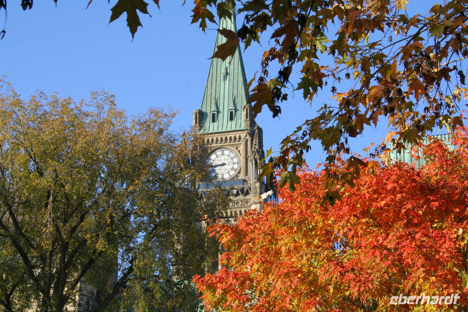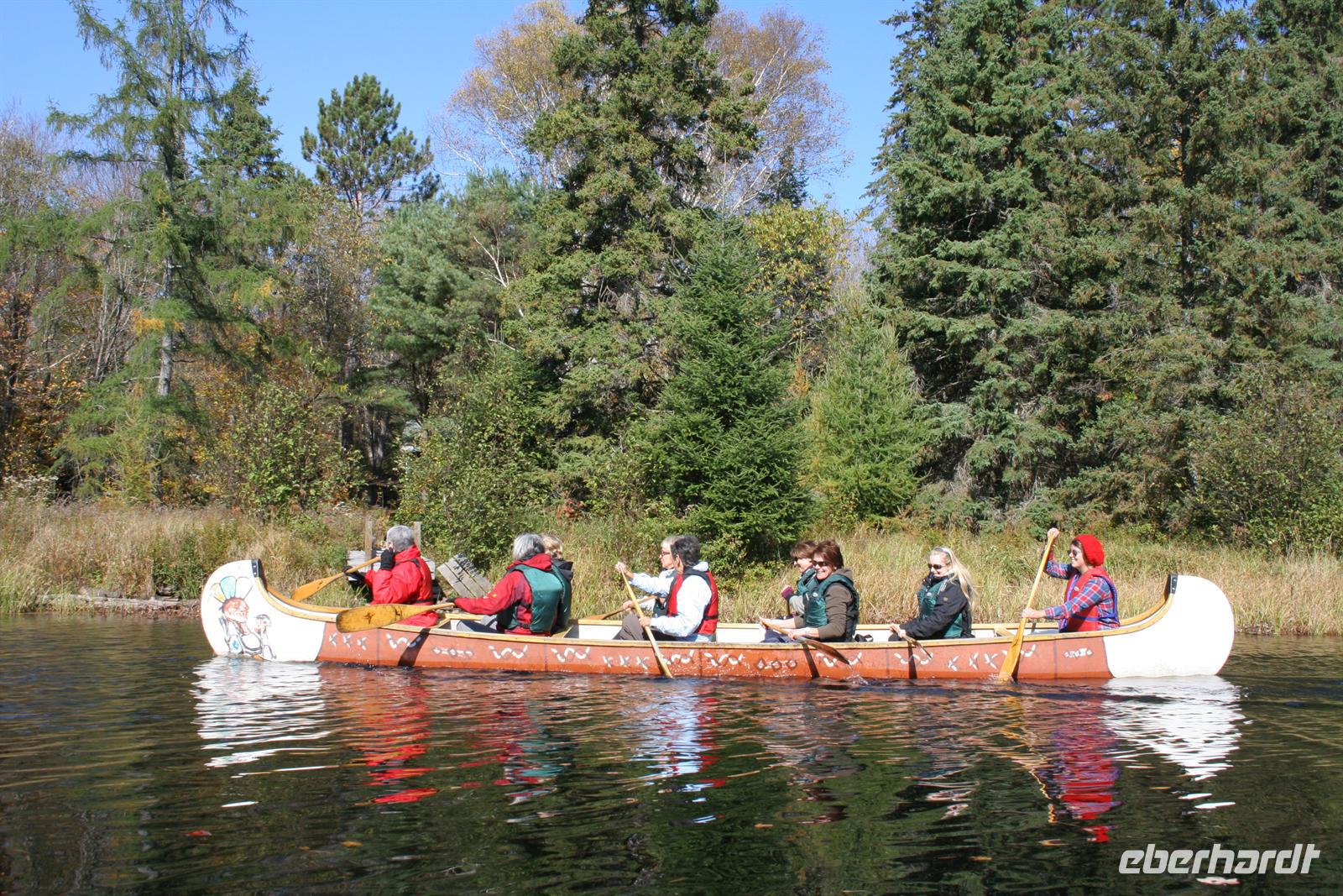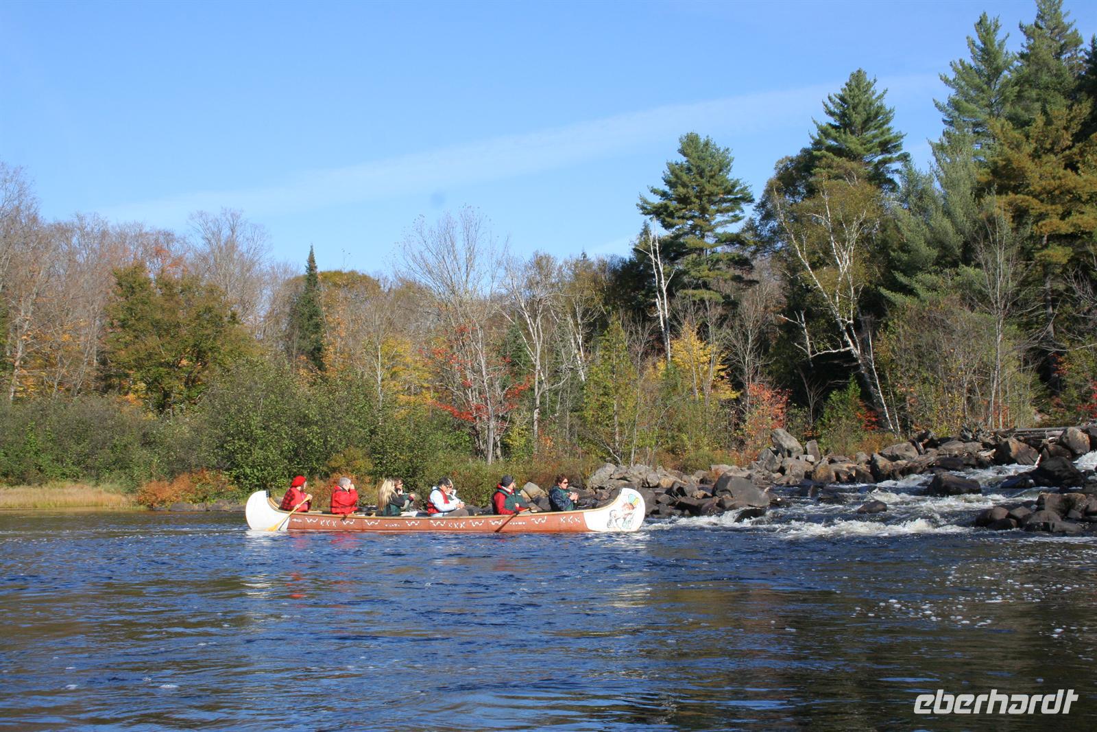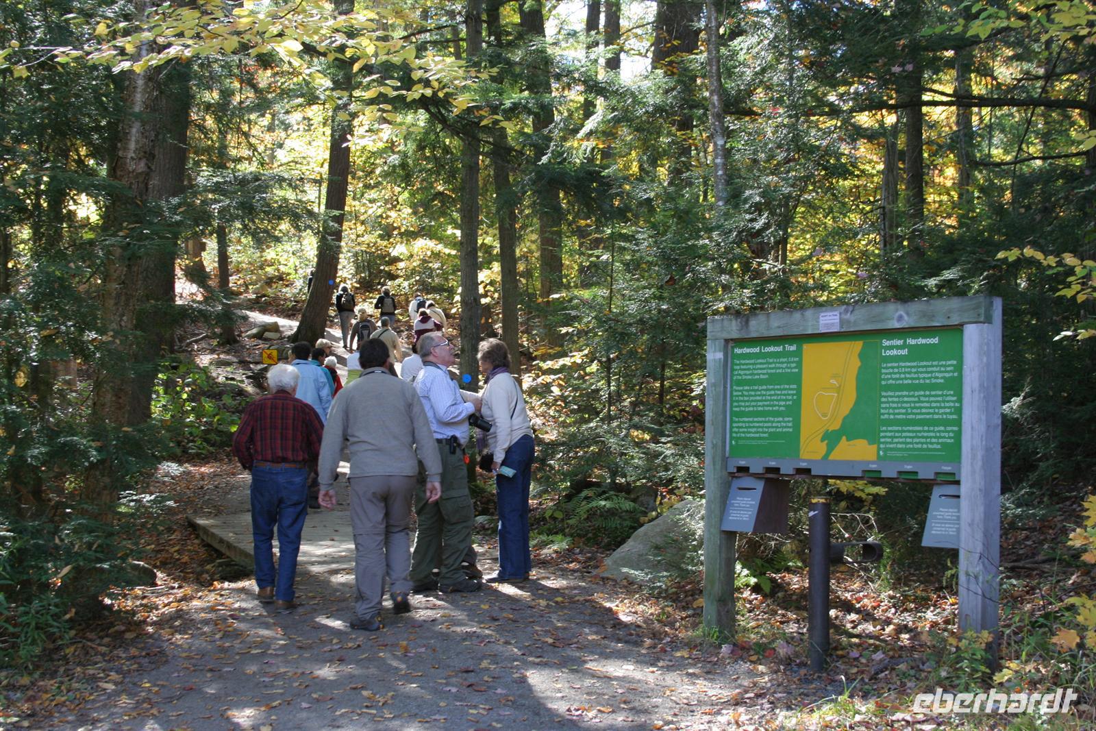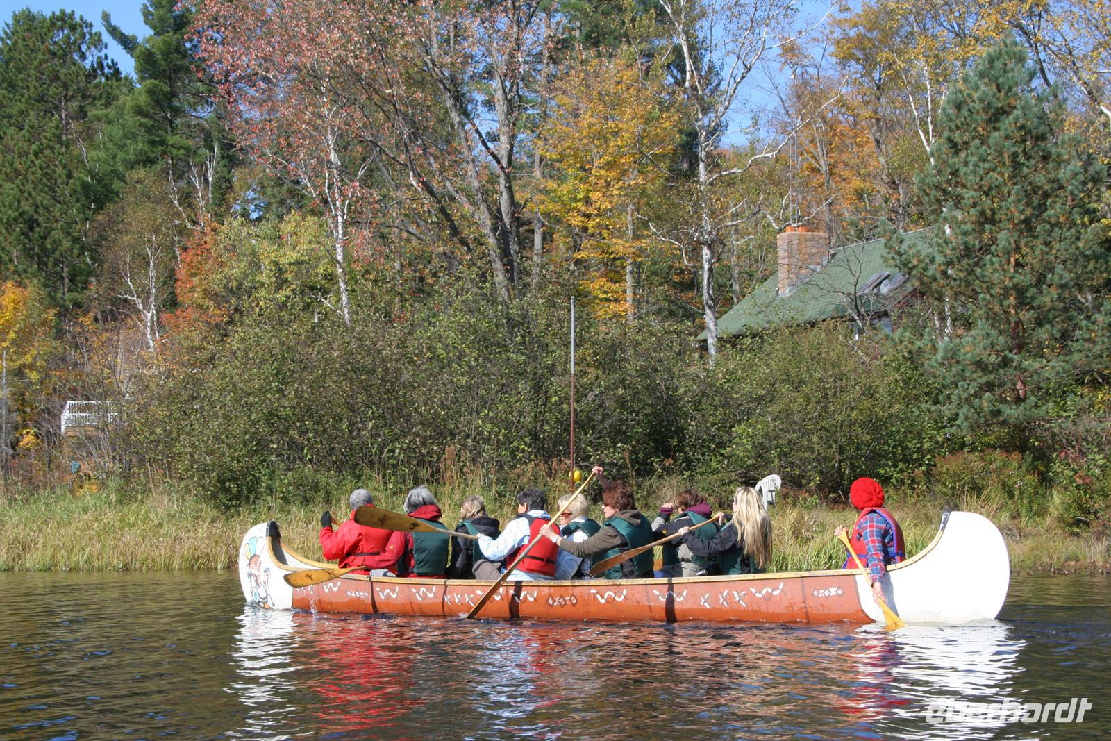 Am nächsten Morgen können wir die Koffer im Hotel lassen, denn wir bleiben noch eine Nacht hier im Hidden Valley. Weckruf um 6.30 Uhr und Frühstück im Hotelrestaurant um 7.30 Uhr. Das Frühstück ist vom Buffet, sehr gut und von allem etwas zu haben. Den Ahornsirup müssen wir natürlich probieren. Dann heißt es warme Sachen und Wanderschuhe anziehen (Mütze, Schal und Handschuhe haben auch die meisten dabei). An der Rezeption bekommt jeder ein Lunchpaket mit belegtem Brot, Wasser, Obst und Müsliriegel. Diese nehmen wir mit in den Bus. Um 8.30 Uhr starten wir zu unserem Tagesausflug in die wunderschöne Natur des Algonquin-Nationalparks. Die Laubfärbung ist fantastisch in allen Grün-, Gelb- und Rottönen. Je nach Lage haben die Bäume auch teilweise ihre Blätter schon verloren. Nachts gibt es jetzt schon Temperaturen unter Null, aber wir haben wieder einen herrlichen Tag mit mittags mehr als 20 Grad.Wir fahren von Huntsville etwa eine halbe Stunde bis zum Kanu-Verleih „Algonquin Outfitters". Um 9.00 Uhr kommen wir an. Alle werden mit einem Paddel und einer Schwimmweste ausgerüstet. Wir bekommen drei Guides und je acht Gäste gehen in ein Kanu. In jedem Kanu sollte ein Übersetzer von uns sitzen, denn die Guides sprechen nur Englisch. Das Einsteigen klappt erstmal problemlos. Um 9.45 Uhr paddeln wir los auf dem Ochsenzungen-See (Oxtongue Lake) und später auf dem gleichnamigen Fluss. Der See und Fluss heißt so, weil die Holzfäller früher auch Ochsen zum Transport der Holzstämme nutzen und diese vor Anstrengung die Zungen raushängen ließen. Nach etwa einer Stunde paddeln erreichen wir unser Ziel, die Dragon Falls (Drachen-Wasserfälle) des Oxtongue-Flusses. Hier wird es etwas schwierig beim Aussteigen, denn es gibt keine feste Anlegestelle, sondern nur ein felsiges Ufer, auf das wir aus den Booten etwas mühsam klettern müssen. Wir kraxeln nach oben zum Anfang des Wasserfalls. Hier machen Brigitta und ich als Überraschung eine kleine Weinprobe mit einem Merlot-Rotwein aus der Niagara-Region. Vom Wein gestärkt erklimmen wir unten am Fluss wieder unsere Kanus und paddeln eine Stunde zurück zum Ausgangspunkt unserer Kanutour. Die Boote lassen sich leicht bewegen und die Guides helfen hinten beim Steuern. Wenn jeder ein bisschen mitpaddelt, wird es für keinen zu anstrengend. Und es funktioniert, auch wenn man vorher noch nie gepaddelt ist. Alle fanden die Kanutour super! Zurück am Bootsverleih gebe ich jedem Guide im Namen der Gruppe 10 CAD Trinkgeld. Dann holen wir unsere Lunchpakete aus dem Bus und picknicken auf Bänken direkt am Oxtongue-See. Das Wetter ist herrlich und wir genießen die Ruhe in der Natur. Gegen 13.00 Uhr fahren wir weiter direkt in den Algonquin-Park. Brigitta holt die Einfahrt-Erlaubnisse für die beiden Tage heute und morgen. Jeder bekommt einen deutschen Prospekt vom Park. Um 14.00 Uhr erreichen wir den Ausgangspunkt unserer ersten Wanderung, dem „Hardwood Lookout Trail". Die Wanderung ist etwa 800 Meter lang, führt aber zum Teil über felsiges Gelände und kleine Anstiege hinauf. Vom Aussichtspunkt hat man einen Blick über den Canou Lake, der von den farbigen Laubwäldern umrahmt ist. Die Wanderung dauert etwa 40 Minuten. Dann fahren wir noch einmal 45 Minuten nach Dorset, wo unsere nächste Wanderung ist. Die Strecke ist 2,3 km lang und führt zum Teil über felsiges Gelände, wo man etwas klettern muss und immer leicht bergauf. Ziel ist der Feuerwachturm, von dem man früher Brände in dem riesigen Waldgebiet erkennen konnte. Wer will kann kostenlos auf den Turm hinauf steigen. Von oben hat man einen schönen Blick über das Kronendach des Algonquin-Nationalparks und einige Seen (Toilettenmöglichkeit). Um 16.30 Uhr fahren wir weiter. Da wir nicht zurück gewandert sind, haben wir noch Zeit, den „Robinson's General Store" zu besuchen und eine Indian Summer Panorama-Fahrt um den Lake of Bays zu unternehmen. Auf den etwa 60 Kilometern Strecke auf kleineren Landstraßen können wir die Laubfärbung noch einmal ganz besonders gut bestaunen. Gegen 18.15 Uhr kommen wir wieder am Hotel „Hidden Valley" an. Ich treffe mich mit einigen Gästen zum Abendessen im Hotelrestaurant. Es ist in Bistro und Restaurant unterteilt, je nachdem, ob man ein Menü oder einen Snack essen will. Wir werden im Bistro vorn platziert. Es gibt zum Beispiel eine Tagessuppe, verschiedene Salate, Kartoffelecken mit Dip, Nachos, Pizza, Pasta und Burger. Für etwa 10 CAD kann man ein gutes Gericht bekommen. Eine Flasche Wein kostet etwa 35 CAD. Einige sitzen auch noch in der Lobby zusammen. Freitag, 07.10.2011 Algonquin-Nationalpark - Logging Trail - Ottawa Am Freitag geht es etwas eher los, denn wir haben eine lange Fahrtstrecke von 420 Kilometern vor uns. Weckruf ist daher um 6.00 Uhr, Frühstück und 7.00 und Abfahrt um 8.00 Uhr. Heute erkunden wir den östlichen Teil des Algonquin-Parks. Wir fahren zunächst etwa eine Stunde zum Algonquin-Besucherzentrum. Hier gibt es eine kleine Aussichtsplattform, einen Souvenirshop und ein Museum zur Geschichte und zur Tierwelt im Algonquin-Park. Man sieht, wie der der Biber seinen Bau baut, wie es in den Seen unter Wasser aussieht und verschiedene ausgestopfte Tiere wie den Schwarzbär, den Wolf und den Elch. Nach einer halben Stunde geht es ca. 20 Minuten weiter zum Holzfäller-Museum mit einem kleinen Rundwanderweg „Logging Trail“. Hier sehen wir uns einen kurzen Film über die Geschichte der Holzfäller an und spazieren eine knappe Stunde den Logging Trail entlang. Brigitta erklärt uns Wissenswertes zu den einzelnen Stationen. Wir sehen die Unterkünfte der Holzfäller, die Pferdeställe, die Gerätschaften und Maschinen bis hin zu einem kleinen Dampfschiff (Alligator genannt), einer Dampflokomotive und moderneren Autos. Für einen CAD bekommt man auch eine kleine Broschüre, in der in Englisch alles mit Illustrationen und Text erläutert ist.11.30 Uhr Weiterfahrt in Richtung Ottawa. Gegen 15.00 Uhr kommen wir in Ottawa a