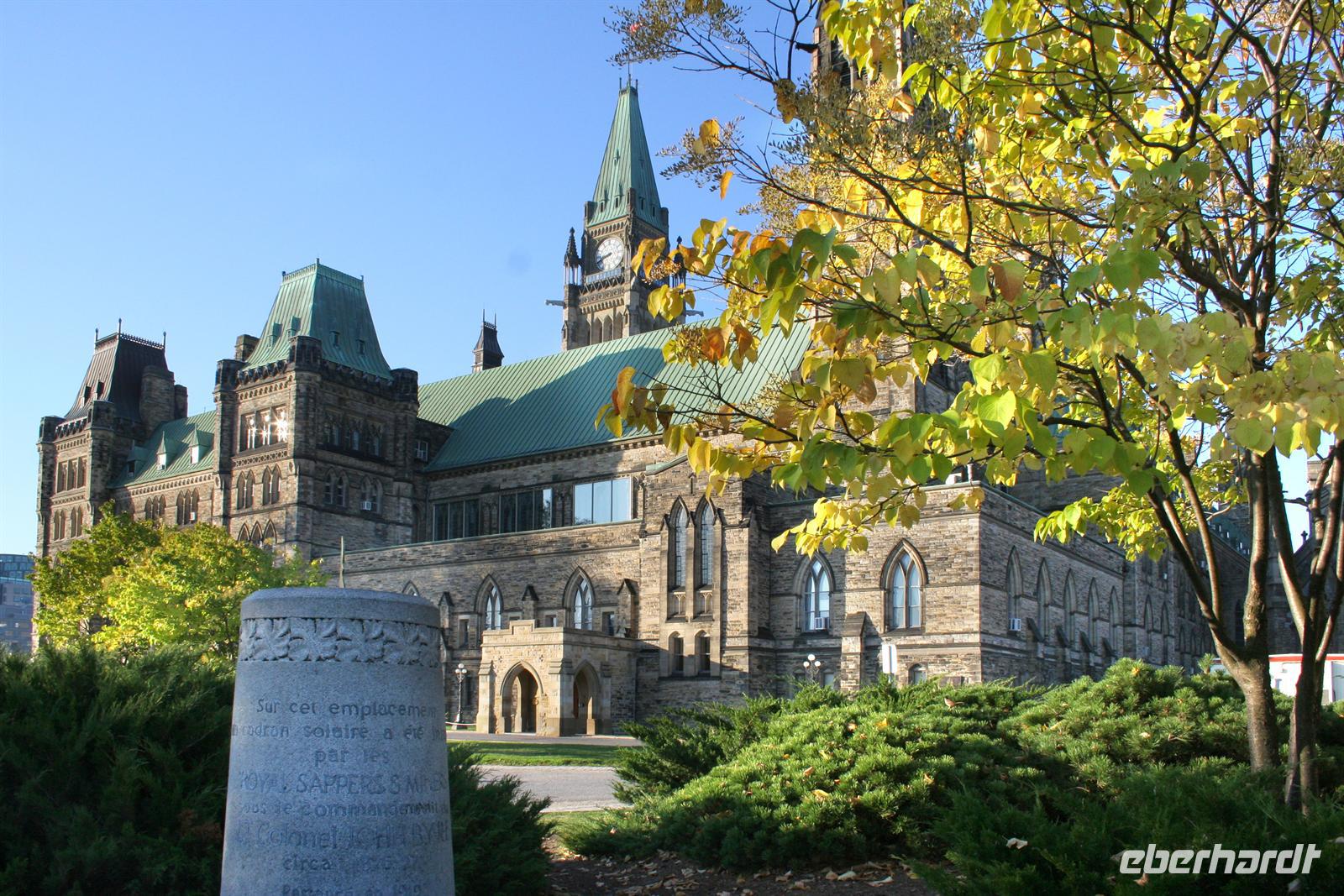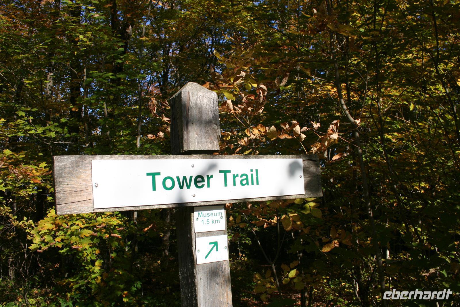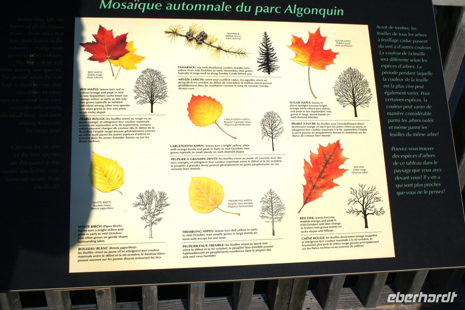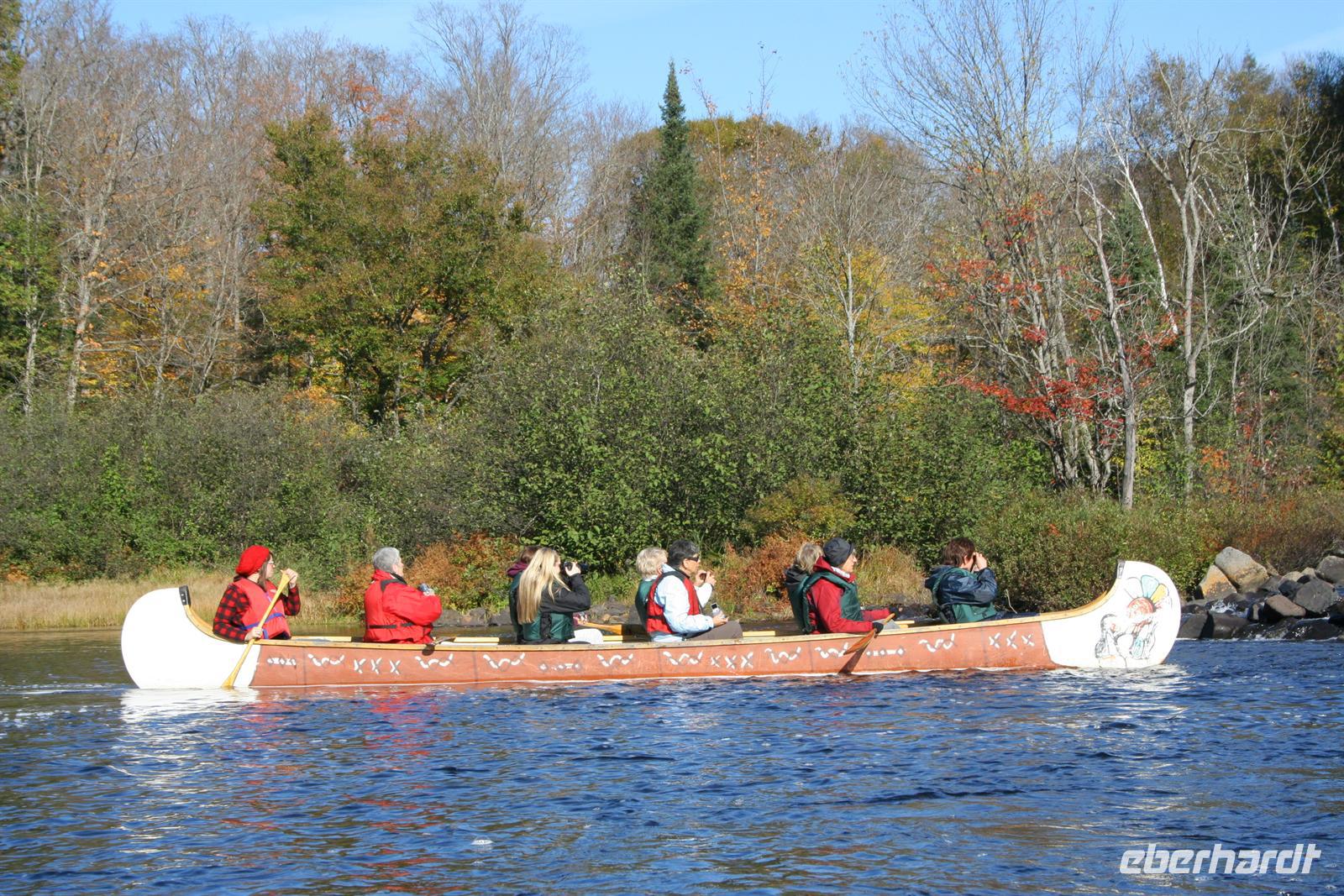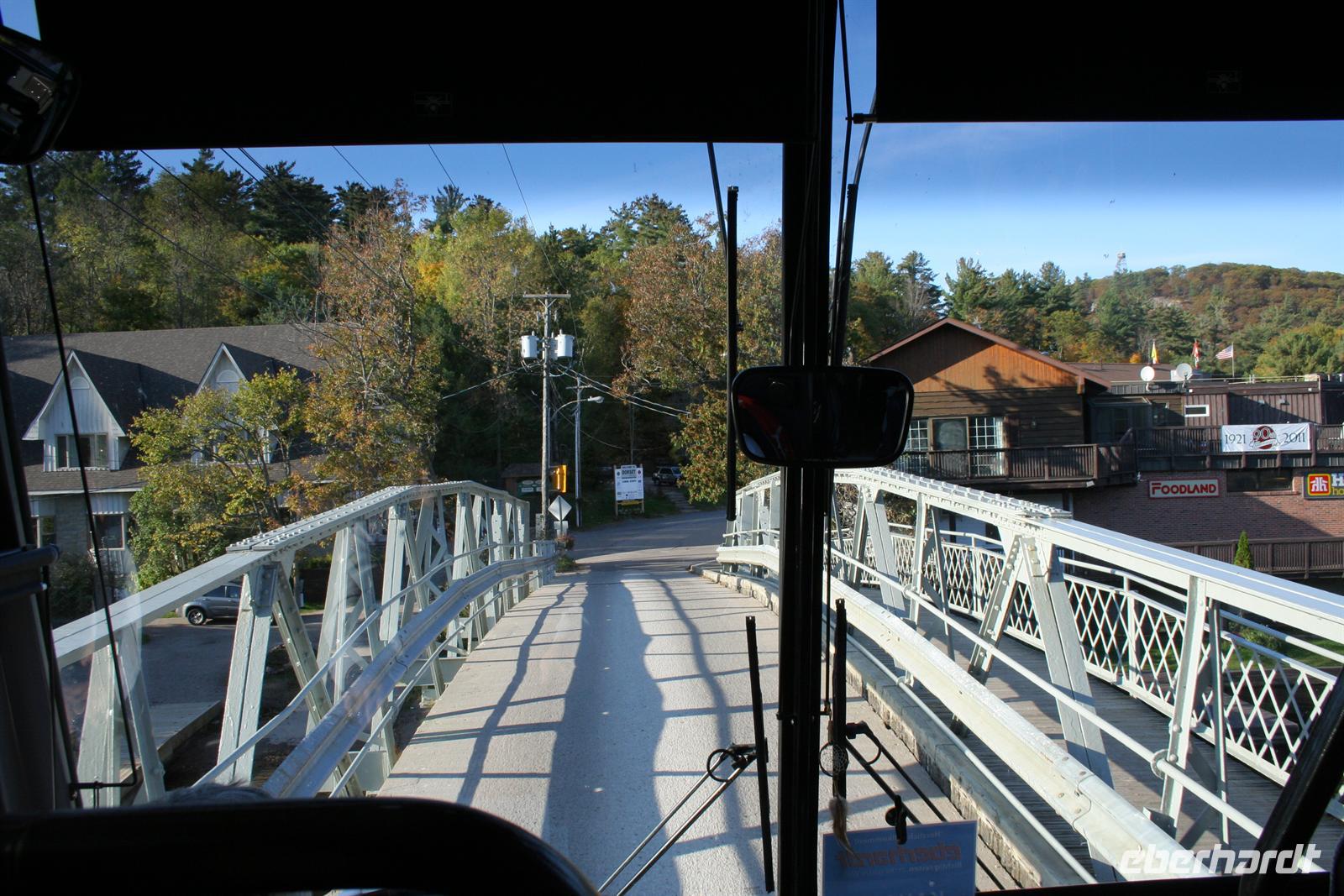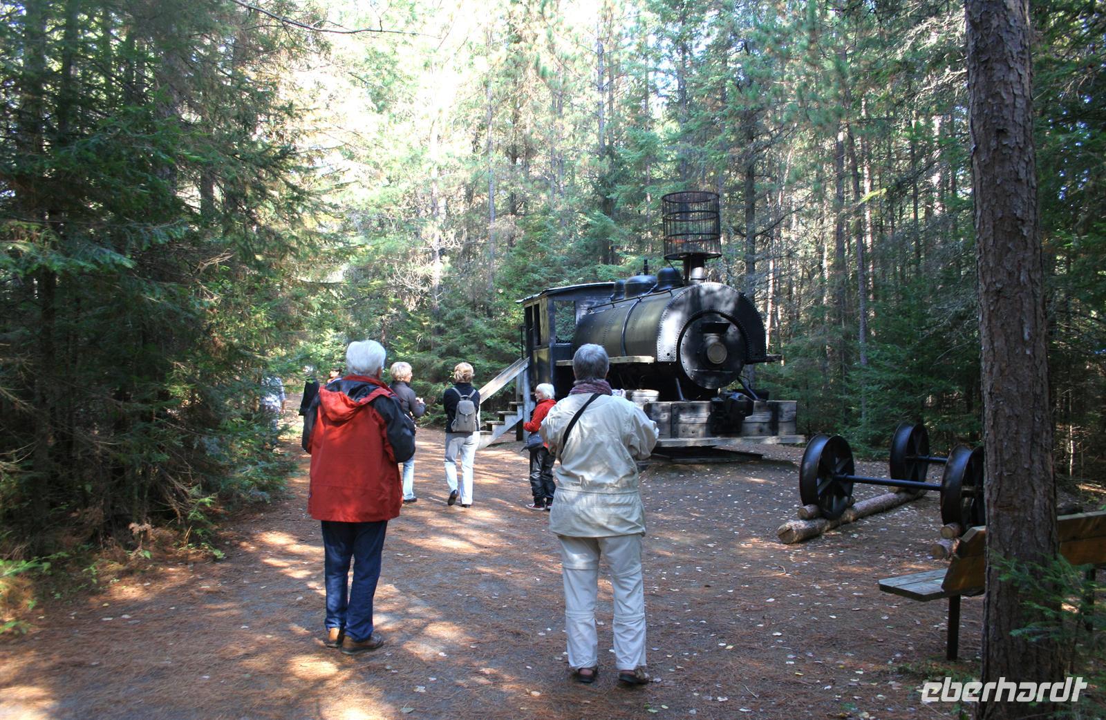 Am nächsten Morgen können wir die Koffer im Hotel lassen, denn wir bleiben noch eine Nacht hier im Hidden Valley. Weckruf um 6.30 Uhr und Frühstück im Hotelrestaurant um 7.30 Uhr. Das Frühstück ist vom Buffet, sehr gut und von allem etwas zu haben. Den Ahornsirup müssen wir natürlich probieren. Dann heißt es warme Sachen und Wanderschuhe anziehen (Mütze, Schal und Handschuhe haben auch die meisten dabei). An der Rezeption bekommt jeder ein Lunchpaket mit belegtem Brot, Wasser, Obst und Müsliriegel. Diese nehmen wir mit in den Bus. Um 8.30 Uhr starten wir zu unserem Tagesausflug in die wunderschöne Natur des Algonquin-Nationalparks. Die Laubfärbung ist fantastisch in allen Grün-, Gelb- und Rottönen. Je nach Lage haben die Bäume auch teilweise ihre Blätter schon verloren. Nachts gibt es jetzt schon Temperaturen unter Null, aber wir haben wieder einen herrlichen Tag mit mittags mehr als 20 Grad.Wir fahren von Huntsville etwa eine halbe Stunde bis zum Kanu-Verleih „Algonquin Outfitters". Um 9.00 Uhr kommen wir an. Alle werden mit einem Paddel und einer Schwimmweste ausgerüstet. Wir bekommen drei Guides und je acht Gäste gehen in ein Kanu. In jedem Kanu sollte ein Übersetzer von uns sitzen, denn die Guides sprechen nur Englisch. Das Einsteigen klappt erstmal problemlos. Um 9.45 Uhr paddeln wir los auf dem Ochsenzungen-See (Oxtongue Lake) und später auf dem gleichnamigen Fluss. Der See und Fluss heißt so, weil die Holzfäller früher auch Ochsen zum Transport der Holzstämme nutzen und diese vor Anstrengung die Zungen raushängen ließen. Nach etwa einer Stunde paddeln erreichen wir unser Ziel, die Dragon Falls (Drachen-Wasserfälle) des Oxtongue-Flusses. Hier wird es etwas schwierig beim Aussteigen, denn es gibt keine feste Anlegestelle, sondern nur ein felsiges Ufer, auf das wir aus den Booten etwas mühsam klettern müssen. Wir kraxeln nach oben zum Anfang des Wasserfalls. Hier machen Brigitta und ich als Überraschung eine kleine Weinprobe mit einem Merlot-Rotwein aus der Niagara-Region. Vom Wein gestärkt erklimmen wir unten am Fluss wieder unsere Kanus und paddeln eine Stunde zurück zum Ausgangspunkt unserer Kanutour. Die Boote lassen sich leicht bewegen und die Guides helfen hinten beim Steuern. Wenn jeder ein bisschen mitpaddelt, wird es für keinen zu anstrengend. Und es funktioniert, auch wenn man vorher noch nie gepaddelt ist. Alle fanden die Kanutour super! Zurück am Bootsverleih gebe ich jedem Guide im Namen der Gruppe 10 CAD Trinkgeld. Dann holen wir unsere Lunchpakete aus dem Bus und picknicken auf Bänken direkt am Oxtongue-See. Das Wetter ist herrlich und wir genießen die Ruhe in der Natur. Gegen 13.00 Uhr fahren wir weiter direkt in den Algonquin-Park. Brigitta holt die Einfahrt-Erlaubnisse für die beiden Tage heute und morgen. Jeder bekommt einen deutschen Prospekt vom Park. Um 14.00 Uhr erreichen wir den Ausgangspunkt unserer ersten Wanderung, dem „Hardwood Lookout Trail". Die Wanderung ist etwa 800 Meter lang, führt aber zum Teil über felsiges Gelände und kleine Anstiege hinauf. Vom Aussichtspunkt hat man einen Blick über den Canou Lake, der von den farbigen Laubwäldern umrahmt ist. Die Wanderung dauert etwa 40 Minuten. Dann fahren wir noch einmal 45 Minuten nach Dorset, wo unsere nächste Wanderung ist. Die Strecke ist 2,3 km lang und führt zum Teil über felsiges Gelände, wo man etwas klettern muss und immer leicht bergauf. Ziel ist der Feuerwachturm, von dem man früher Brände in dem riesigen Waldgebiet erkennen konnte. Wer will kann kostenlos auf den Turm hinauf steigen. Von oben hat man einen schönen Blick über das Kronendach des Algonquin-Nationalparks und einige Seen (Toilettenmöglichkeit). Um 16.30 Uhr fahren wir weiter. Da wir nicht zurück gewandert sind, haben wir noch Zeit, den „Robinson's General Store" zu besuchen und eine Indian Summer Panorama-Fahrt um den Lake of Bays zu unternehmen. Auf den etwa 60 Kilometern Strecke auf kleineren Landstraßen können wir die Laubfärbung noch einmal ganz besonders gut bestaunen. Gegen 18.15 Uhr kommen wir wieder am Hotel „Hidden Valley" an. Ich treffe mich mit einigen Gästen zum Abendessen im Hotelrestaurant. Es ist in Bistro und Restaurant unterteilt, je nachdem, ob man ein Menü oder einen Snack essen will. Wir werden im Bistro vorn platziert. Es gibt zum Beispiel eine Tagessuppe, verschiedene Salate, Kartoffelecken mit Dip, Nachos, Pizza, Pasta und Burger. Für etwa 10 CAD kann man ein gutes Gericht bekommen. Eine Flasche Wein kostet etwa 35 CAD. Einige sitzen auch noch in der Lobby zusammen. Freitag, 07.10.2011 Algonquin-Nationalpark - Logging Trail - Ottawa Am Freitag geht es etwas eher los, denn wir haben eine lange Fahrtstrecke von 420 Kilometern vor uns. Weckruf ist daher um 6.00 Uhr, Frühstück und 7.00 und Abfahrt um 8.00 Uhr. Heute erkunden wir den östlichen Teil des Algonquin-Parks. Wir fahren zunächst etwa eine Stunde zum Algonquin-Besucherzentrum. Hier gibt es eine kleine Aussichtsplattform, einen Souvenirshop und ein Museum zur Geschichte und zur Tierwelt im Algonquin-Park. Man sieht, wie der der Biber seinen Bau baut, wie es in den Seen unter Wasser aussieht und verschiedene ausgestopfte Tiere wie den Schwarzbär, den Wolf und den Elch. Nach einer halben Stunde geht es ca. 20 Minuten weiter zum Holzfäller-Museum mit einem kleinen Rundwanderweg „Logging Trail“. Hier sehen wir uns einen kurzen Film über die Geschichte der Holzfäller an und spazieren eine knappe Stunde den Logging Trail entlang. Brigitta erklärt uns Wissenswertes zu den einzelnen Stationen. Wir sehen die Unterkünfte der Holzfäller, die Pferdeställe, die Gerätschaften und Maschinen bis hin zu einem kleinen Dampfschiff (Alligator genannt), einer Dampflokomotive und moderneren Autos. Für einen CAD bekommt man auch eine kleine Broschüre, in der in Englisch alles mit Illustrationen und Text erläutert ist.11.30 Uhr Weiterfahrt in Richtung Ottawa. Gegen 15.00 Uhr kommen wir in Ottawa a