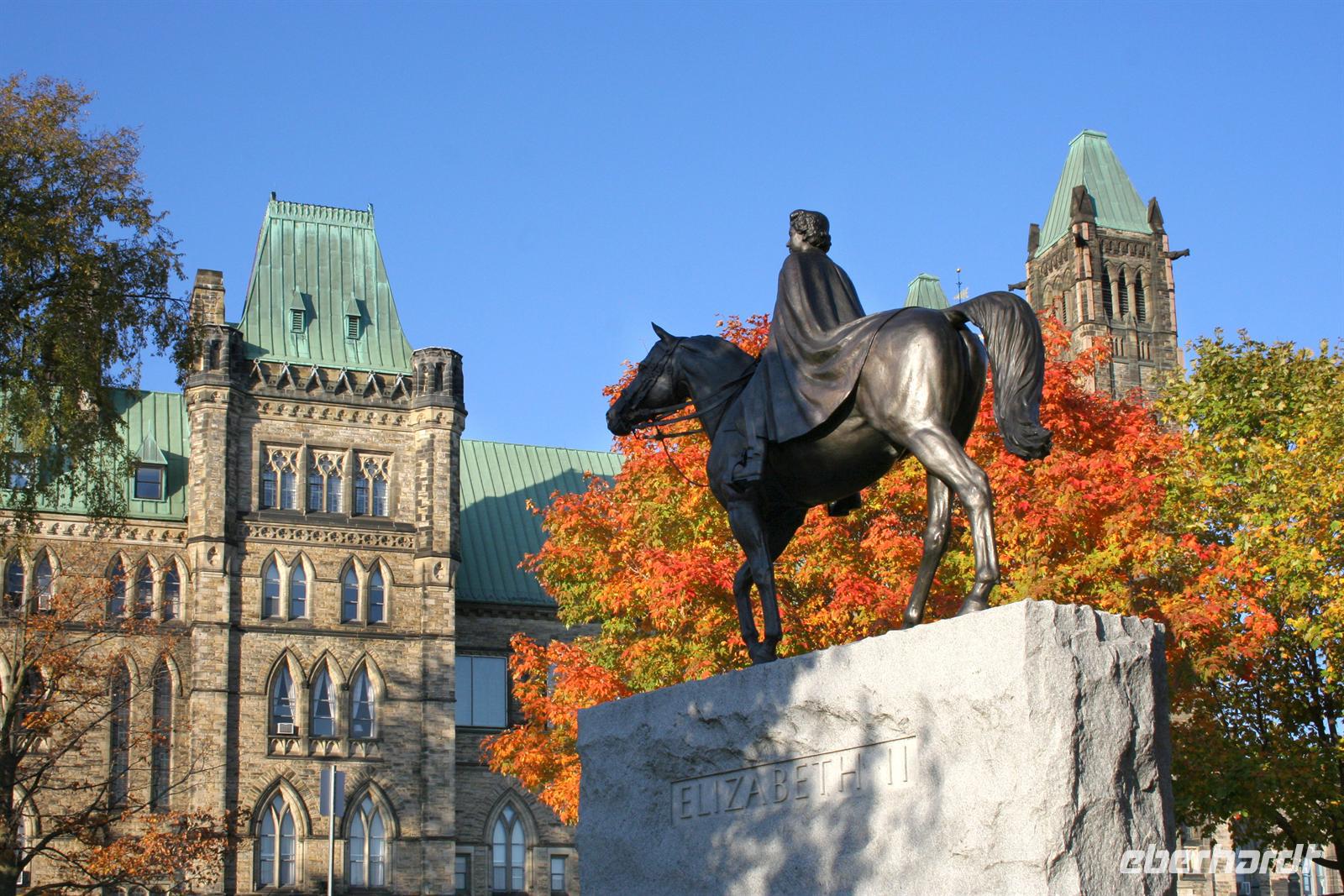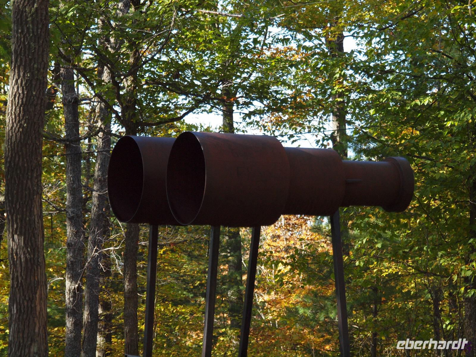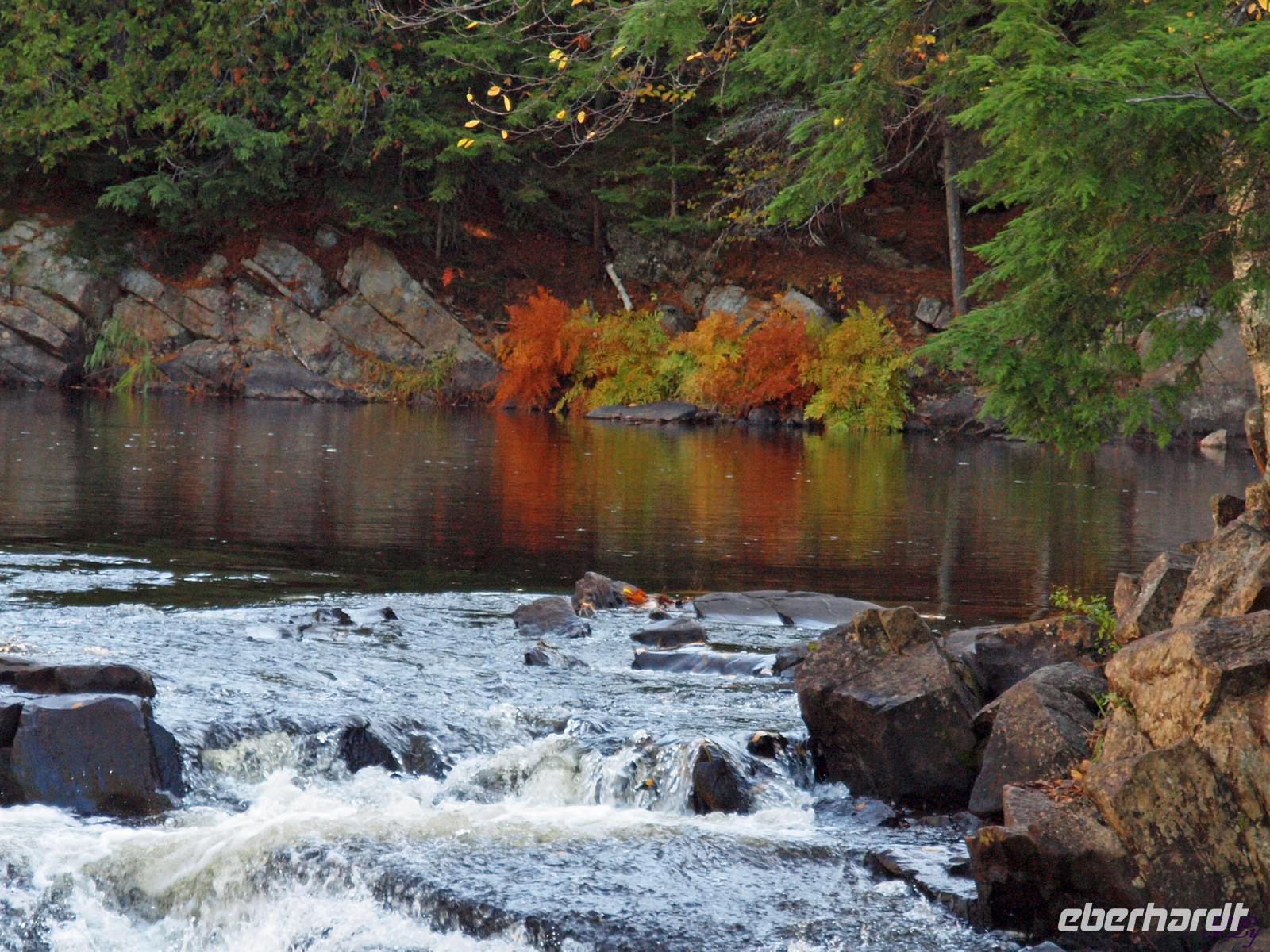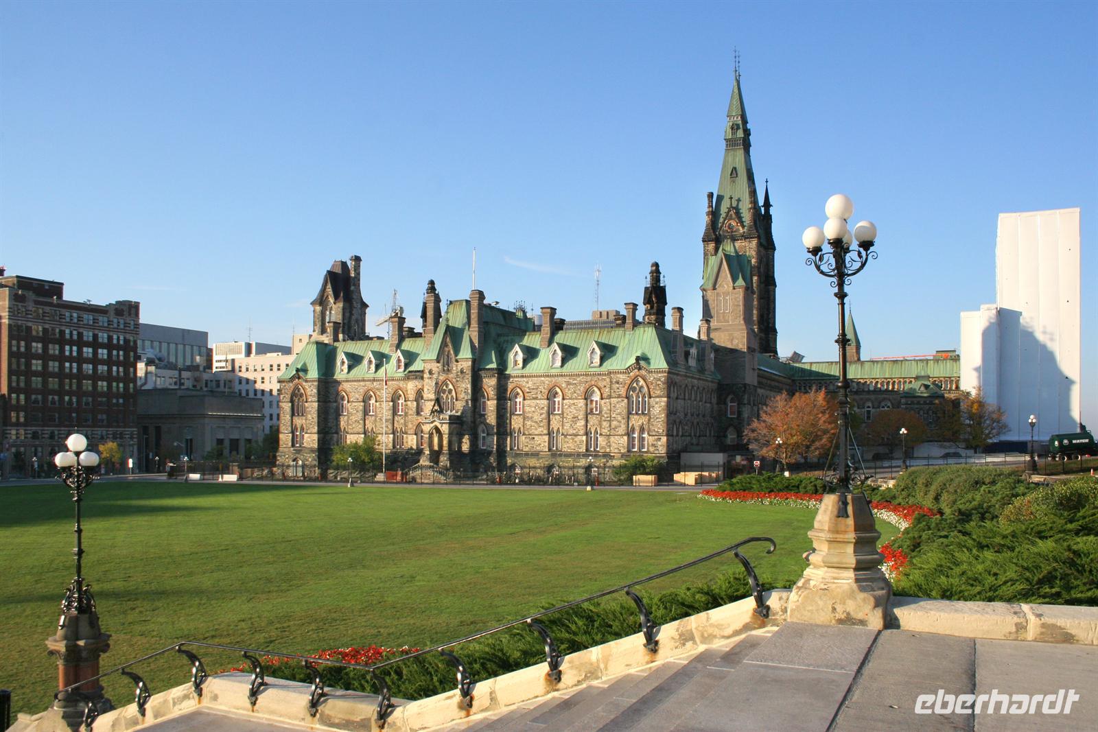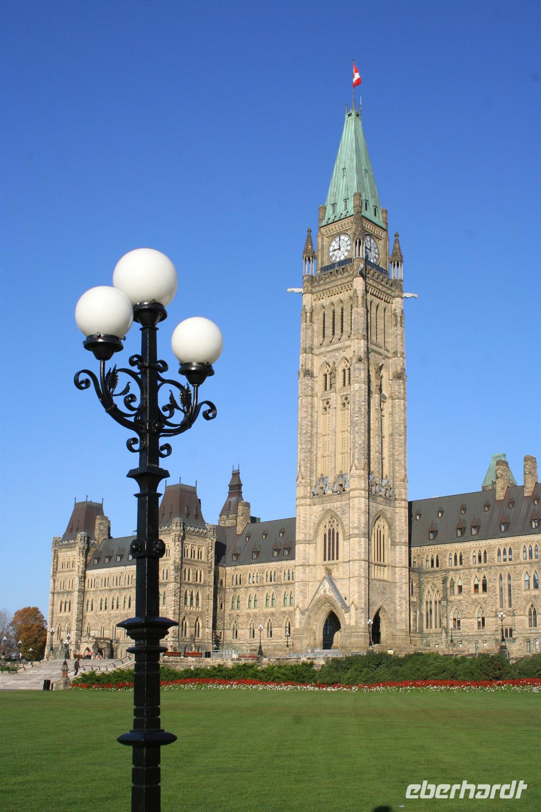 Am nächsten Morgen können wir die Koffer im Hotel lassen, denn wir bleiben noch eine Nacht hier im Hidden Valley. Weckruf um 6.30 Uhr und Frühstück im Hotelrestaurant um 7.30 Uhr. Das Frühstück ist vom Buffet, sehr gut und von allem etwas zu haben. Den Ahornsirup müssen wir natürlich probieren. Dann heißt es warme Sachen und Wanderschuhe anziehen (Mütze, Schal und Handschuhe haben auch die meisten dabei). An der Rezeption bekommt jeder ein Lunchpaket mit belegtem Brot, Wasser, Obst und Müsliriegel. Diese nehmen wir mit in den Bus. Um 8.30 Uhr starten wir zu unserem Tagesausflug in die wunderschöne Natur des Algonquin-Nationalparks. Die Laubfärbung ist fantastisch in allen Grün-, Gelb- und Rottönen. Je nach Lage haben die Bäume auch teilweise ihre Blätter schon verloren. Nachts gibt es jetzt schon Temperaturen unter Null, aber wir haben wieder einen herrlichen Tag mit mittags mehr als 20 Grad.Wir fahren von Huntsville etwa eine halbe Stunde bis zum Kanu-Verleih „Algonquin Outfitters". Um 9.00 Uhr kommen wir an. Alle werden mit einem Paddel und einer Schwimmweste ausgerüstet. Wir bekommen drei Guides und je acht Gäste gehen in ein Kanu. In jedem Kanu sollte ein Übersetzer von uns sitzen, denn die Guides sprechen nur Englisch. Das Einsteigen klappt erstmal problemlos. Um 9.45 Uhr paddeln wir los auf dem Ochsenzungen-See (Oxtongue Lake) und später auf dem gleichnamigen Fluss. Der See und Fluss heißt so, weil die Holzfäller früher auch Ochsen zum Transport der Holzstämme nutzen und diese vor Anstrengung die Zungen raushängen ließen. Nach etwa einer Stunde paddeln erreichen wir unser Ziel, die Dragon Falls (Drachen-Wasserfälle) des Oxtongue-Flusses. Hier wird es etwas schwierig beim Aussteigen, denn es gibt keine feste Anlegestelle, sondern nur ein felsiges Ufer, auf das wir aus den Booten etwas mühsam klettern müssen. Wir kraxeln nach oben zum Anfang des Wasserfalls. Hier machen Brigitta und ich als Überraschung eine kleine Weinprobe mit einem Merlot-Rotwein aus der Niagara-Region. Vom Wein gestärkt erklimmen wir unten am Fluss wieder unsere Kanus und paddeln eine Stunde zurück zum Ausgangspunkt unserer Kanutour. Die Boote lassen sich leicht bewegen und die Guides helfen hinten beim Steuern. Wenn jeder ein bisschen mitpaddelt, wird es für keinen zu anstrengend. Und es funktioniert, auch wenn man vorher noch nie gepaddelt ist. Alle fanden die Kanutour super! Zurück am Bootsverleih gebe ich jedem Guide im Namen der Gruppe 10 CAD Trinkgeld. Dann holen wir unsere Lunchpakete aus dem Bus und picknicken auf Bänken direkt am Oxtongue-See. Das Wetter ist herrlich und wir genießen die Ruhe in der Natur. Gegen 13.00 Uhr fahren wir weiter direkt in den Algonquin-Park. Brigitta holt die Einfahrt-Erlaubnisse für die beiden Tage heute und morgen. Jeder bekommt einen deutschen Prospekt vom Park. Um 14.00 Uhr erreichen wir den Ausgangspunkt unserer ersten Wanderung, dem „Hardwood Lookout Trail". Die Wanderung ist etwa 800 Meter lang, führt aber zum Teil über felsiges Gelände und kleine Anstiege hinauf. Vom Aussichtspunkt hat man einen Blick über den Canou Lake, der von den farbigen Laubwäldern umrahmt ist. Die Wanderung dauert etwa 40 Minuten. Dann fahren wir noch einmal 45 Minuten nach Dorset, wo unsere nächste Wanderung ist. Die Strecke ist 2,3 km lang und führt zum Teil über felsiges Gelände, wo man etwas klettern muss und immer leicht bergauf. Ziel ist der Feuerwachturm, von dem man früher Brände in dem riesigen Waldgebiet erkennen konnte. Wer will kann kostenlos auf den Turm hinauf steigen. Von oben hat man einen schönen Blick über das Kronendach des Algonquin-Nationalparks und einige Seen (Toilettenmöglichkeit). Um 16.30 Uhr fahren wir weiter. Da wir nicht zurück gewandert sind, haben wir noch Zeit, den „Robinson's General Store" zu besuchen und eine Indian Summer Panorama-Fahrt um den Lake of Bays zu unternehmen. Auf den etwa 60 Kilometern Strecke auf kleineren Landstraßen können wir die Laubfärbung noch einmal ganz besonders gut bestaunen. Gegen 18.15 Uhr kommen wir wieder am Hotel „Hidden Valley" an. Ich treffe mich mit einigen Gästen zum Abendessen im Hotelrestaurant. Es ist in Bistro und Restaurant unterteilt, je nachdem, ob man ein Menü oder einen Snack essen will. Wir werden im Bistro vorn platziert. Es gibt zum Beispiel eine Tagessuppe, verschiedene Salate, Kartoffelecken mit Dip, Nachos, Pizza, Pasta und Burger. Für etwa 10 CAD kann man ein gutes Gericht bekommen. Eine Flasche Wein kostet etwa 35 CAD. Einige sitzen auch noch in der Lobby zusammen. Freitag, 07.10.2011 Algonquin-Nationalpark - Logging Trail - Ottawa Am Freitag geht es etwas eher los, denn wir haben eine lange Fahrtstrecke von 420 Kilometern vor uns. Weckruf ist daher um 6.00 Uhr, Frühstück und 7.00 und Abfahrt um 8.00 Uhr. Heute erkunden wir den östlichen Teil des Algonquin-Parks. Wir fahren zunächst etwa eine Stunde zum Algonquin-Besucherzentrum. Hier gibt es eine kleine Aussichtsplattform, einen Souvenirshop und ein Museum zur Geschichte und zur Tierwelt im Algonquin-Park. Man sieht, wie der der Biber seinen Bau baut, wie es in den Seen unter Wasser aussieht und verschiedene ausgestopfte Tiere wie den Schwarzbär, den Wolf und den Elch. Nach einer halben Stunde geht es ca. 20 Minuten weiter zum Holzfäller-Museum mit einem kleinen Rundwanderweg „Logging Trail“. Hier sehen wir uns einen kurzen Film über die Geschichte der Holzfäller an und spazieren eine knappe Stunde den Logging Trail entlang. Brigitta erklärt uns Wissenswertes zu den einzelnen Stationen. Wir sehen die Unterkünfte der Holzfäller, die Pferdeställe, die Gerätschaften und Maschinen bis hin zu einem kleinen Dampfschiff (Alligator genannt), einer Dampflokomotive und moderneren Autos. Für einen CAD bekommt man auch eine kleine Broschüre, in der in Englisch alles mit Illustrationen und Text erläutert ist.11.30 Uhr Weiterfahrt in Richtung Ottawa. Gegen 15.00 Uhr kommen wir in Ottawa a