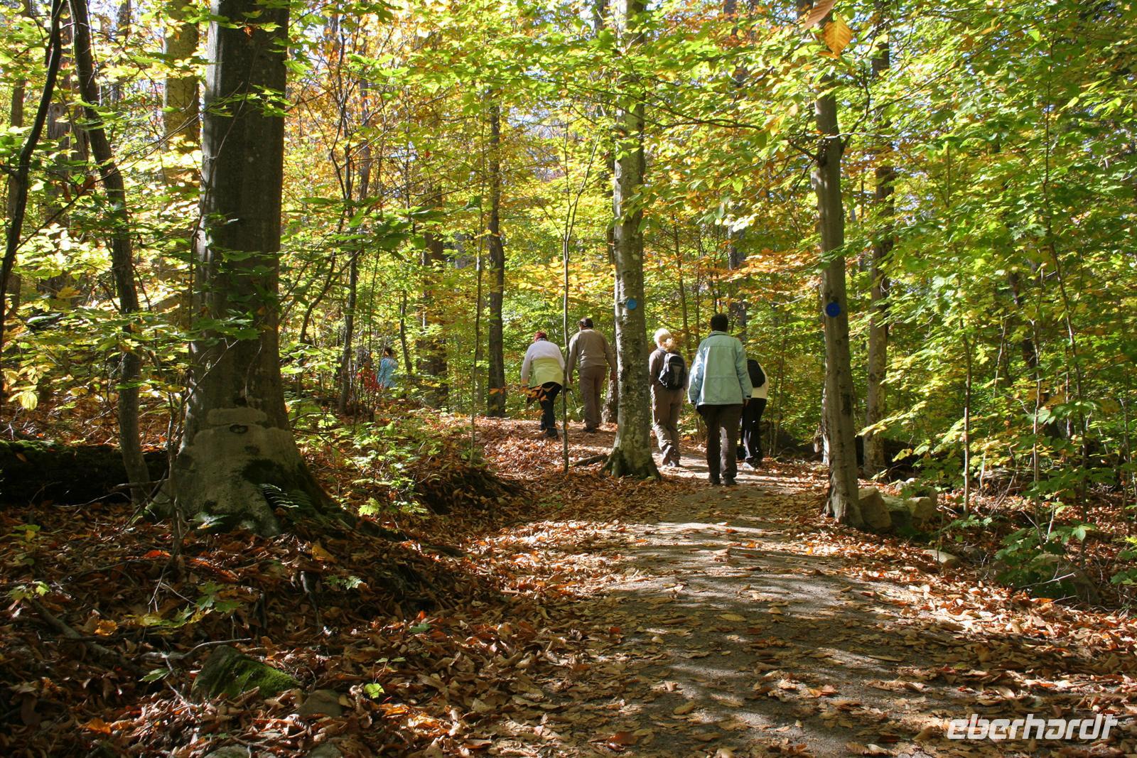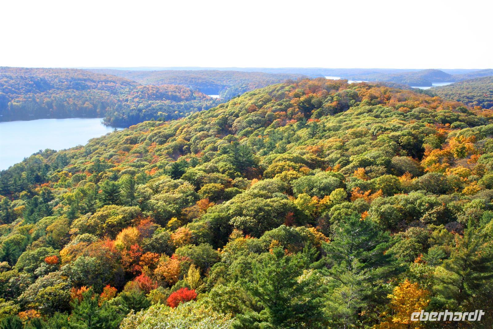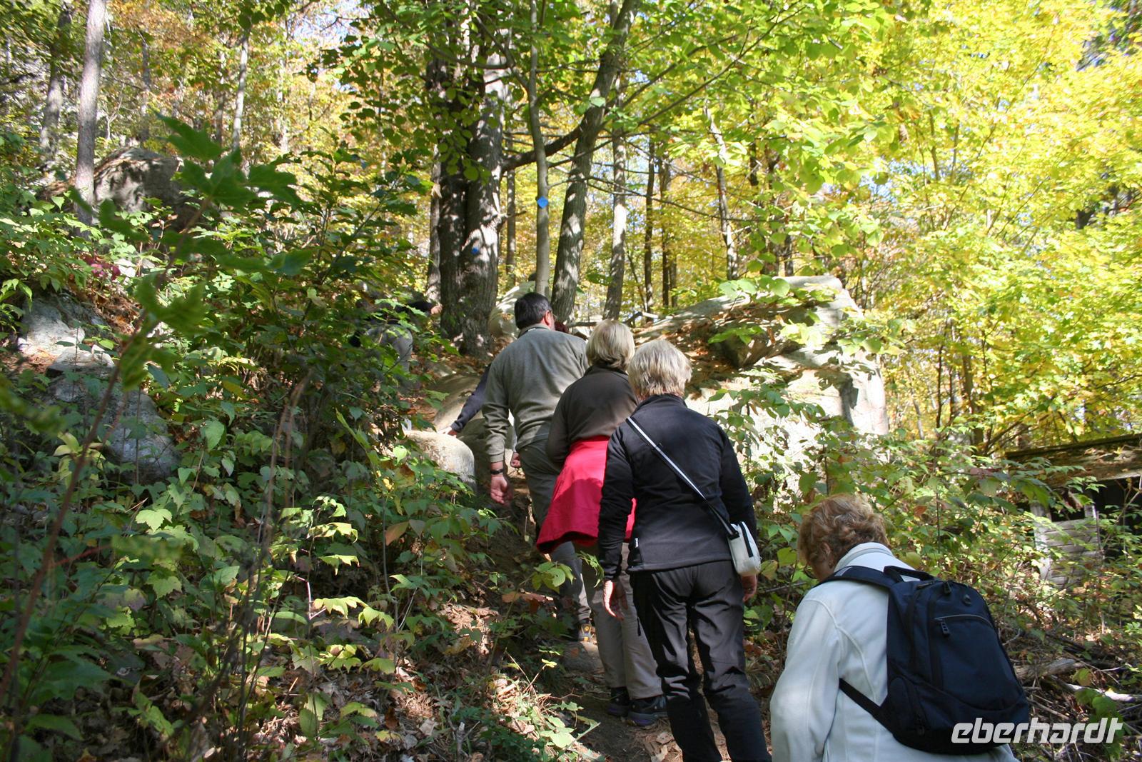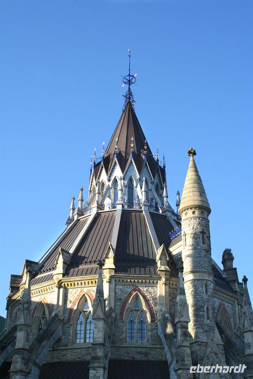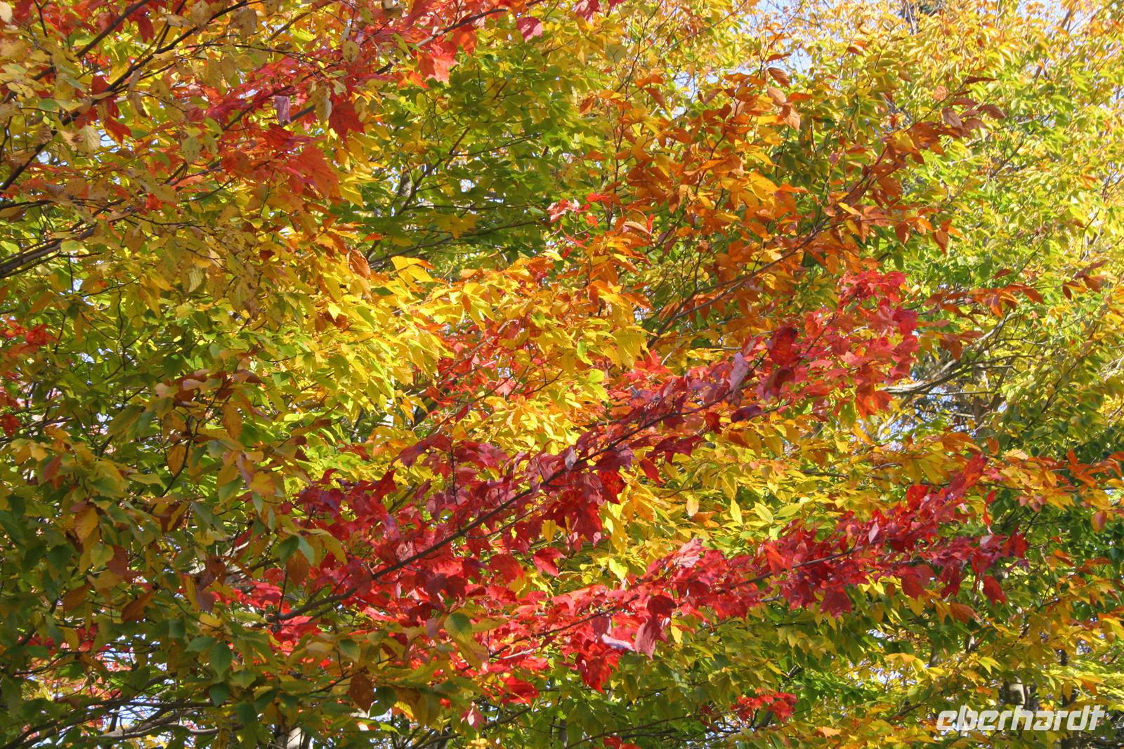 Am nächsten Morgen können wir die Koffer im Hotel lassen, denn wir bleiben noch eine Nacht hier im Hidden Valley. Weckruf um 6.30 Uhr und Frühstück im Hotelrestaurant um 7.30 Uhr. Das Frühstück ist vom Buffet, sehr gut und von allem etwas zu haben. Den Ahornsirup müssen wir natürlich probieren. Dann heißt es warme Sachen und Wanderschuhe anziehen (Mütze, Schal und Handschuhe haben auch die meisten dabei). An der Rezeption bekommt jeder ein Lunchpaket mit belegtem Brot, Wasser, Obst und Müsliriegel. Diese nehmen wir mit in den Bus. Um 8.30 Uhr starten wir zu unserem Tagesausflug in die wunderschöne Natur des Algonquin-Nationalparks. Die Laubfärbung ist fantastisch in allen Grün-, Gelb- und Rottönen. Je nach Lage haben die Bäume auch teilweise ihre Blätter schon verloren. Nachts gibt es jetzt schon Temperaturen unter Null, aber wir haben wieder einen herrlichen Tag mit mittags mehr als 20 Grad.Wir fahren von Huntsville etwa eine halbe Stunde bis zum Kanu-Verleih „Algonquin Outfitters". Um 9.00 Uhr kommen wir an. Alle werden mit einem Paddel und einer Schwimmweste ausgerüstet. Wir bekommen drei Guides und je acht Gäste gehen in ein Kanu. In jedem Kanu sollte ein Übersetzer von uns sitzen, denn die Guides sprechen nur Englisch. Das Einsteigen klappt erstmal problemlos. Um 9.45 Uhr paddeln wir los auf dem Ochsenzungen-See (Oxtongue Lake) und später auf dem gleichnamigen Fluss. Der See und Fluss heißt so, weil die Holzfäller früher auch Ochsen zum Transport der Holzstämme nutzen und diese vor Anstrengung die Zungen raushängen ließen. Nach etwa einer Stunde paddeln erreichen wir unser Ziel, die Dragon Falls (Drachen-Wasserfälle) des Oxtongue-Flusses. Hier wird es etwas schwierig beim Aussteigen, denn es gibt keine feste Anlegestelle, sondern nur ein felsiges Ufer, auf das wir aus den Booten etwas mühsam klettern müssen. Wir kraxeln nach oben zum Anfang des Wasserfalls. Hier machen Brigitta und ich als Überraschung eine kleine Weinprobe mit einem Merlot-Rotwein aus der Niagara-Region. Vom Wein gestärkt erklimmen wir unten am Fluss wieder unsere Kanus und paddeln eine Stunde zurück zum Ausgangspunkt unserer Kanutour. Die Boote lassen sich leicht bewegen und die Guides helfen hinten beim Steuern. Wenn jeder ein bisschen mitpaddelt, wird es für keinen zu anstrengend. Und es funktioniert, auch wenn man vorher noch nie gepaddelt ist. Alle fanden die Kanutour super! Zurück am Bootsverleih gebe ich jedem Guide im Namen der Gruppe 10 CAD Trinkgeld. Dann holen wir unsere Lunchpakete aus dem Bus und picknicken auf Bänken direkt am Oxtongue-See. Das Wetter ist herrlich und wir genießen die Ruhe in der Natur. Gegen 13.00 Uhr fahren wir weiter direkt in den Algonquin-Park. Brigitta holt die Einfahrt-Erlaubnisse für die beiden Tage heute und morgen. Jeder bekommt einen deutschen Prospekt vom Park. Um 14.00 Uhr erreichen wir den Ausgangspunkt unserer ersten Wanderung, dem „Hardwood Lookout Trail". Die Wanderung ist etwa 800 Meter lang, führt aber zum Teil über felsiges Gelände und kleine Anstiege hinauf. Vom Aussichtspunkt hat man einen Blick über den Canou Lake, der von den farbigen Laubwäldern umrahmt ist. Die Wanderung dauert etwa 40 Minuten. Dann fahren wir noch einmal 45 Minuten nach Dorset, wo unsere nächste Wanderung ist. Die Strecke ist 2,3 km lang und führt zum Teil über felsiges Gelände, wo man etwas klettern muss und immer leicht bergauf. Ziel ist der Feuerwachturm, von dem man früher Brände in dem riesigen Waldgebiet erkennen konnte. Wer will kann kostenlos auf den Turm hinauf steigen. Von oben hat man einen schönen Blick über das Kronendach des Algonquin-Nationalparks und einige Seen (Toilettenmöglichkeit). Um 16.30 Uhr fahren wir weiter. Da wir nicht zurück gewandert sind, haben wir noch Zeit, den „Robinson's General Store" zu besuchen und eine Indian Summer Panorama-Fahrt um den Lake of Bays zu unternehmen. Auf den etwa 60 Kilometern Strecke auf kleineren Landstraßen können wir die Laubfärbung noch einmal ganz besonders gut bestaunen. Gegen 18.15 Uhr kommen wir wieder am Hotel „Hidden Valley" an. Ich treffe mich mit einigen Gästen zum Abendessen im Hotelrestaurant. Es ist in Bistro und Restaurant unterteilt, je nachdem, ob man ein Menü oder einen Snack essen will. Wir werden im Bistro vorn platziert. Es gibt zum Beispiel eine Tagessuppe, verschiedene Salate, Kartoffelecken mit Dip, Nachos, Pizza, Pasta und Burger. Für etwa 10 CAD kann man ein gutes Gericht bekommen. Eine Flasche Wein kostet etwa 35 CAD. Einige sitzen auch noch in der Lobby zusammen. Freitag, 07.10.2011 Algonquin-Nationalpark - Logging Trail - Ottawa Am Freitag geht es etwas eher los, denn wir haben eine lange Fahrtstrecke von 420 Kilometern vor uns. Weckruf ist daher um 6.00 Uhr, Frühstück und 7.00 und Abfahrt um 8.00 Uhr. Heute erkunden wir den östlichen Teil des Algonquin-Parks. Wir fahren zunächst etwa eine Stunde zum Algonquin-Besucherzentrum. Hier gibt es eine kleine Aussichtsplattform, einen Souvenirshop und ein Museum zur Geschichte und zur Tierwelt im Algonquin-Park. Man sieht, wie der der Biber seinen Bau baut, wie es in den Seen unter Wasser aussieht und verschiedene ausgestopfte Tiere wie den Schwarzbär, den Wolf und den Elch. Nach einer halben Stunde geht es ca. 20 Minuten weiter zum Holzfäller-Museum mit einem kleinen Rundwanderweg „Logging Trail“. Hier sehen wir uns einen kurzen Film über die Geschichte der Holzfäller an und spazieren eine knappe Stunde den Logging Trail entlang. Brigitta erklärt uns Wissenswertes zu den einzelnen Stationen. Wir sehen die Unterkünfte der Holzfäller, die Pferdeställe, die Gerätschaften und Maschinen bis hin zu einem kleinen Dampfschiff (Alligator genannt), einer Dampflokomotive und moderneren Autos. Für einen CAD bekommt man auch eine kleine Broschüre, in der in Englisch alles mit Illustrationen und Text erläutert ist.11.30 Uhr Weiterfahrt in Richtung Ottawa. Gegen 15.00 Uhr kommen wir in Ottawa a