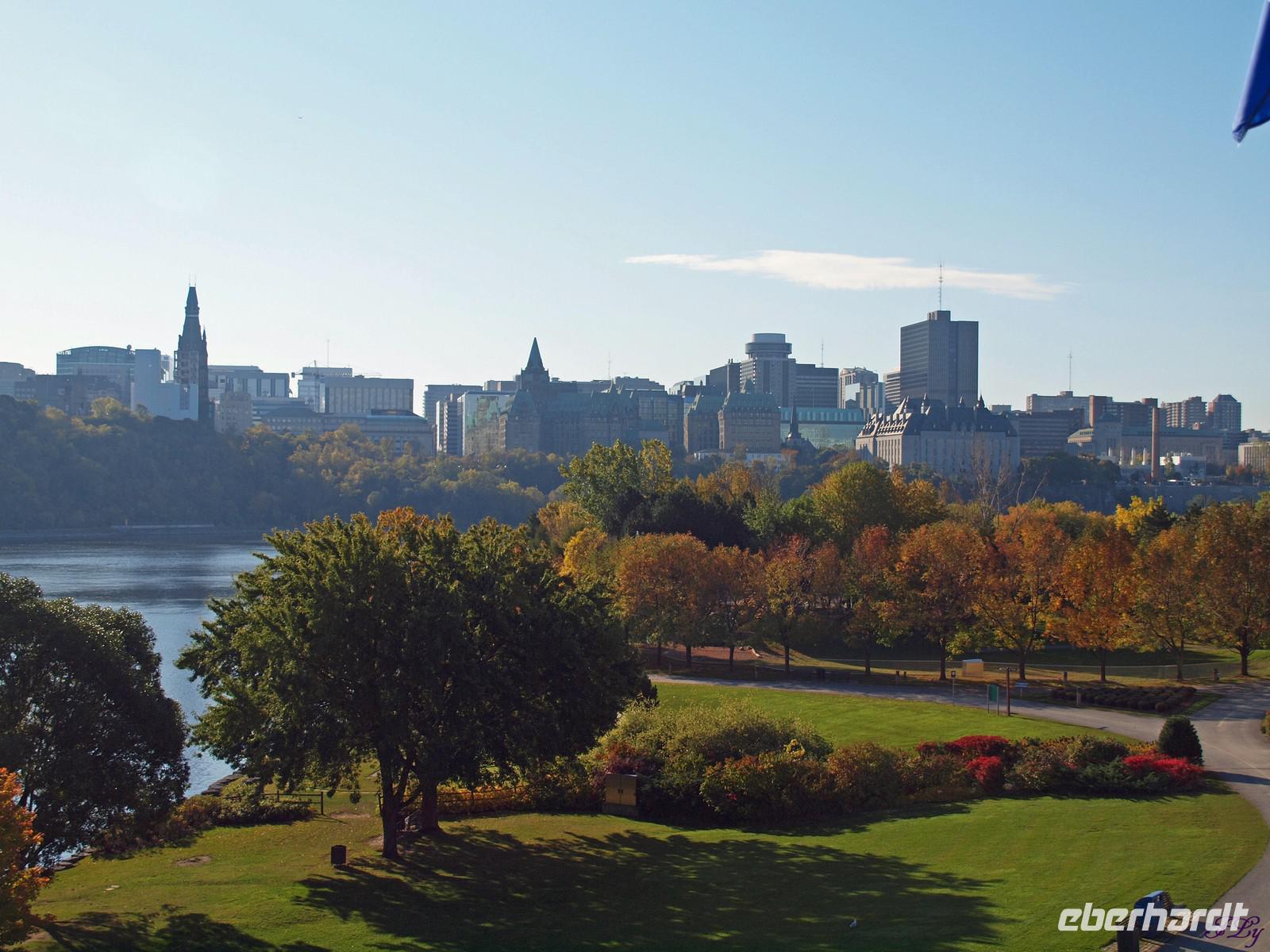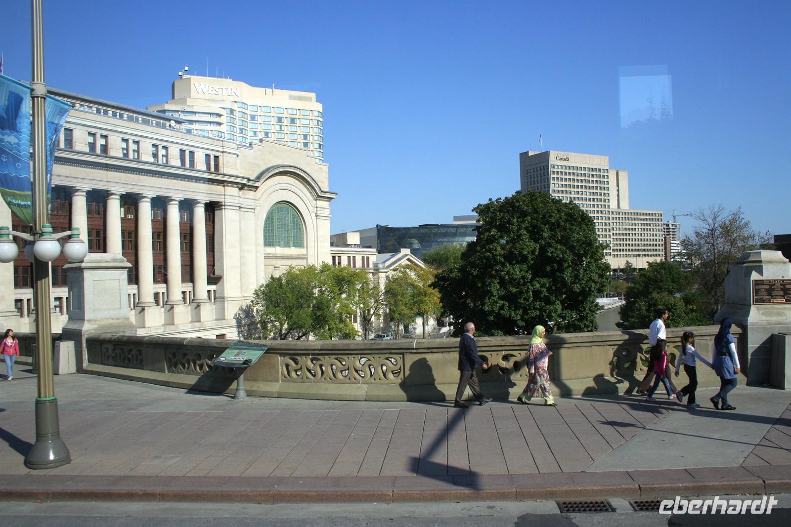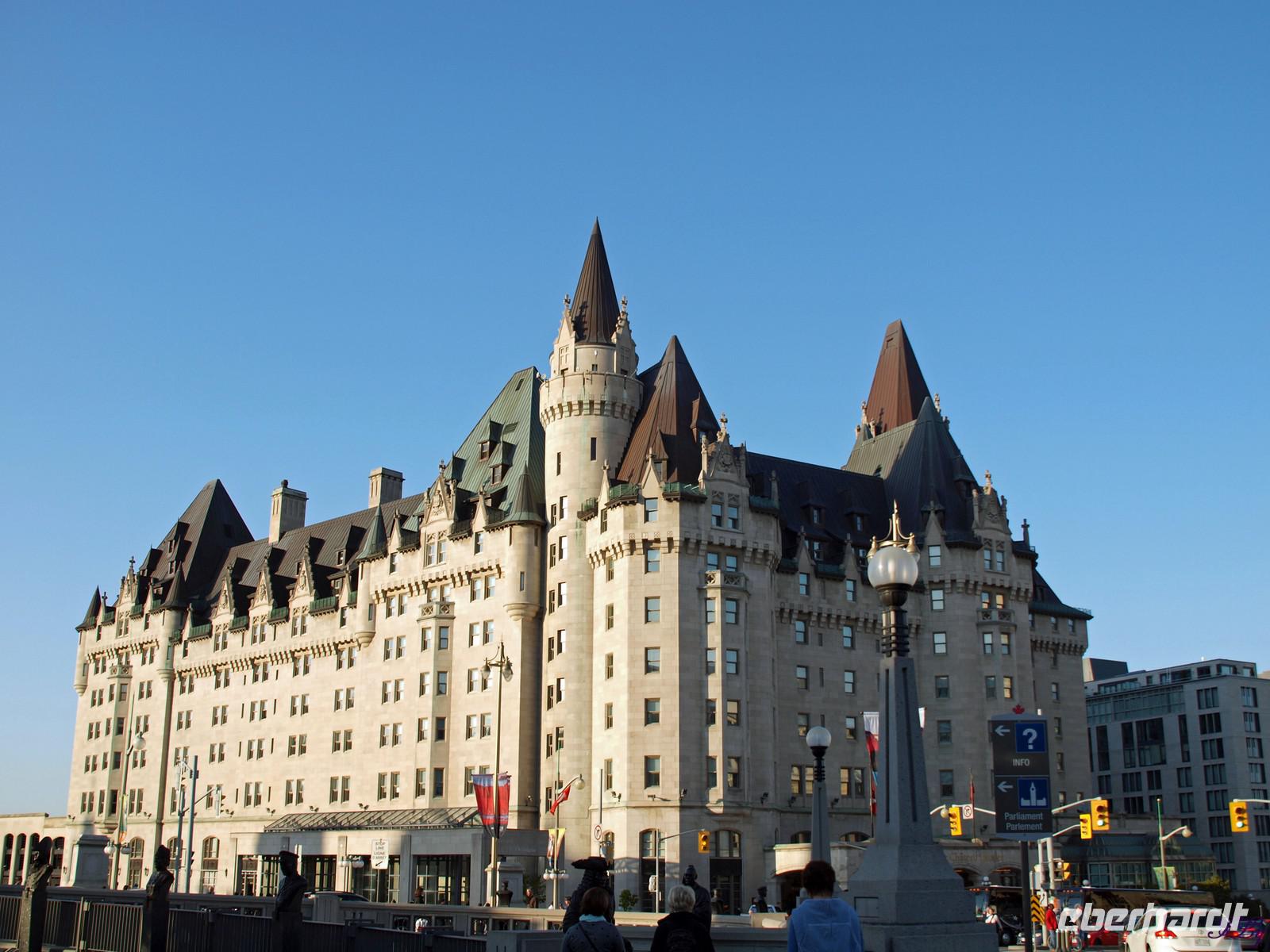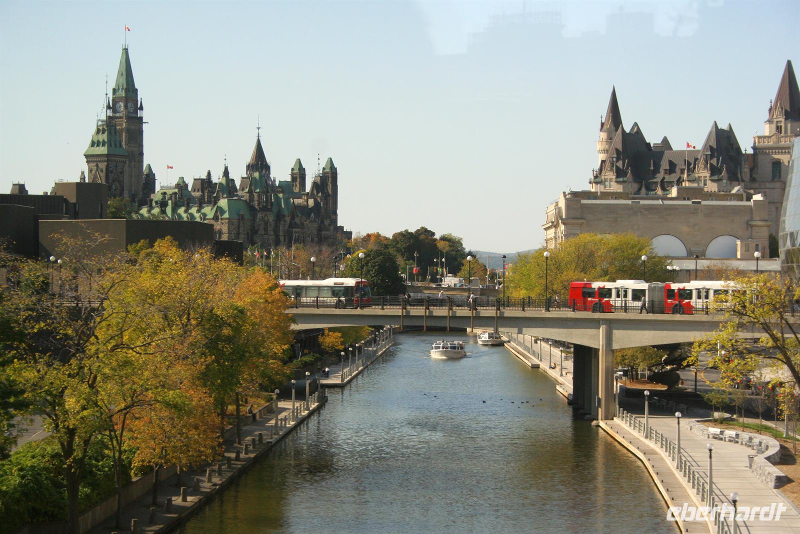 Freitag, 07.10.2011 Algonquin-Nationalpark - Logging Trail - Ottawa Am Freitag müssen wir etwas eher los, denn wir haben eine lange Fahrtstrecke von 420 Kilometern vor uns. Weckruf ist daher um 6.00 Uhr, Frühstück und 7.00 und Abfahrt um 8.00 Uhr. Heute erkunden wir den östlichen Teil des Algonquin-Parks. Wir fahren zunächst etwa eine Stunde zum Algonquin-Besucherzentrum. Hier gibt es eine kleine Aussichtsplattform, einen Souvenirshop und ein Museum zur Geschichte und zur Tierwelt im Algonquin-Park. Man sieht, wie der der Biber seinen Bau baut, wie es in den Seen unter Wasser aussieht und verschiedene ausgestopfte Tiere wie den Schwarzbär, den Wolf und den Elch. Hier gibt es auch Toilettenmöglichkeit) Nach einer halben Stunde geht es ca. 20 Minuten weiter zum Holzfäller-Museum mit Rundwanderweg „Logging Trail“. Hier sehen wir uns einen kurzen Film über die Geschichte der Holzfäller an (nur in Englisch) und spazieren eine knappe Stunde den Logging Trail entlang. Brigitta erklärt uns Wissenswertes zu den einzelnen Stationen. Wir sehen die Unterkünfte der Holzfäller, die Pferdeställe, die Gerätschaften und Maschinen bis hin zu einem kleinen Dampfschiff (Alligator genannt), einer Dampflokomotive und moderneren Autos. Für einen CAD bekommt man auch eine kleine Broschüre, in der in Englisch alles mit Illustrationen und Text erläutert ist. 11.30 Uhr Weierfahrt in Richtung Ottawa. Unterwegs legen wir eine Kaffeepause bei Tim Hortons ein (Muffins, Sandwich und Burger). Gegen 15.00 Uhr kommen wir in Ottawa an und beginnen unsere Stadtrundfahrt. An der Mündung des Rideau-Flusses in den Ottawa-Fluss legen wir einen Fotostopp an dem kleinen Wasserfall ein (Rideau = Vorhang/Gardine). Vorbei am Kunstmuseum, dem Rathaus und dem By Ward Markt erreichen wir um 16.30 Uhr unser Hotel „Cartier Place“ in der Stadt. Wir verabreden uns für 17.00 Uhr in der Lobby zu einem Bummel in die Stadt. Die meisten Gäste gehen in kleinen Grüppchen allein los, ich gehe mit 6 Gästen los. Da der ATM Automat im Hotel nicht funktioniert, suchen wir uns in der Innenstadt eine Bank und ich helfe allen dort beim Geld abheben per Kreditkarte. Wir bummeln über den By Ward Markt, der 18.00 Uhr allerdings schließt. Rundherum gibt es eine Unmenge an Geschäften, Bars und Restaurants. An den Marktständen kann man frisches Obst und Gemüse kaufen, es gibt wohl auch 2 Stände mit Ahornprodukten. Nebenan ist ein großes Kaufhaus der Hudson Bay Company, das bis 20 oder 21 Uhr geöffnet ist. Wir kehren zum Abendessen (7 Personen) in das Fischrestaurant „The Fishmarket“ ein. Wir bekommen einen Tisch im Obergeschoss. Es gibt beispielsweise Pasta mit Lachs, Paella, Hähnchen mit Kartoffelecken oder auch Steak. Die Preise variieren zwischen 15 und 25 CAD pro Gericht. Alles ist sehr lecker und es klappt auch, dass wir letztlich alle getrennt bezahlen. Nach dem Abendessen spazieren wir zurück zum Hotel (ca. 15 Minuten), wo wir gegen 21.00 Uhr ankommen. Die Zimmer sind eher Appartements mit Schlafzimmer, Wohnzimmer, Bad und Küche. Die Küche ist voll ausgestattet mit Kühlschrank, Geschirr, Geschirrspüler, Mikrowelle, Herd und Wasserkocher. Das Bad verfügt über Wanne, Dusche, WC, Duschgel und Föhn. Es gibt auch wieder TV, Telefon, Radiowecker und Bügeleisen. Im Erdgeschoss rechts neben der Rezeption ist das Hotelrestaurant, hier gibt es auch das Frühstück am nächsten Morgen. Stadtpläne kann man an der Rezeption bekommen.
